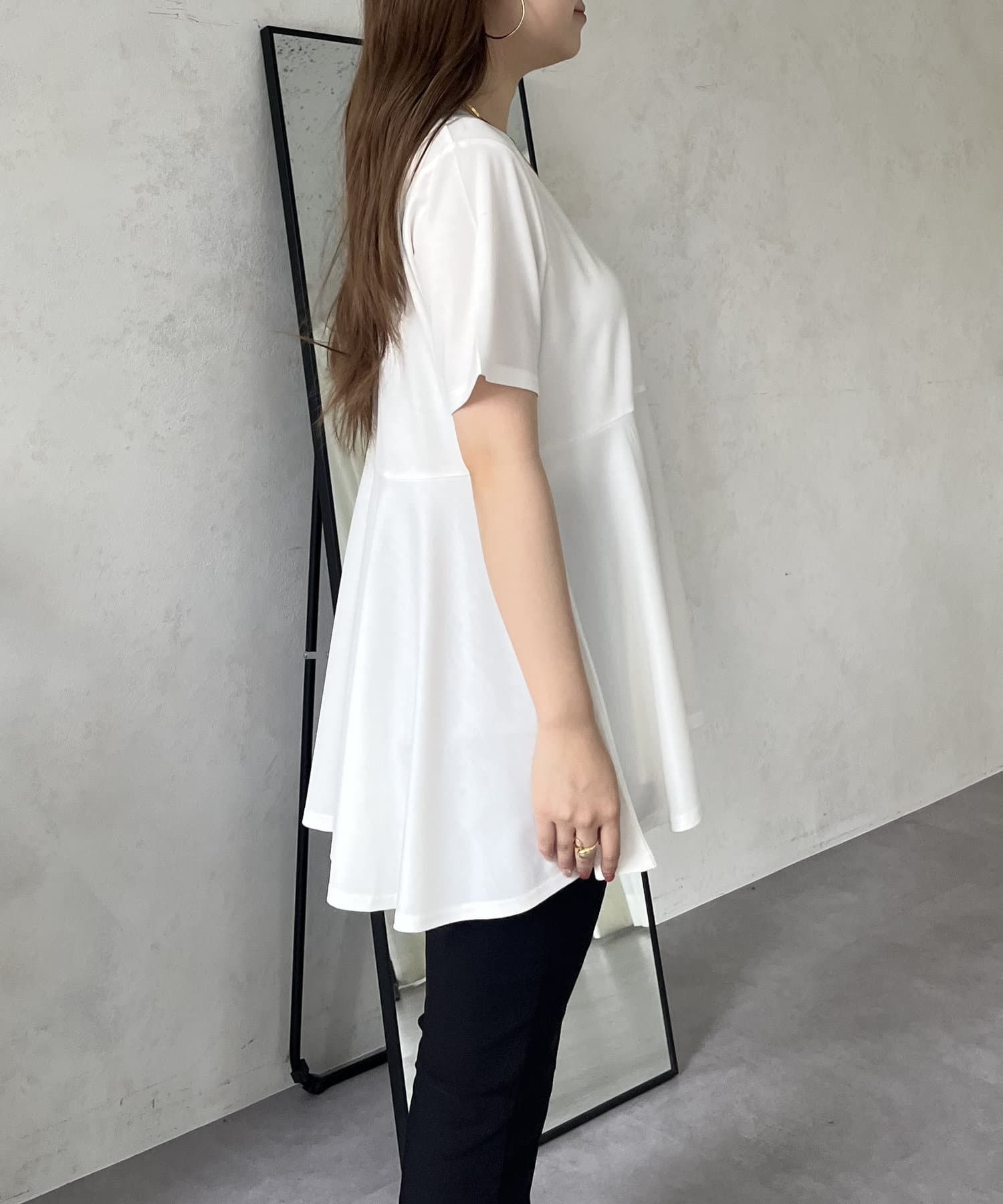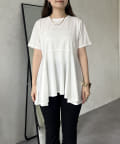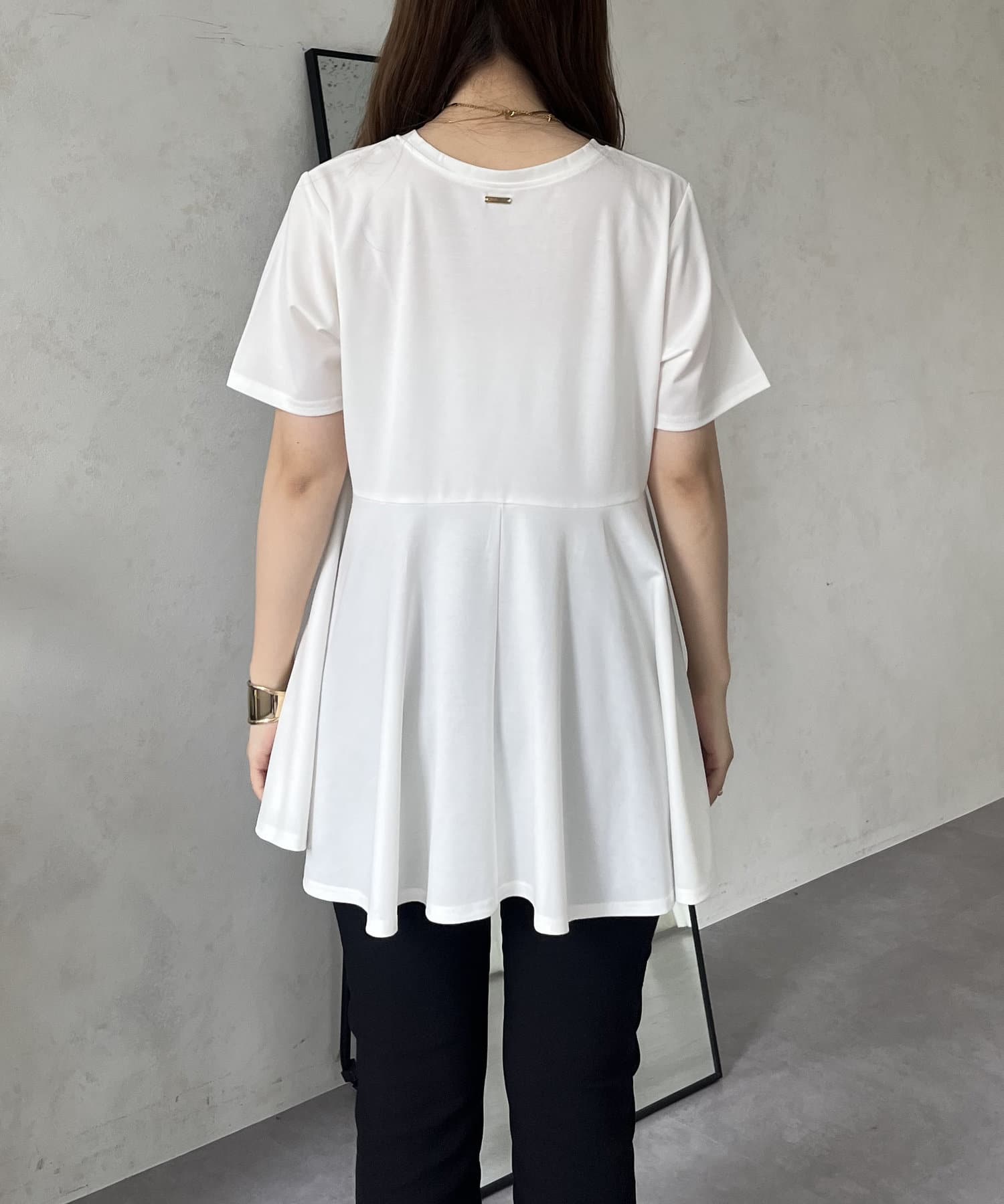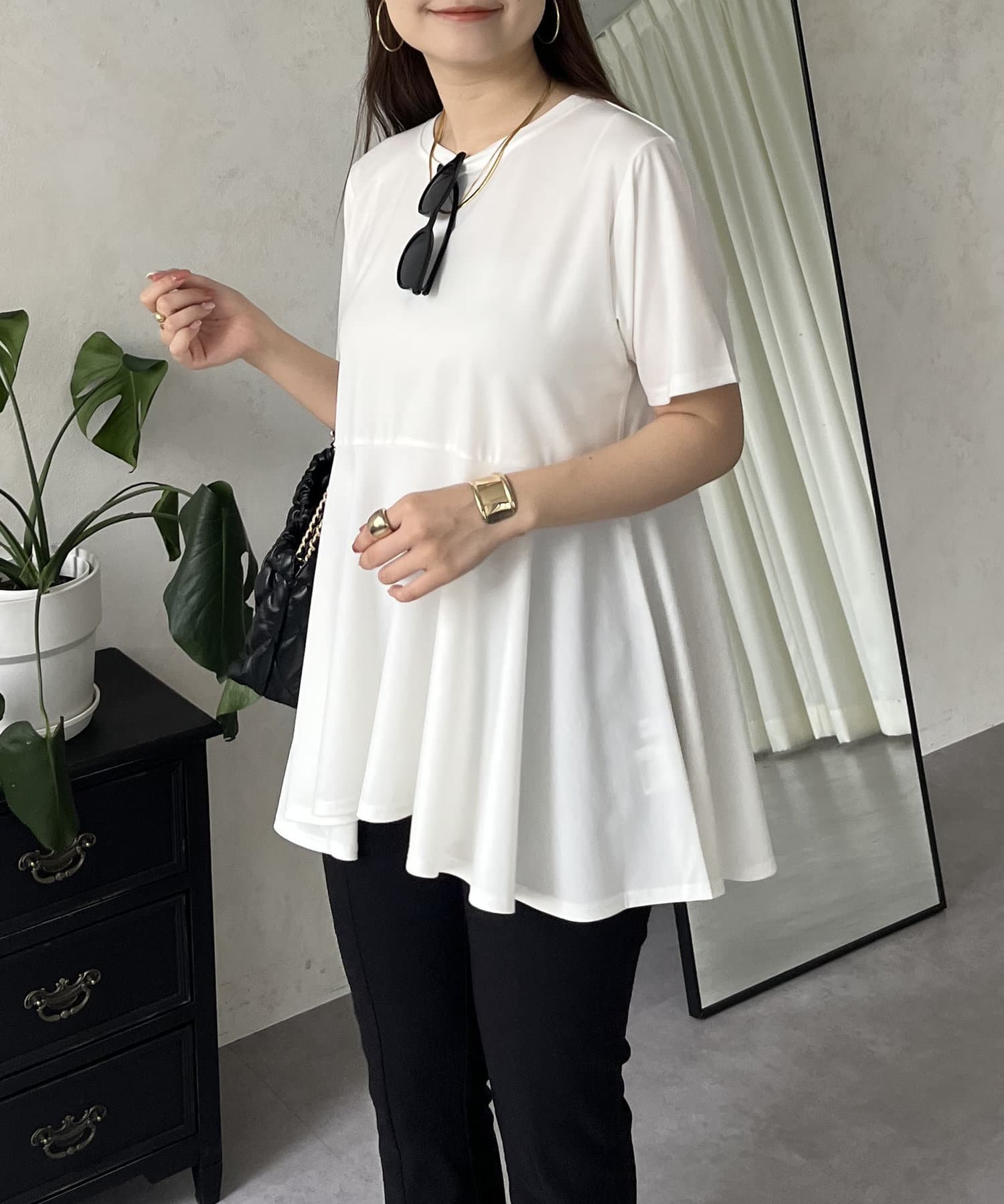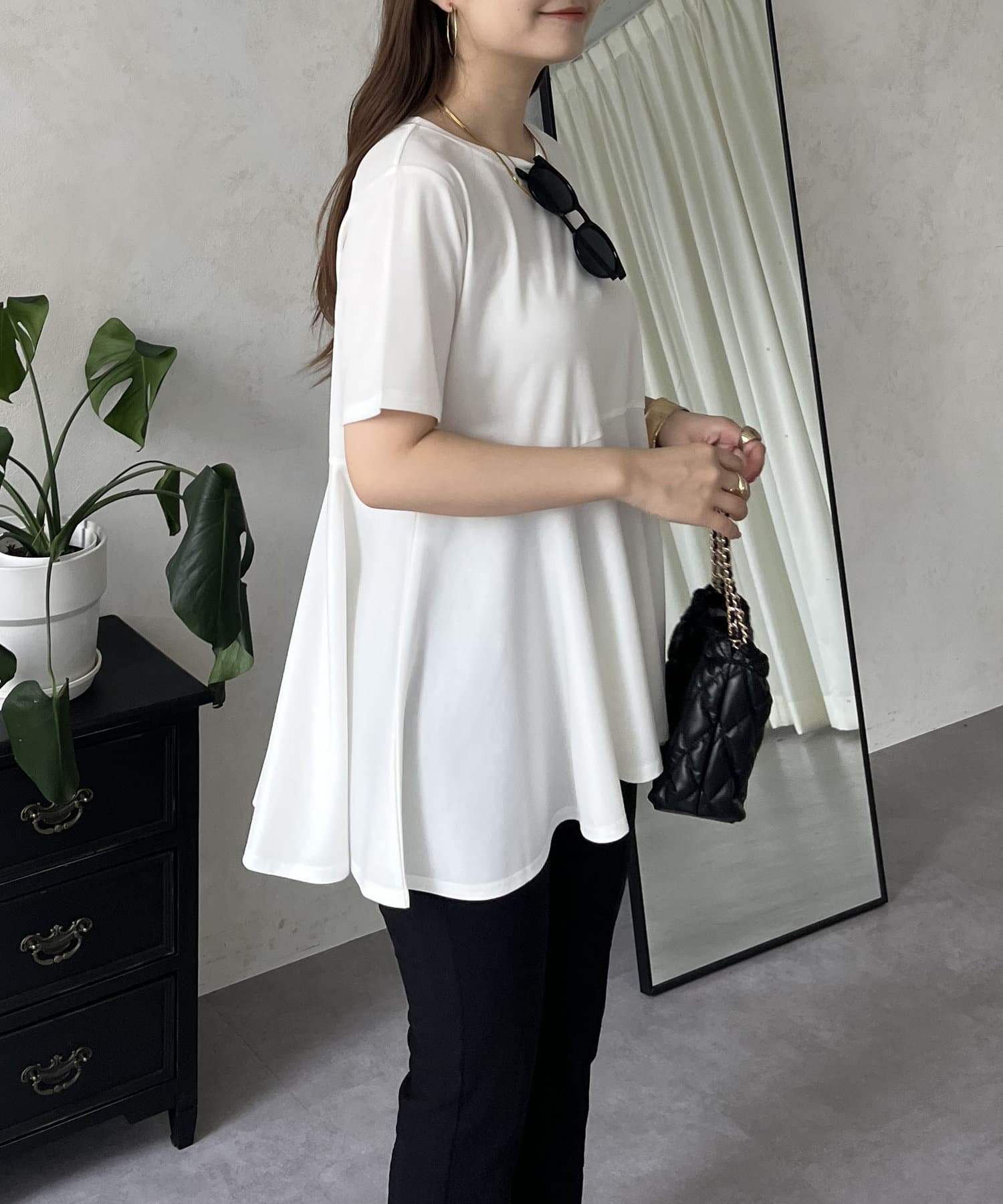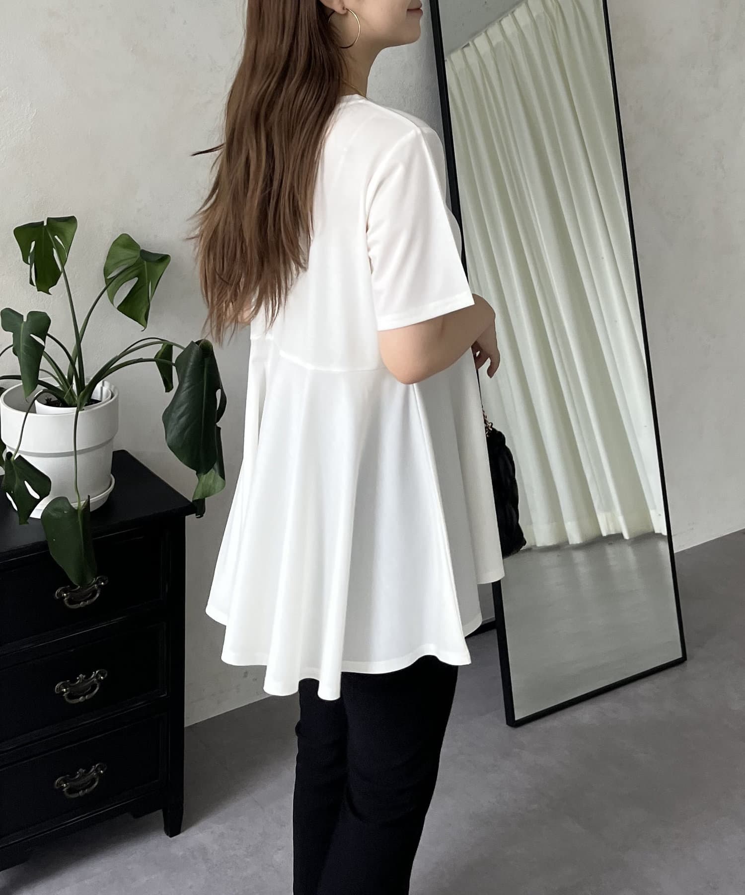 カジュアルとフェミニンをミックスさせたペプラムTシャツ