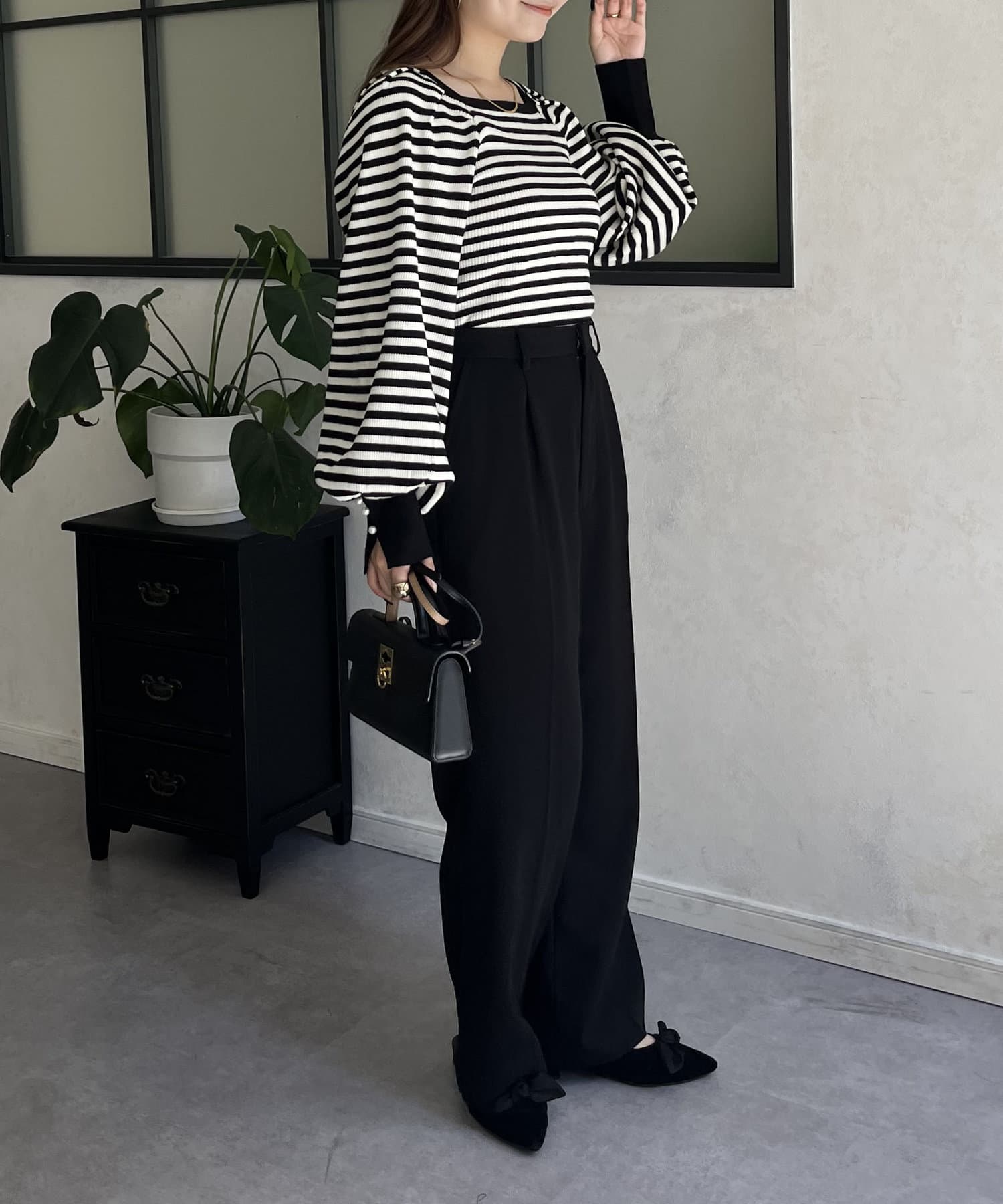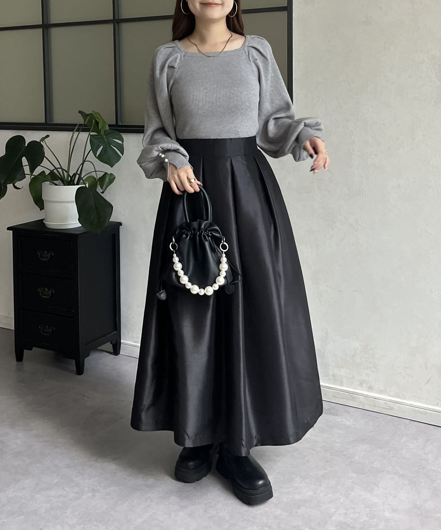 袖にボリュームがありますがスクエアネックなのですっきり着れます。パールも可愛いです。綺麗めからカジュアルまで幅広く着回せそうです。