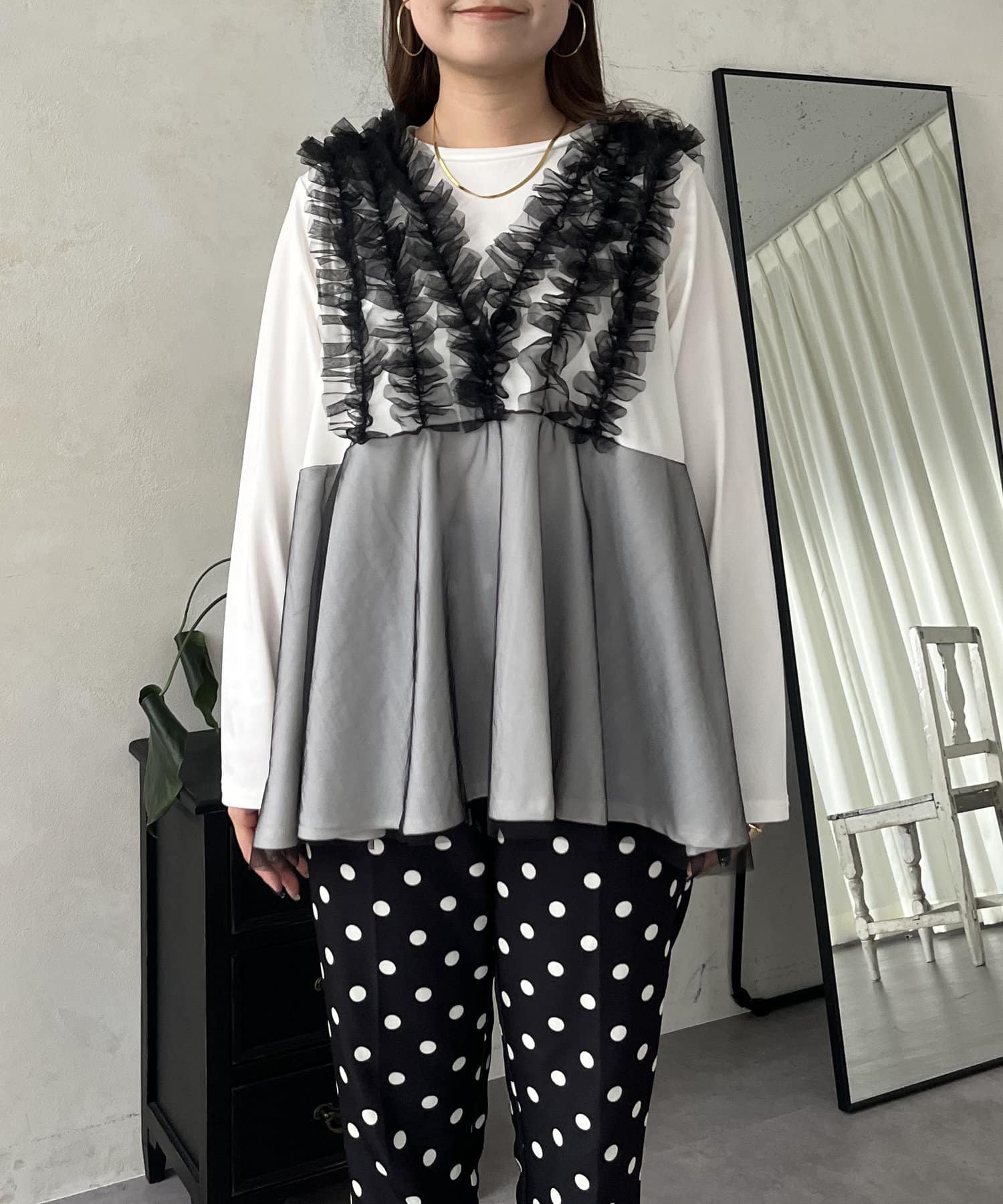 1枚でレイヤードコーデが完成するチュールドッキングトップス