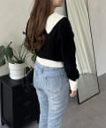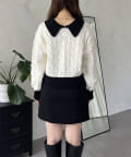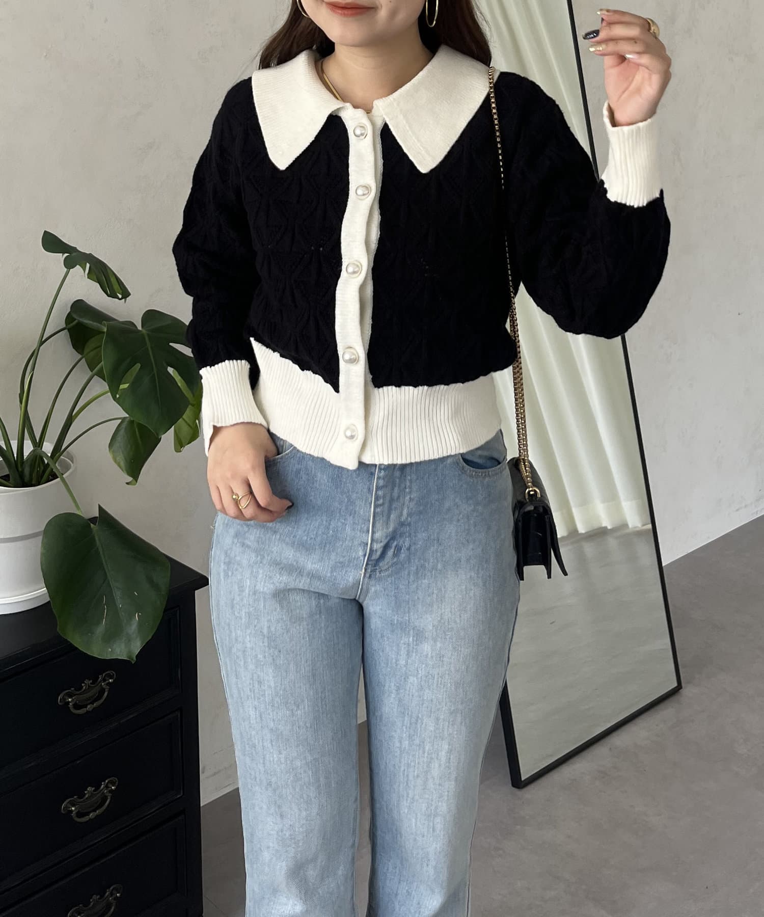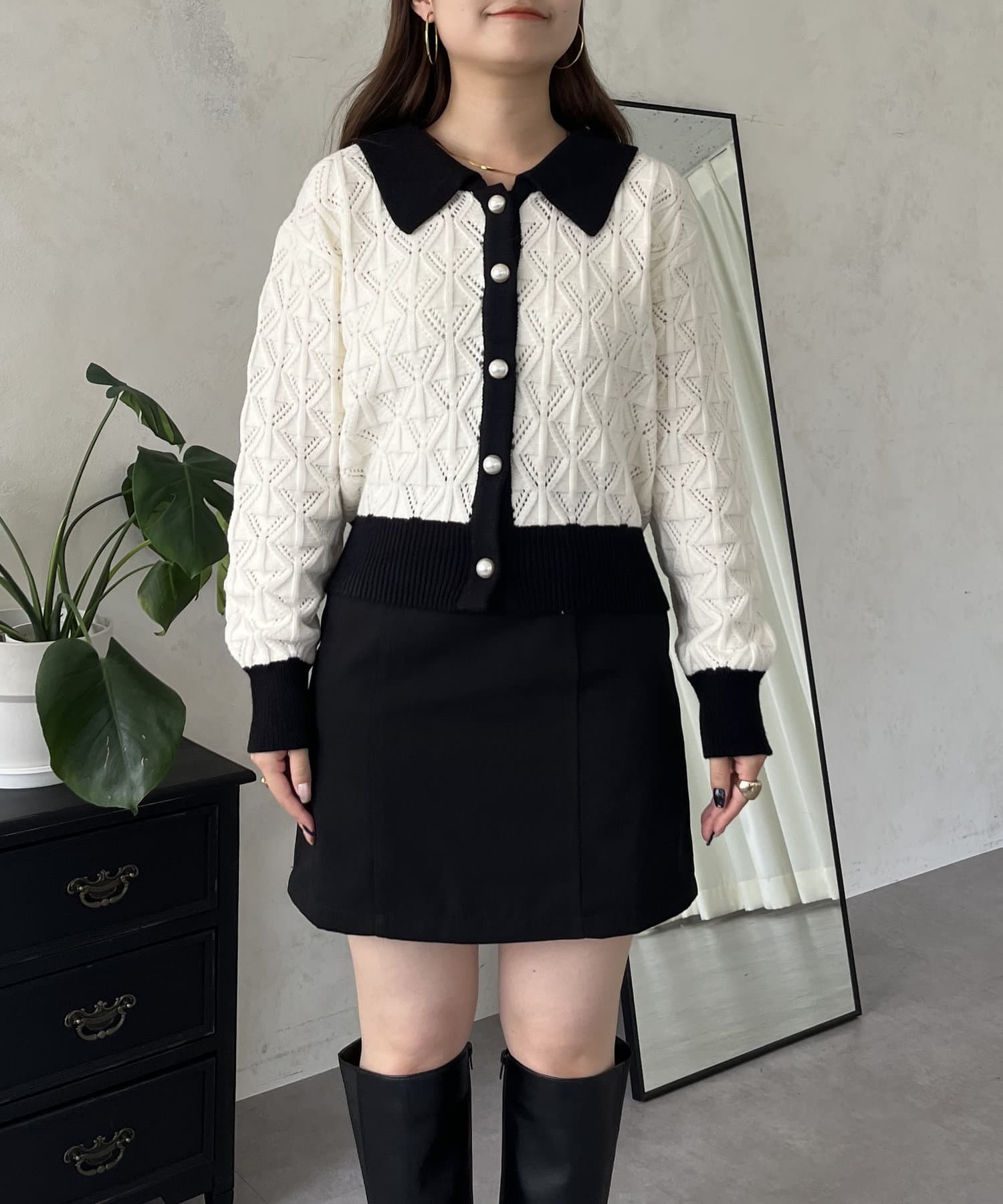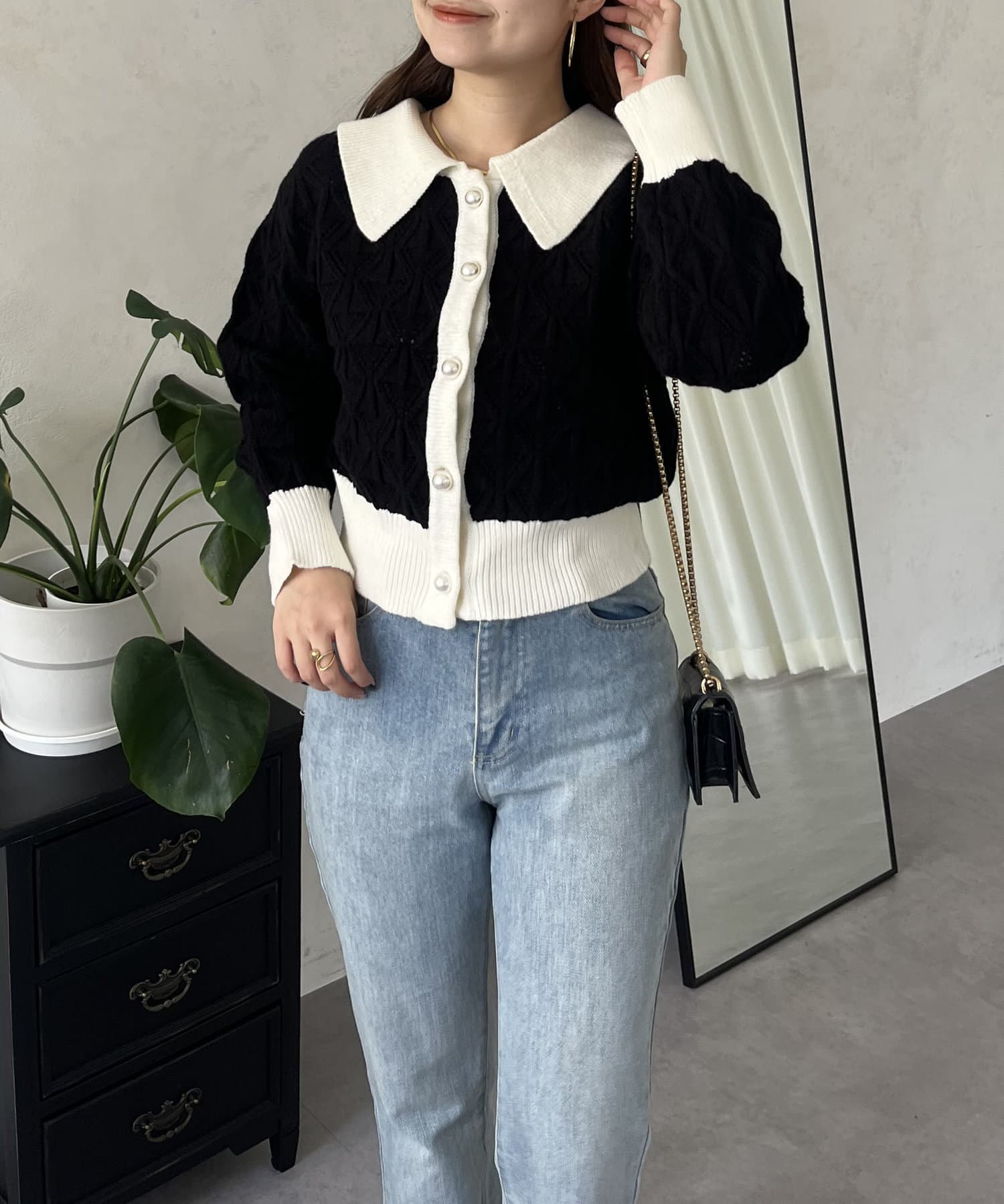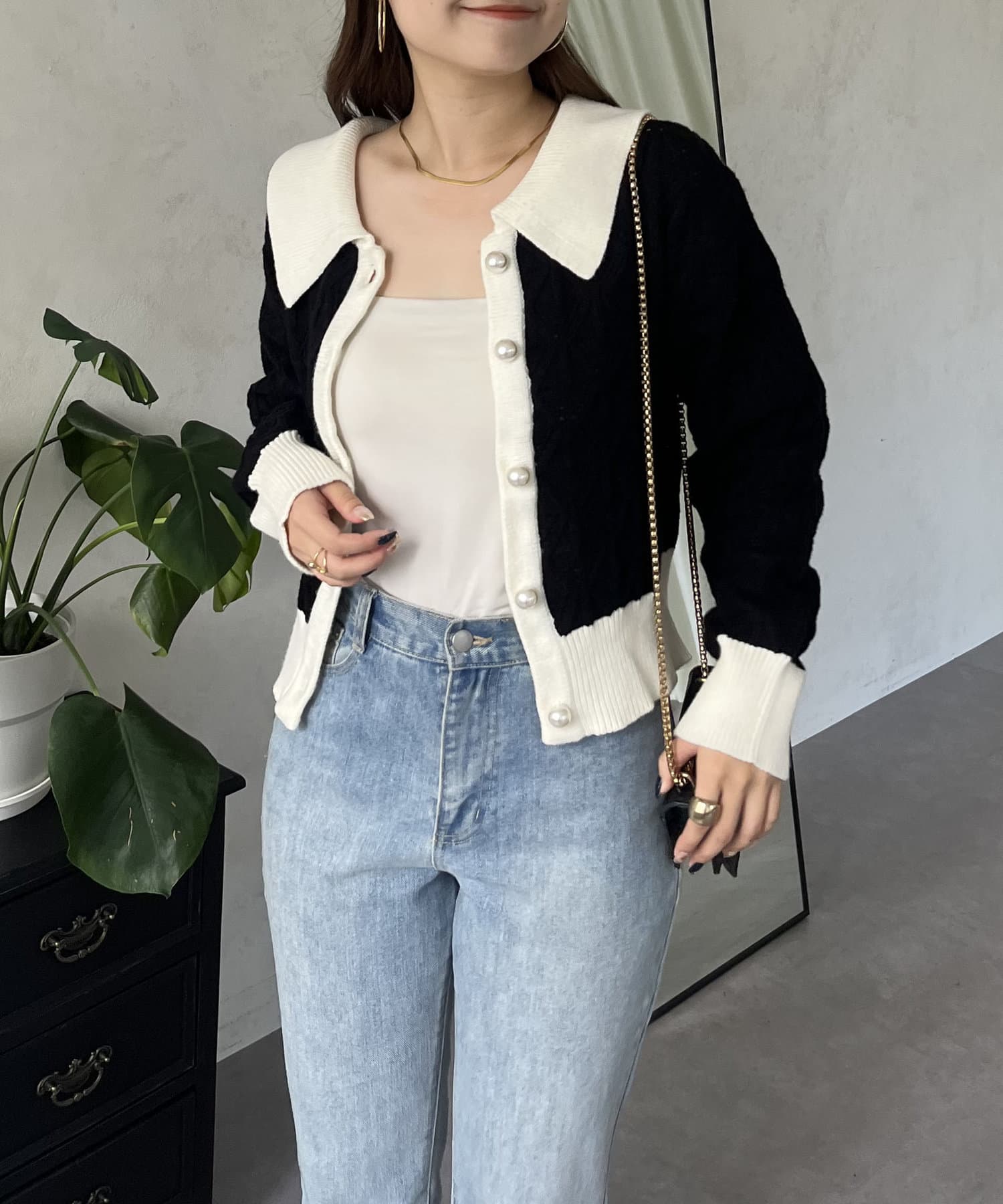 バイカラーパールボタン襟付きニットカーデ