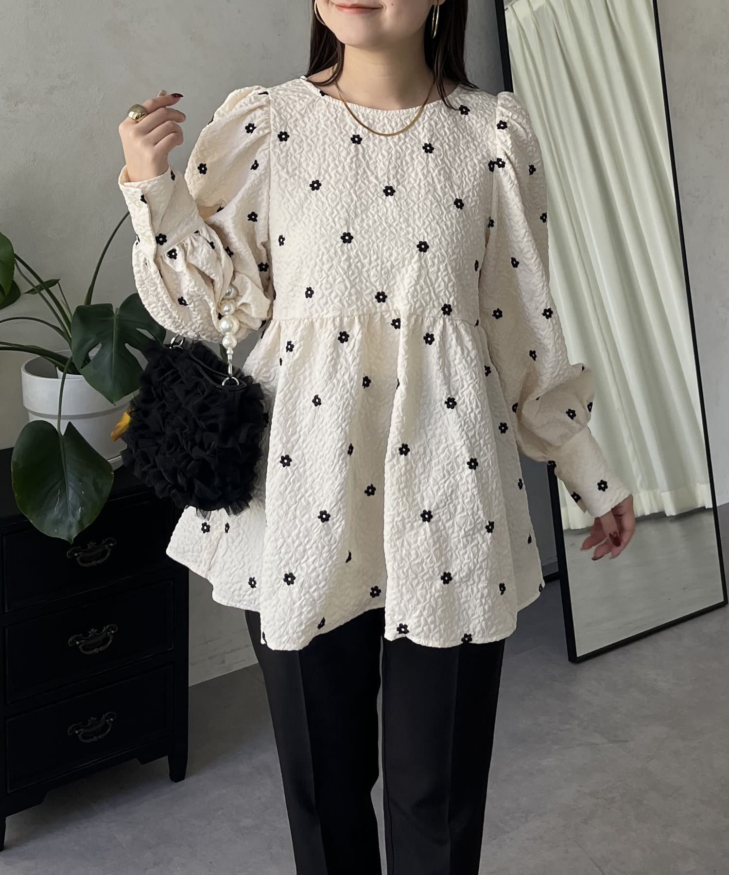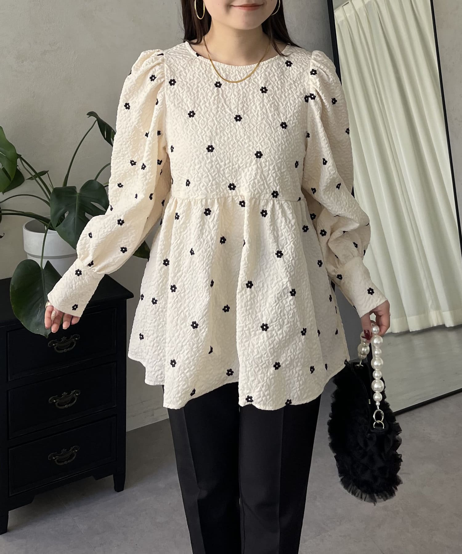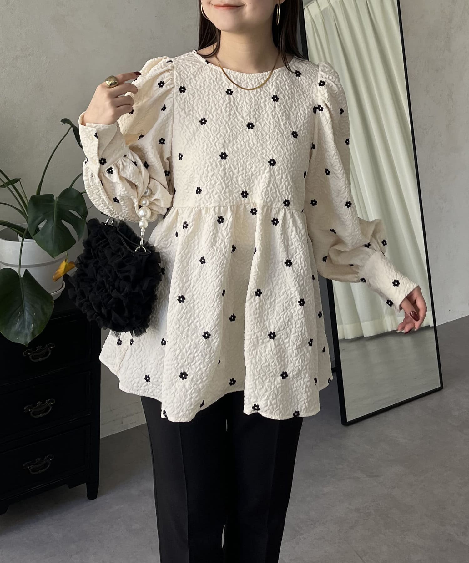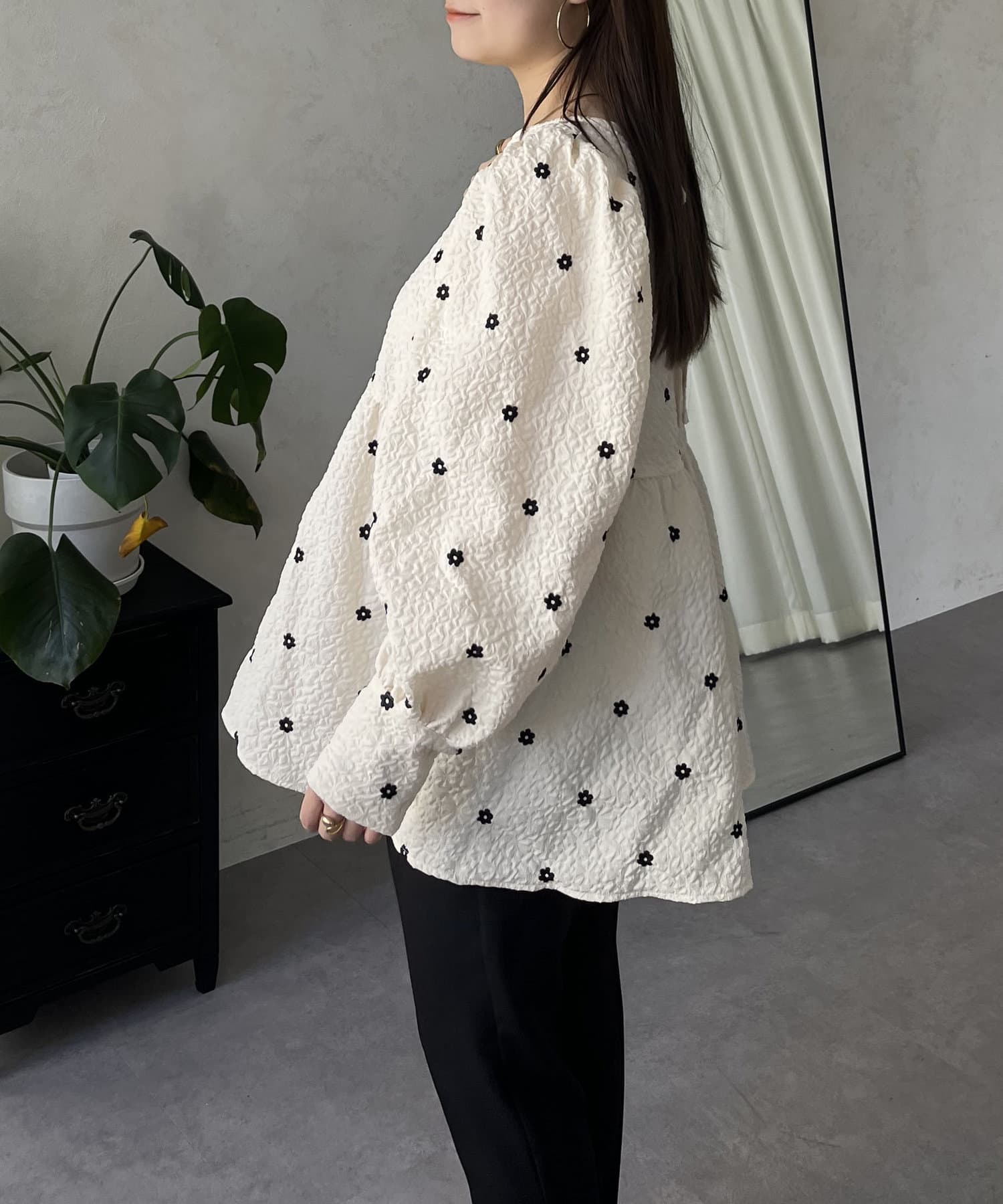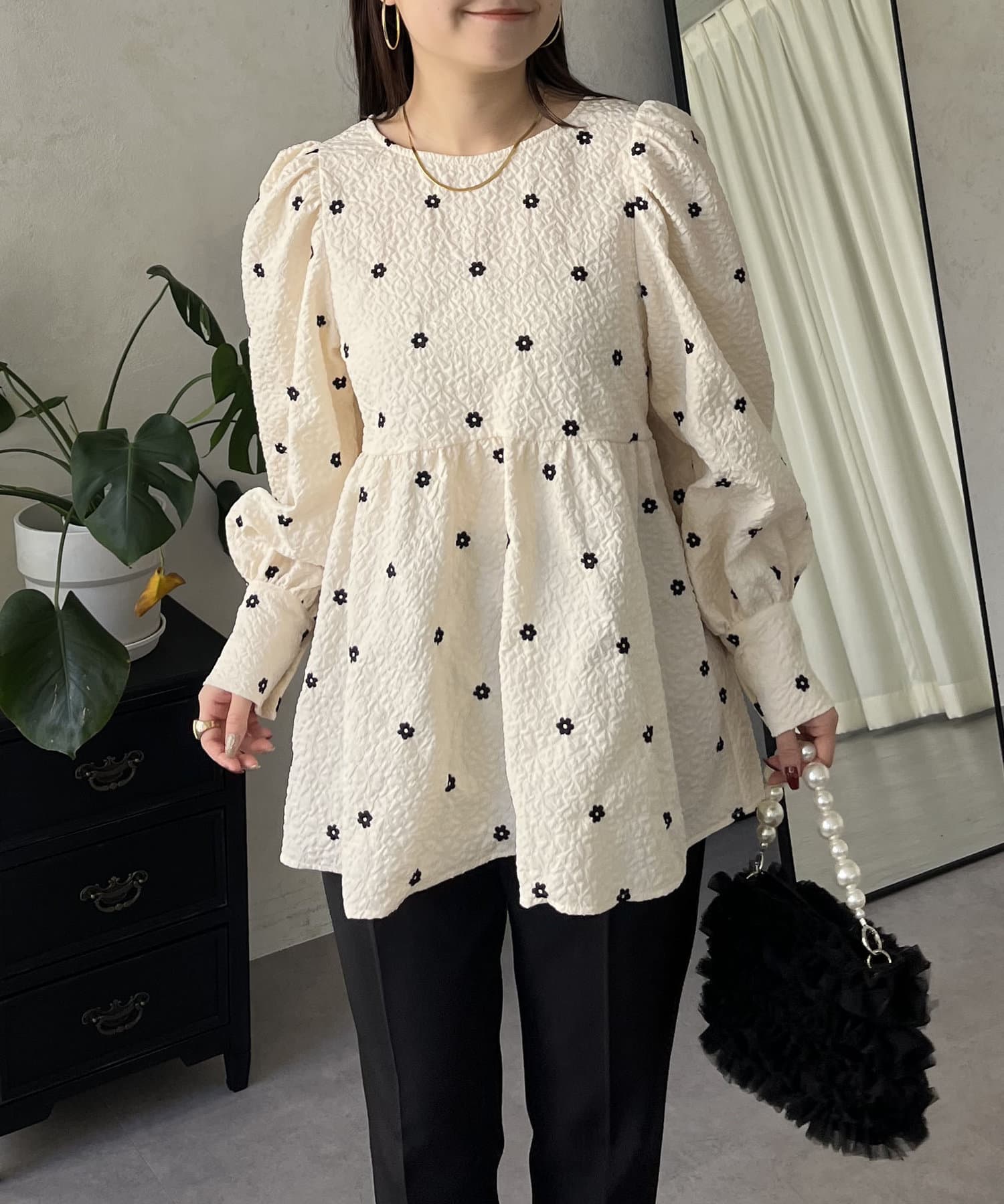 • prose verse(プロズヴェール) フラワー刺繍パフスリーブペプラムブラウス