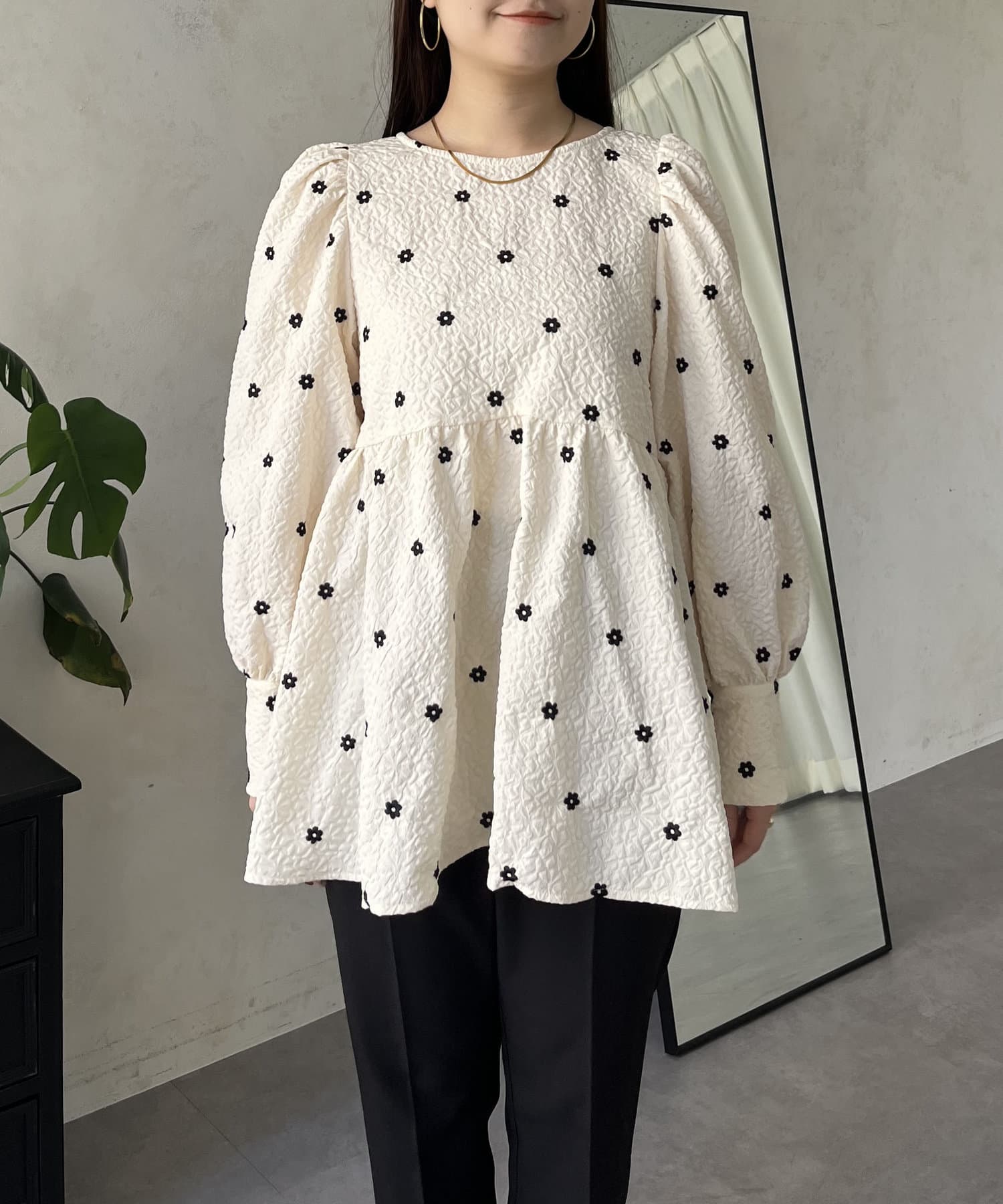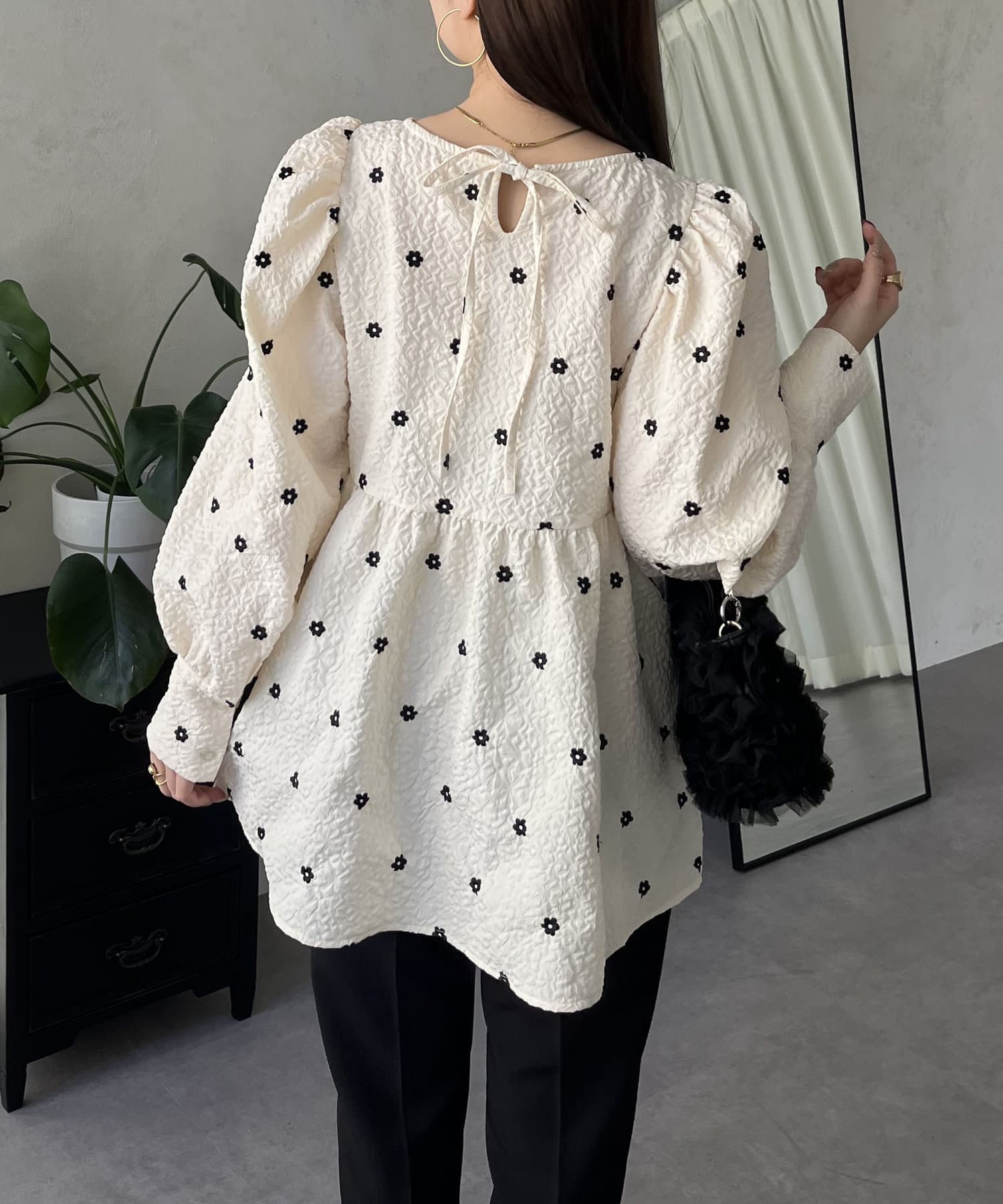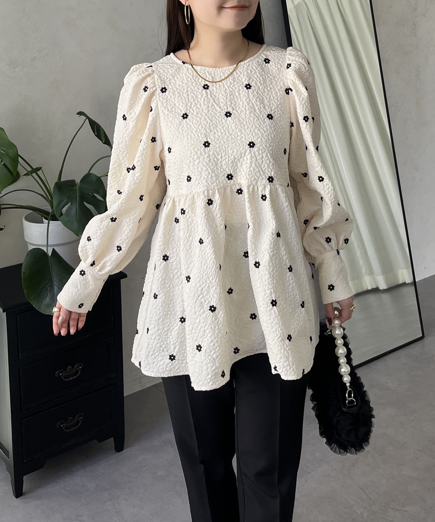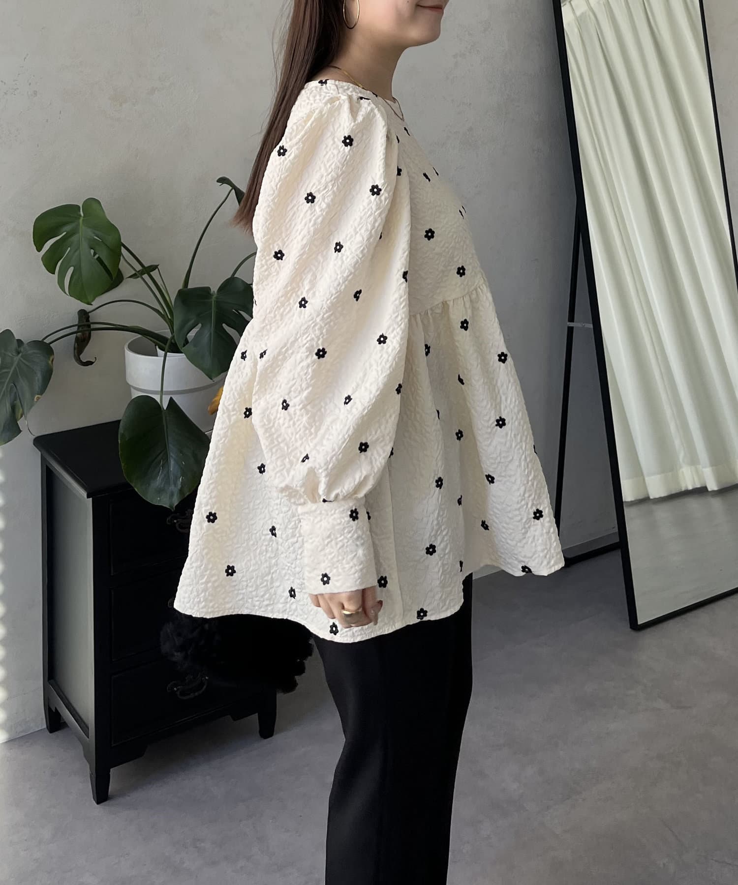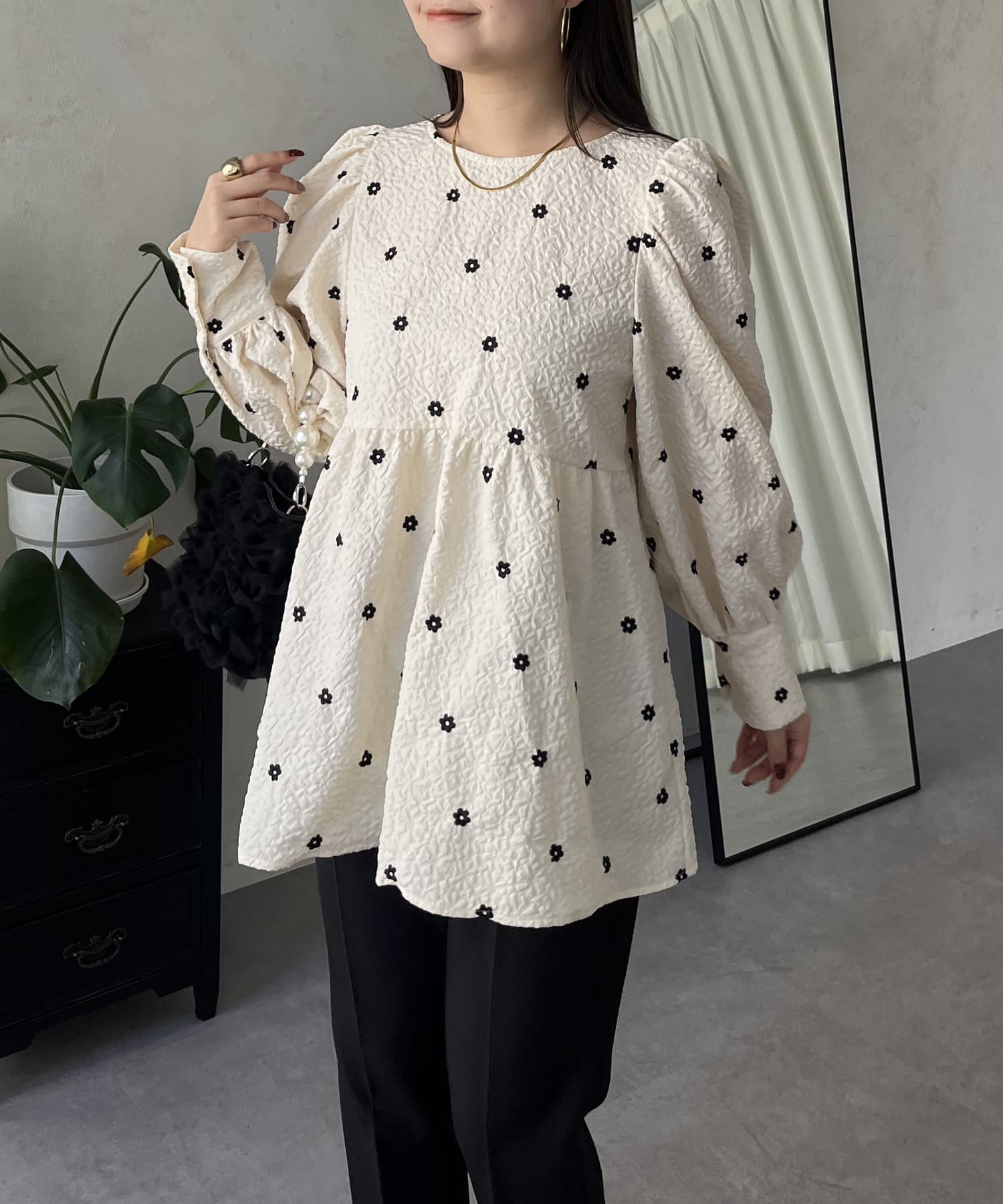 • prose verse(プロズヴェール) フラワー刺繍パフスリーブペプラムブラウス