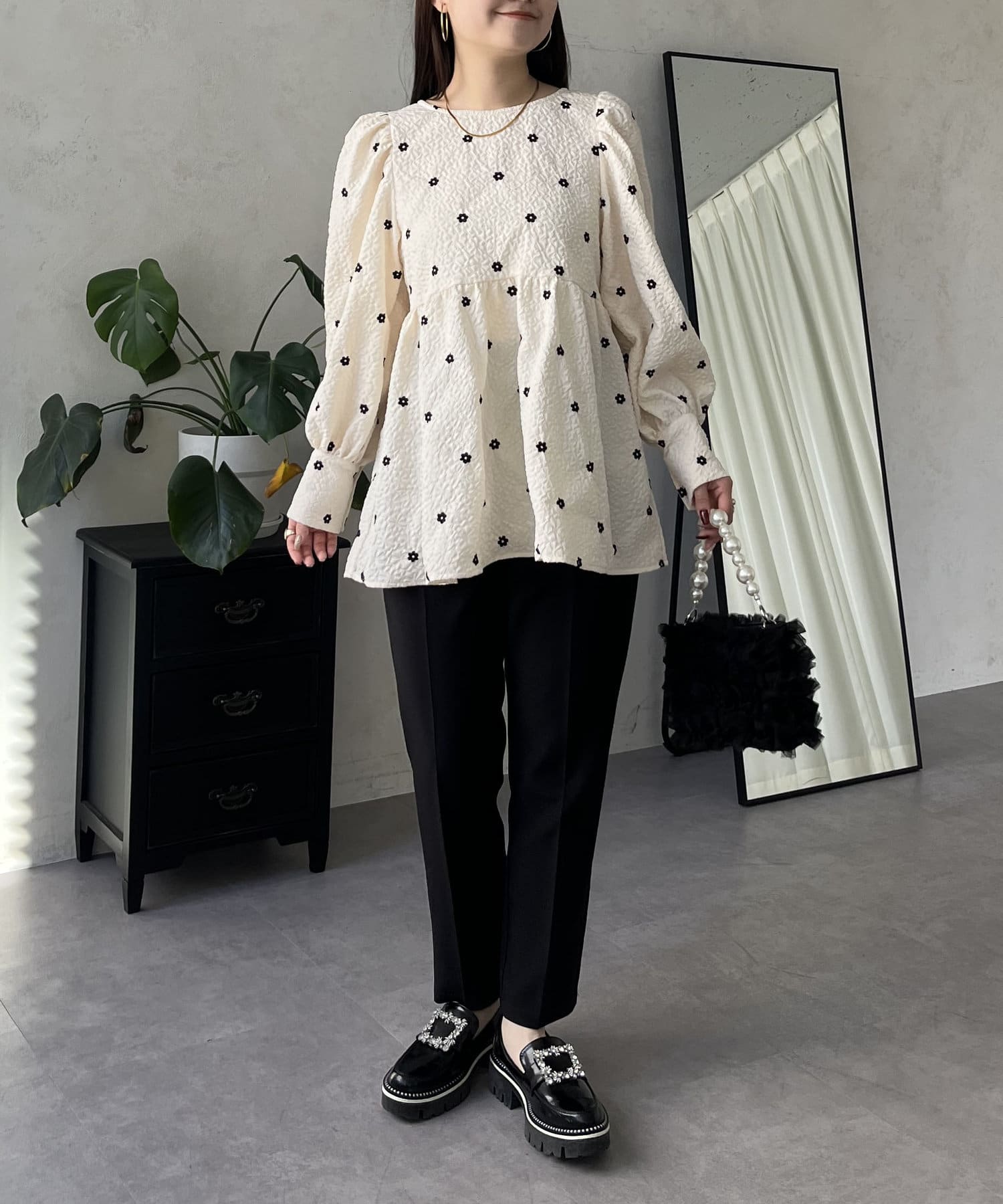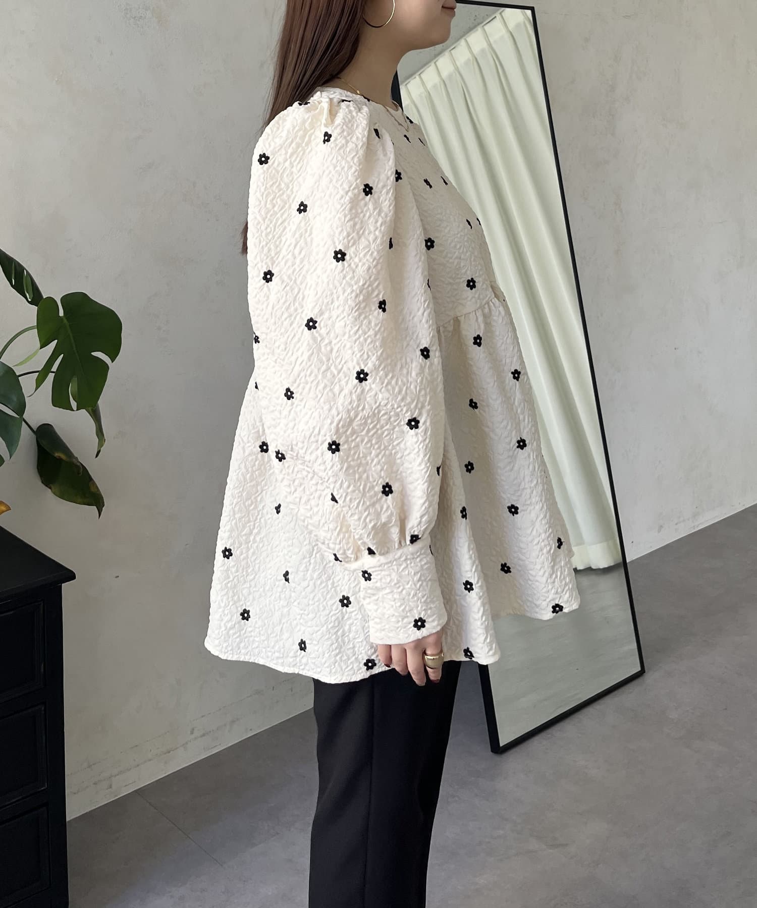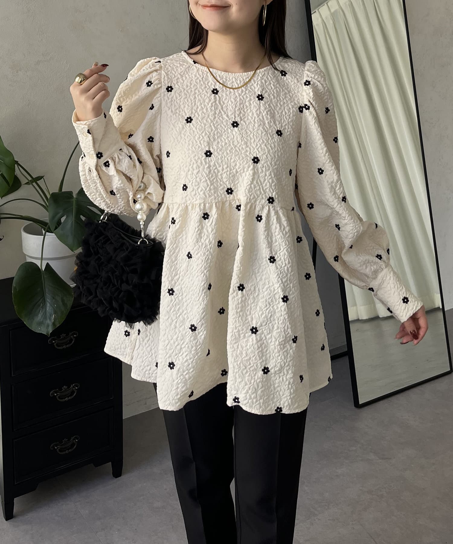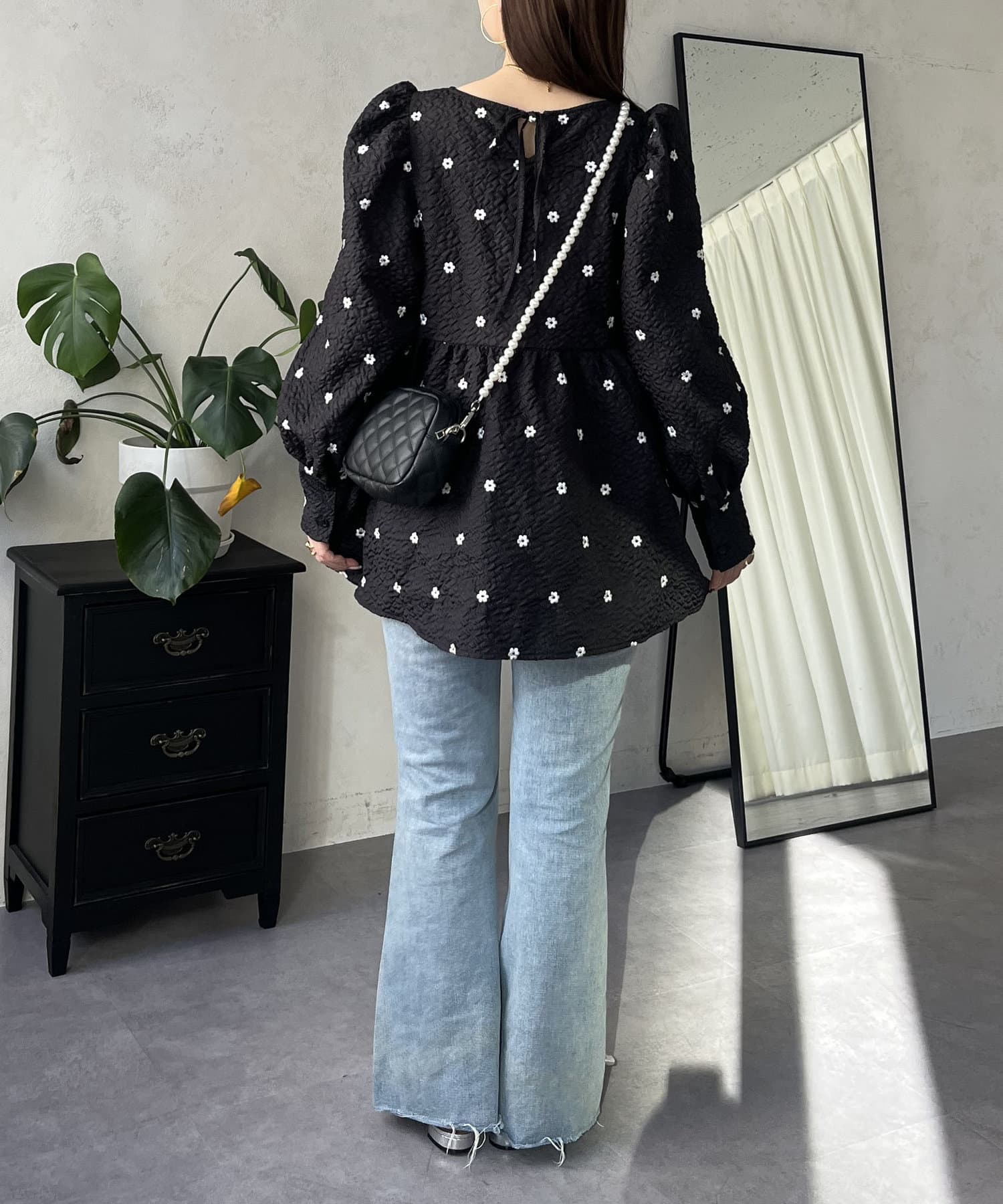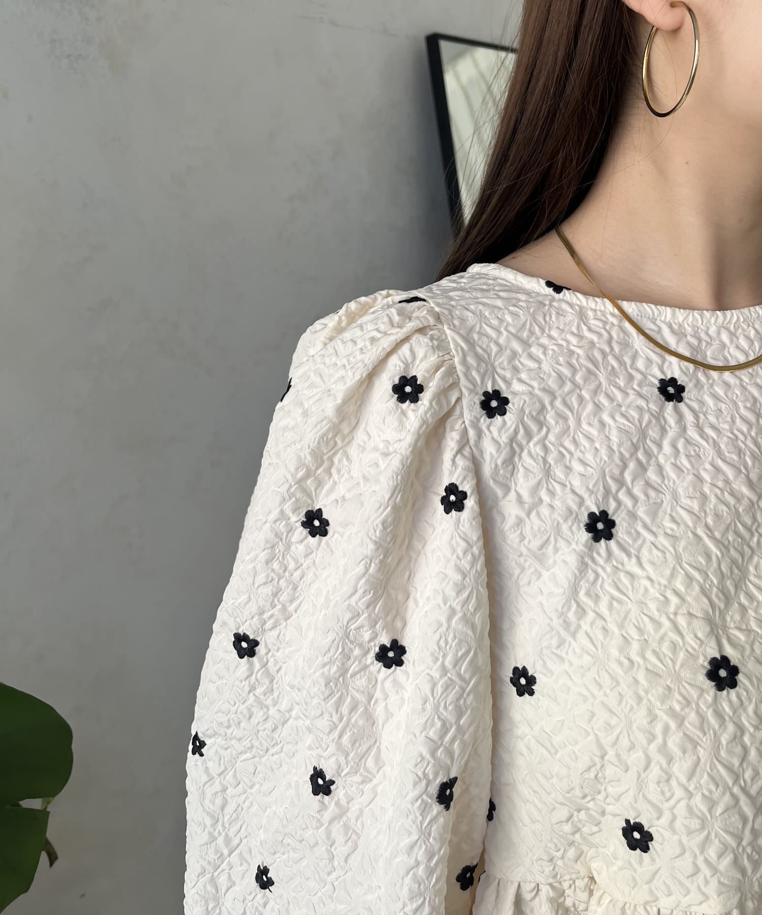 • prose verse(プロズヴェール) フラワー刺繍パフスリーブペプラムブラウス