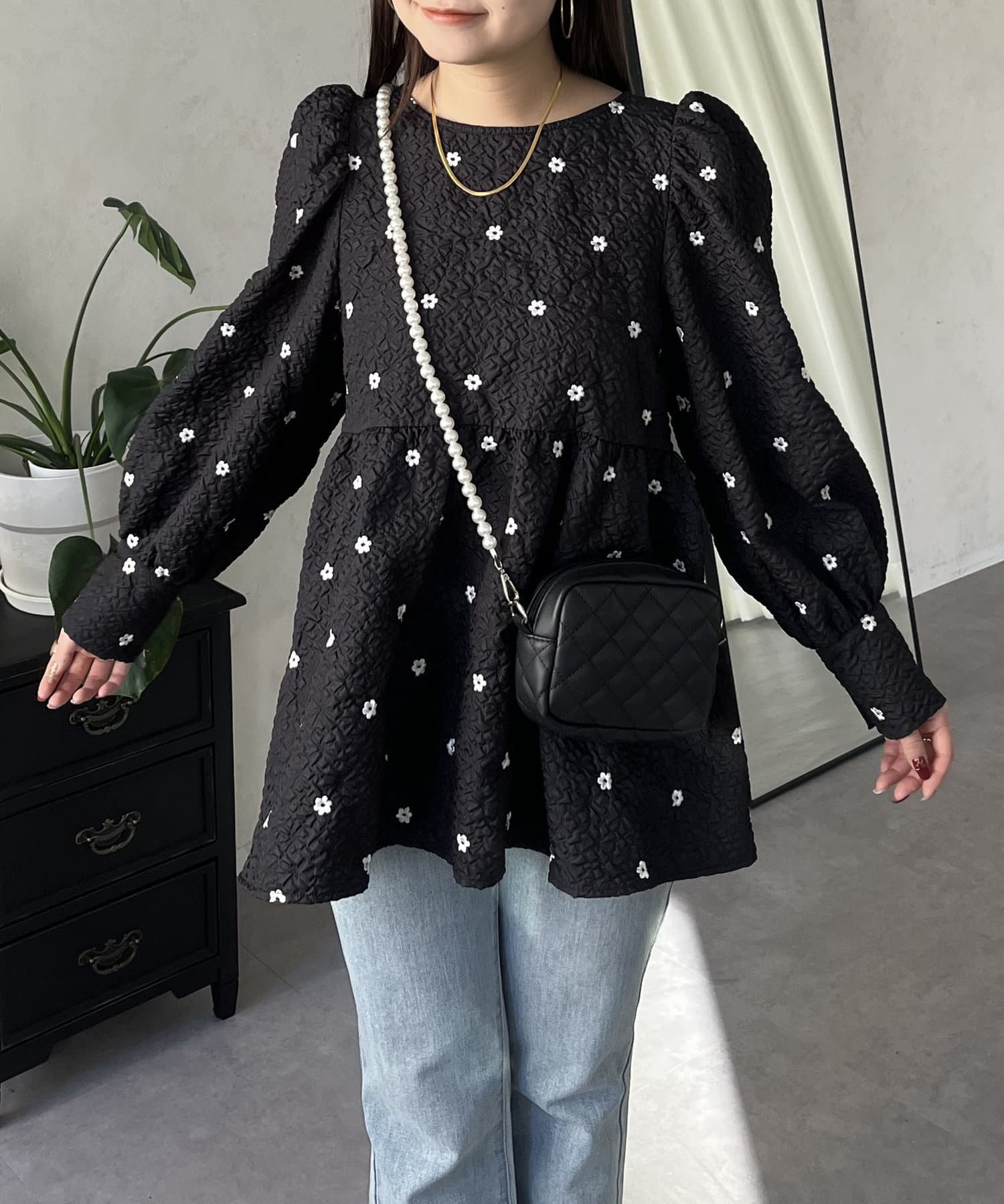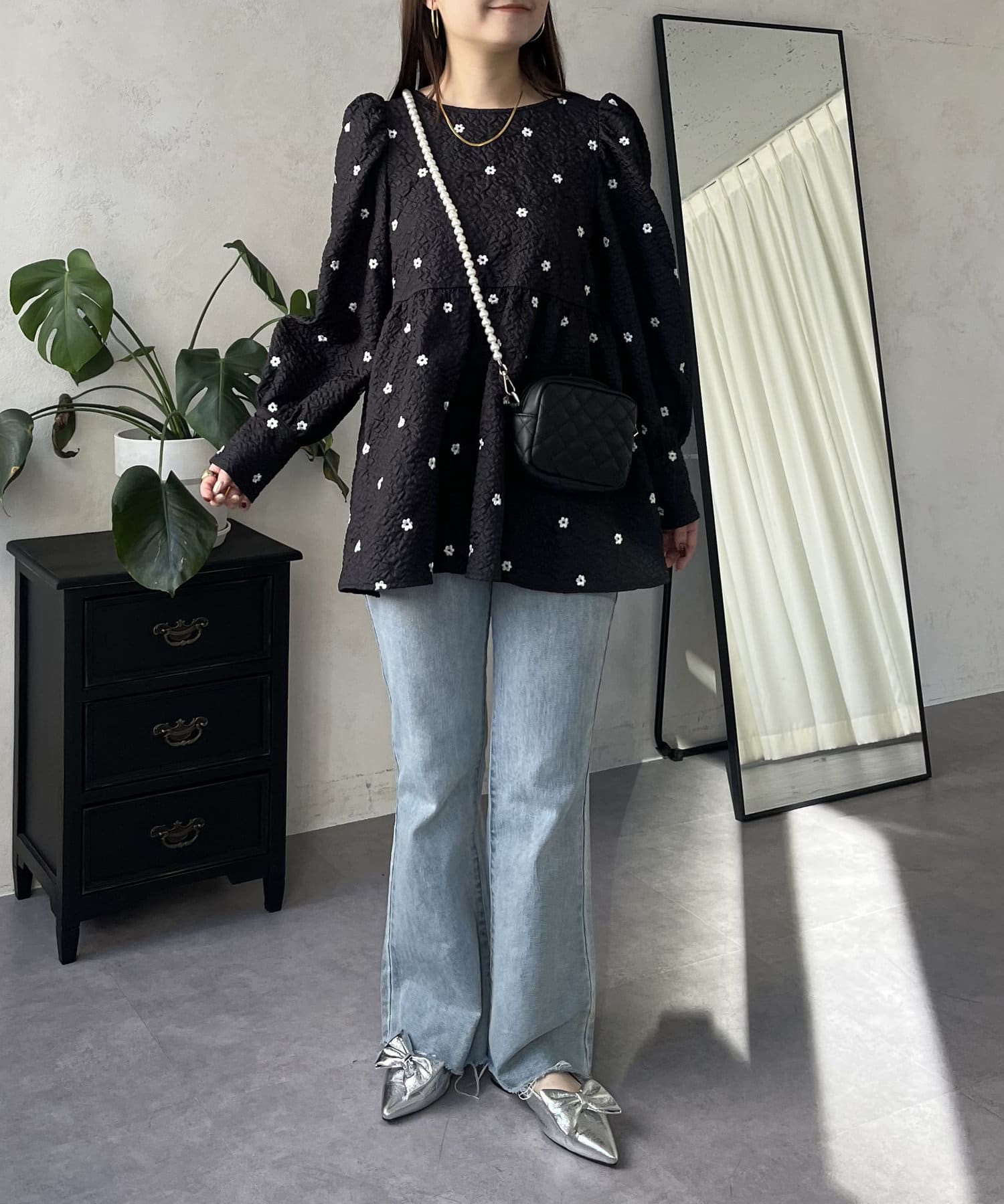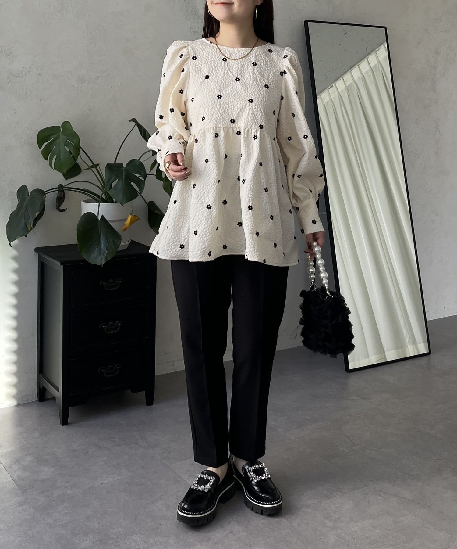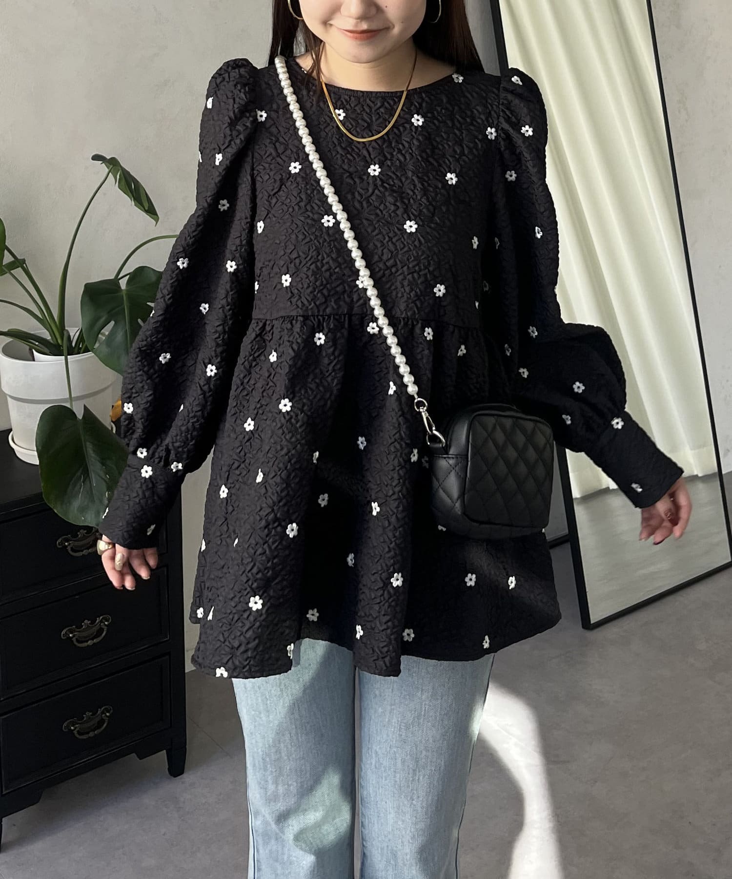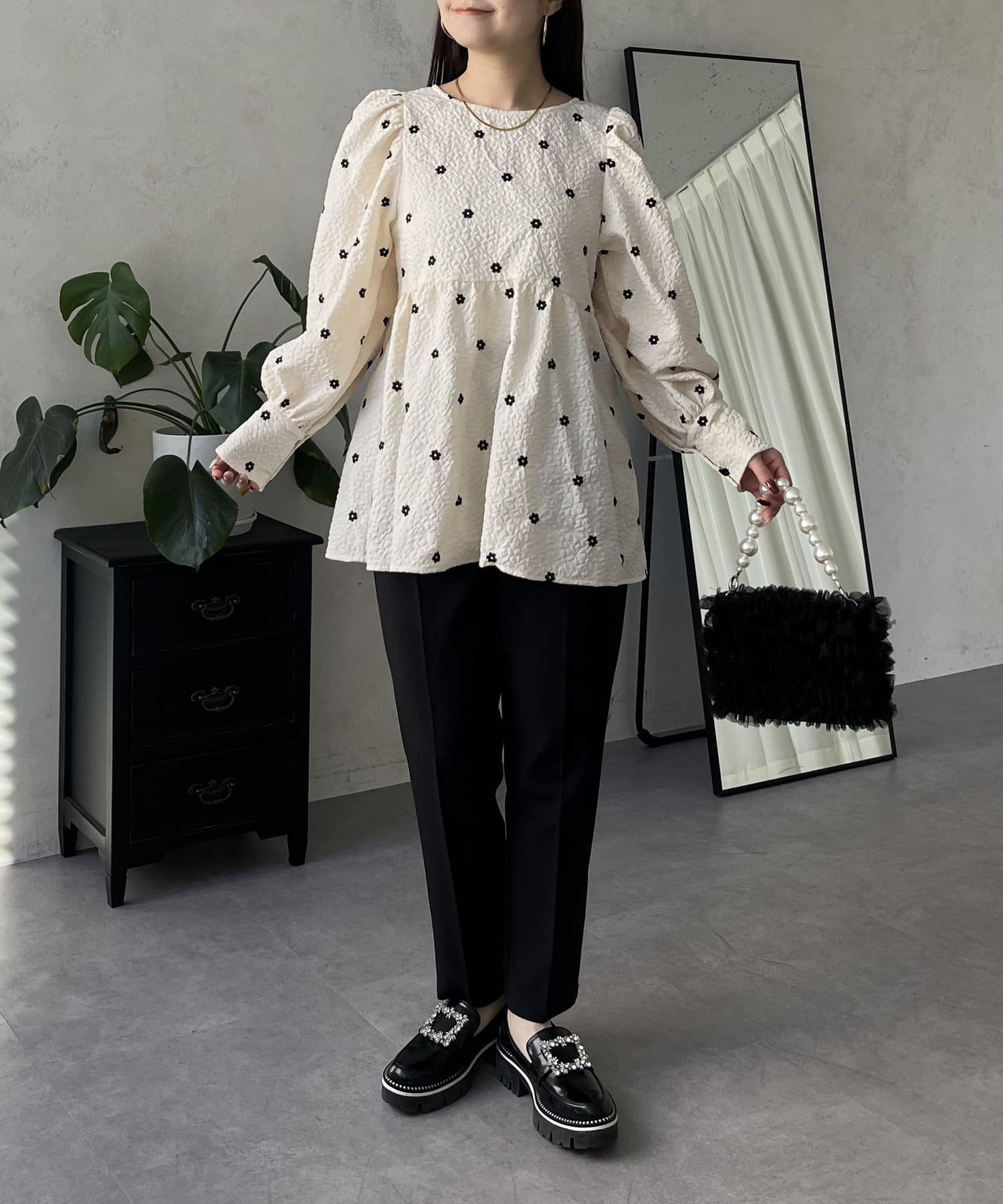 • prose verse(プロズヴェール) フラワー刺繍パフスリーブペプラムブラウス