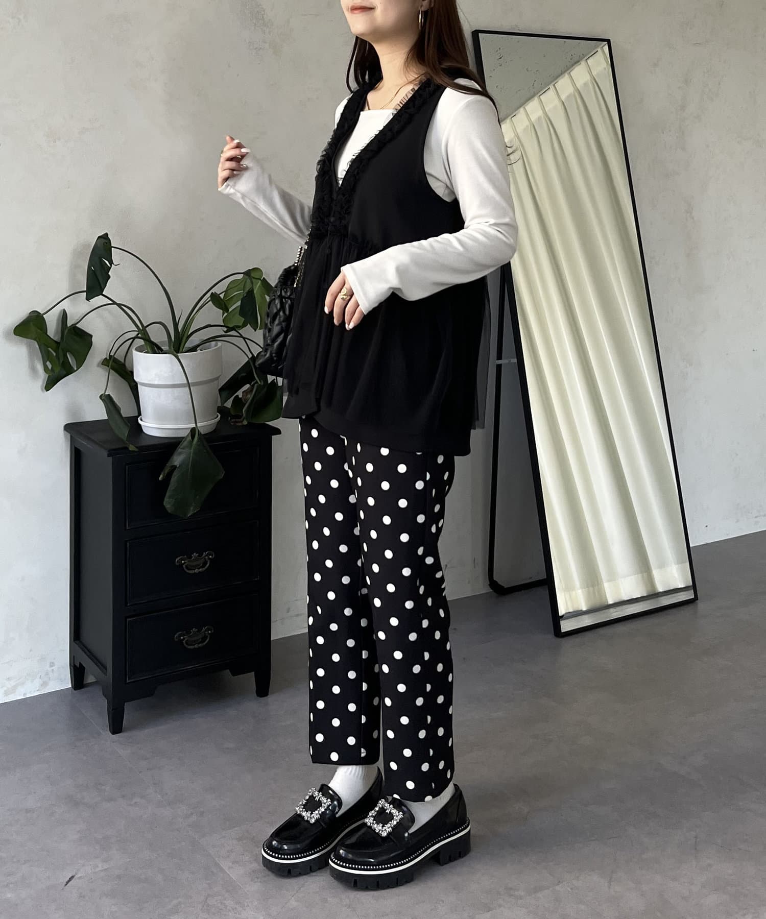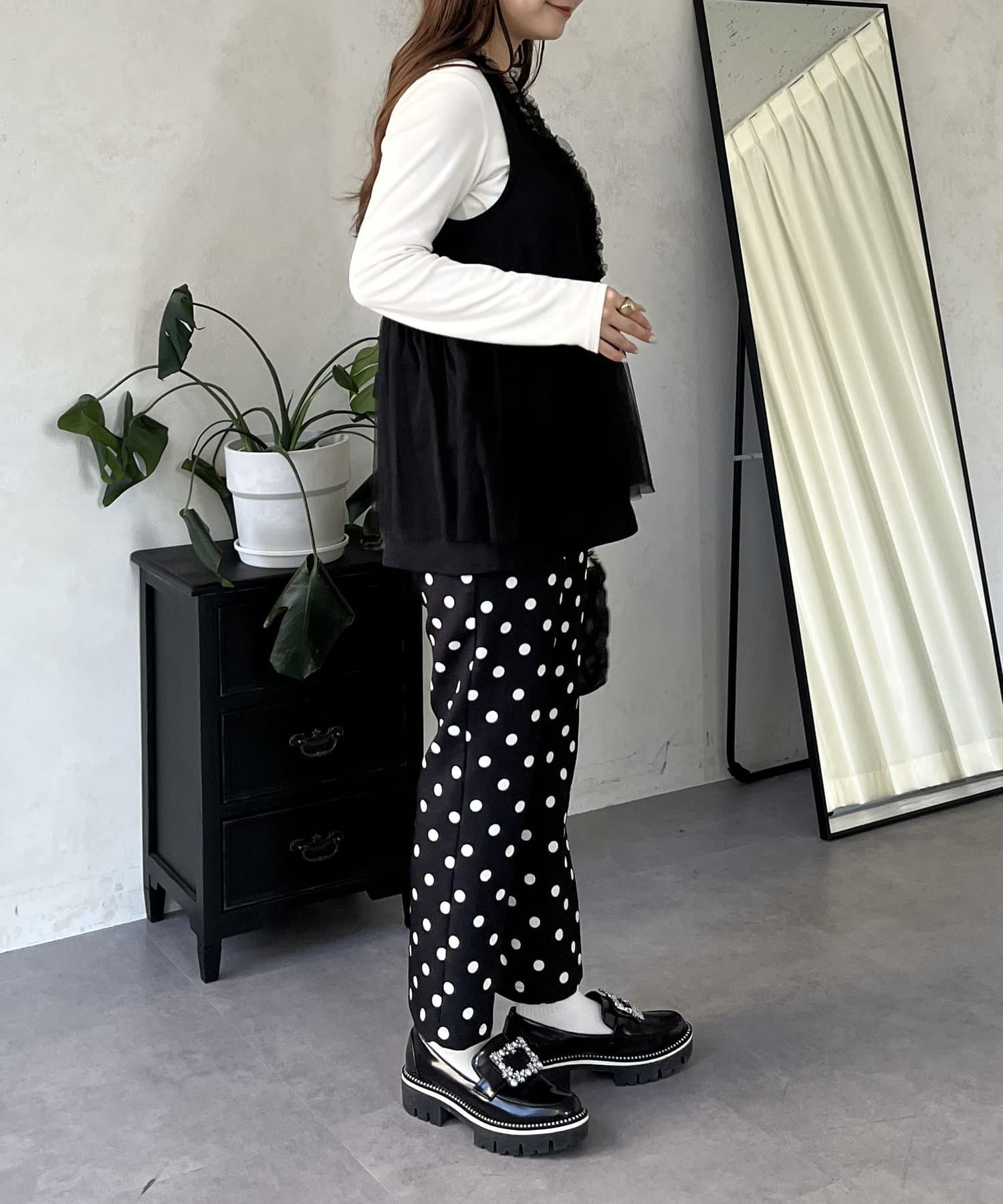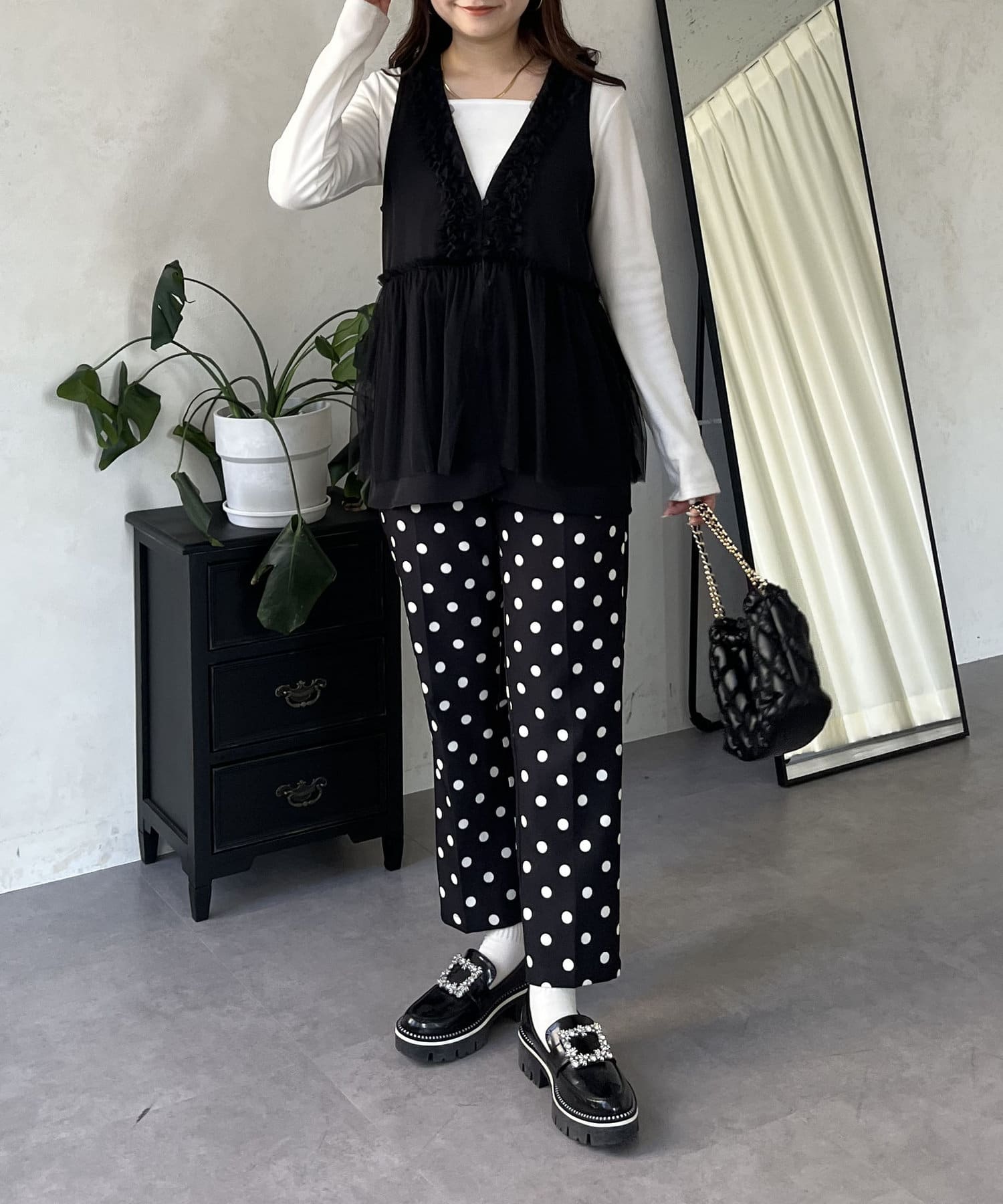 チュールだけど黒だから甘すぎず、ボトムスはボリューム少なめの細めのものと合わせて着ています。