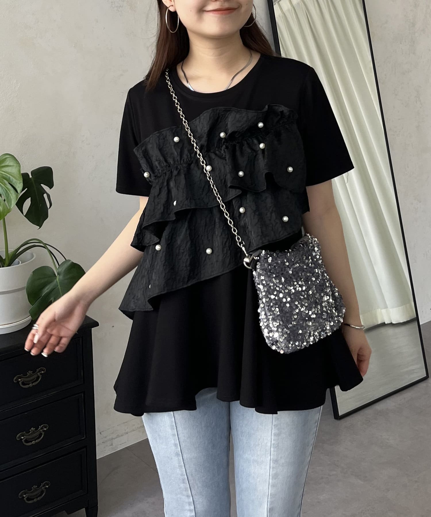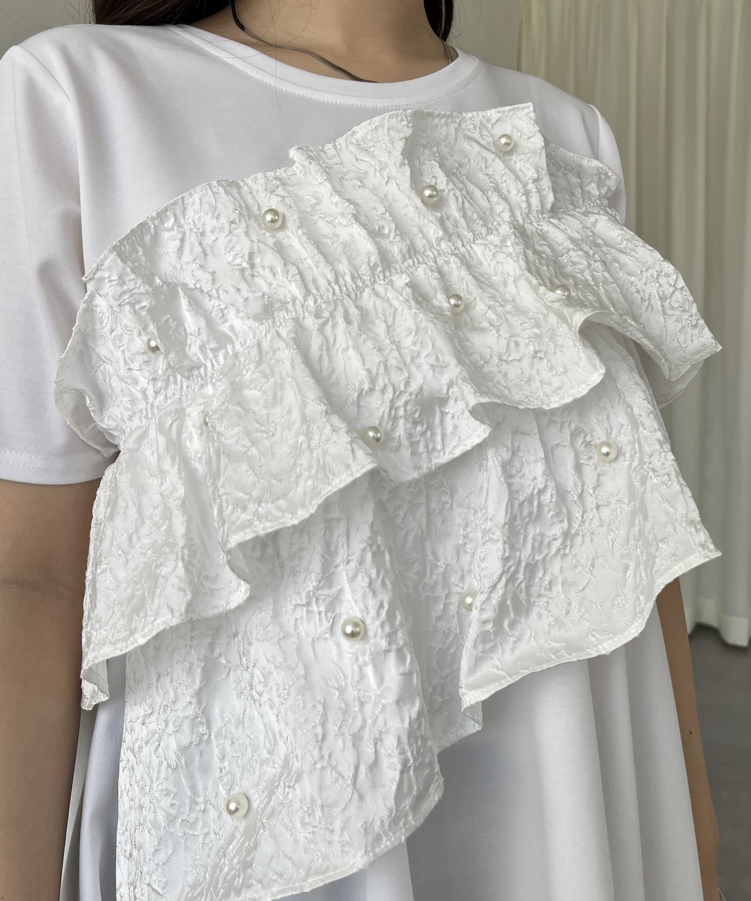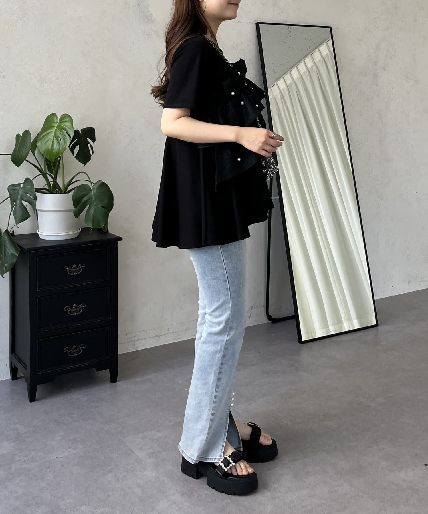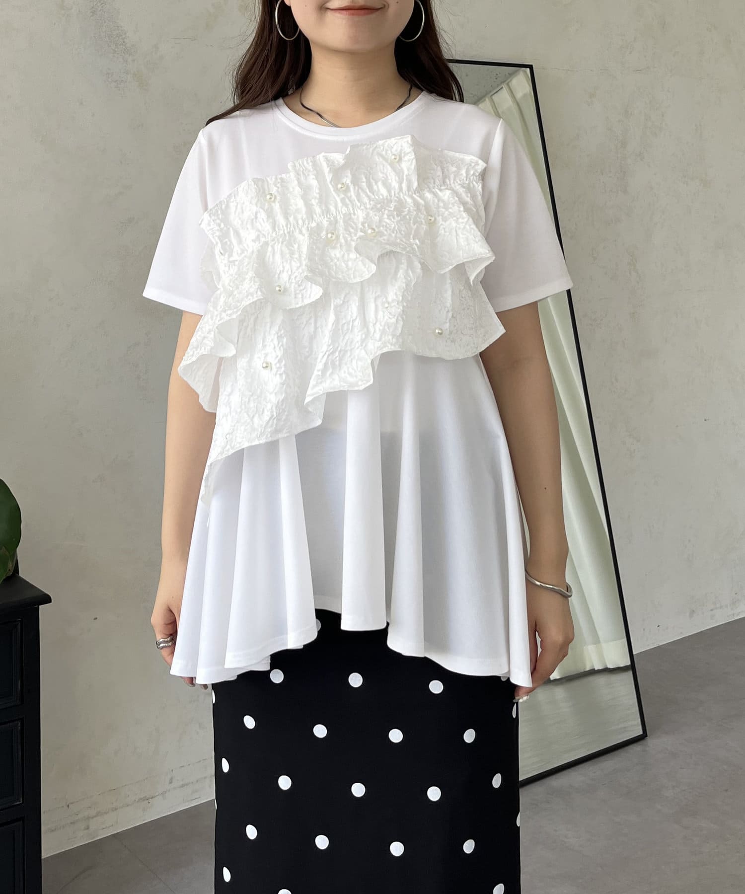 フリル×パールが華やかにしてくれるペプラムTシャツ