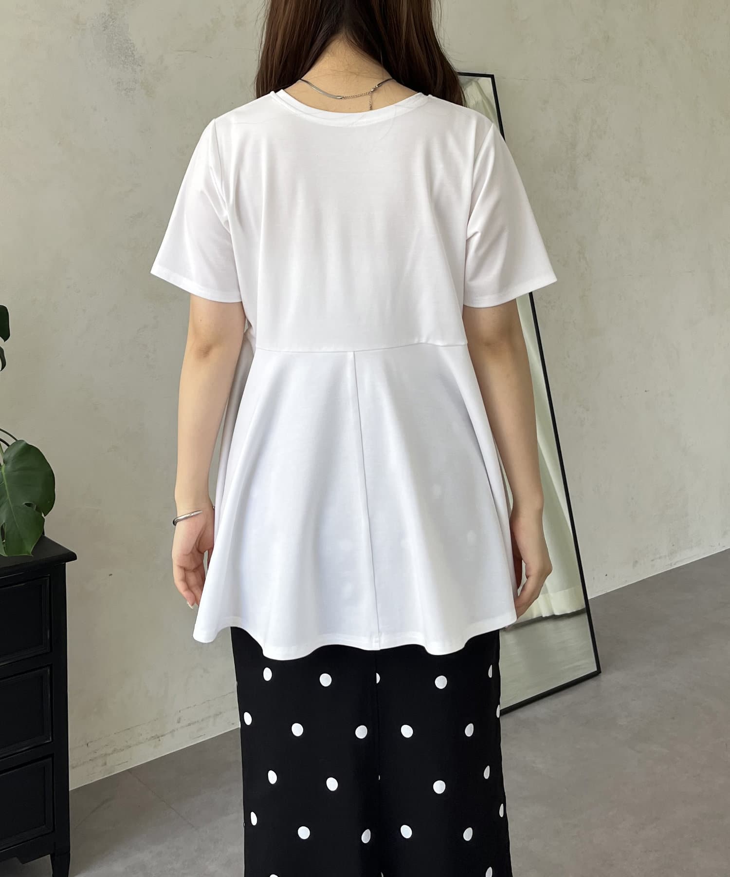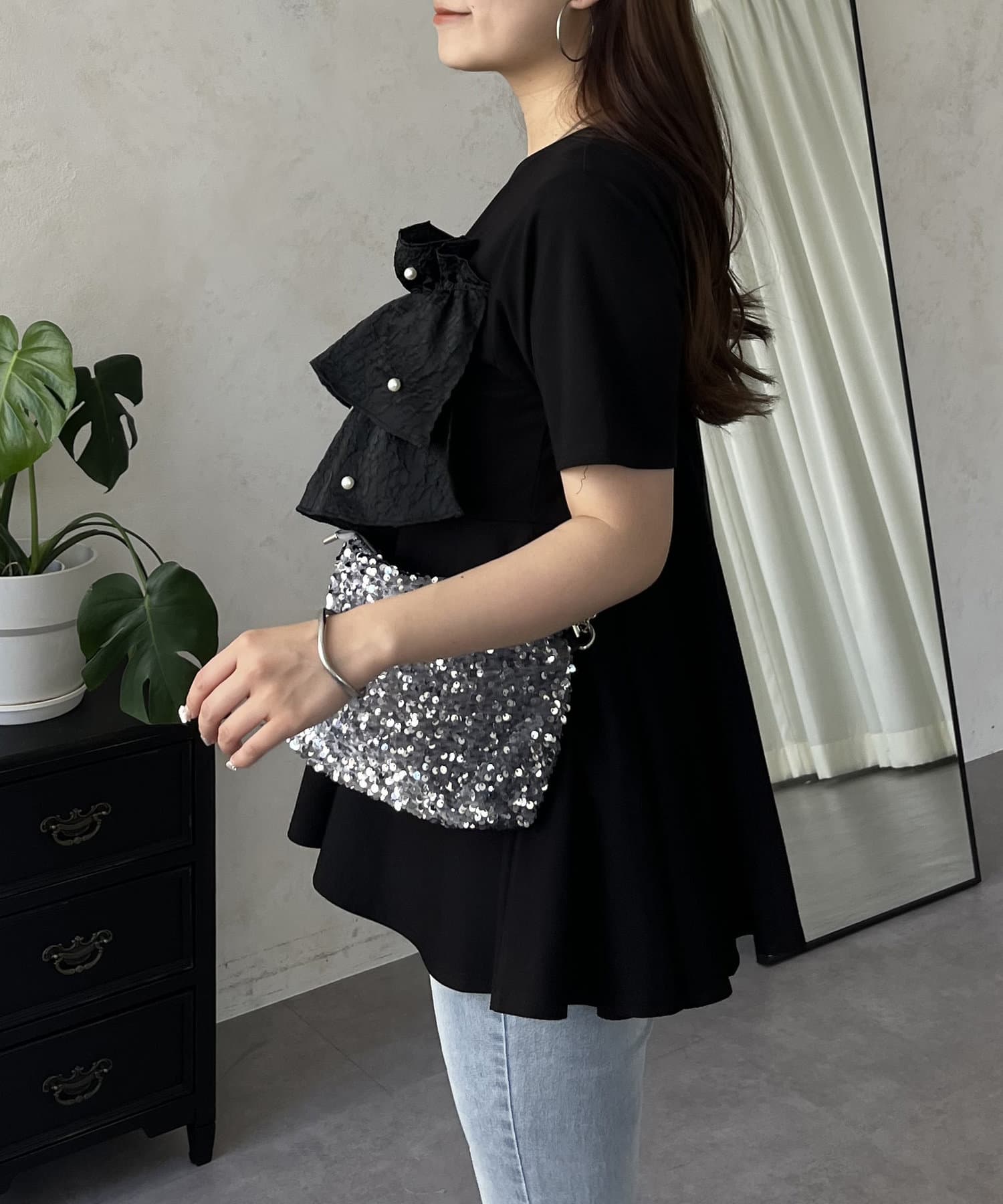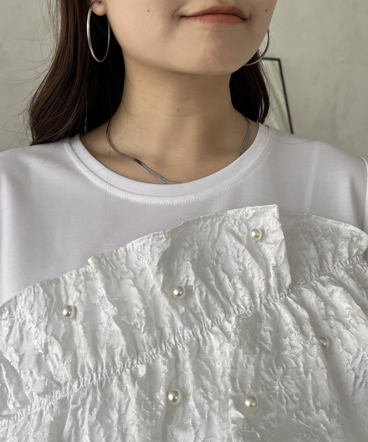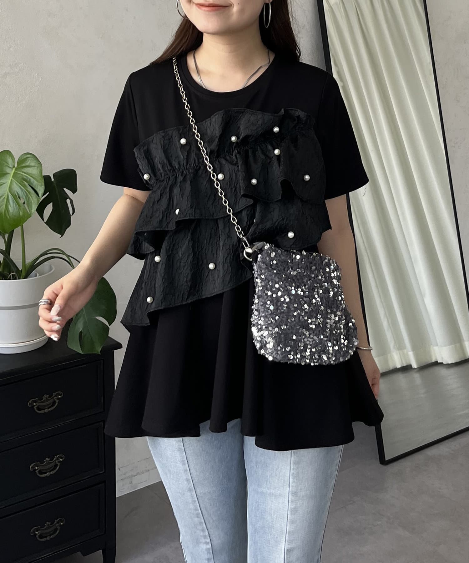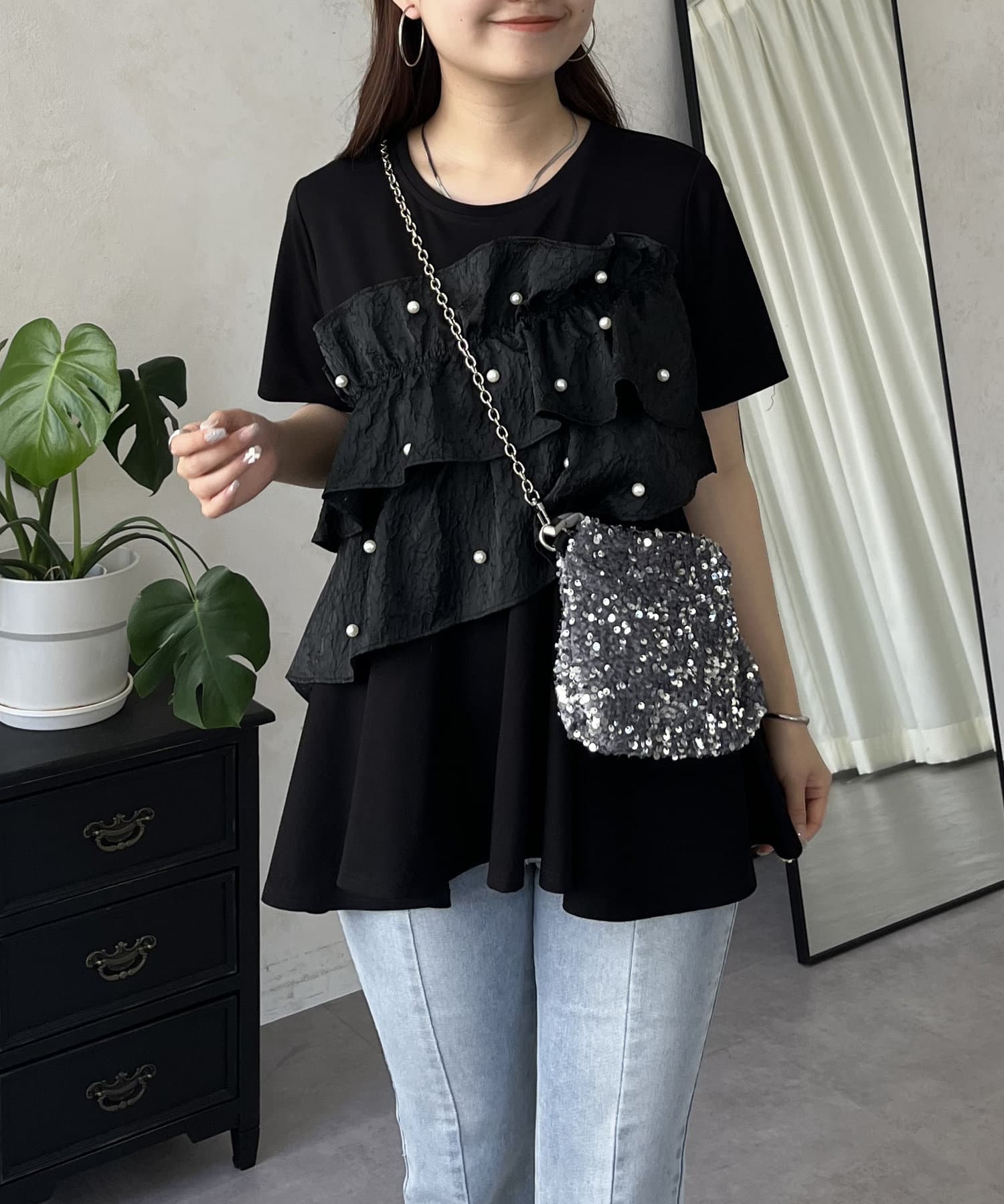 フリル×パールが華やかにしてくれるペプラムTシャツ