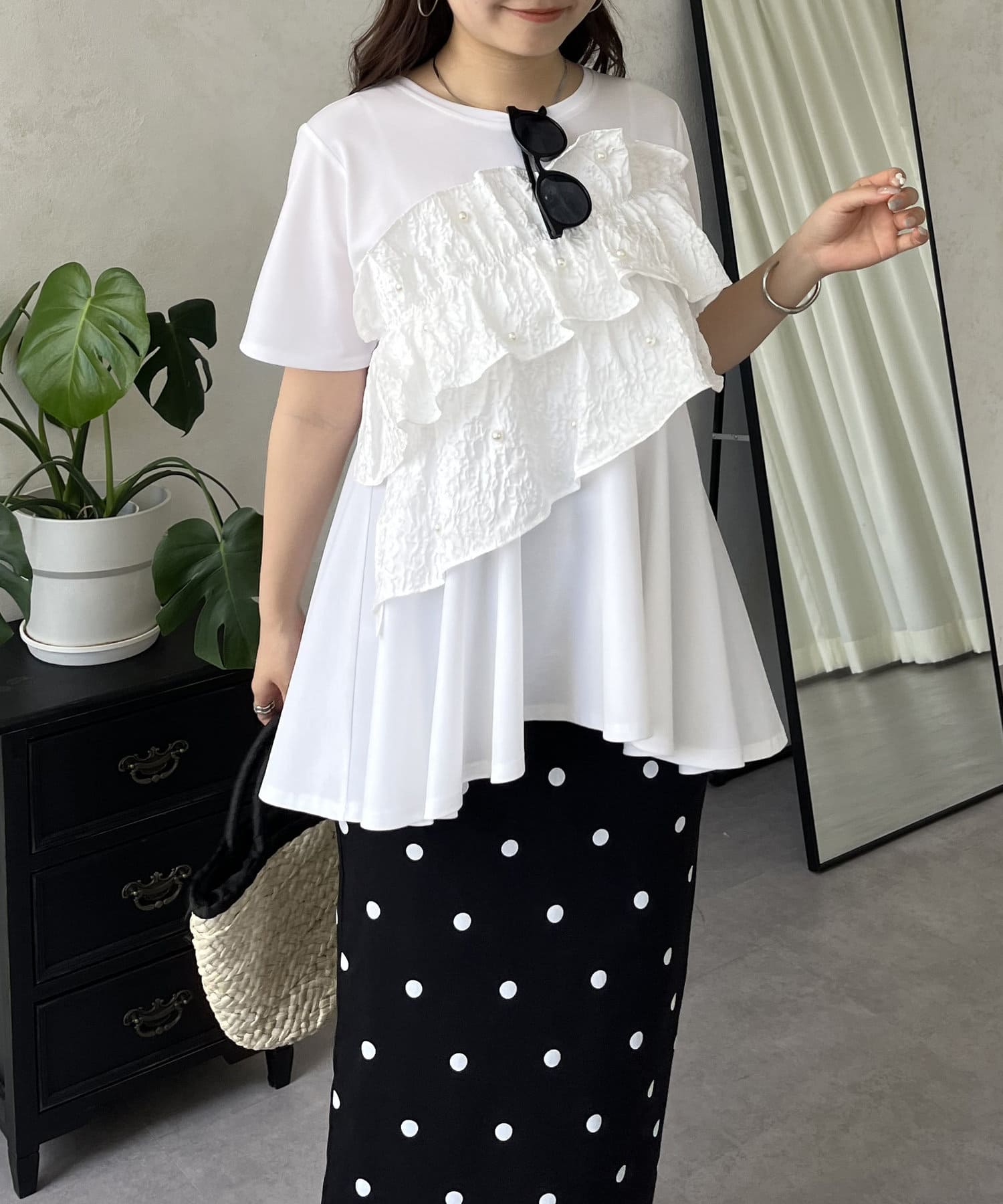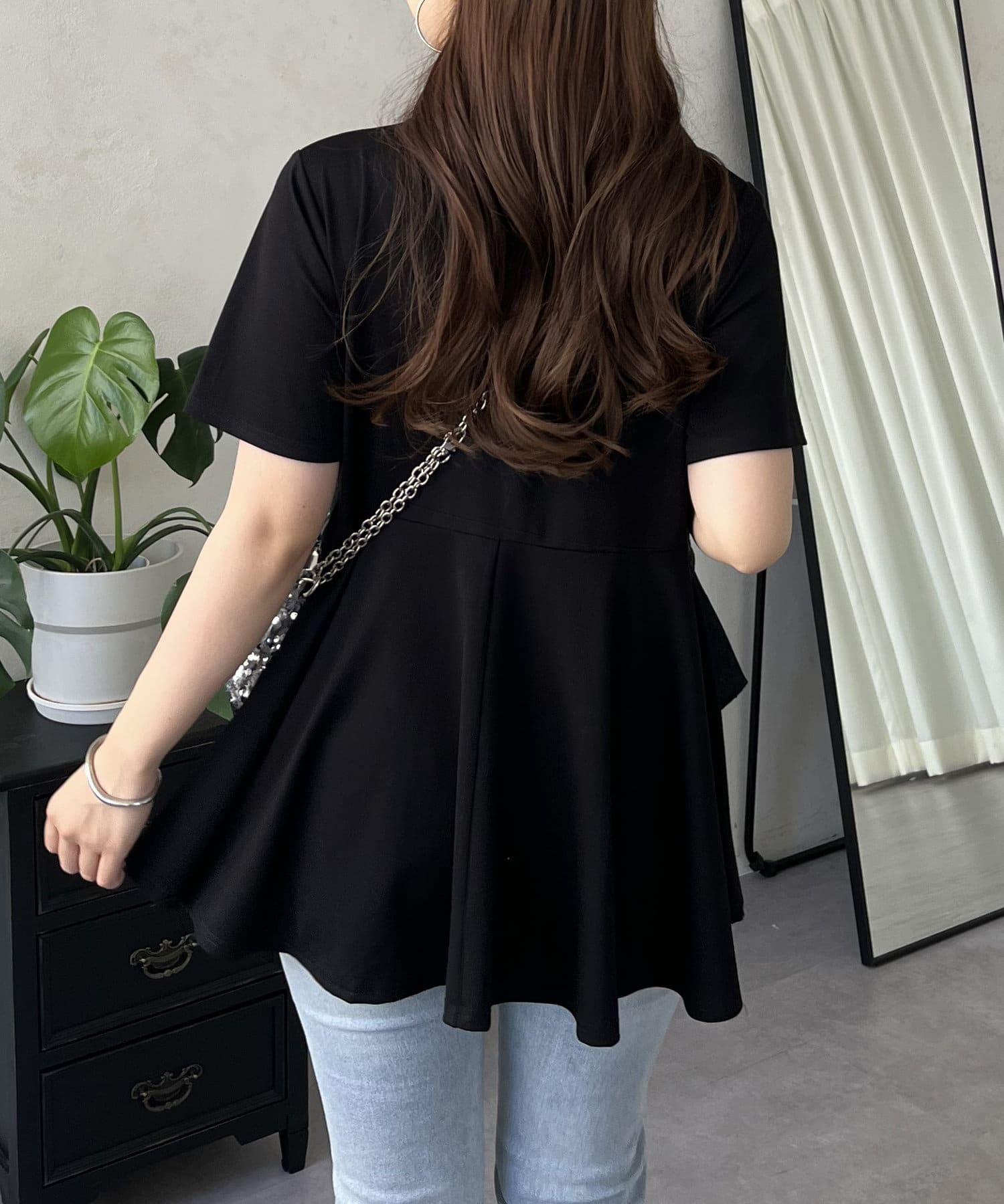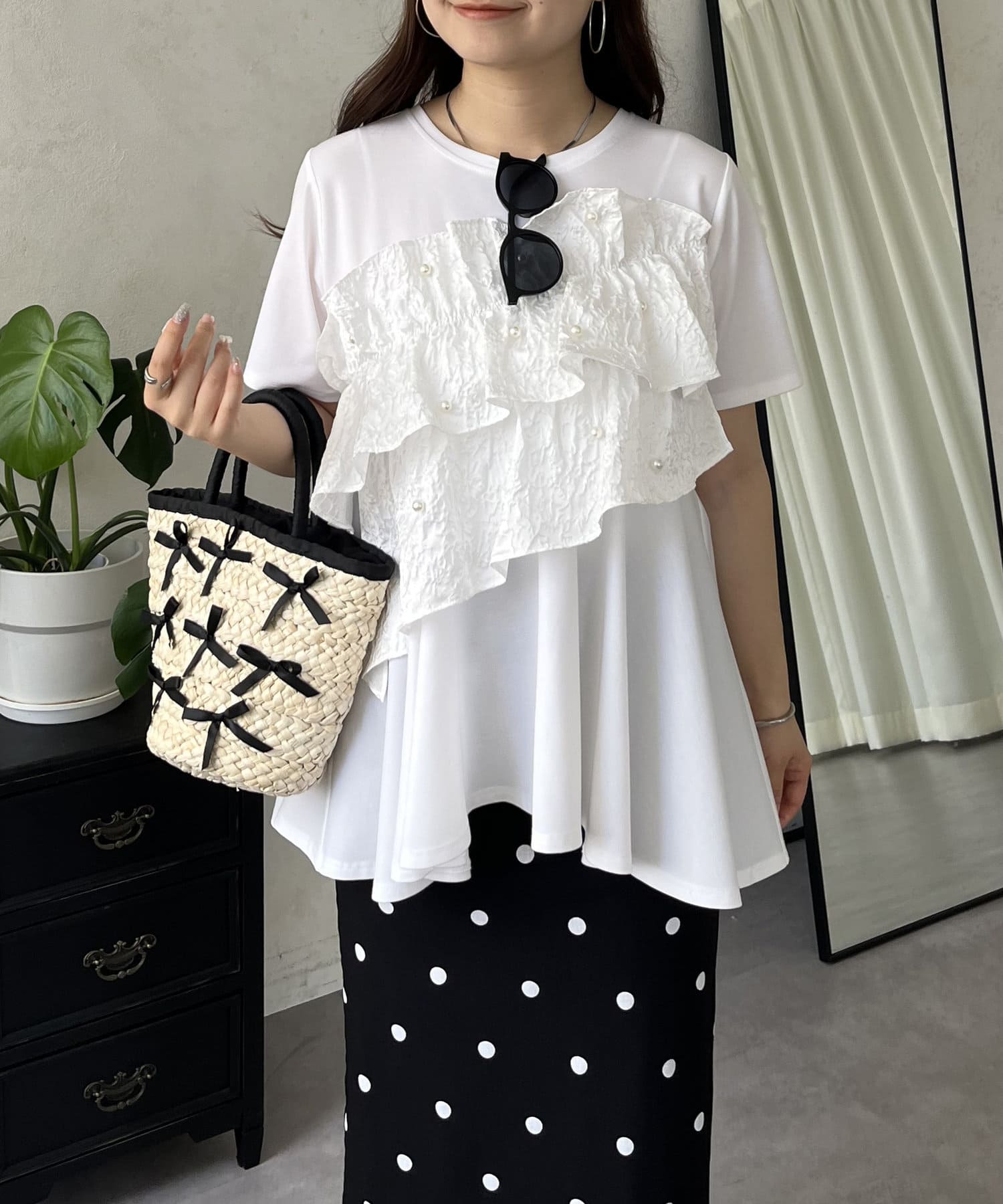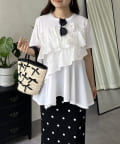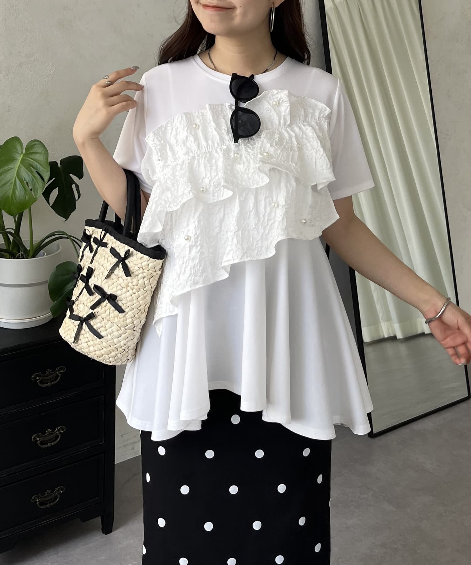 フリル×パールが華やかにしてくれるペプラムTシャツ