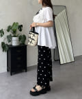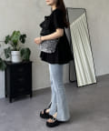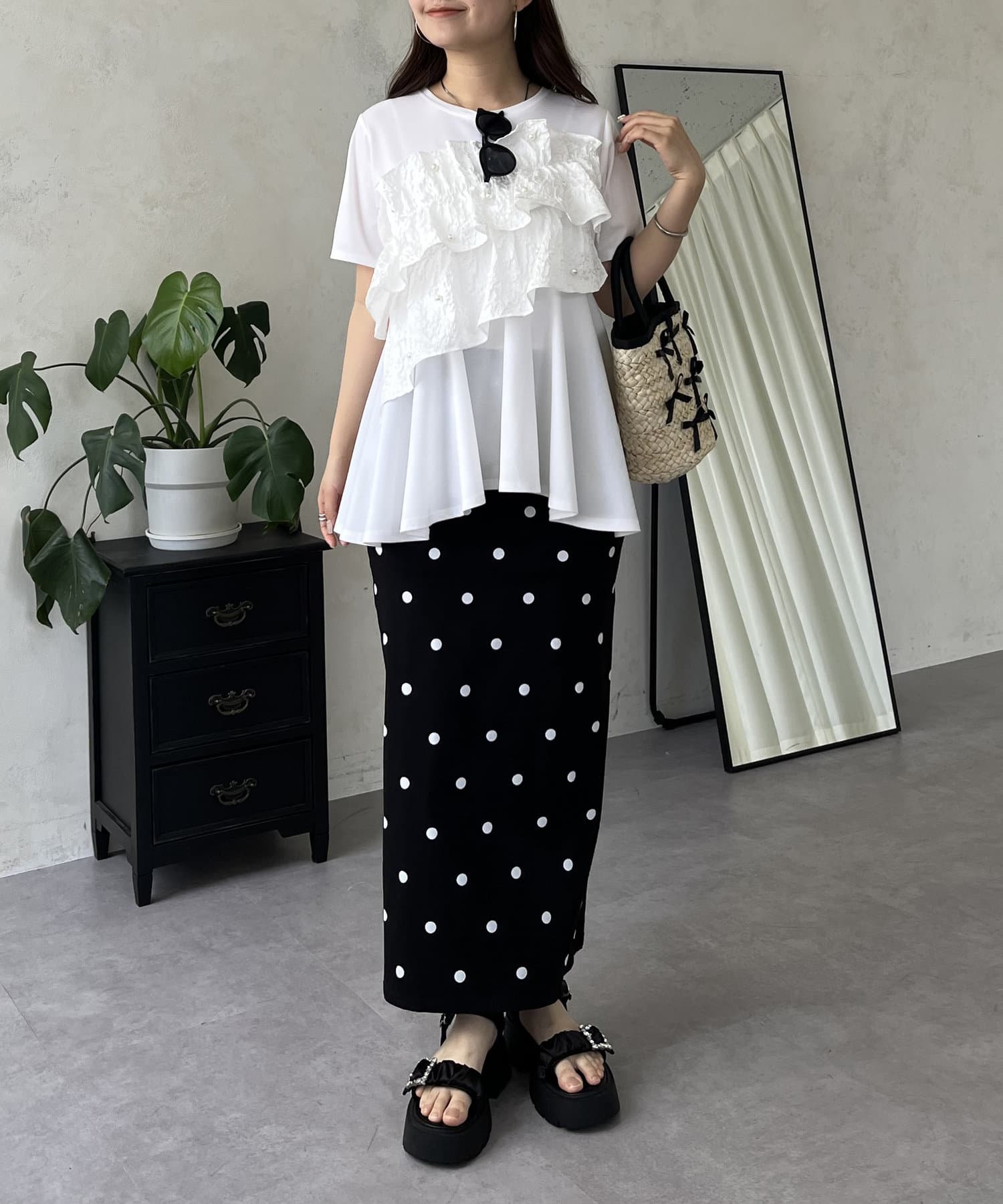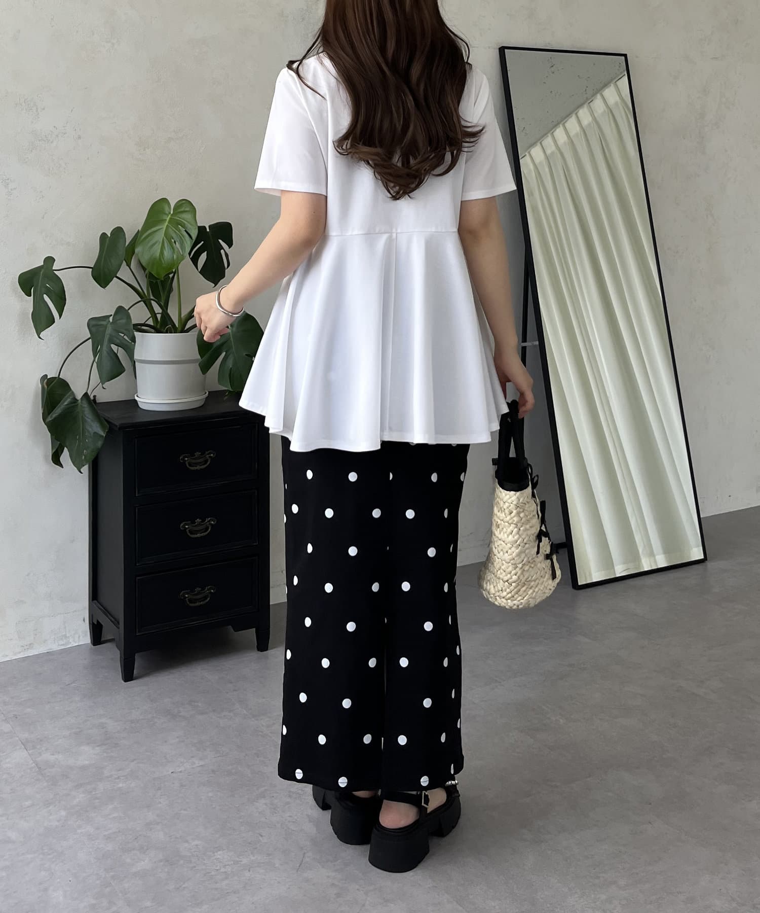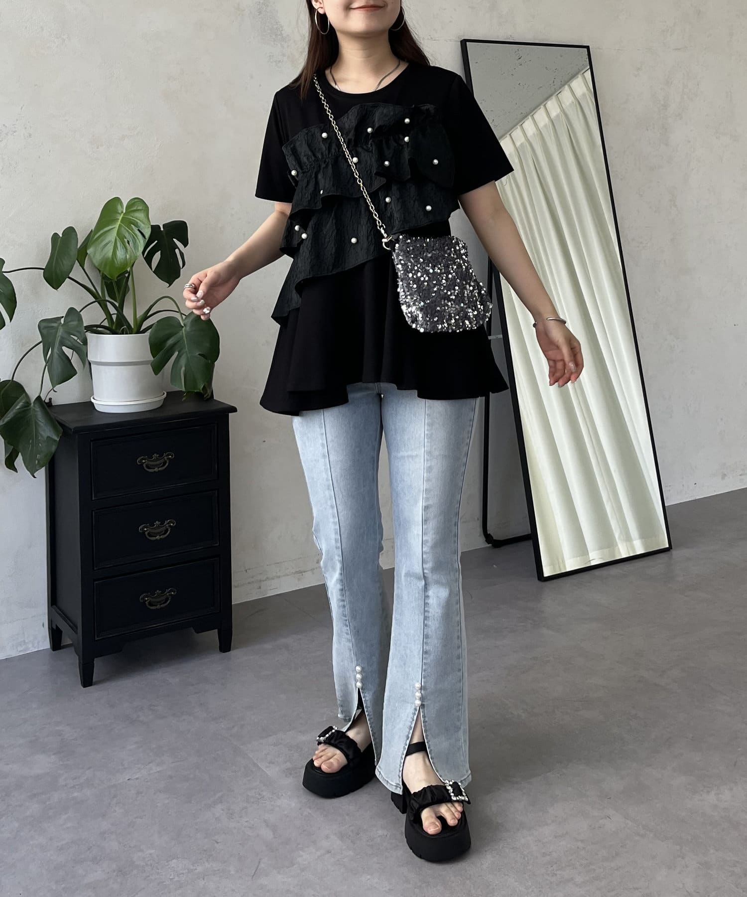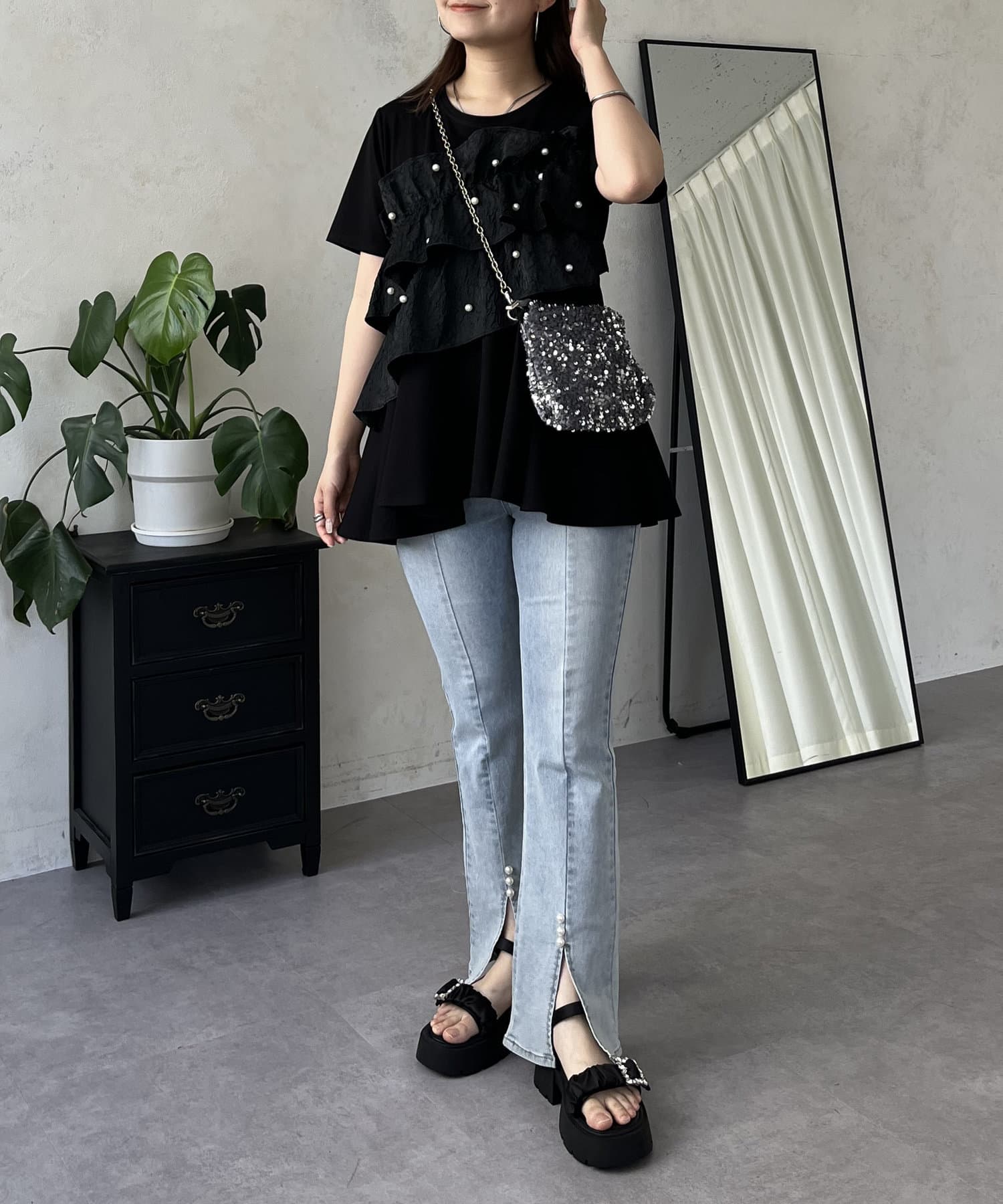 フリル×パールが華やかにしてくれるペプラムTシャツ
