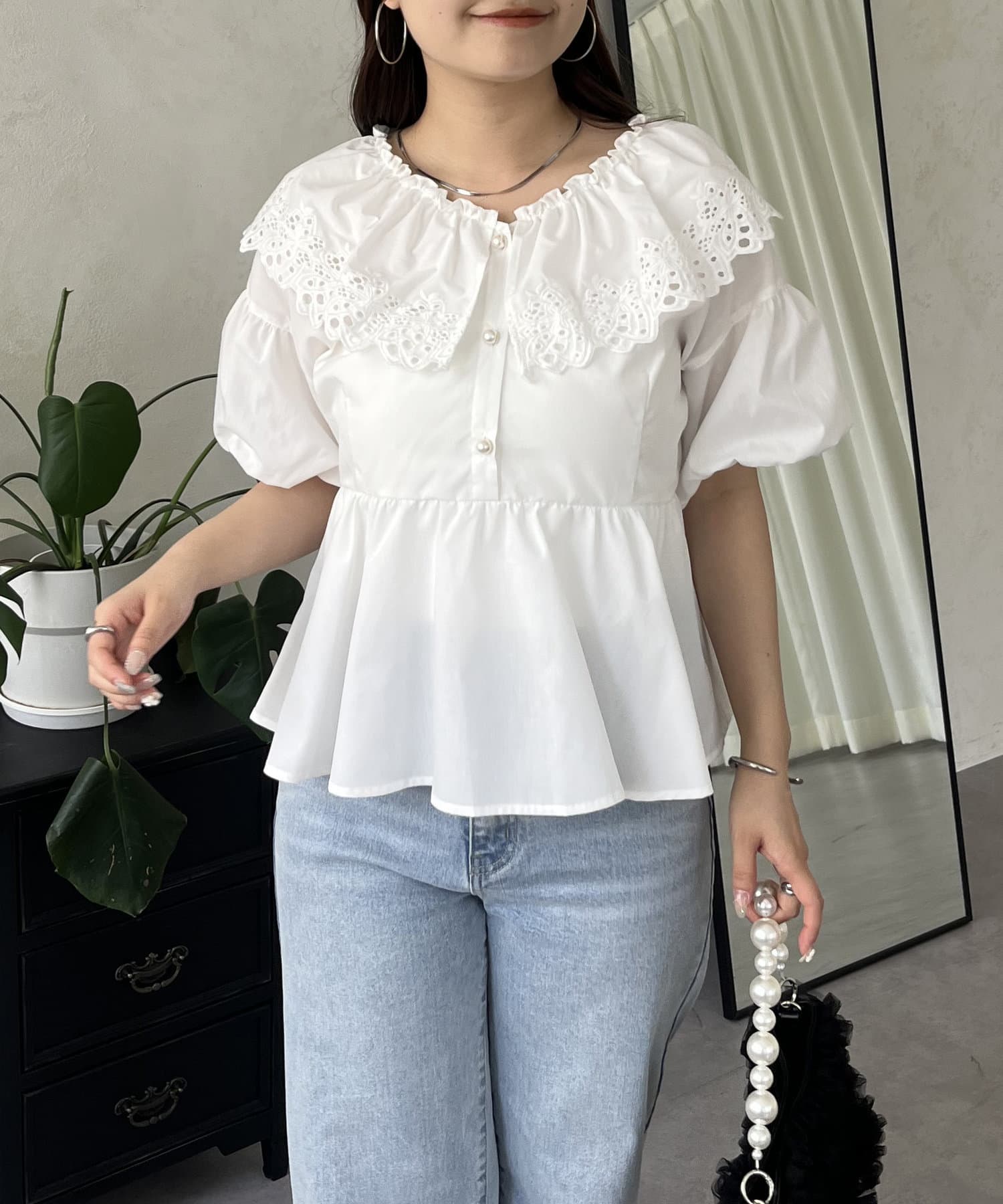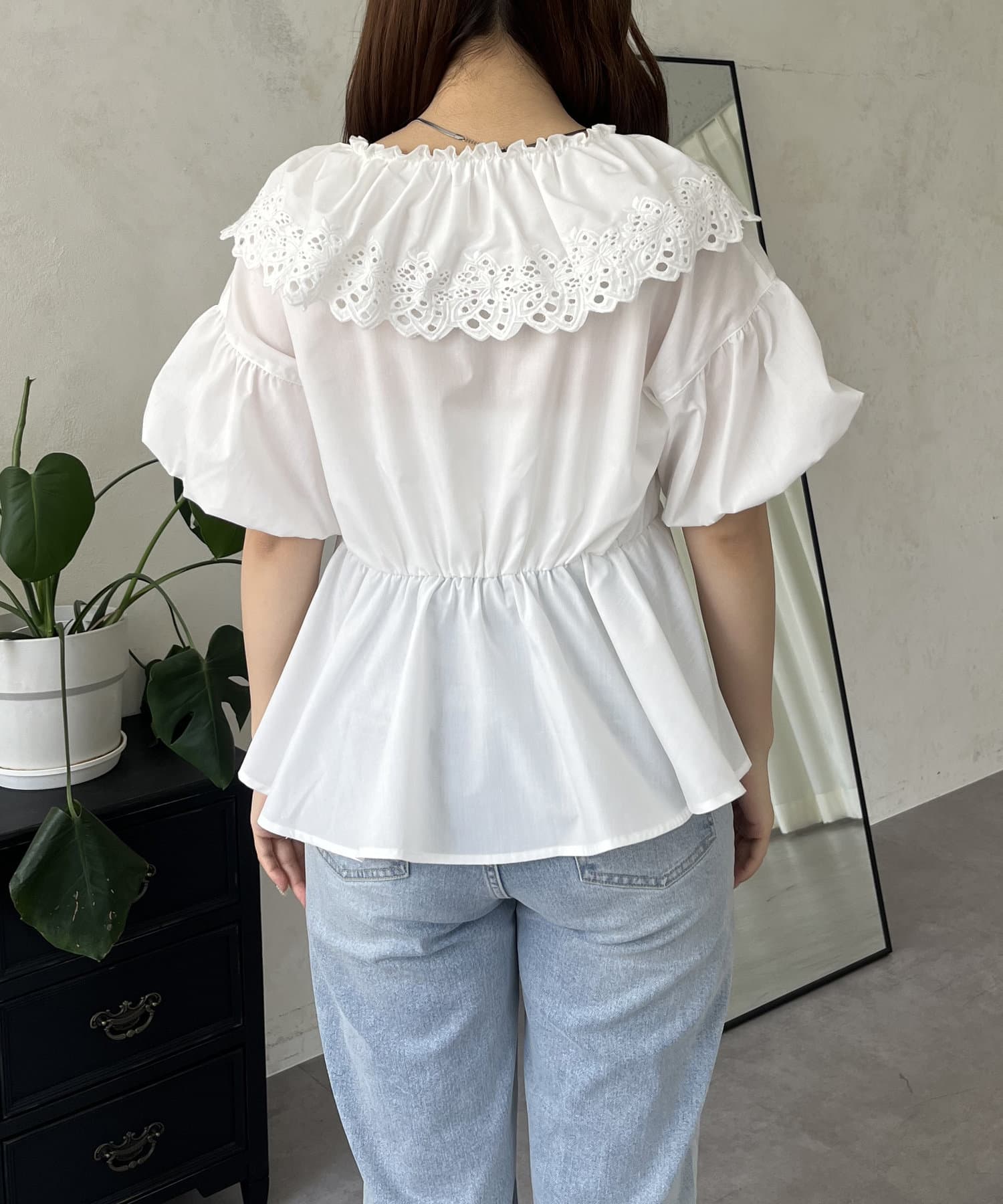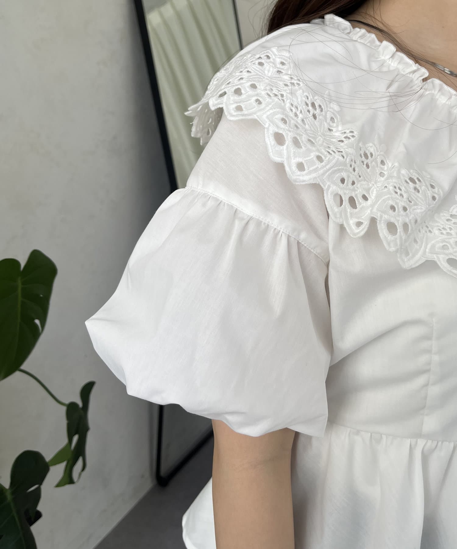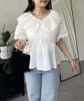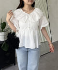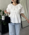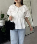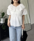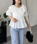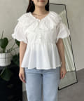 レースビッグカラーバルーンスリーブペプラムブラウス