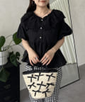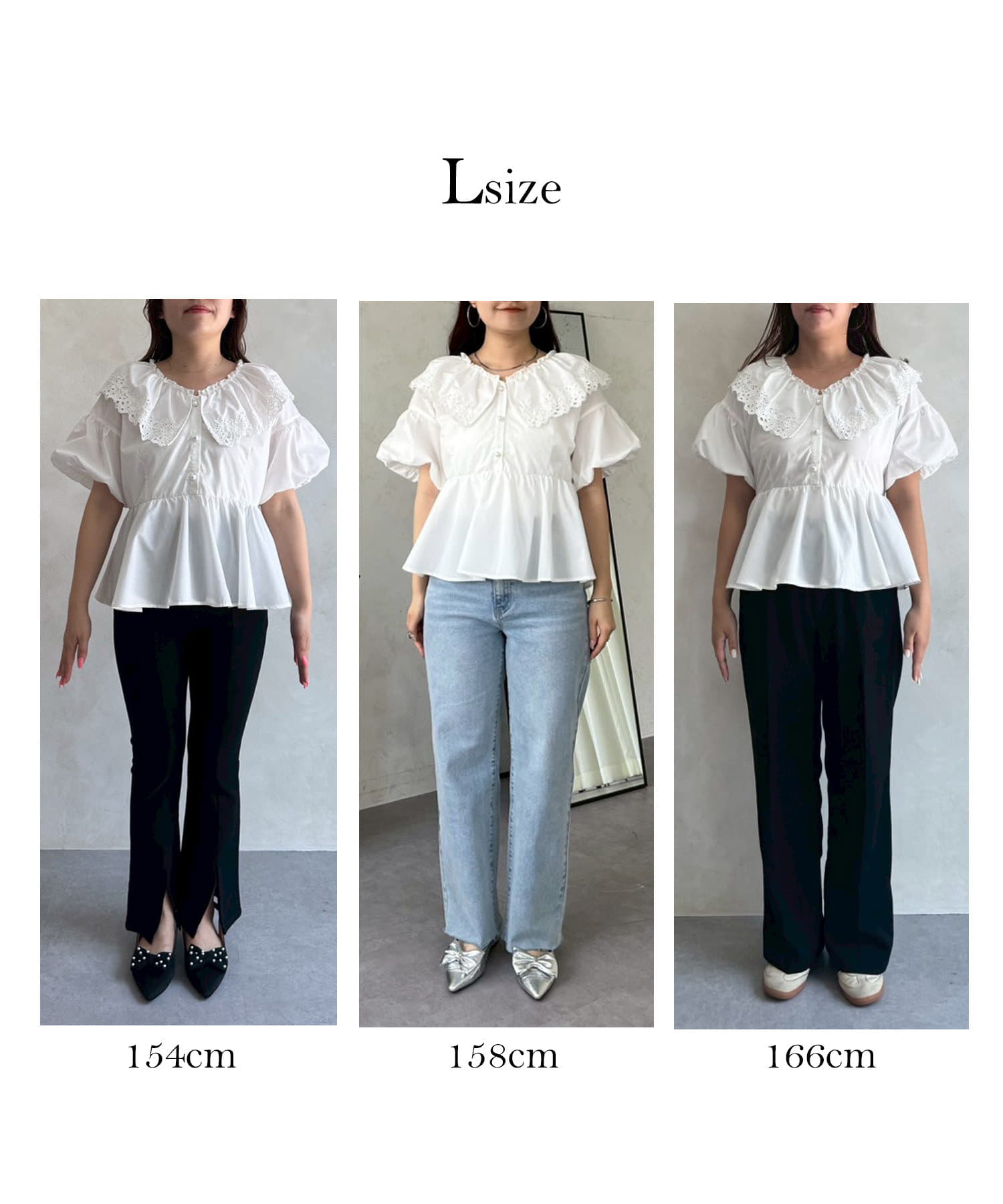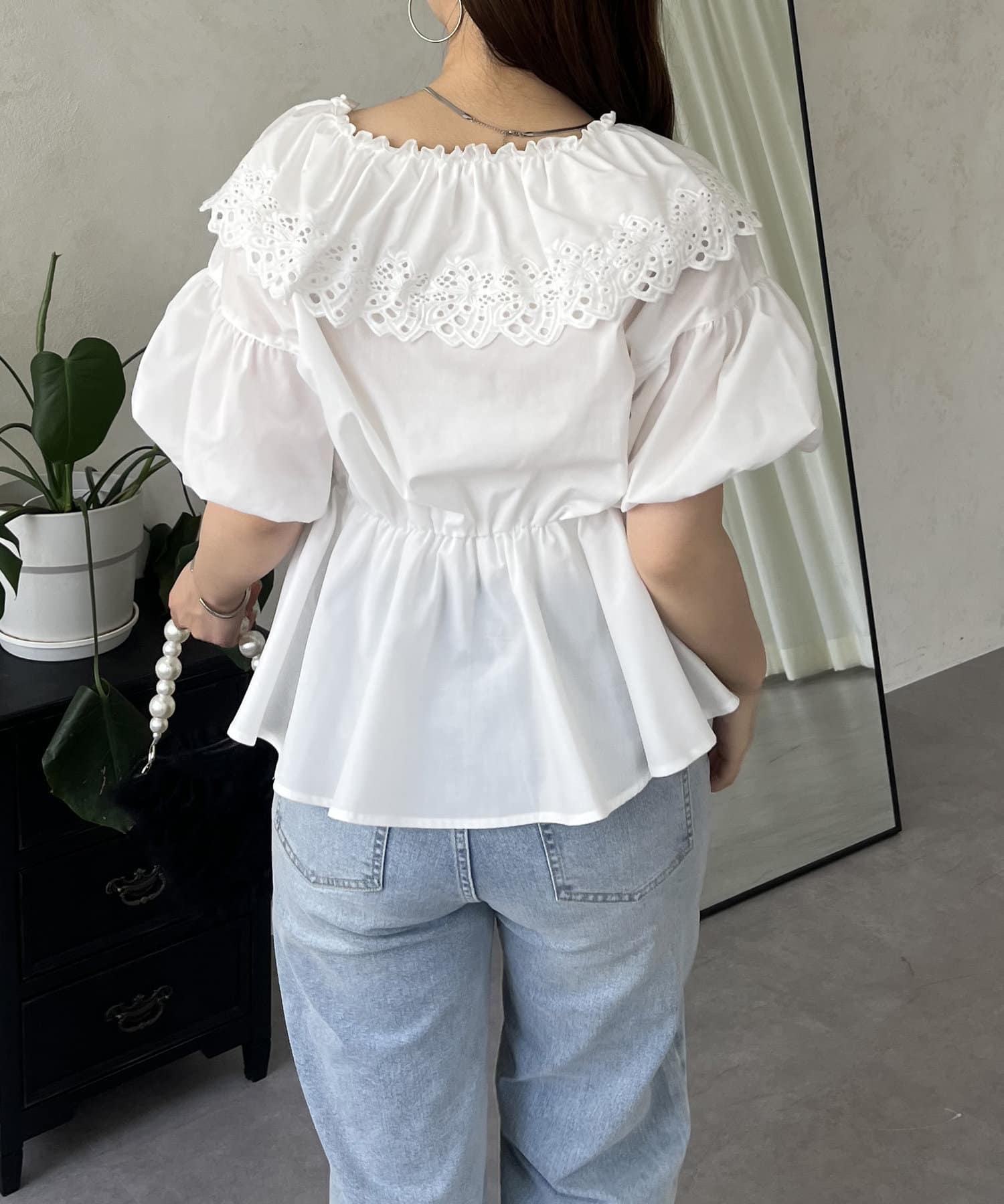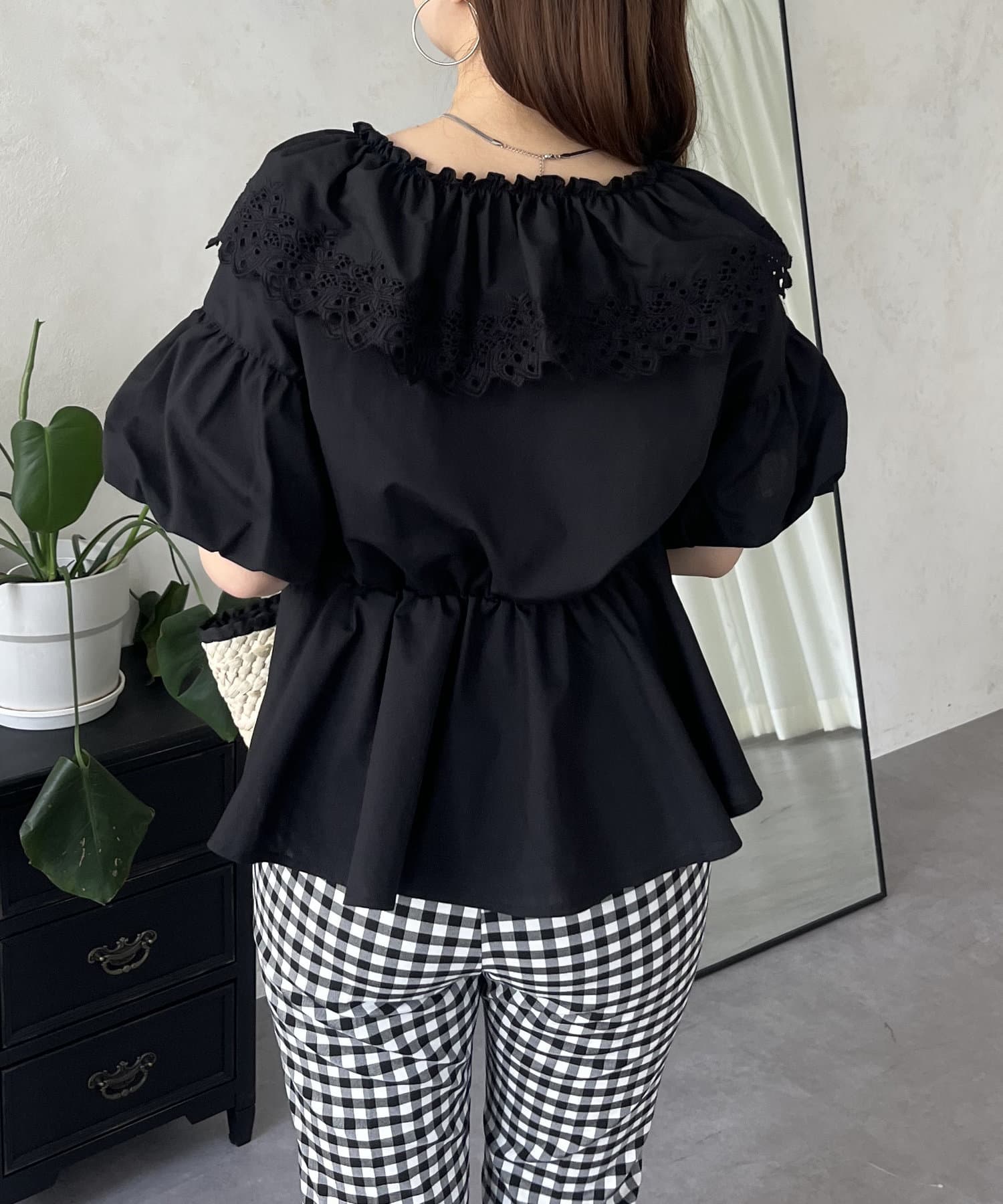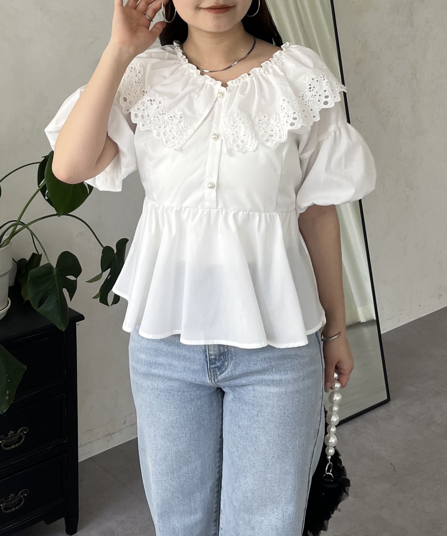 レースビッグカラーバルーンスリーブペプラムブラウス