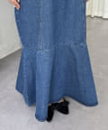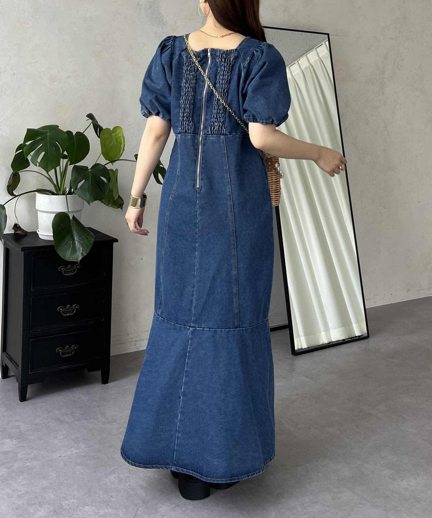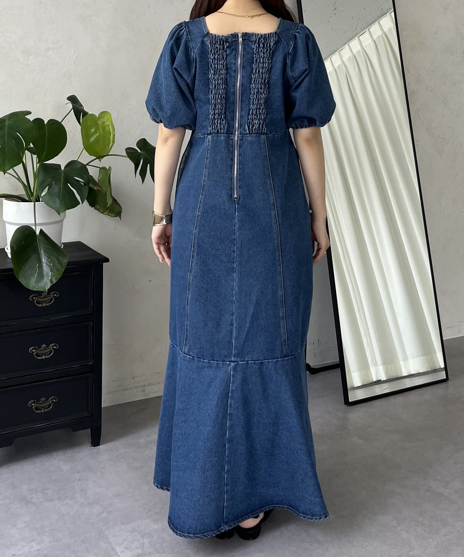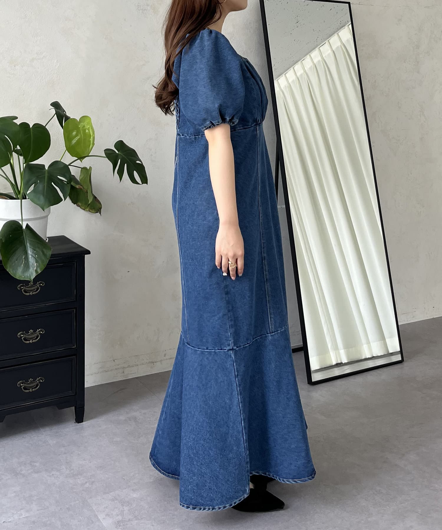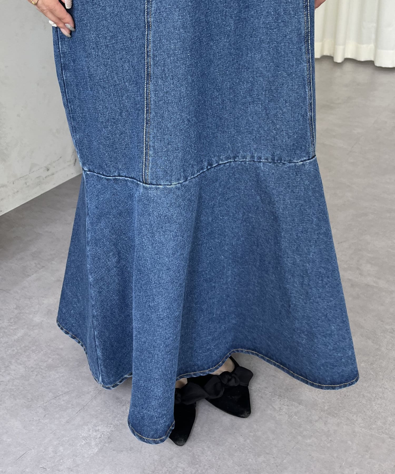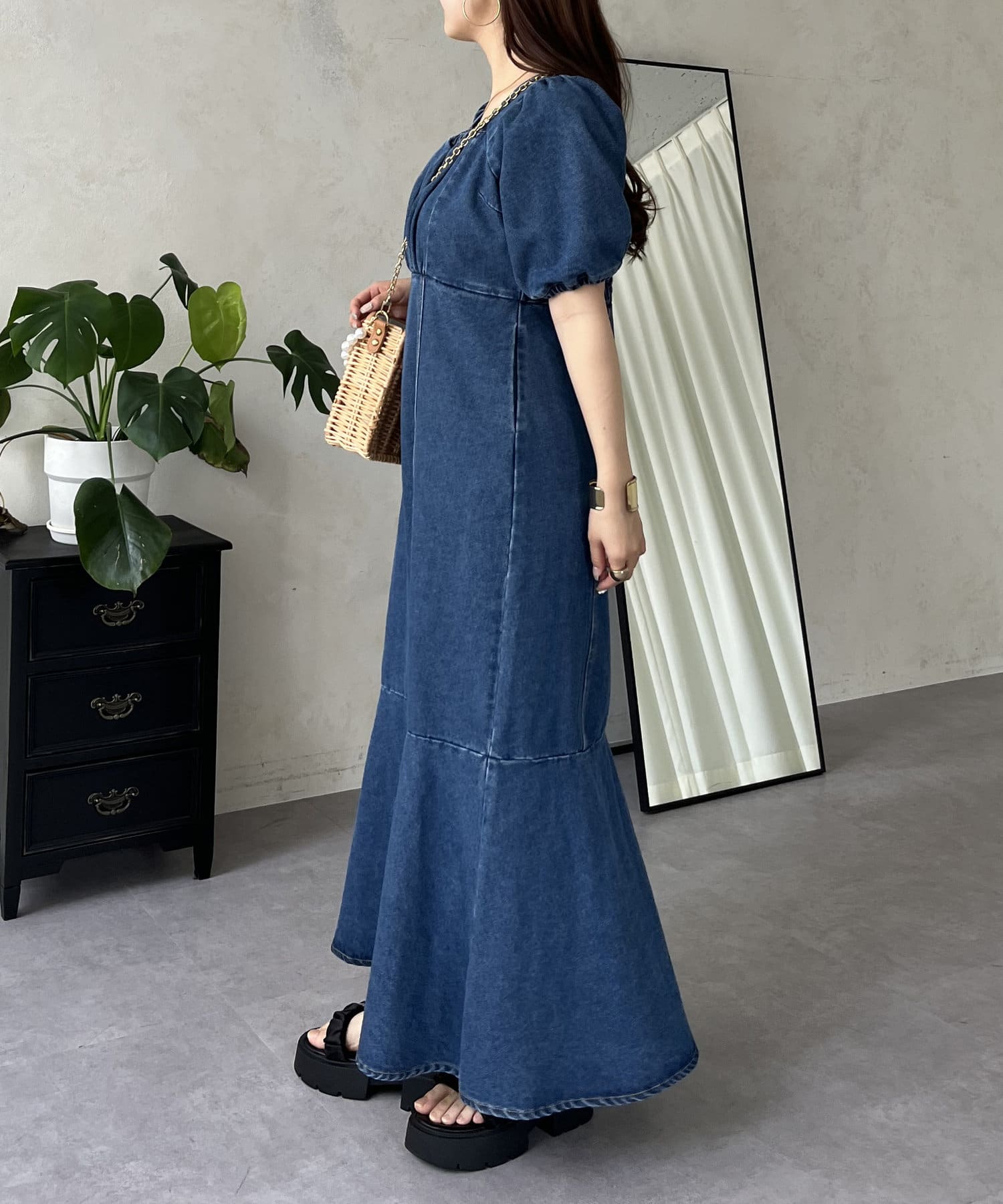 カジュアルでフェミニンなマーメードシルエットのデニムワンピース