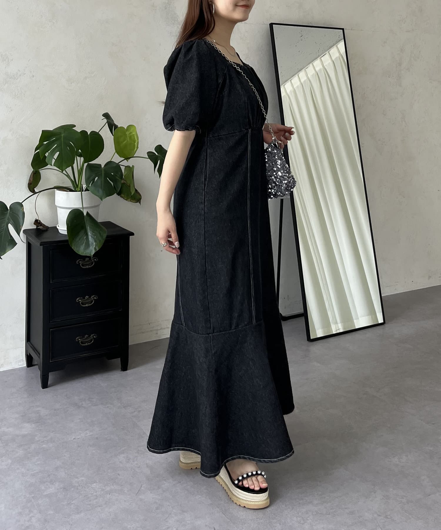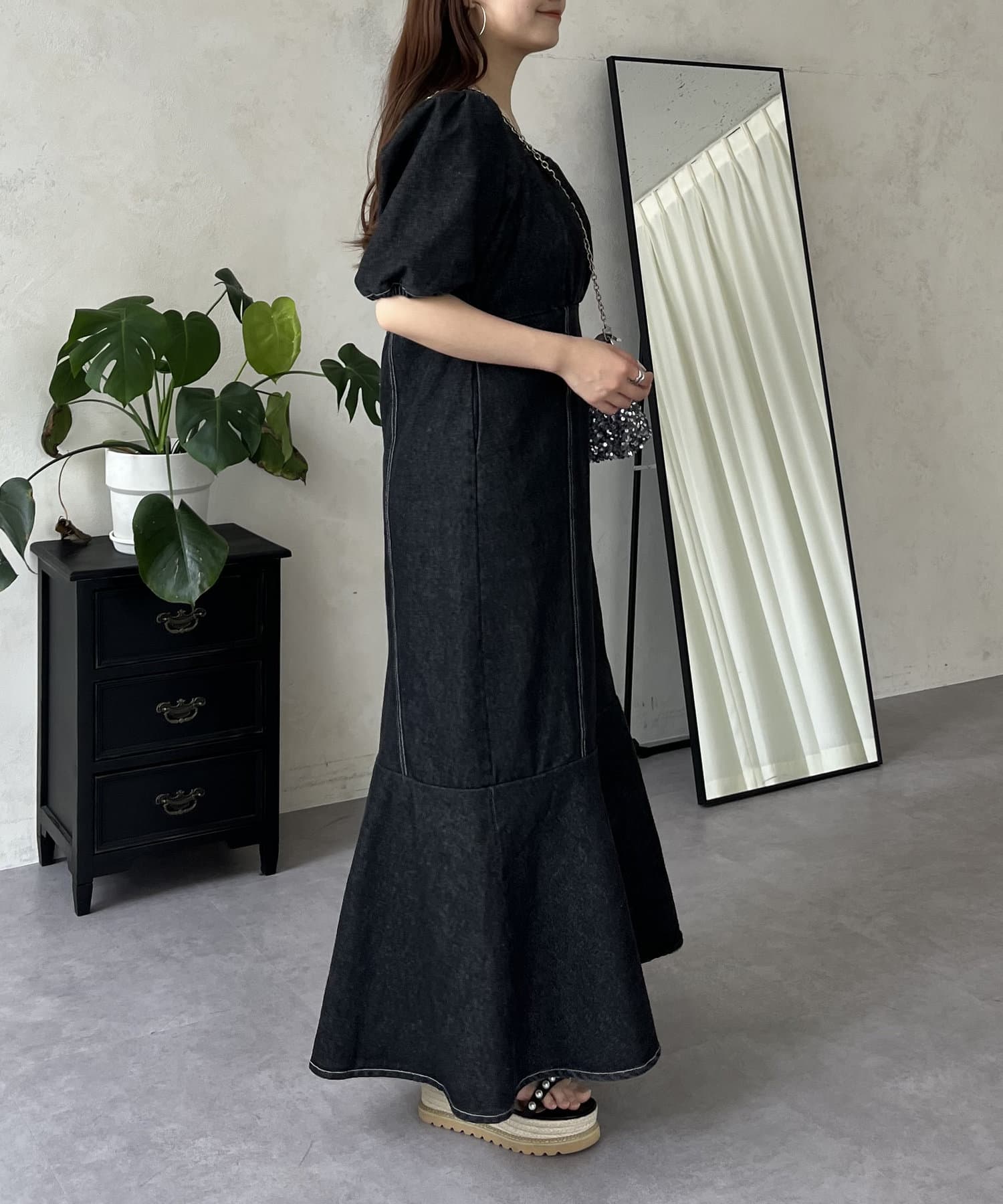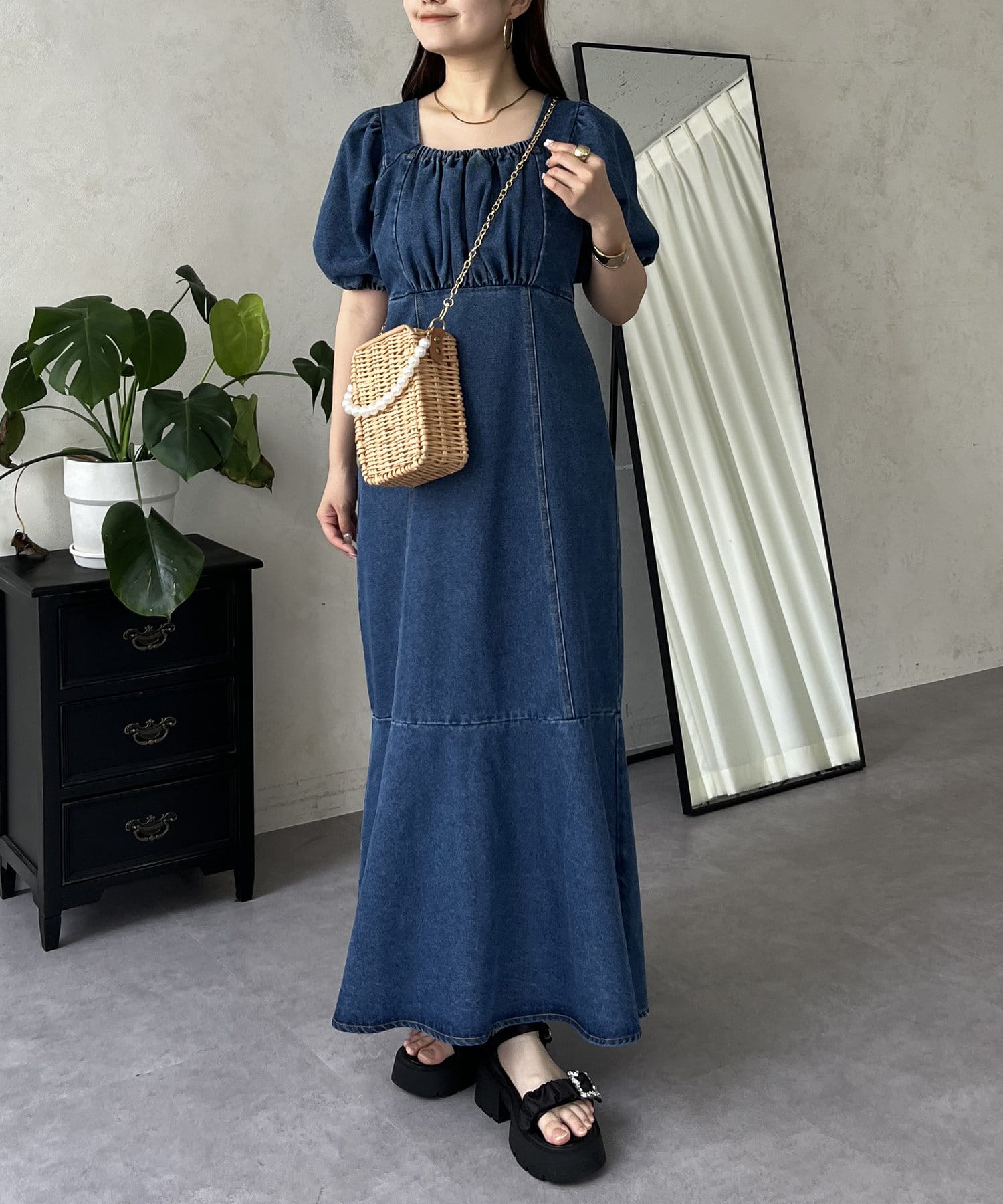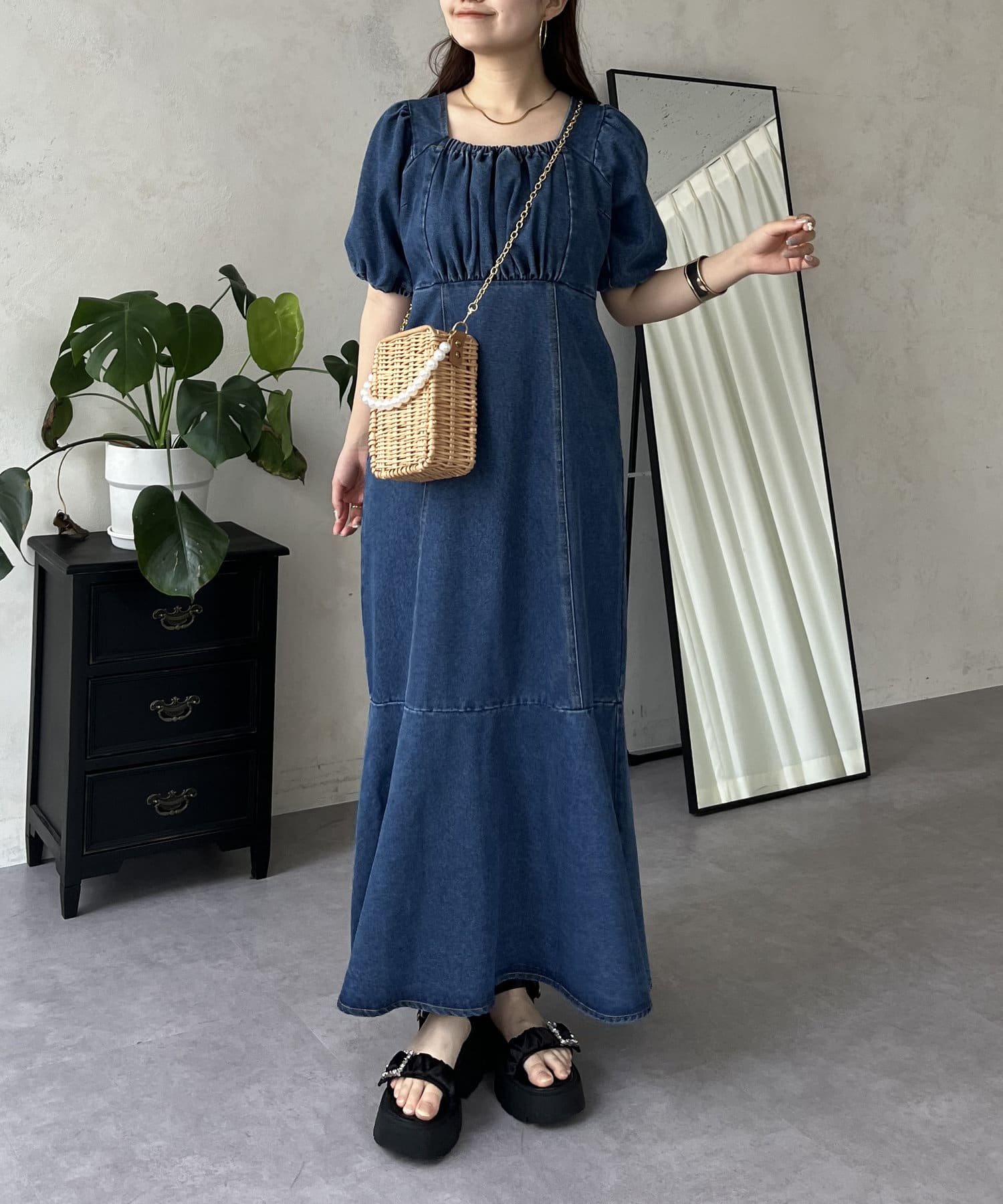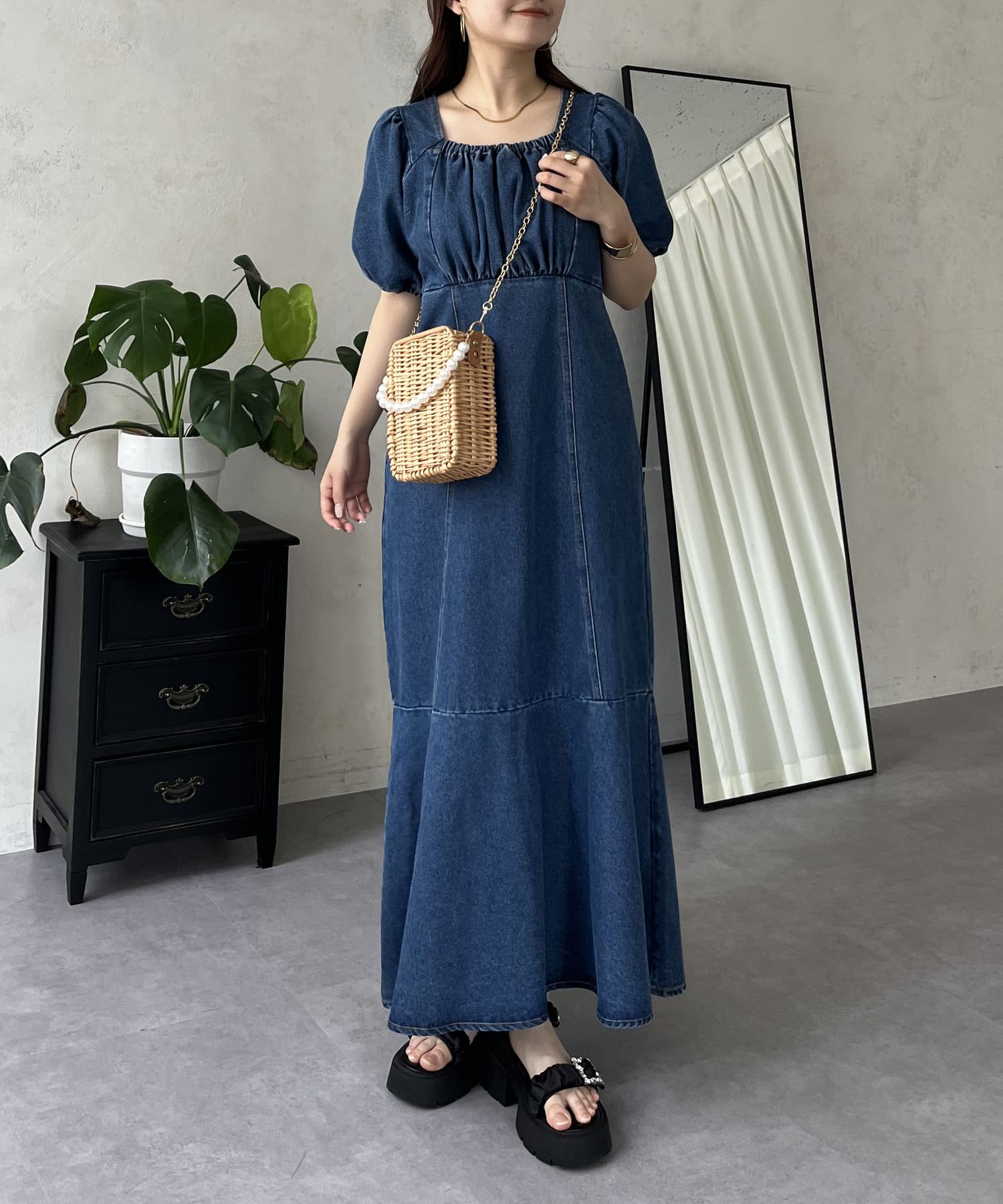 カジュアルでフェミニンなマーメードシルエットのデニムワンピース