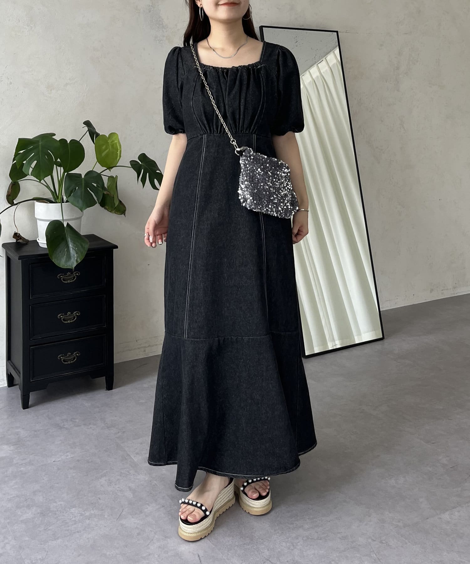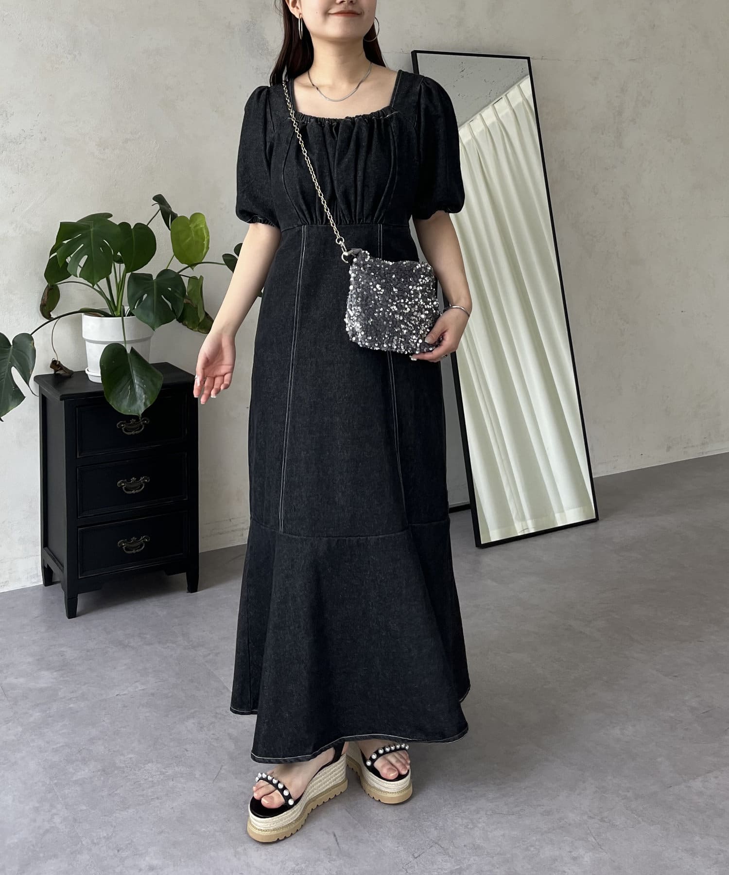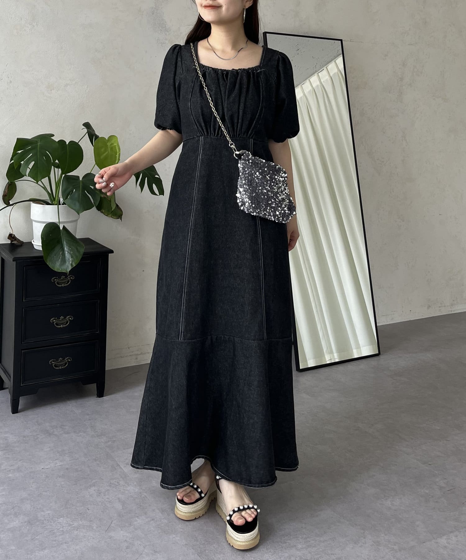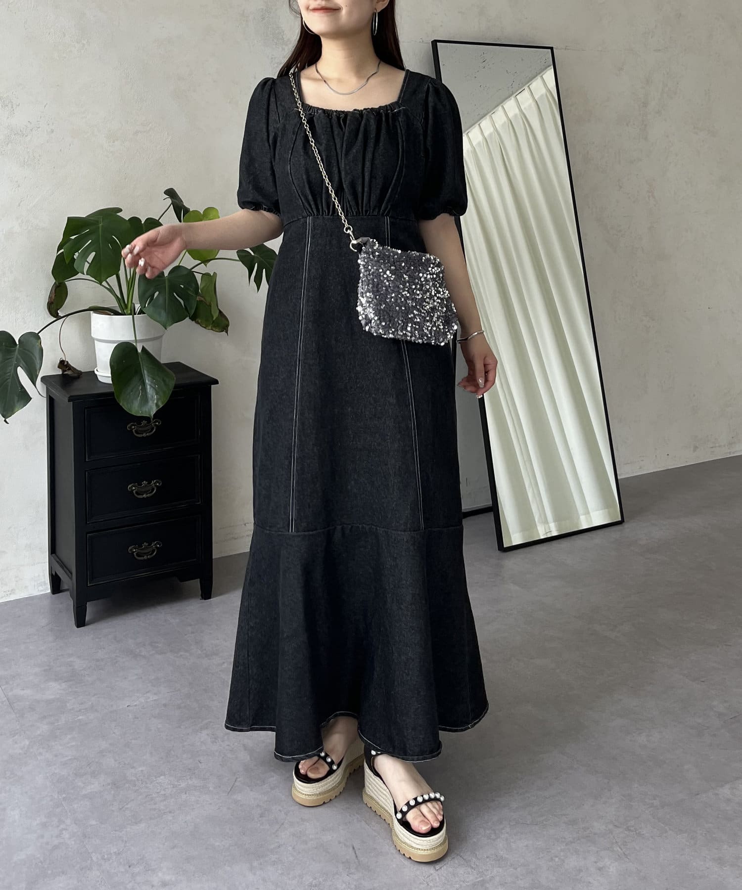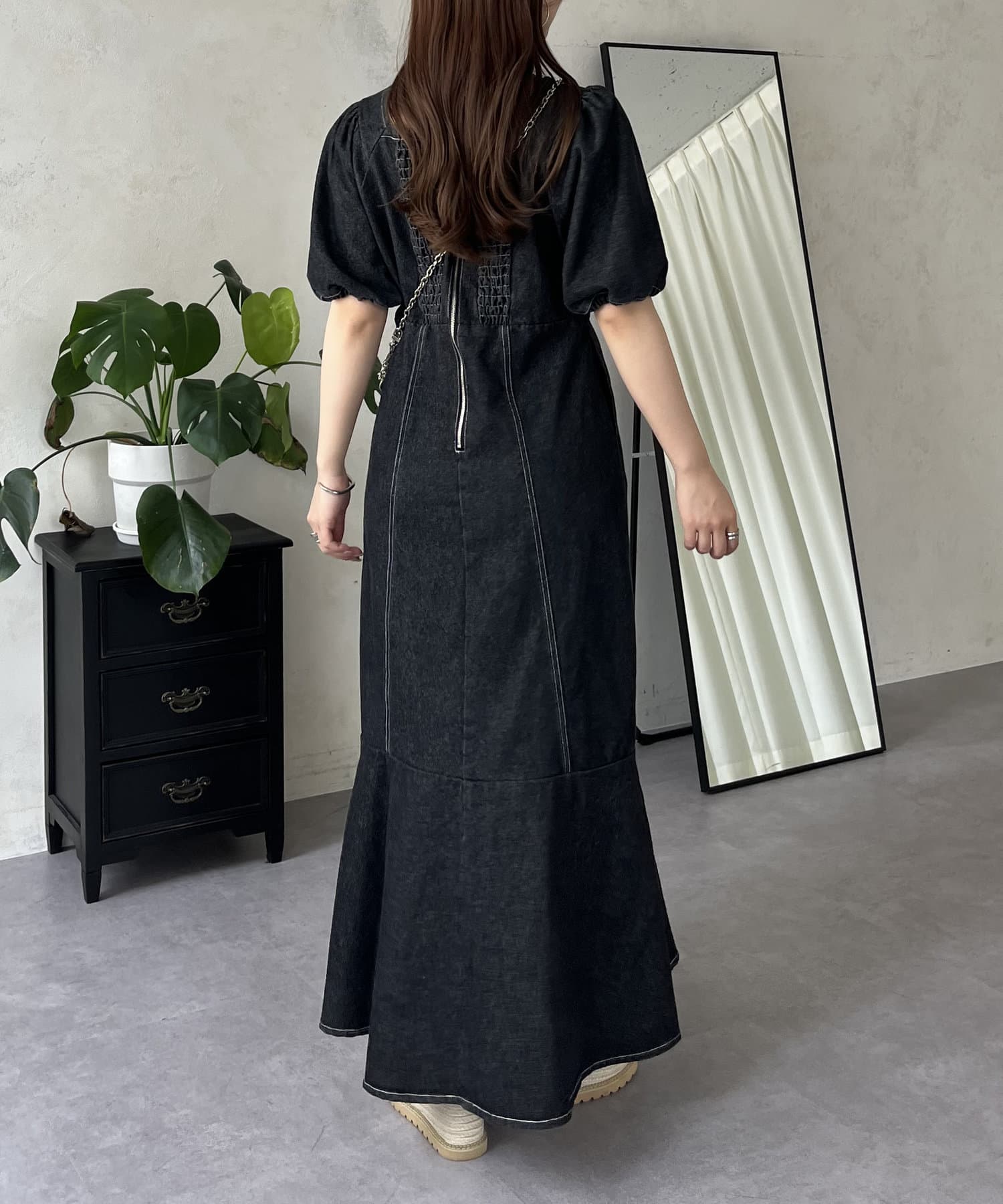 カジュアルでフェミニンなマーメードシルエットのデニムワンピース