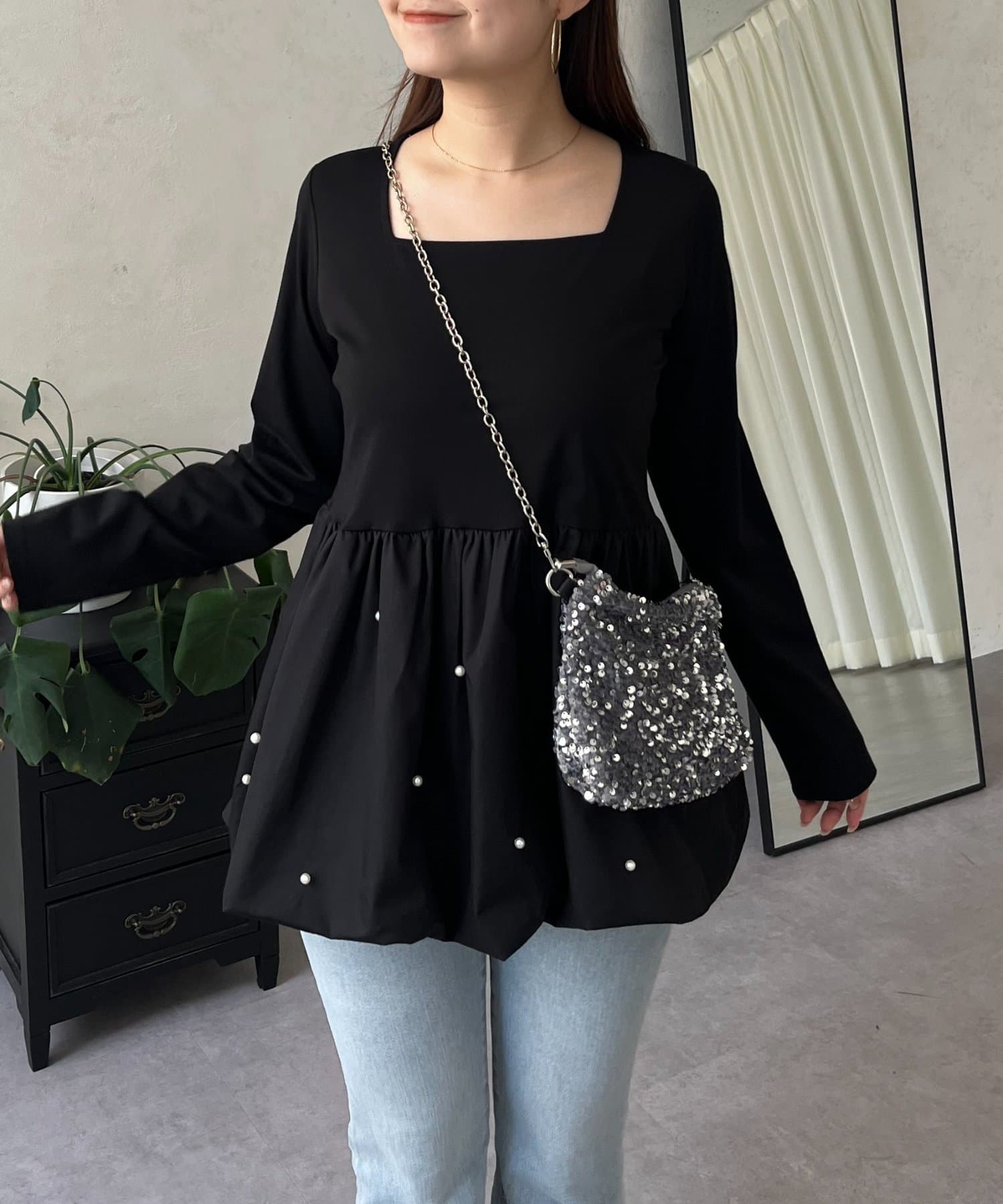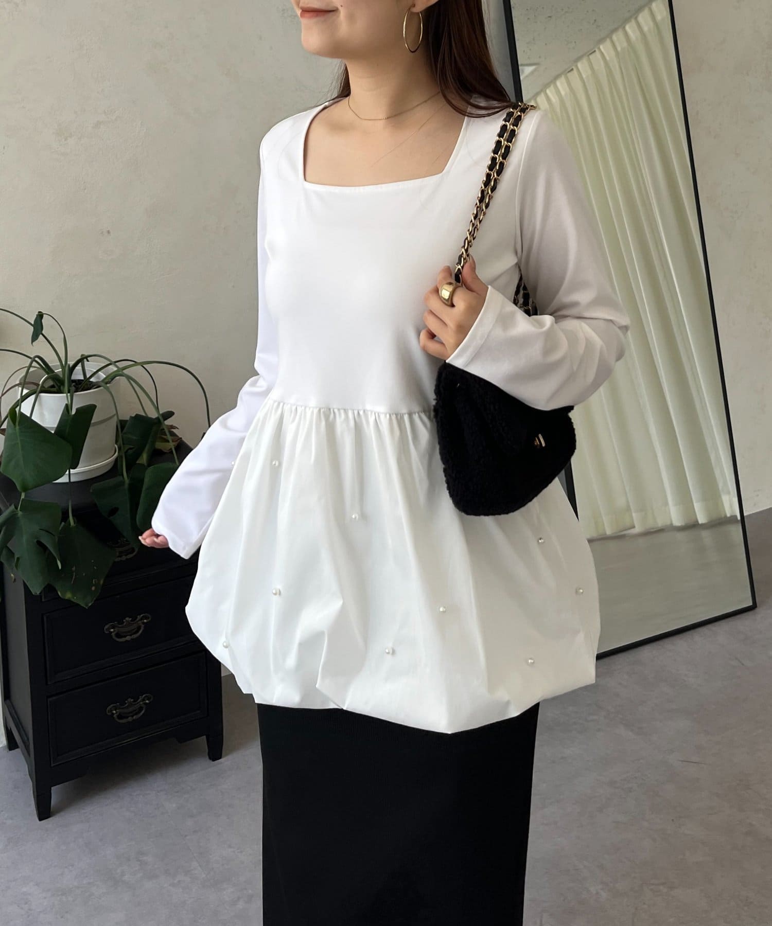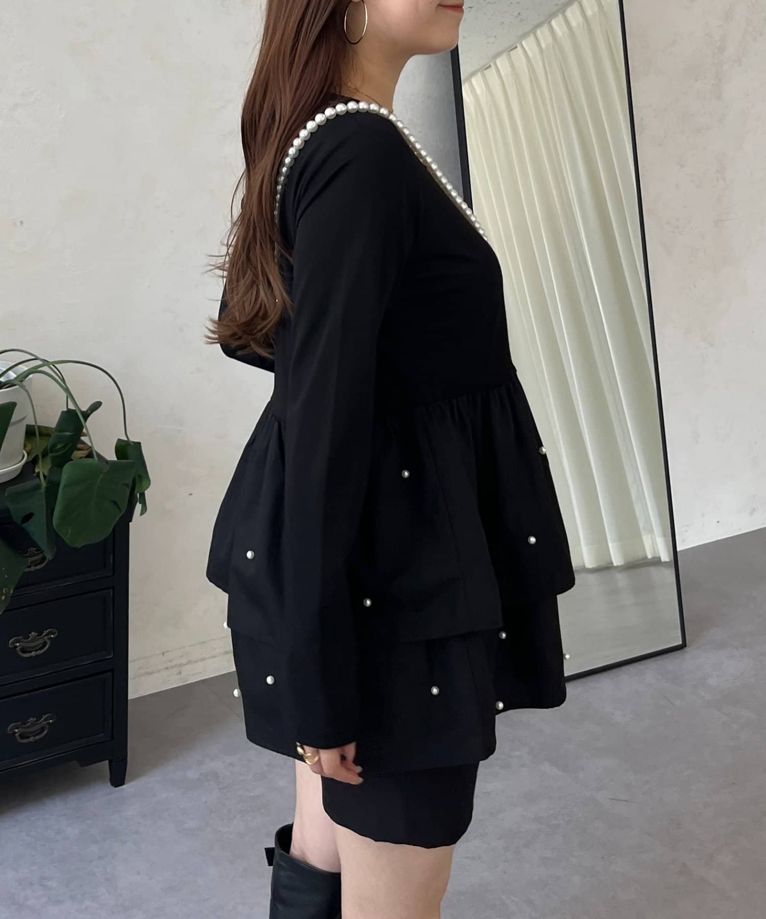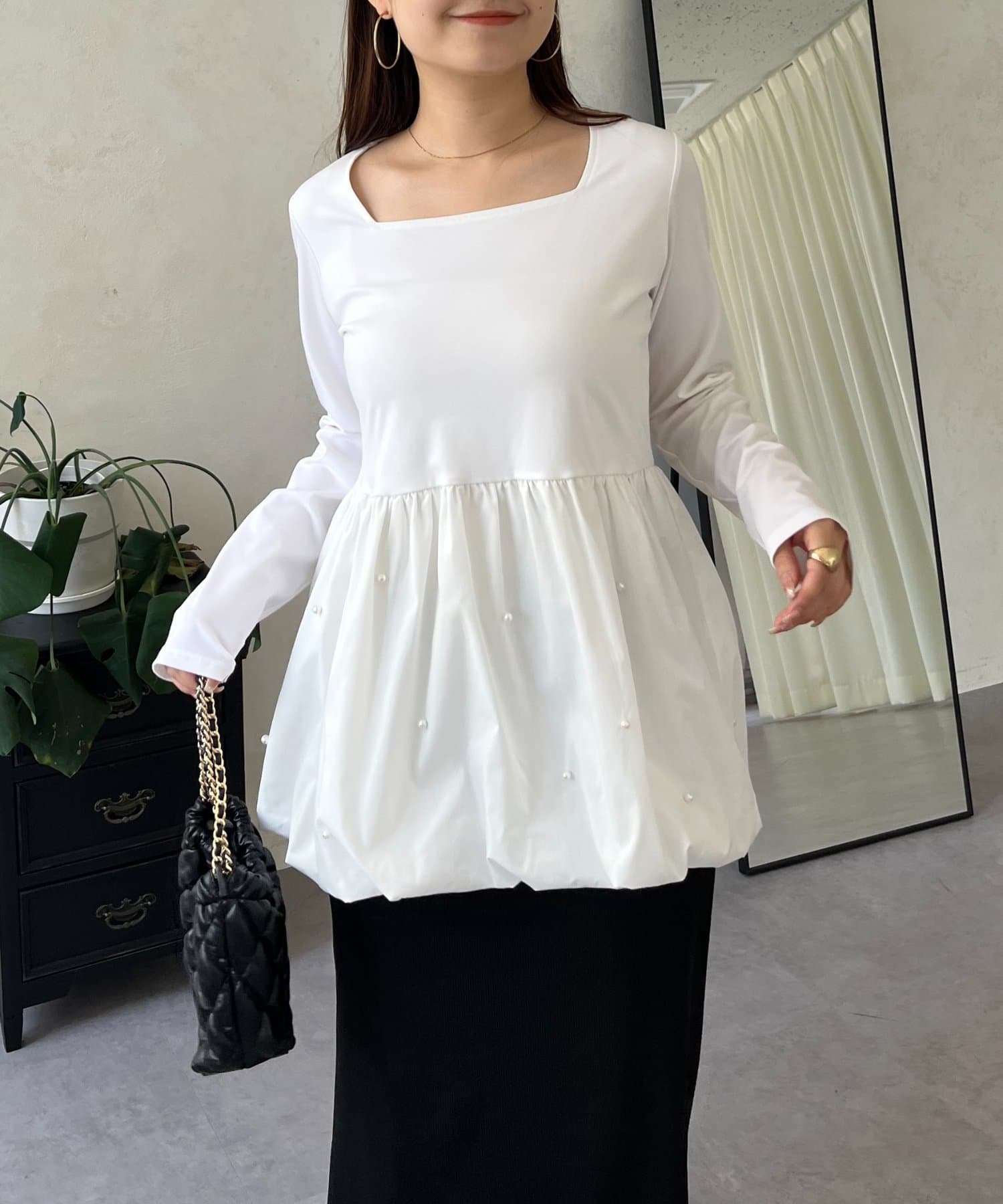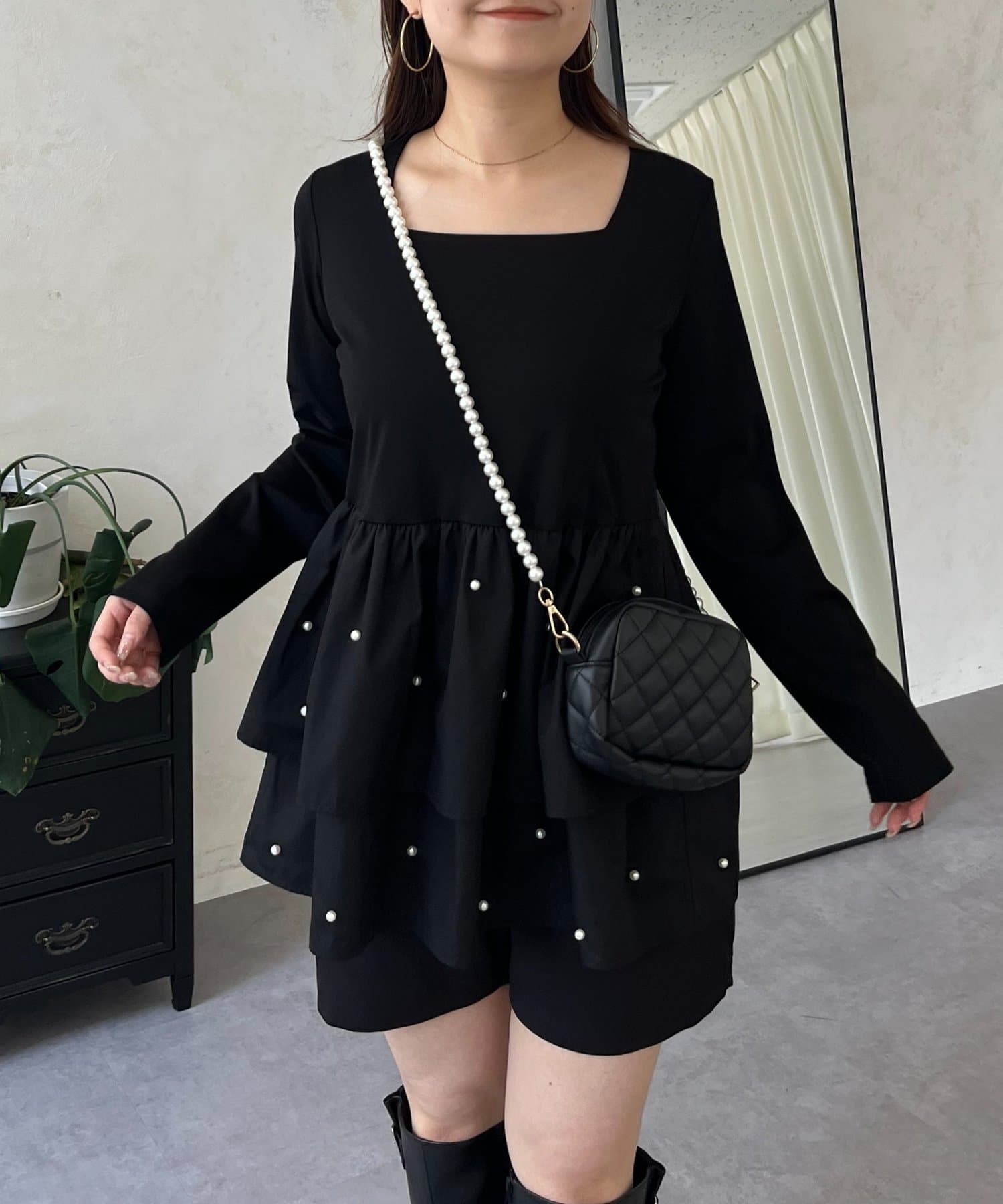 スクエアネックパールペプラムレイヤードロンT