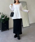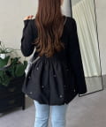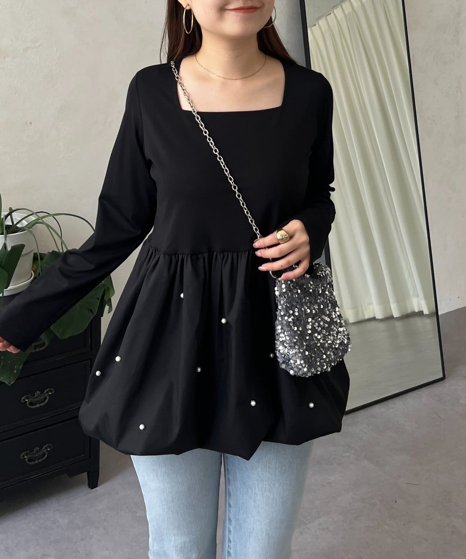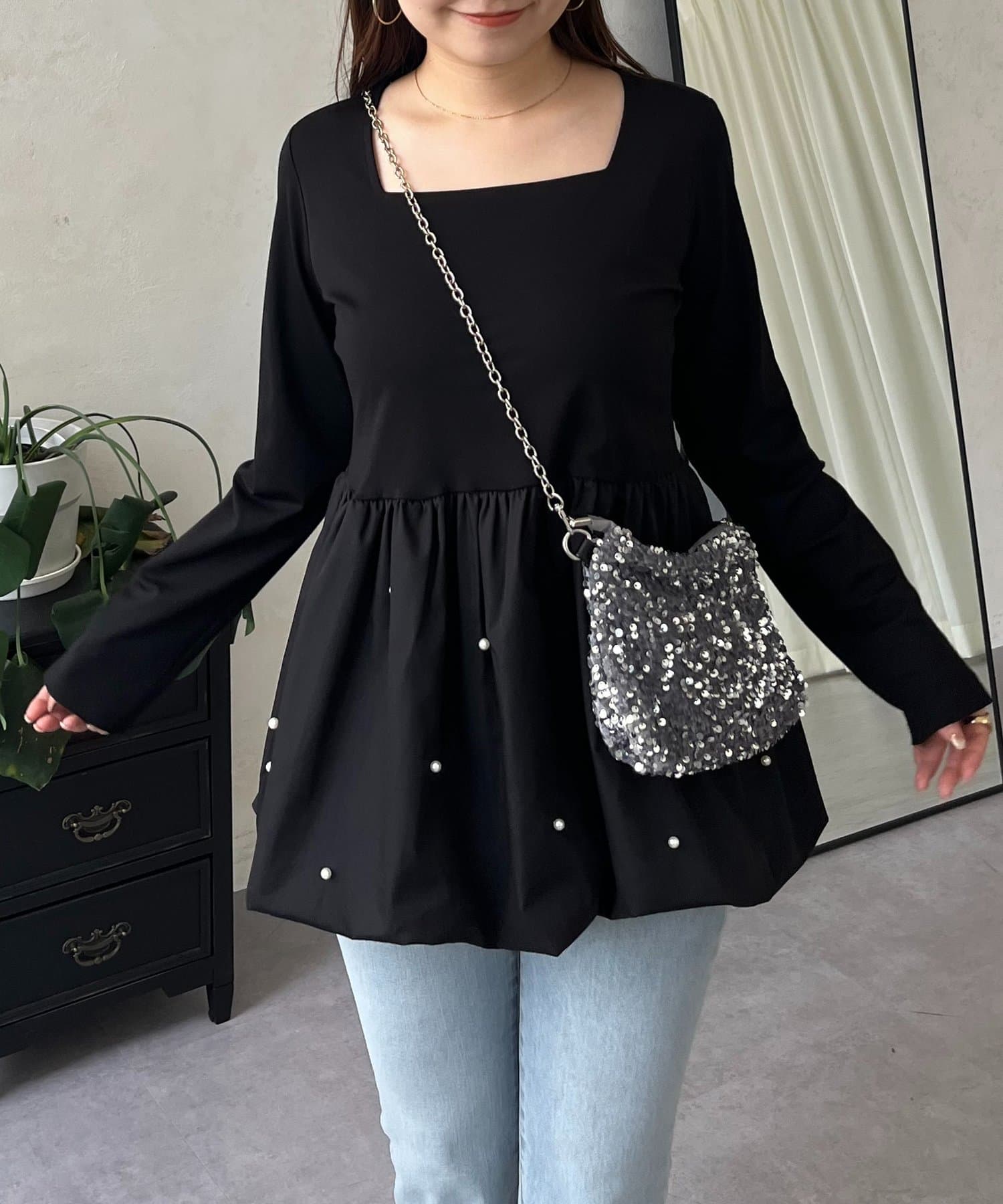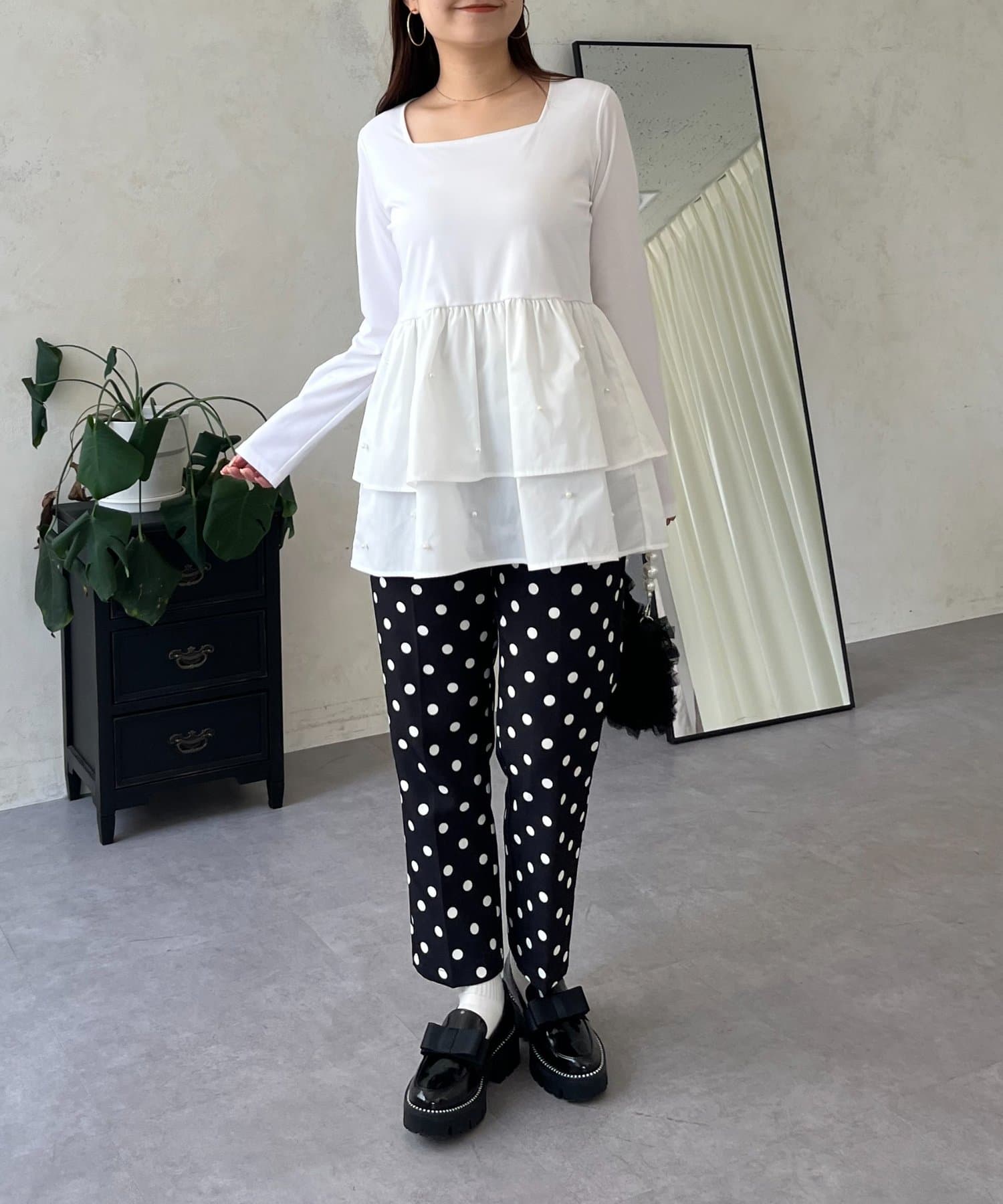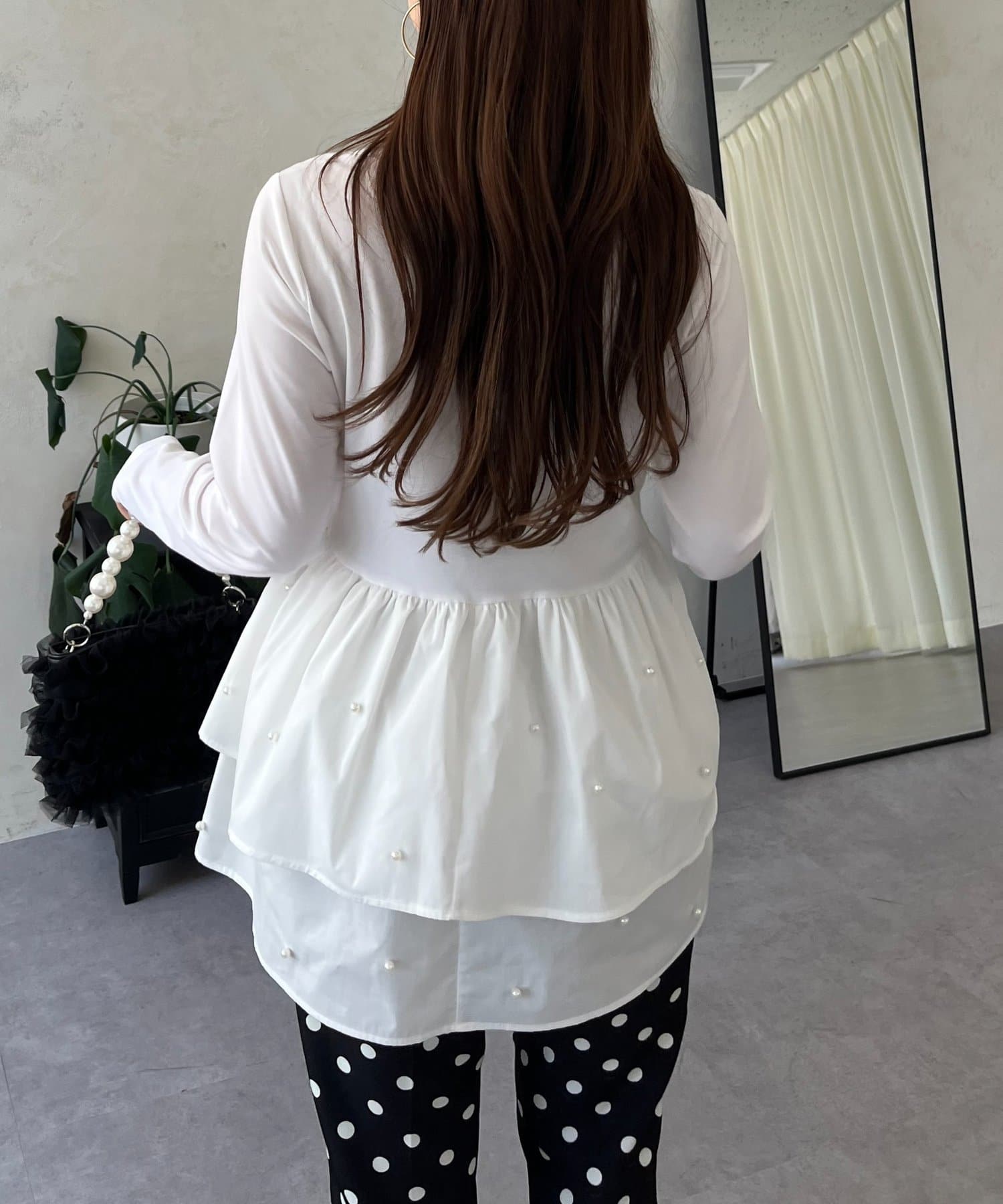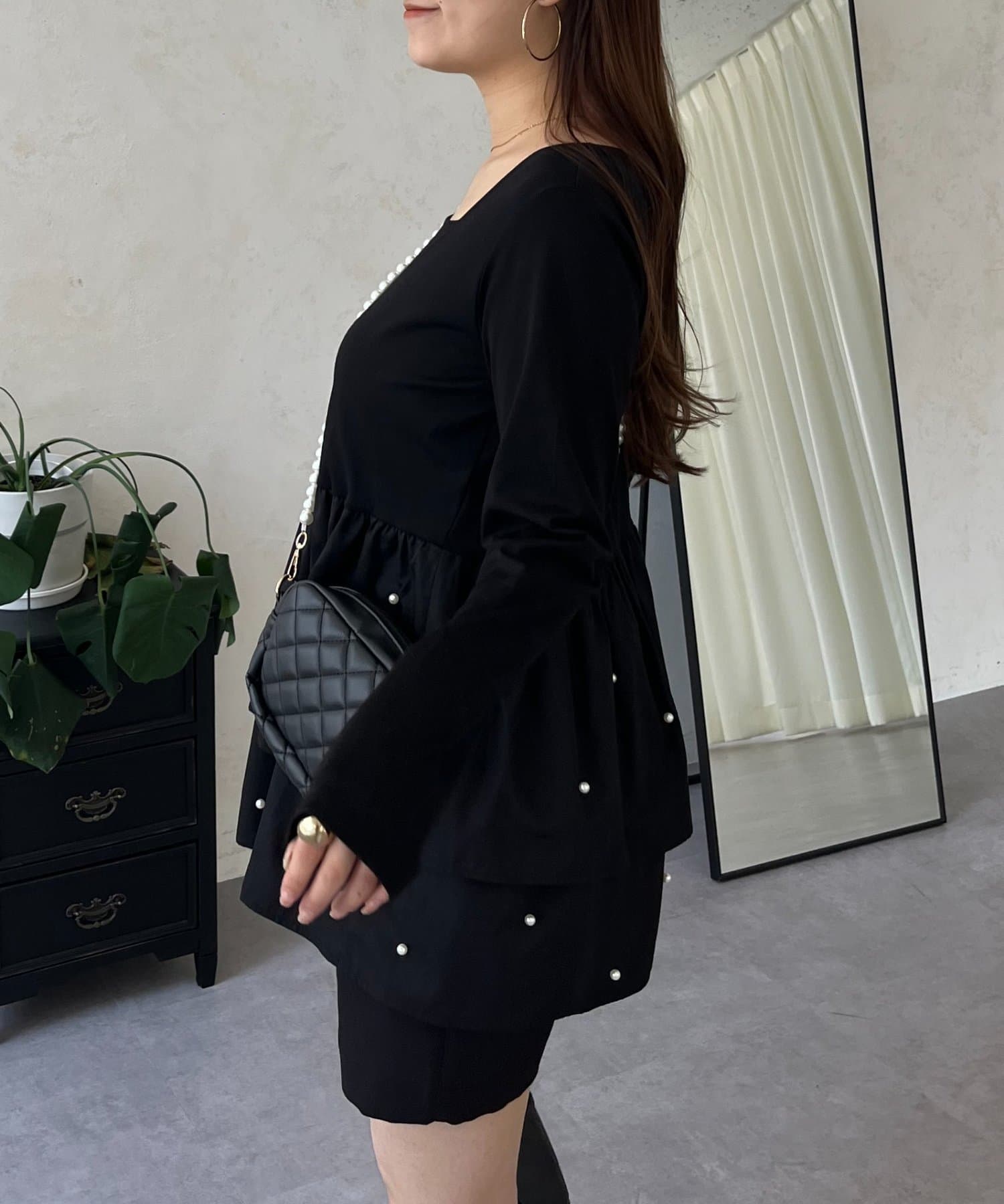 スクエアネックパールペプラムレイヤードロンT