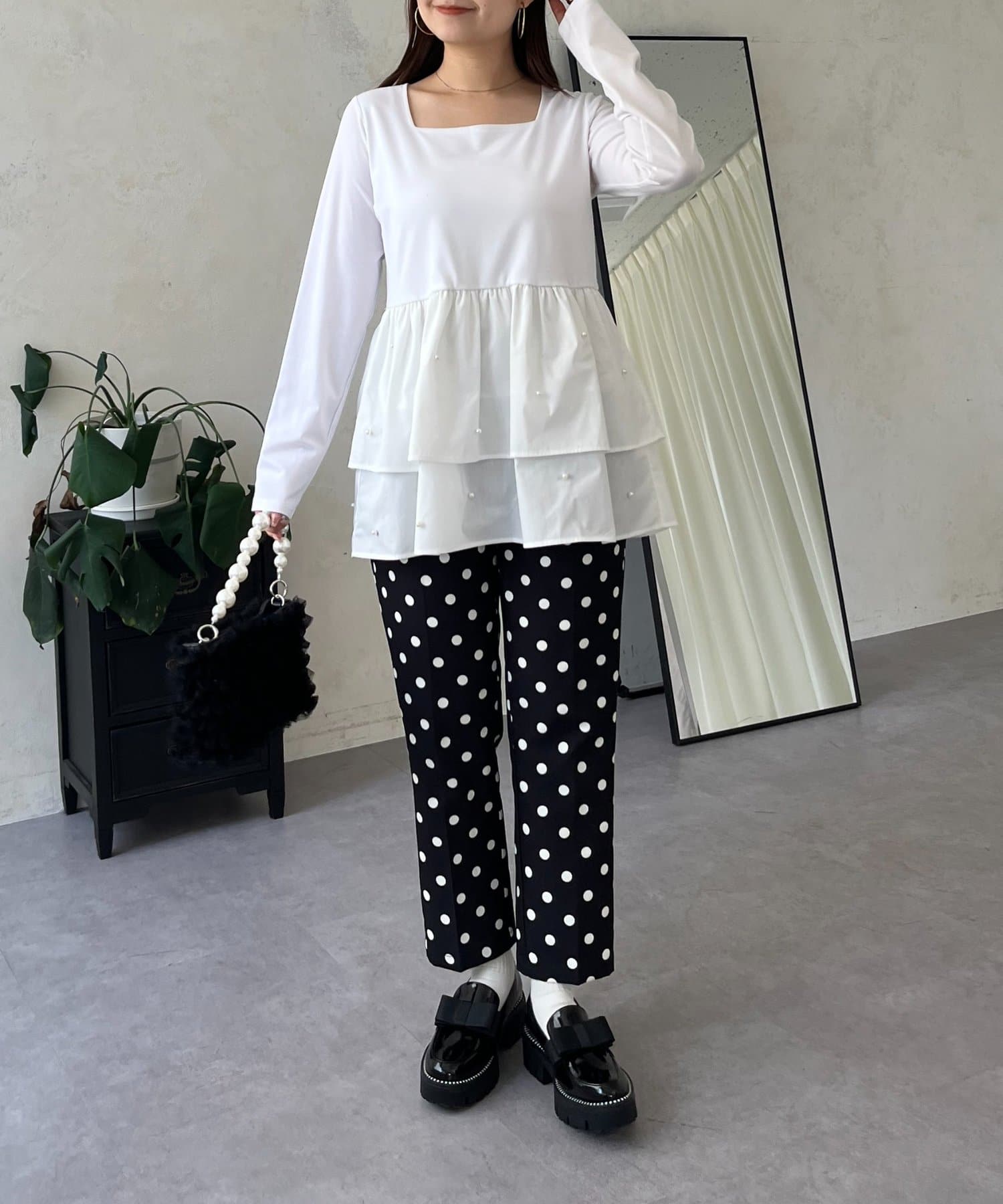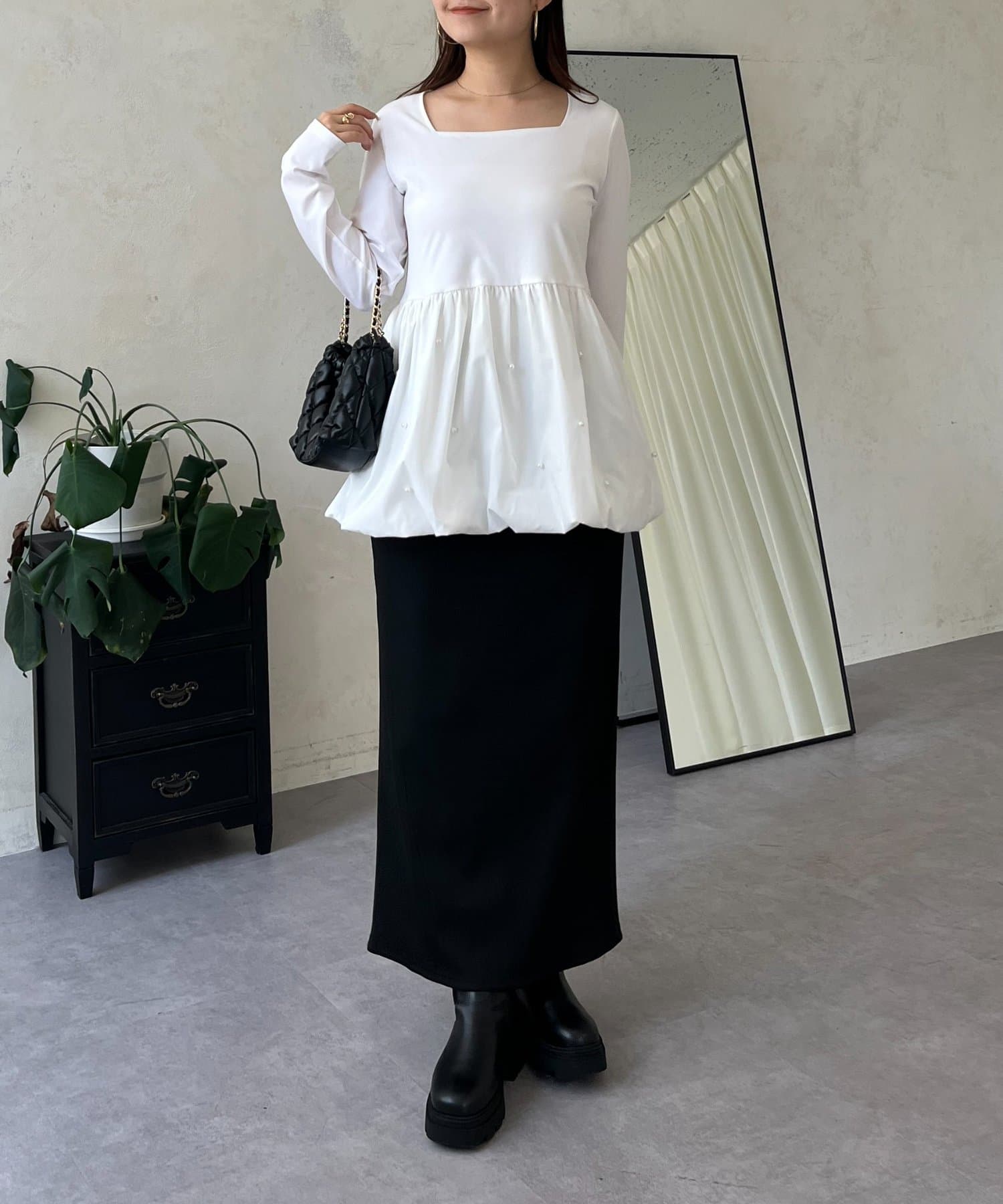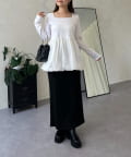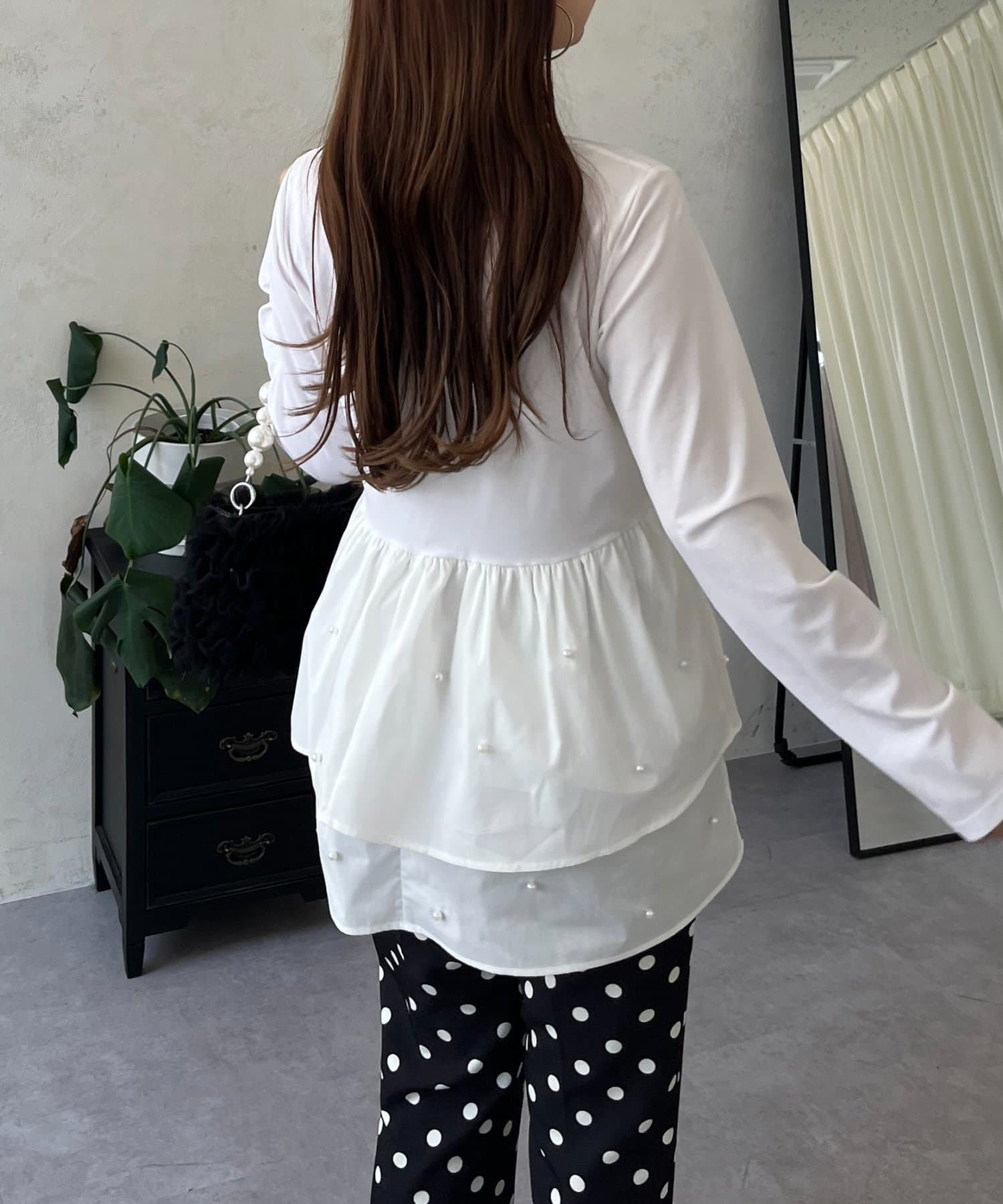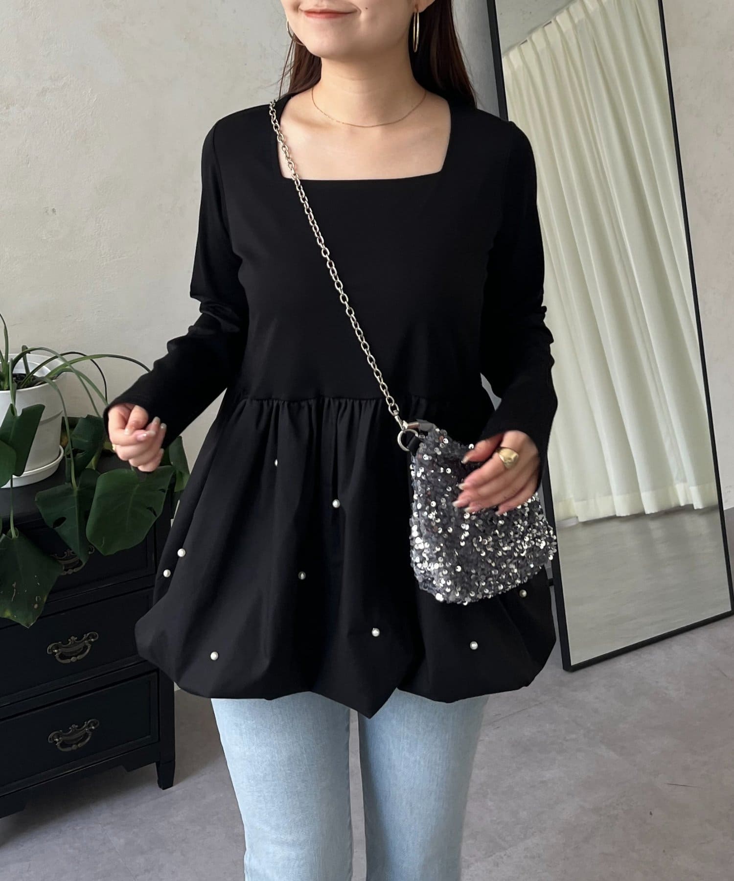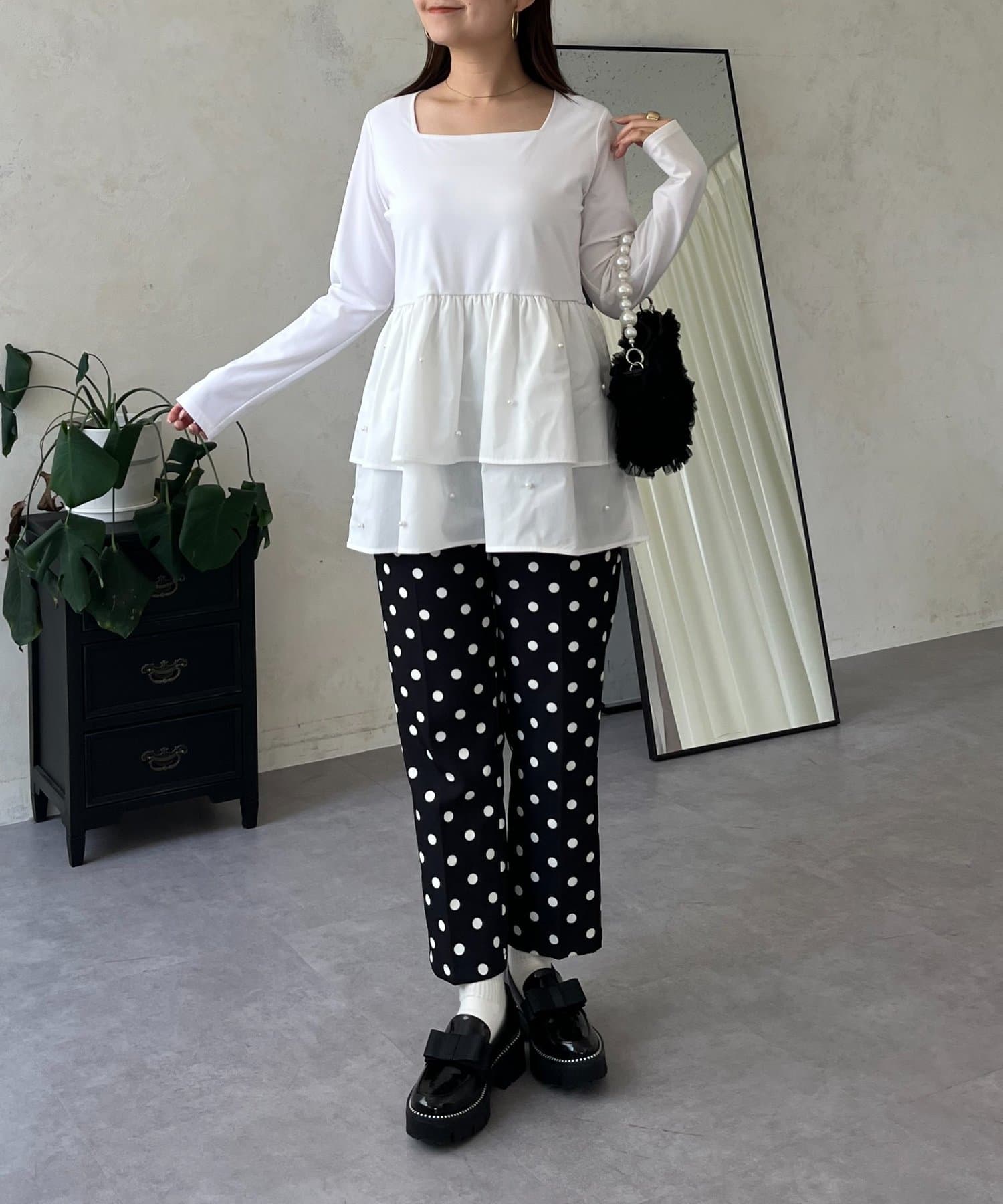 スクエアネックパールペプラムレイヤードロンT