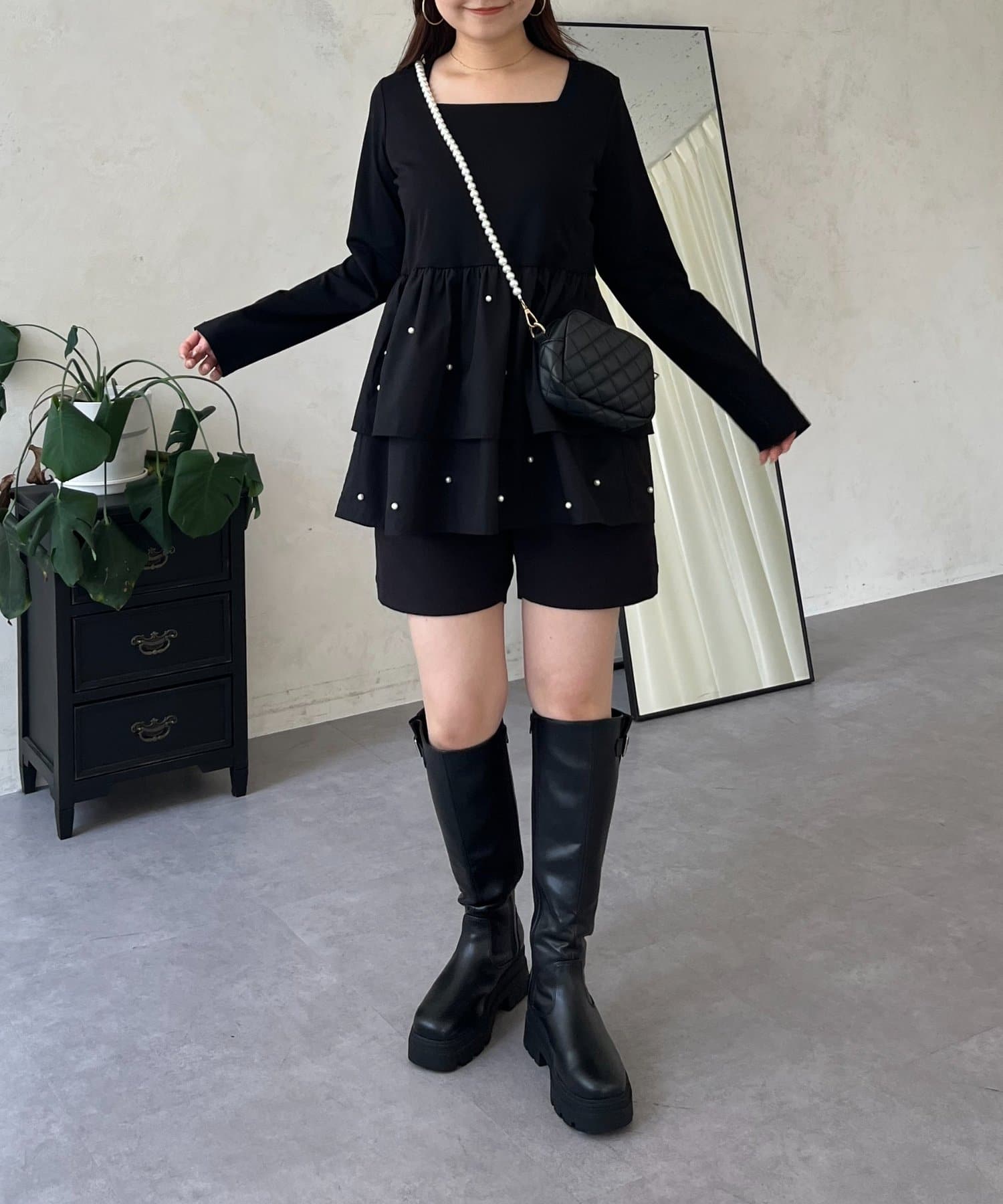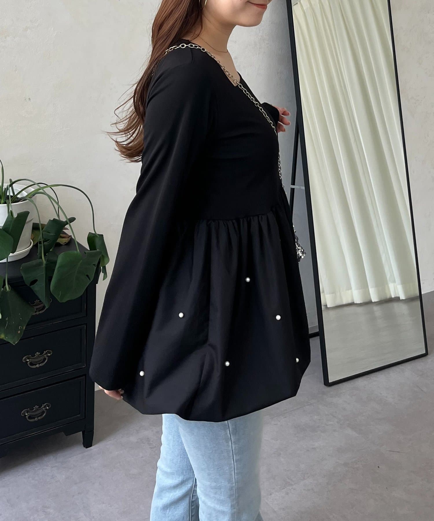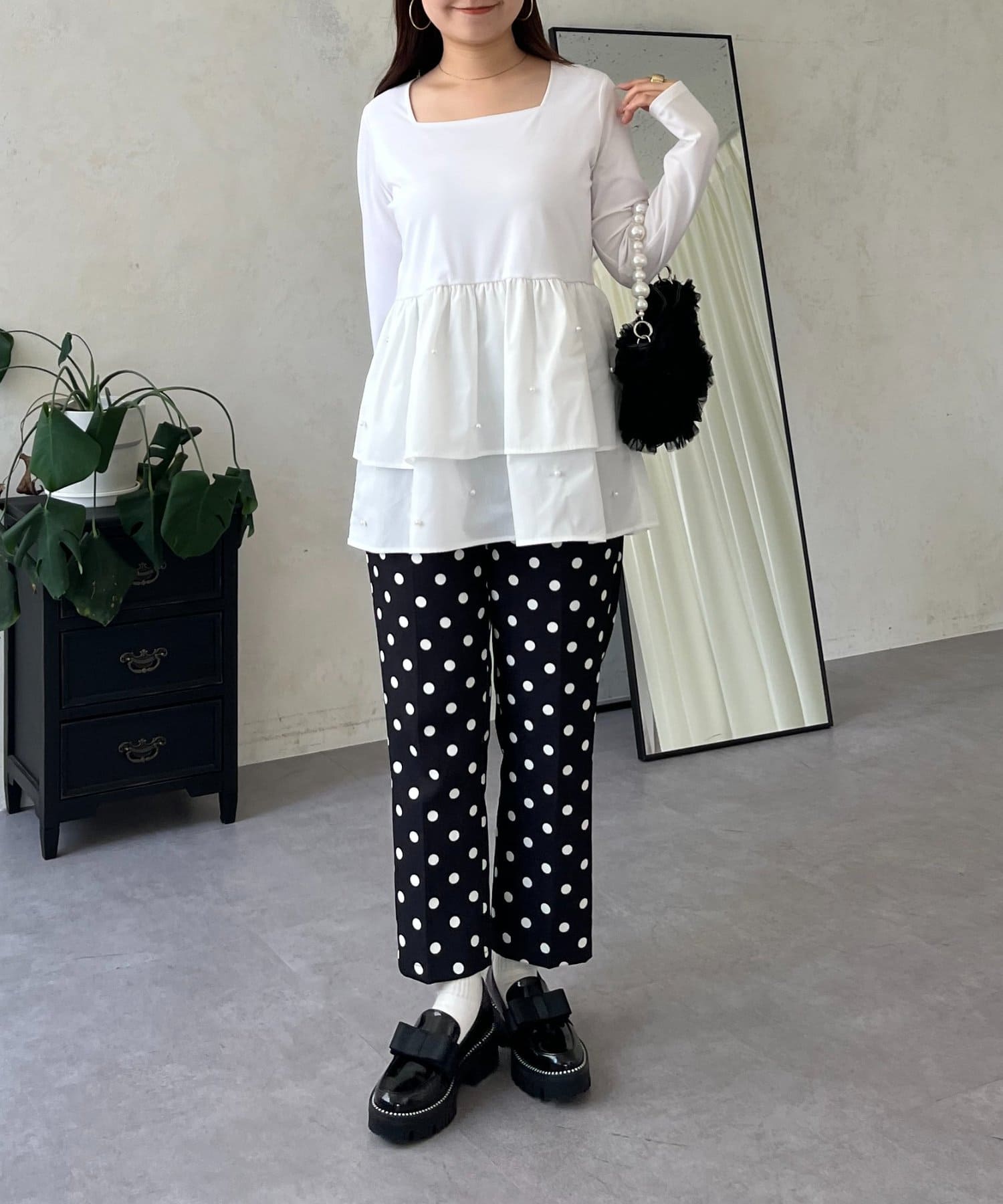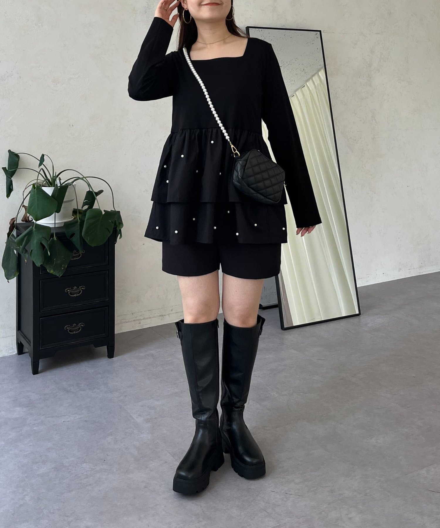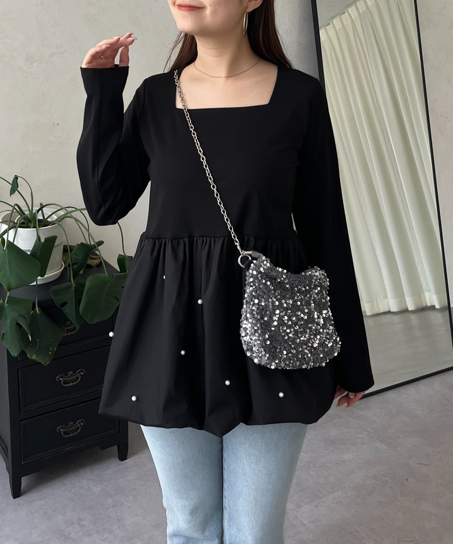 スクエアネックパールペプラムレイヤードロンT