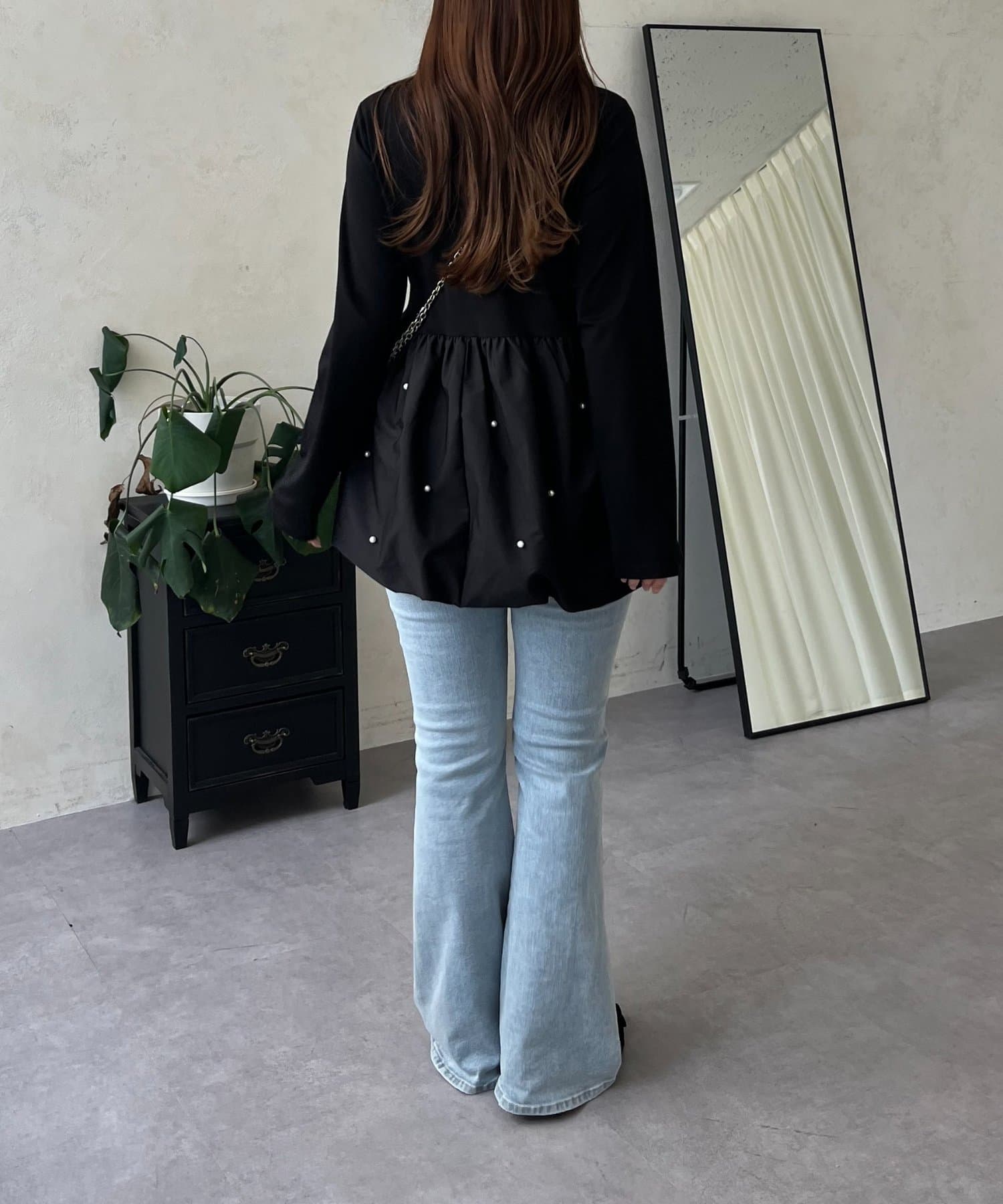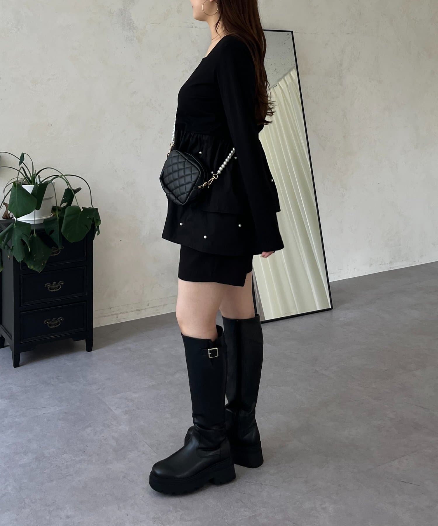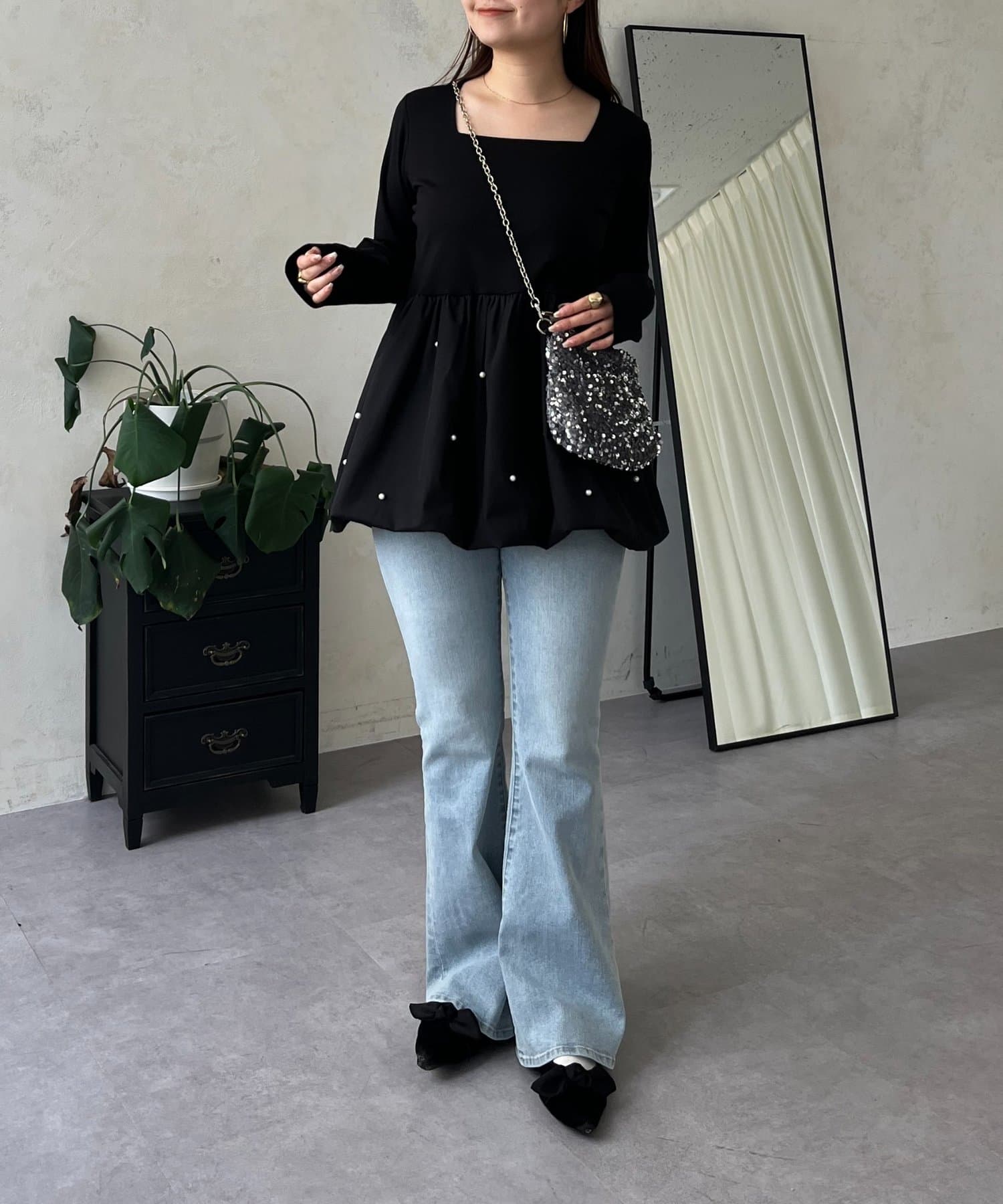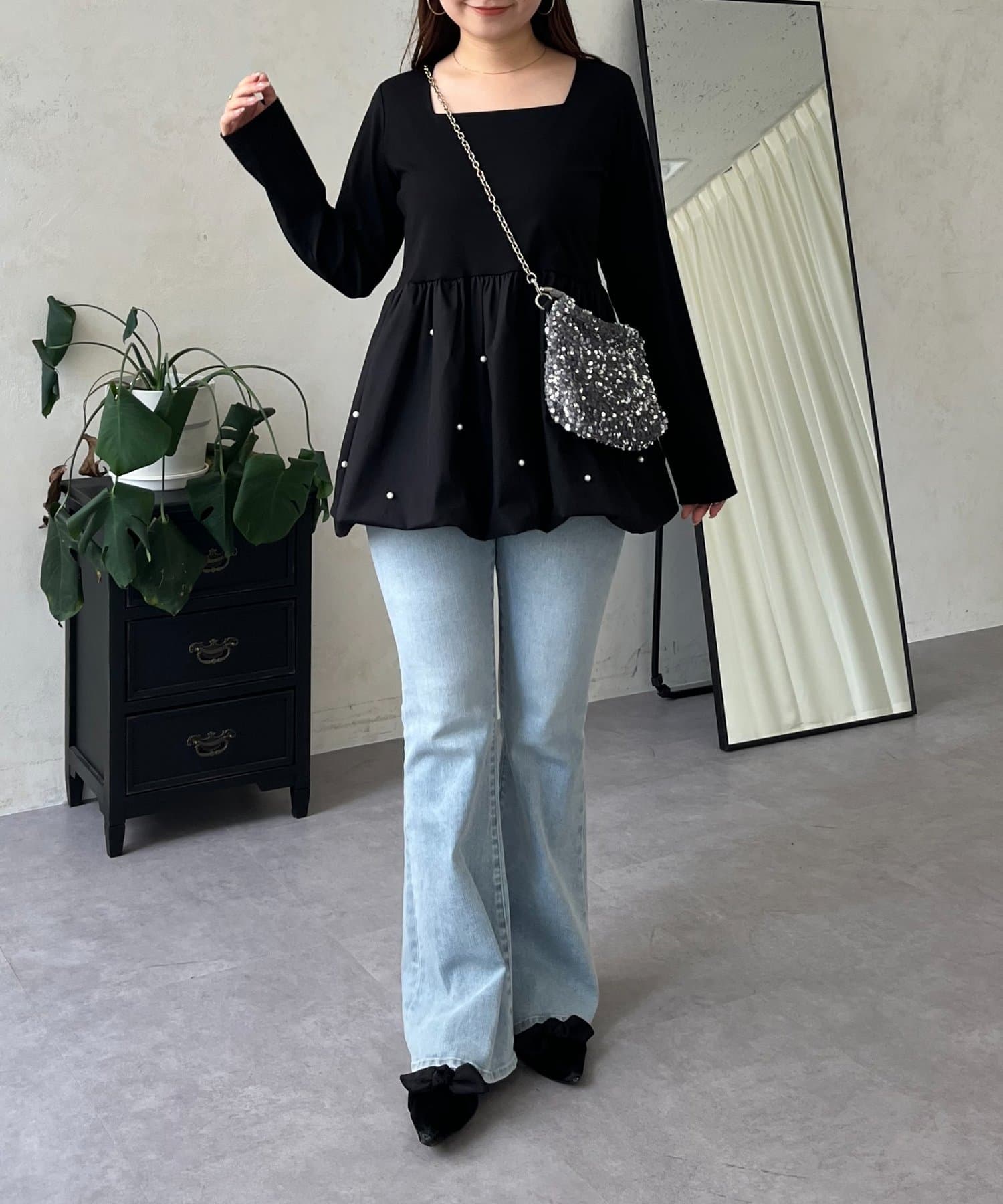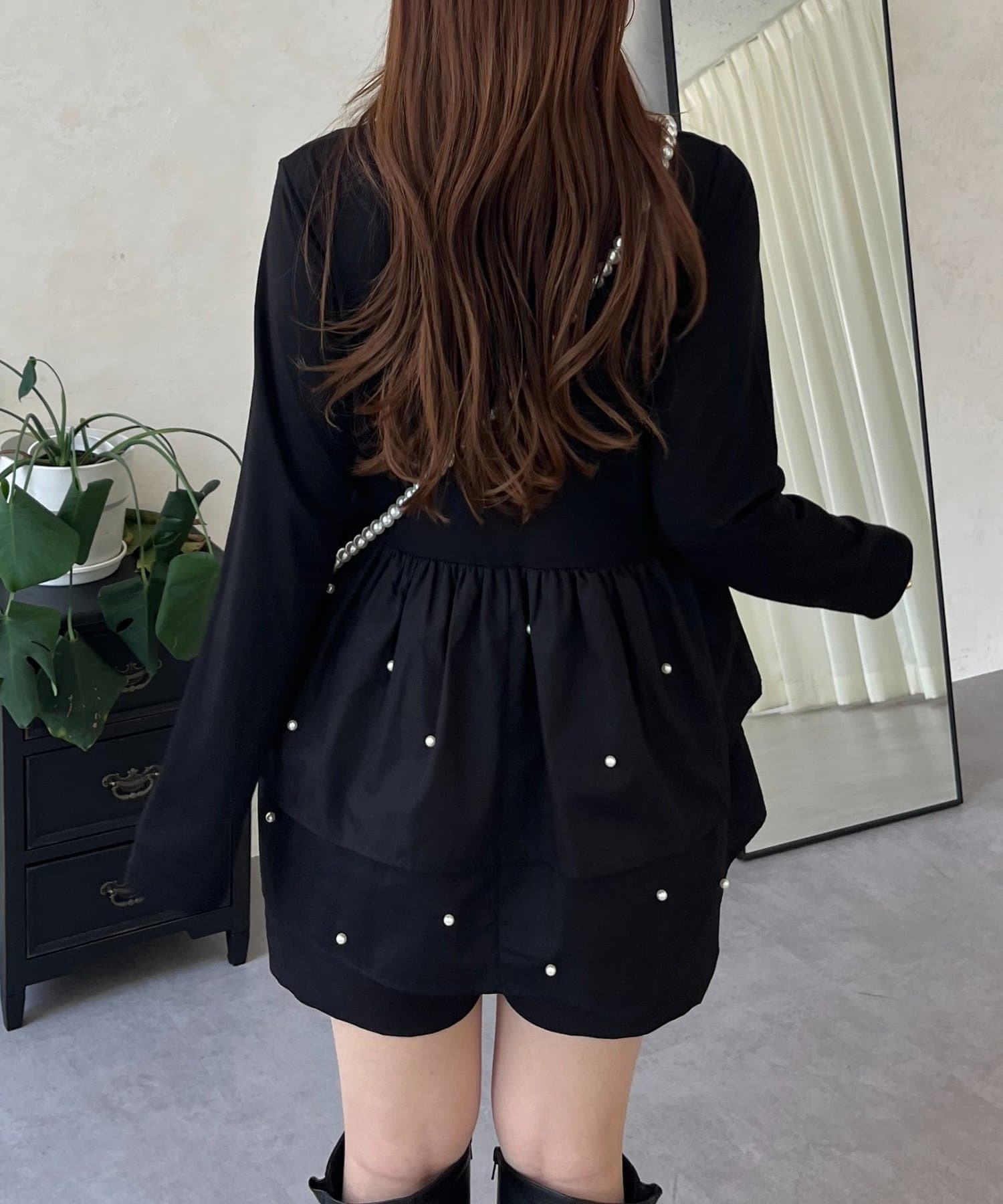 スクエアネックパールペプラムレイヤードロンT