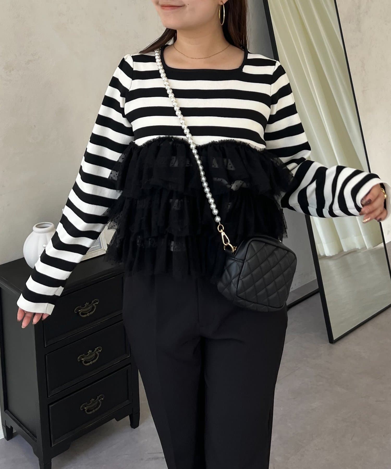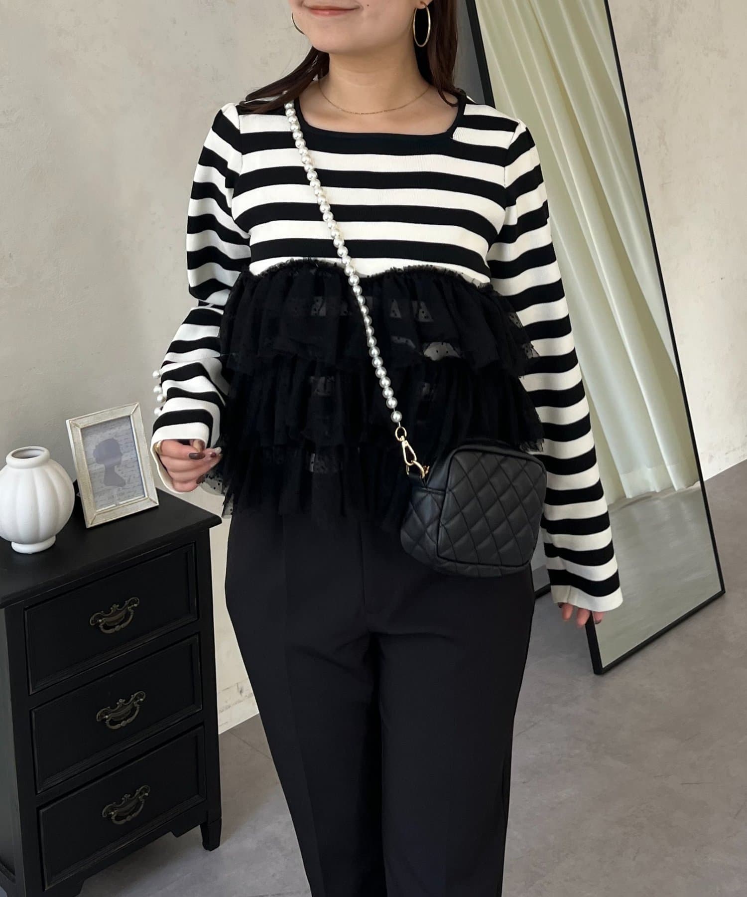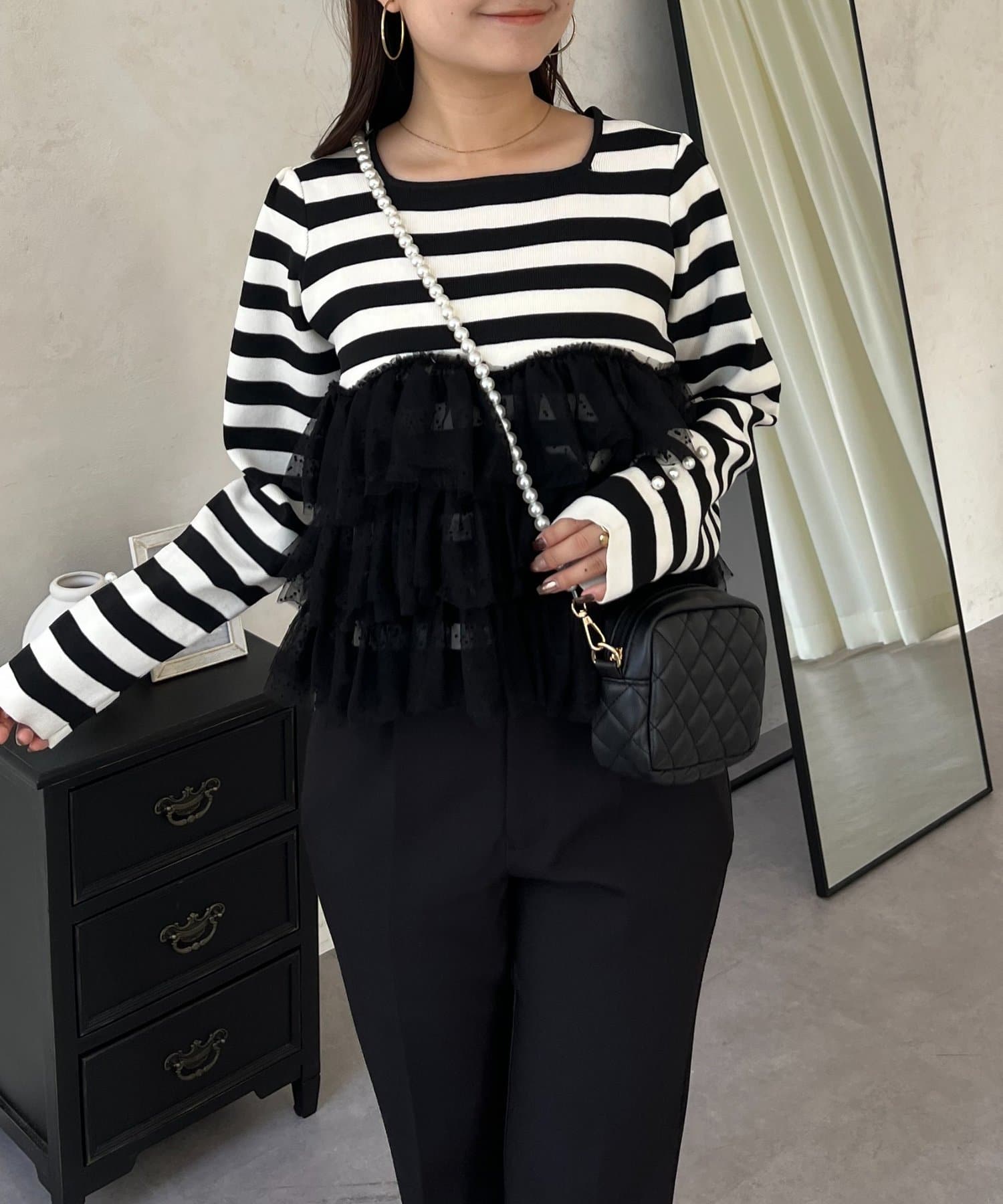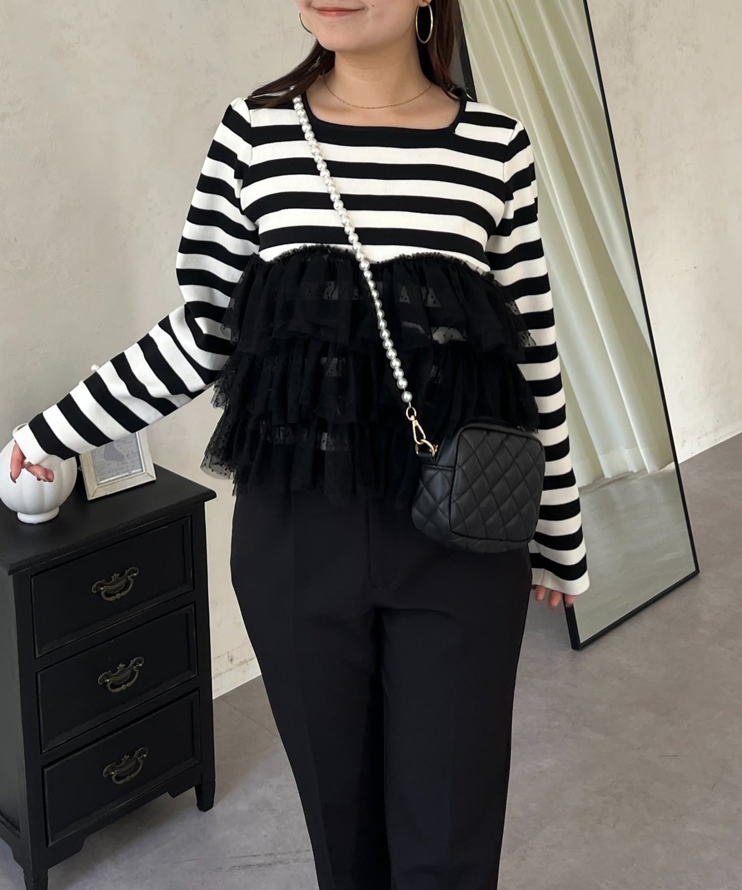 短丈ですが、チュールフリルがあるからそんなにお腹とか腰回り気にならないです!首元もスクエアネックなのでスッキリ着れて有難いデザインです!