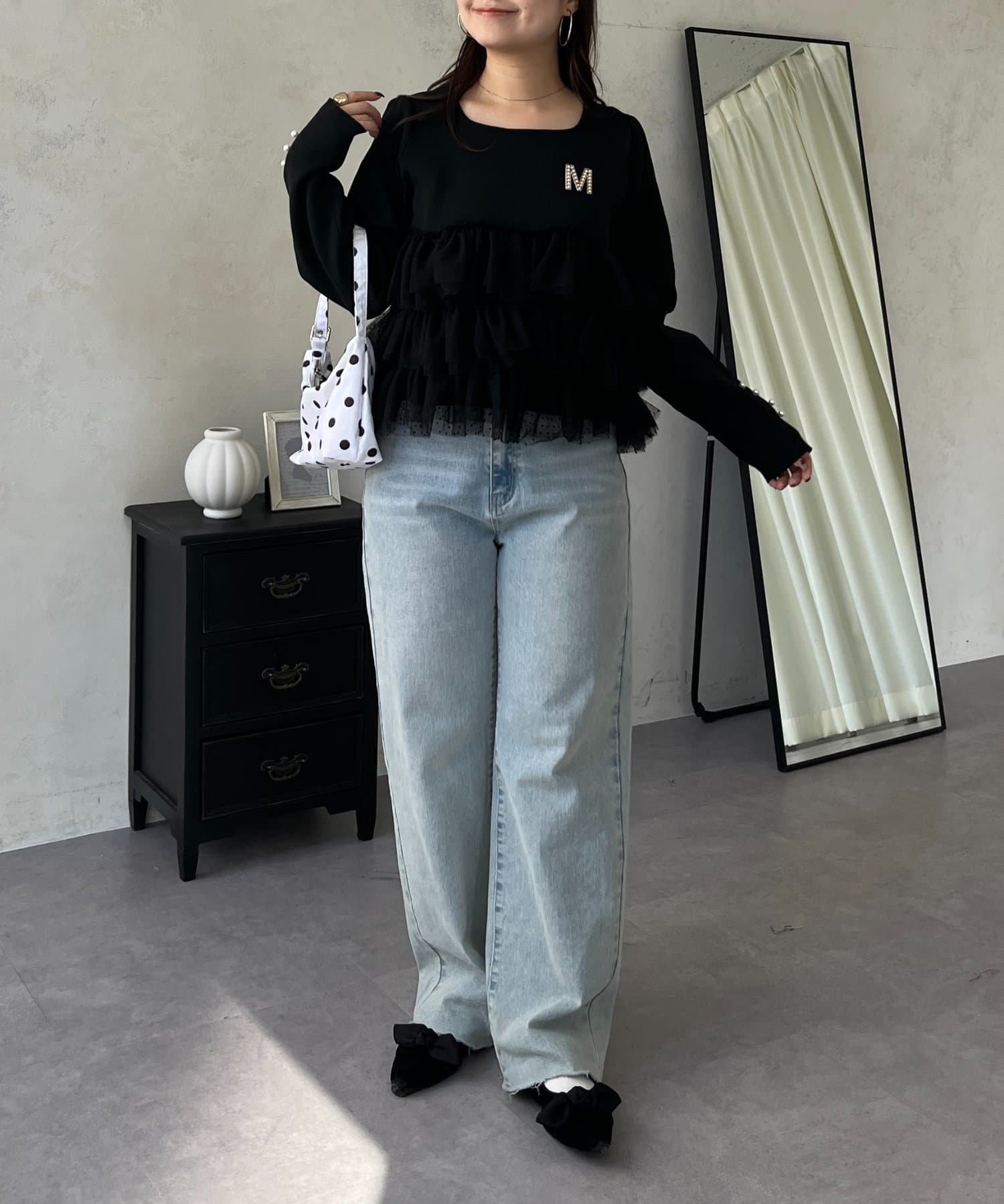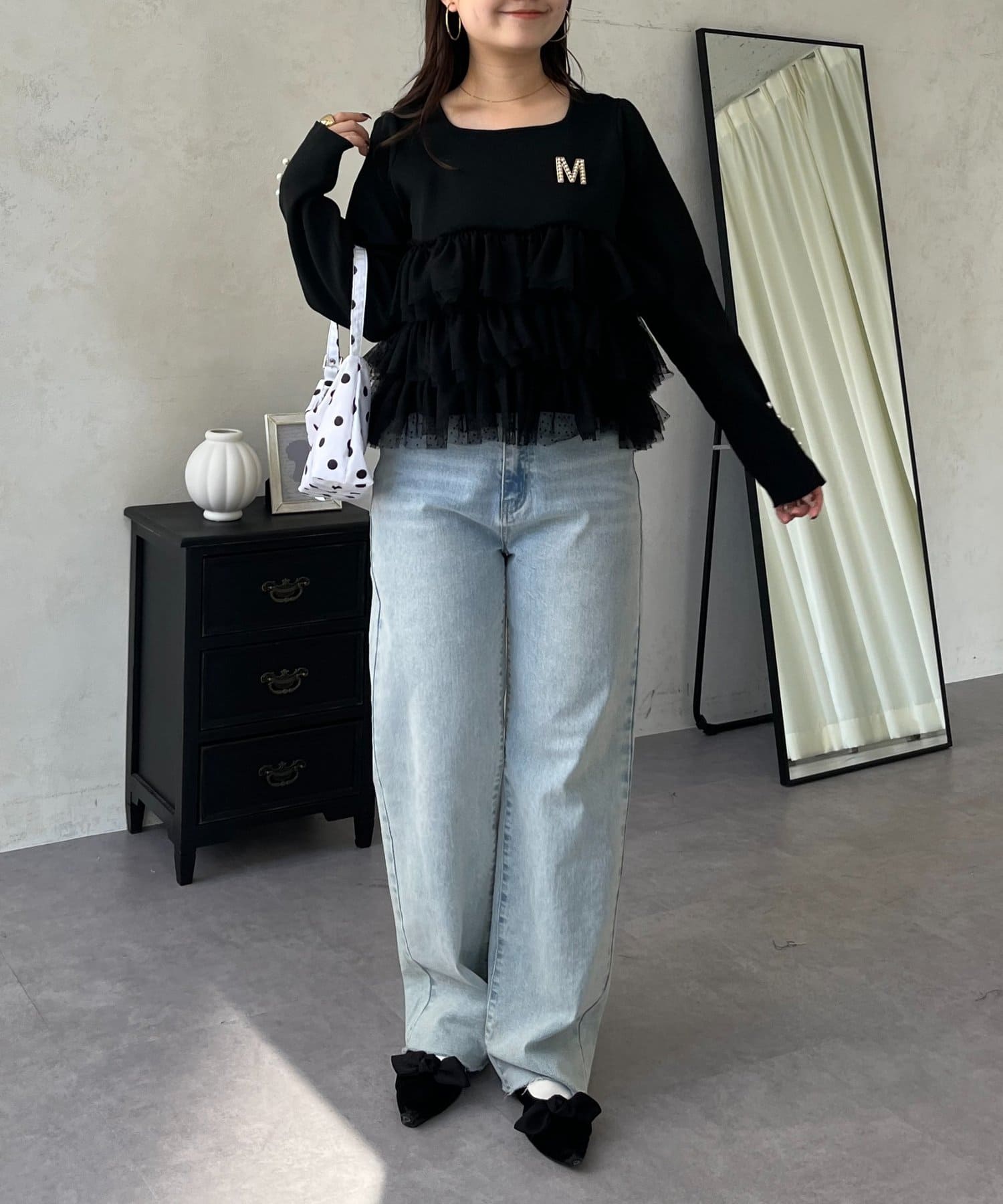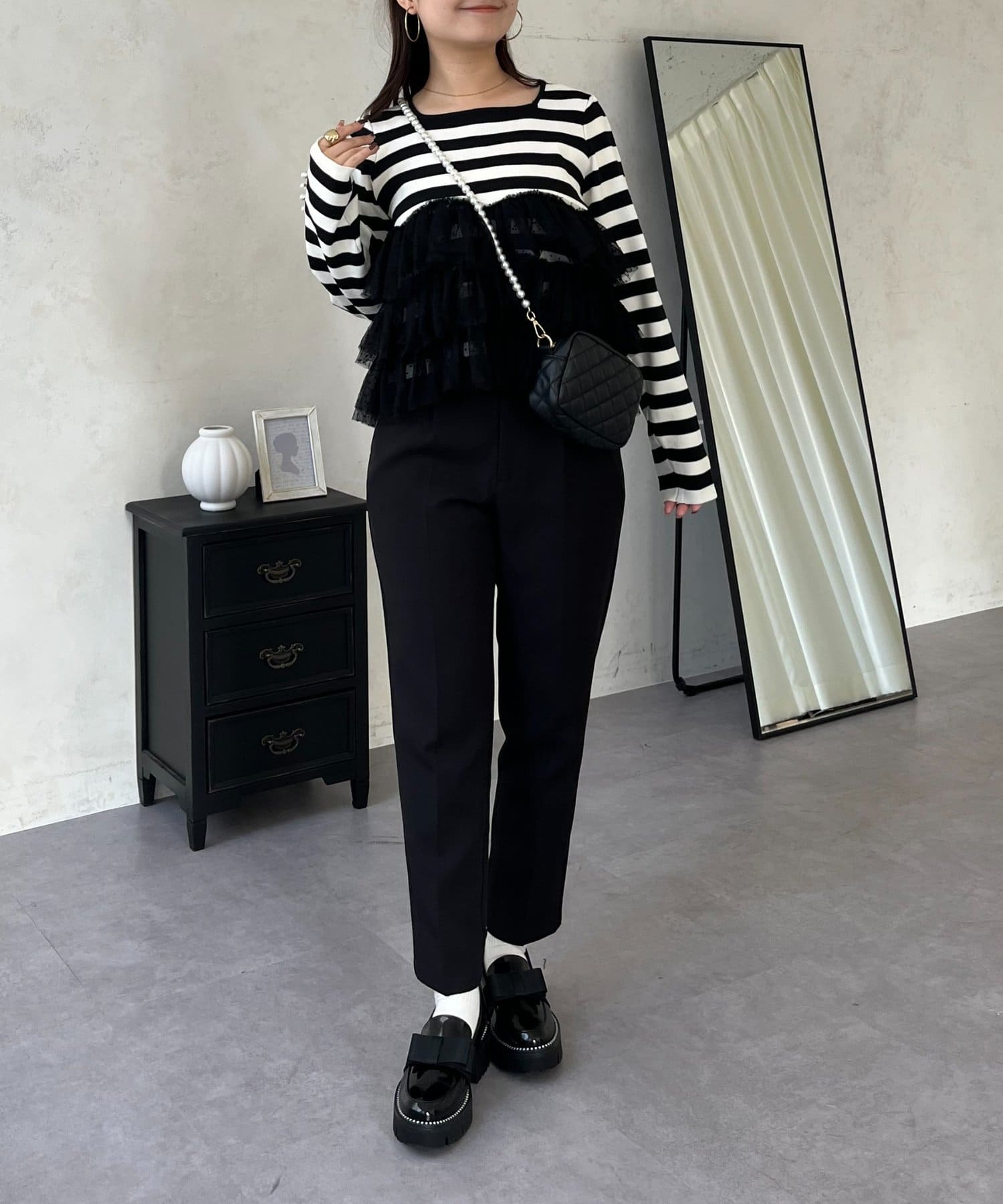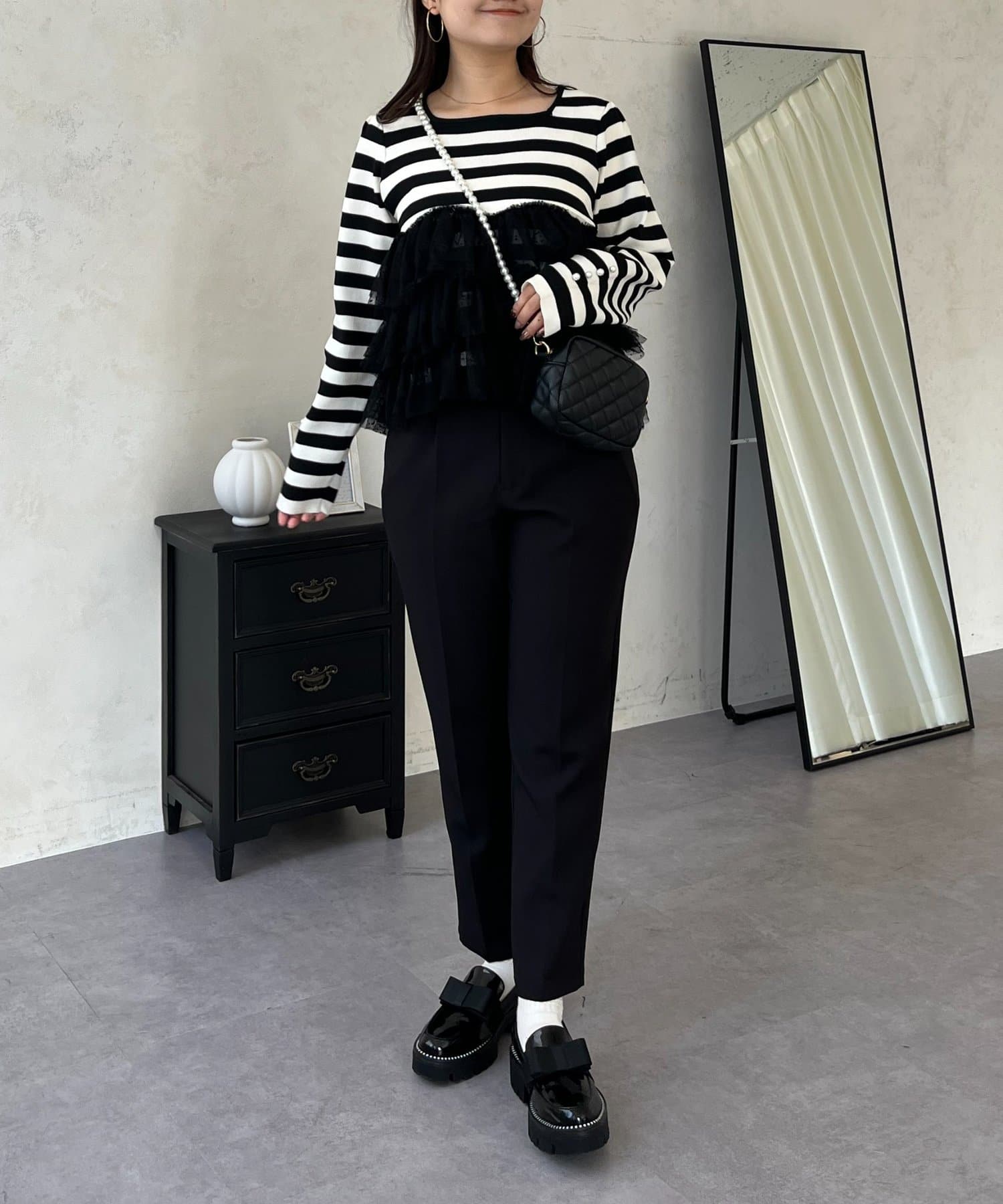 短丈ですが、チュールフリルがあるからそんなにお腹とか腰回り気にならないです!首元もスクエアネックなのでスッキリ着れて有難いデザインです!