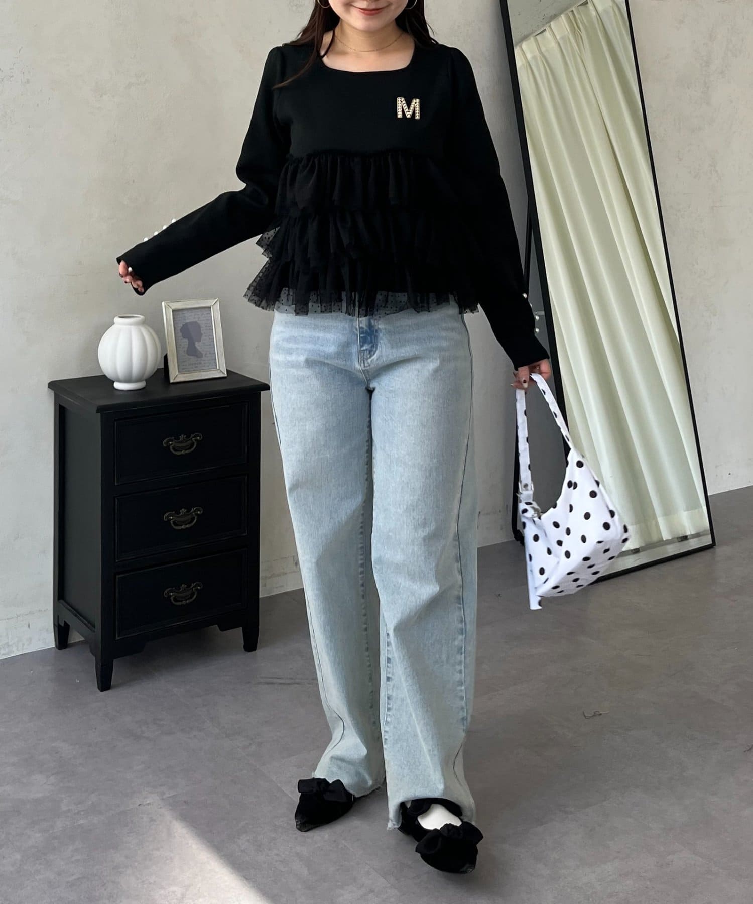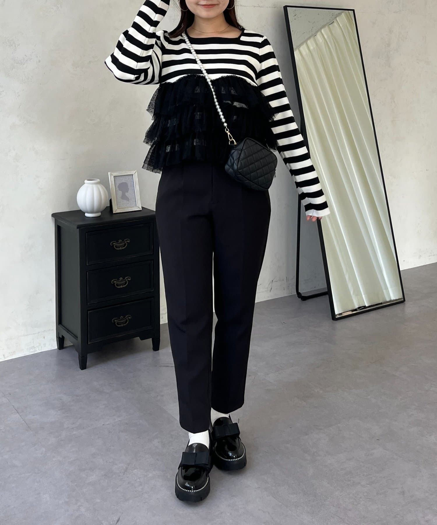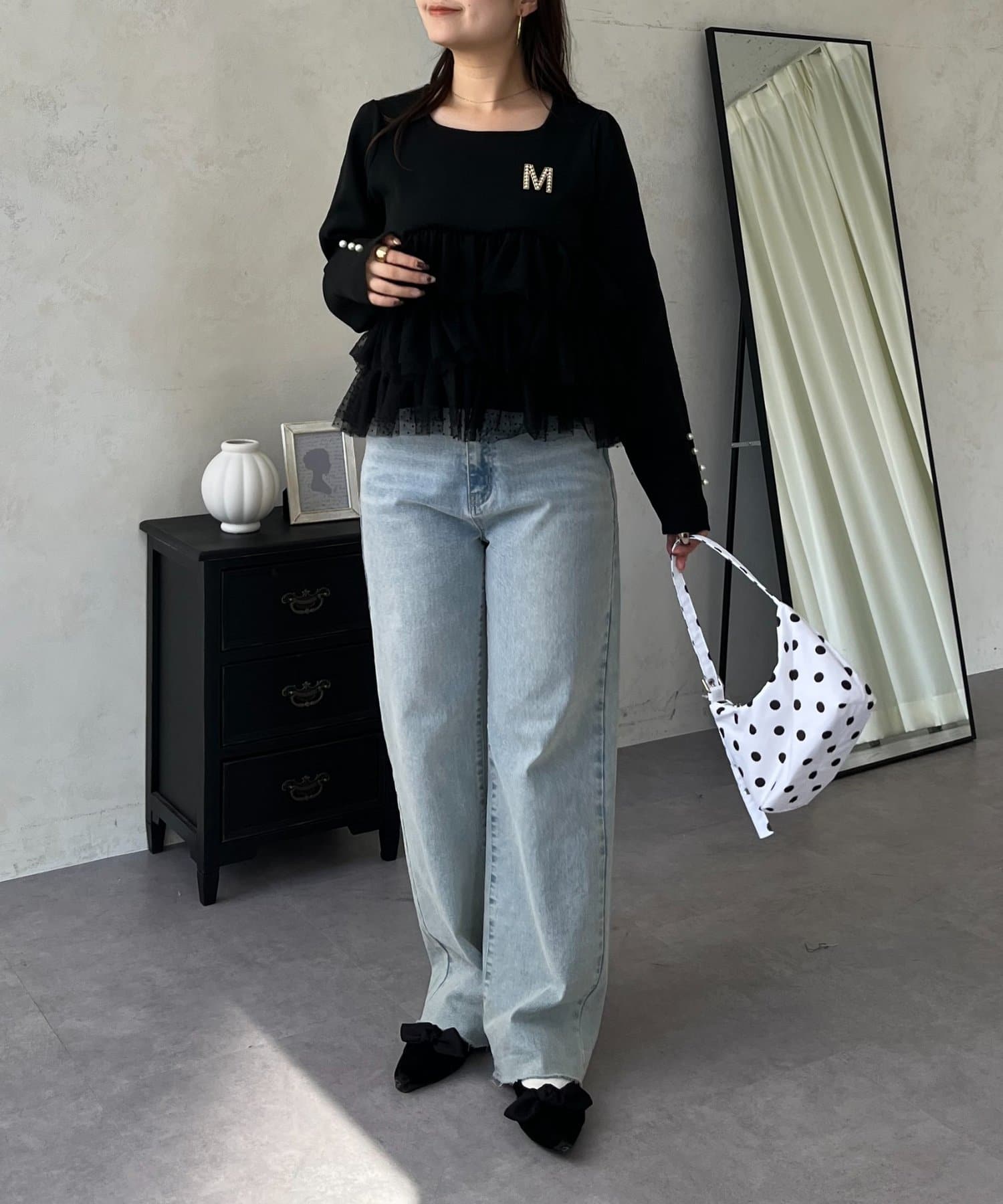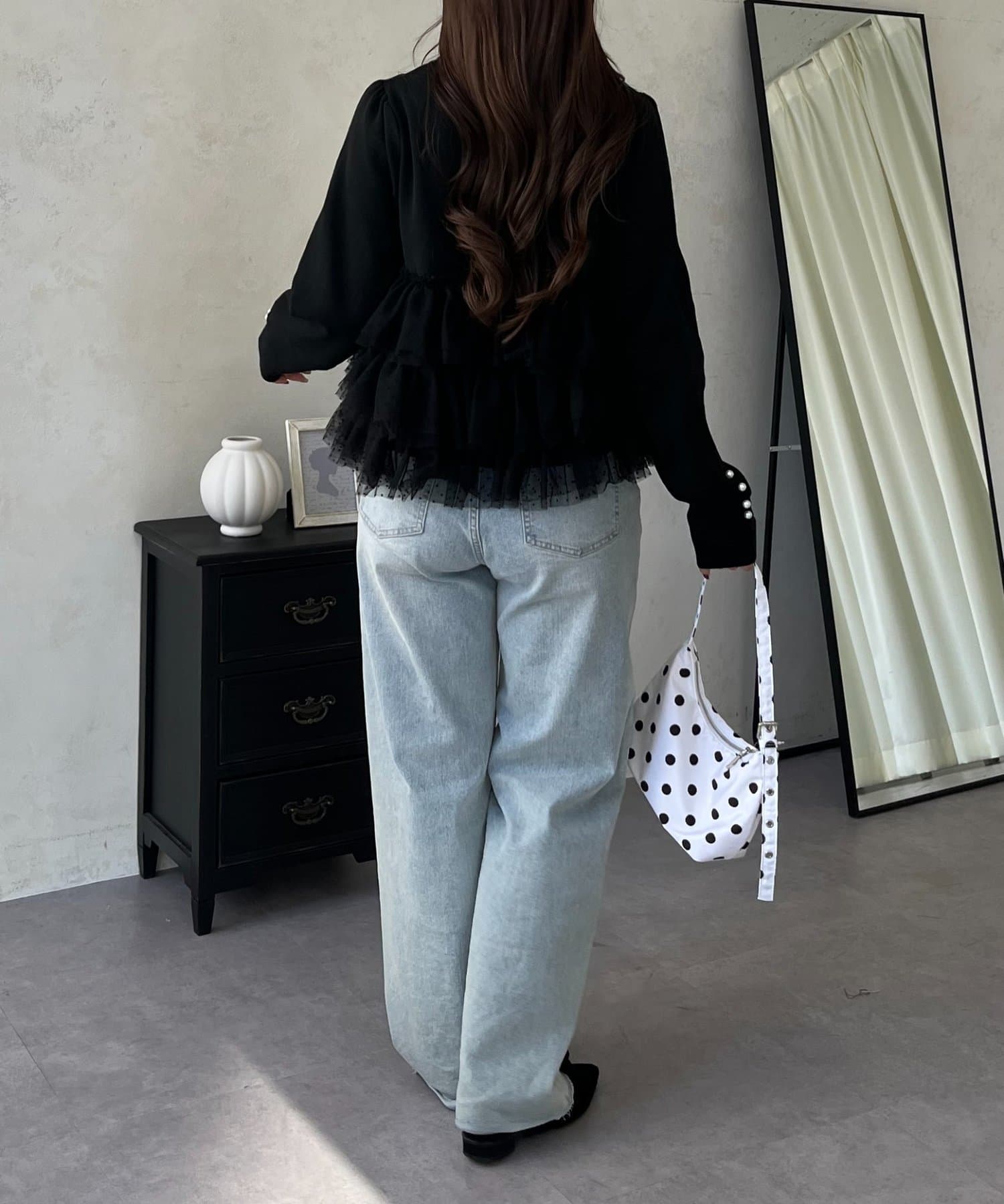 短丈ですが、チュールフリルがあるからそんなにお腹とか腰回り気にならないです!首元もスクエアネックなのでスッキリ着れて有難いデザインです!