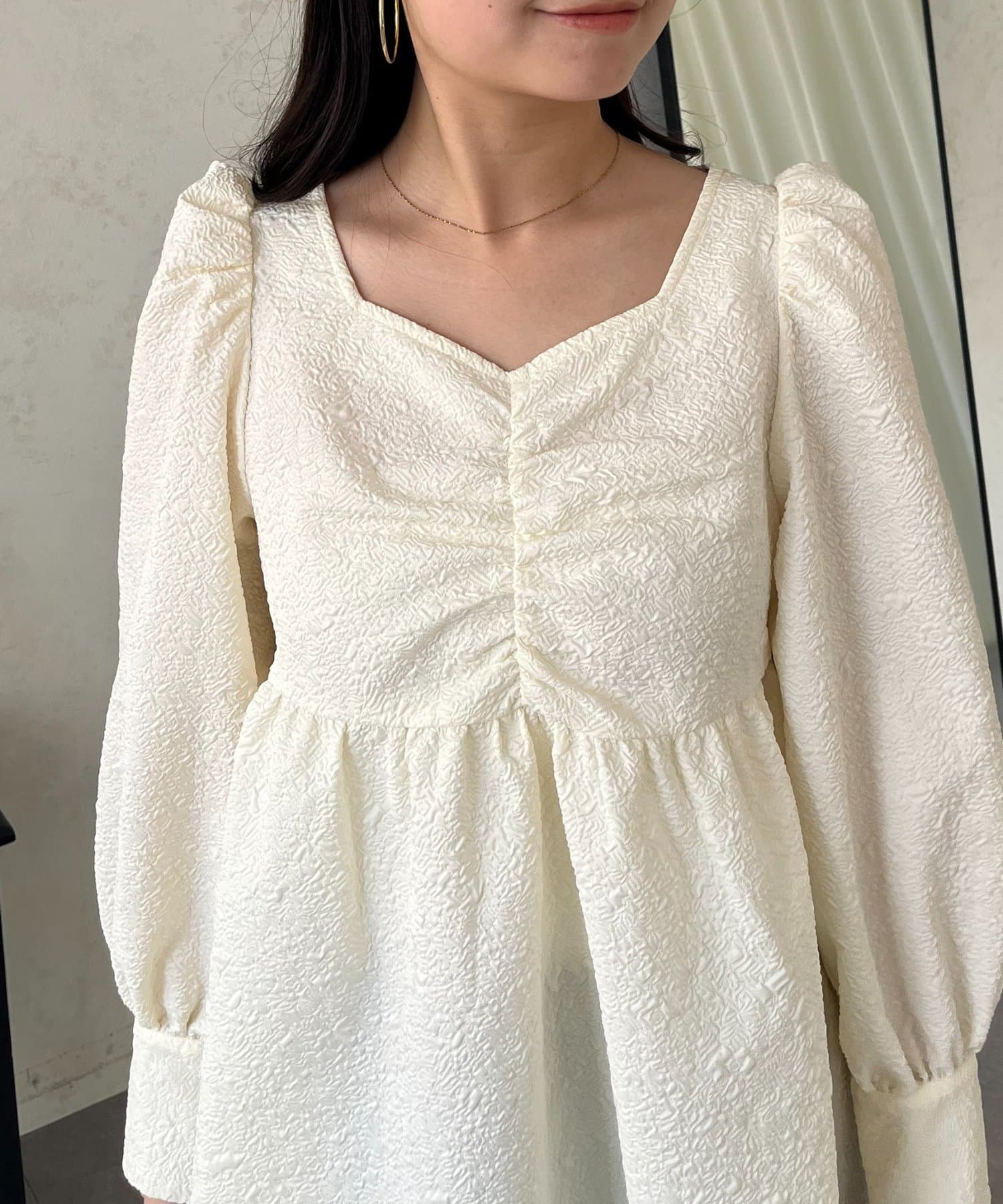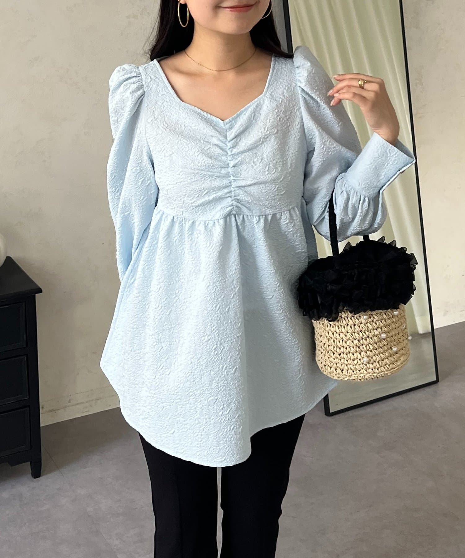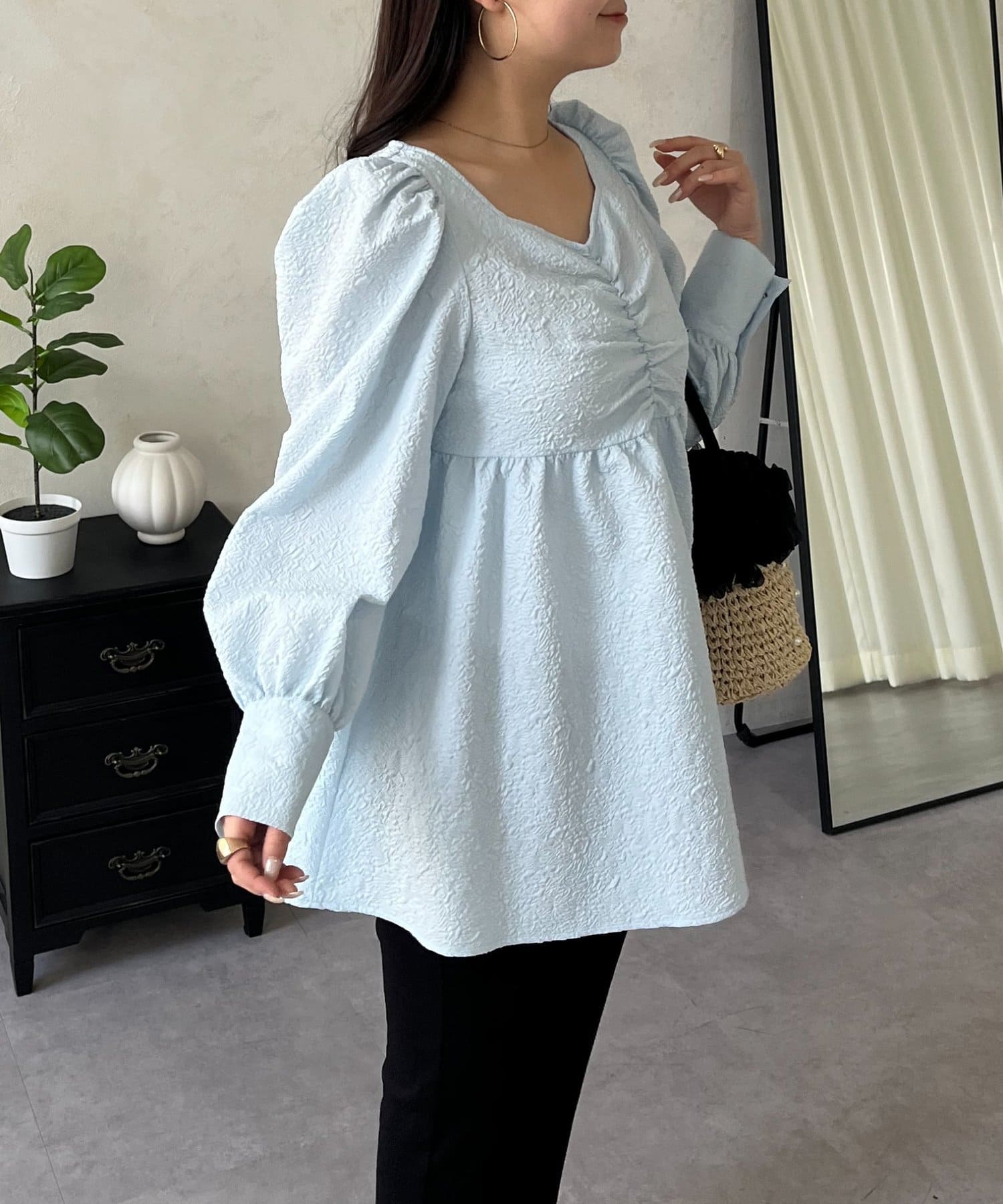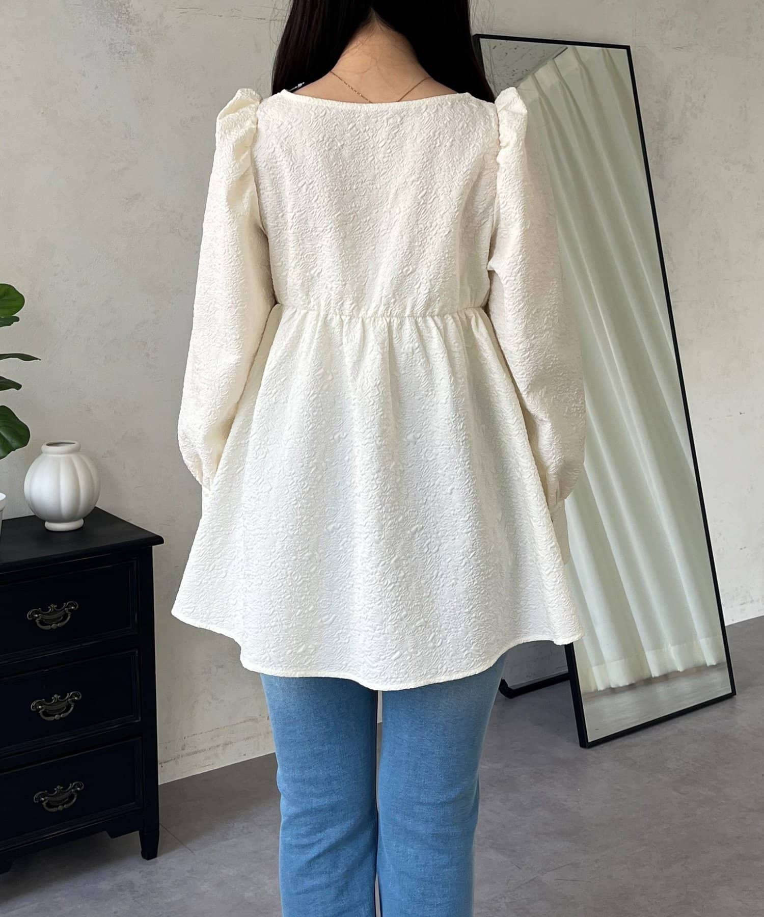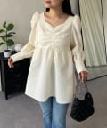 フロントシャーリングパフスリーブジャガードペプラムブラウス