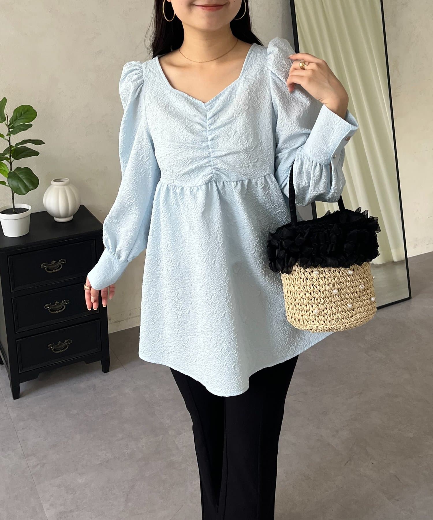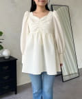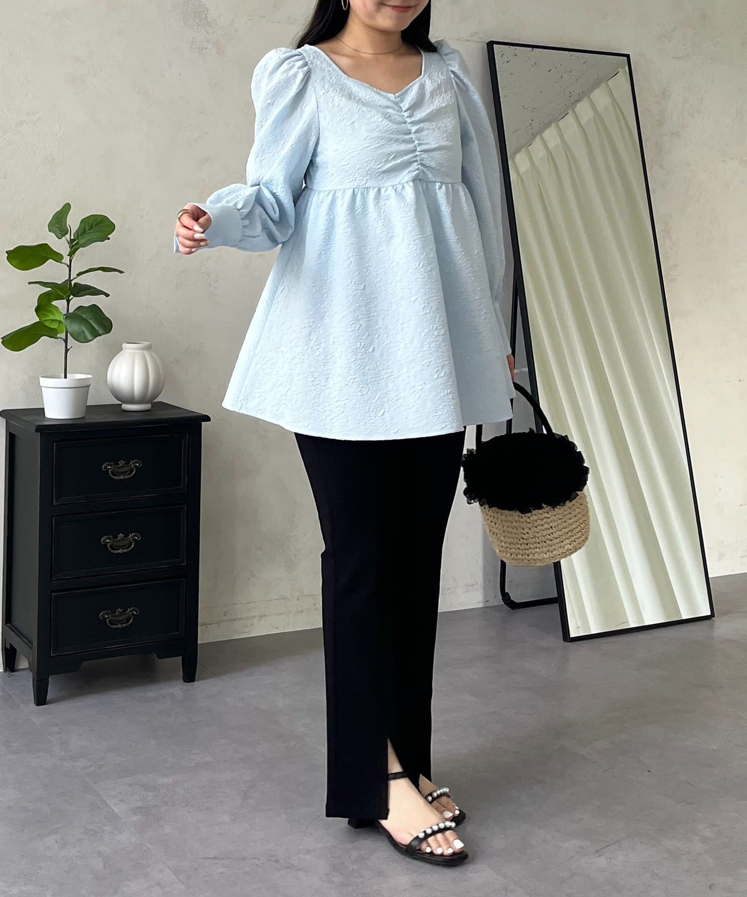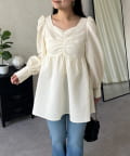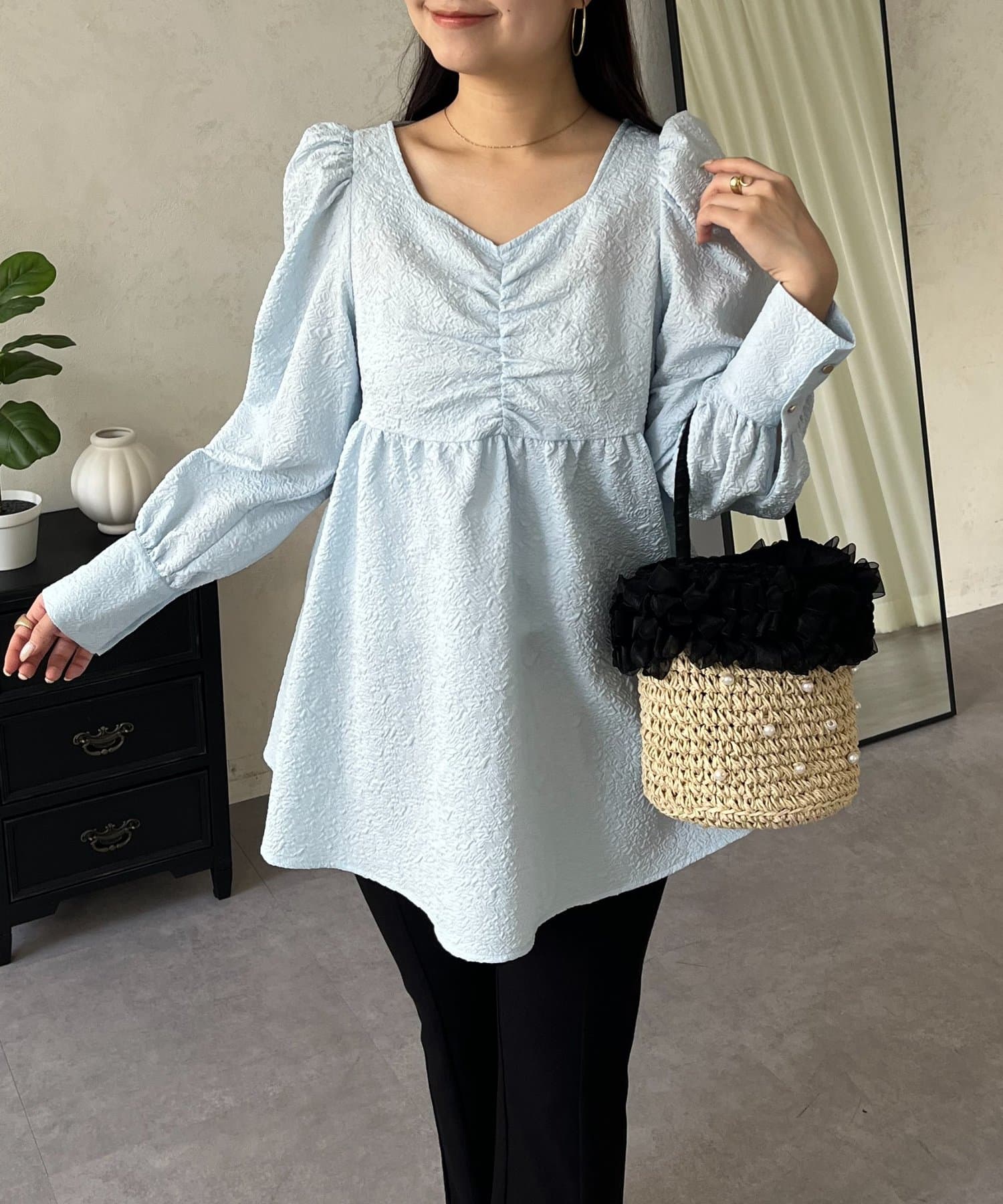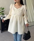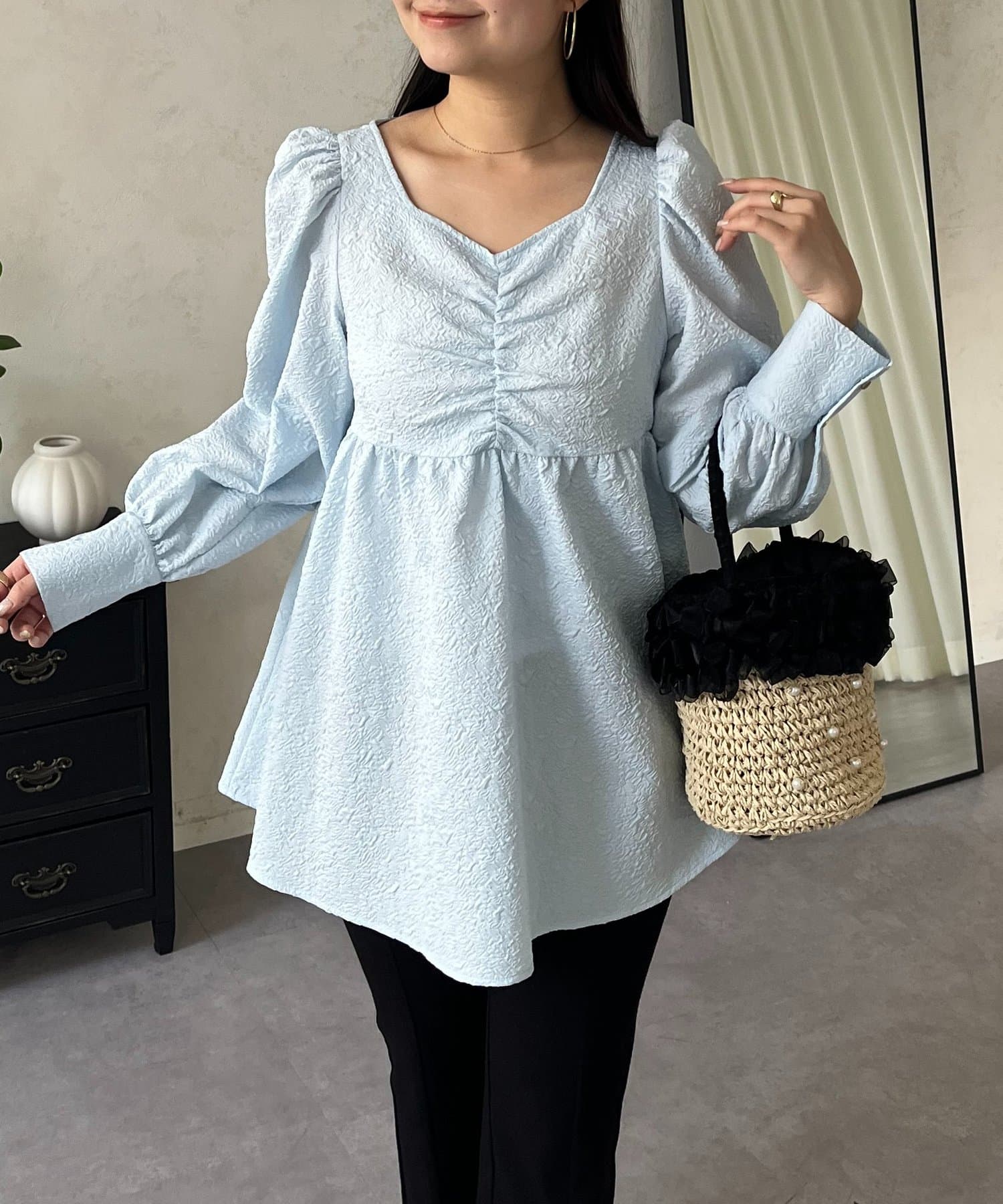 フロントシャーリングパフスリーブジャガードペプラムブラウス