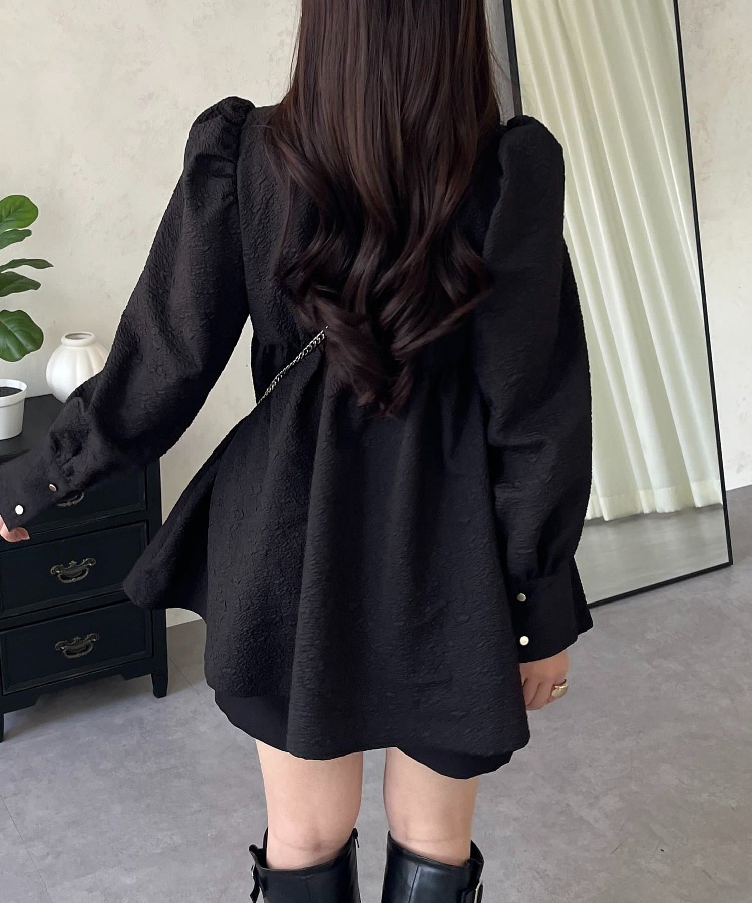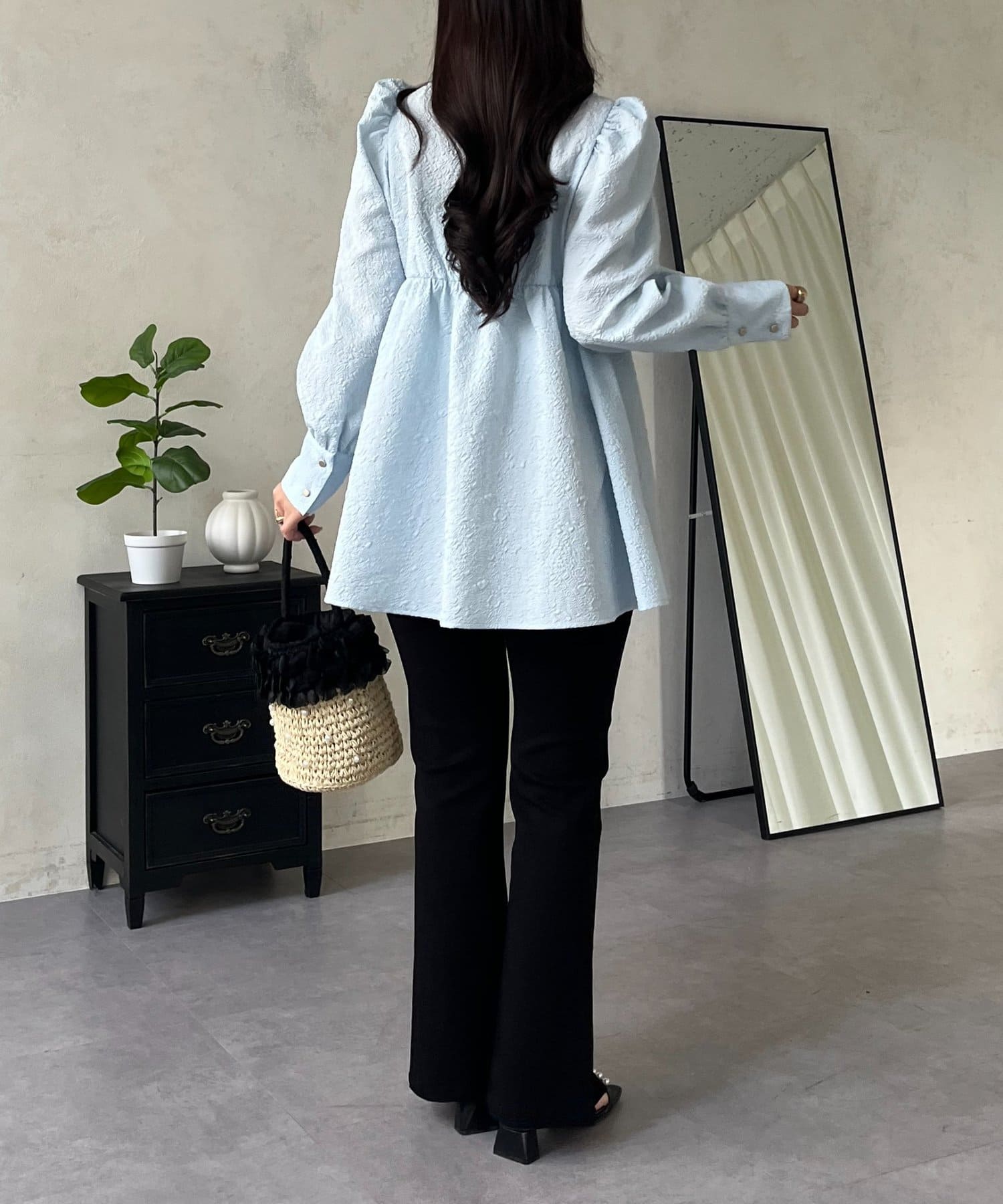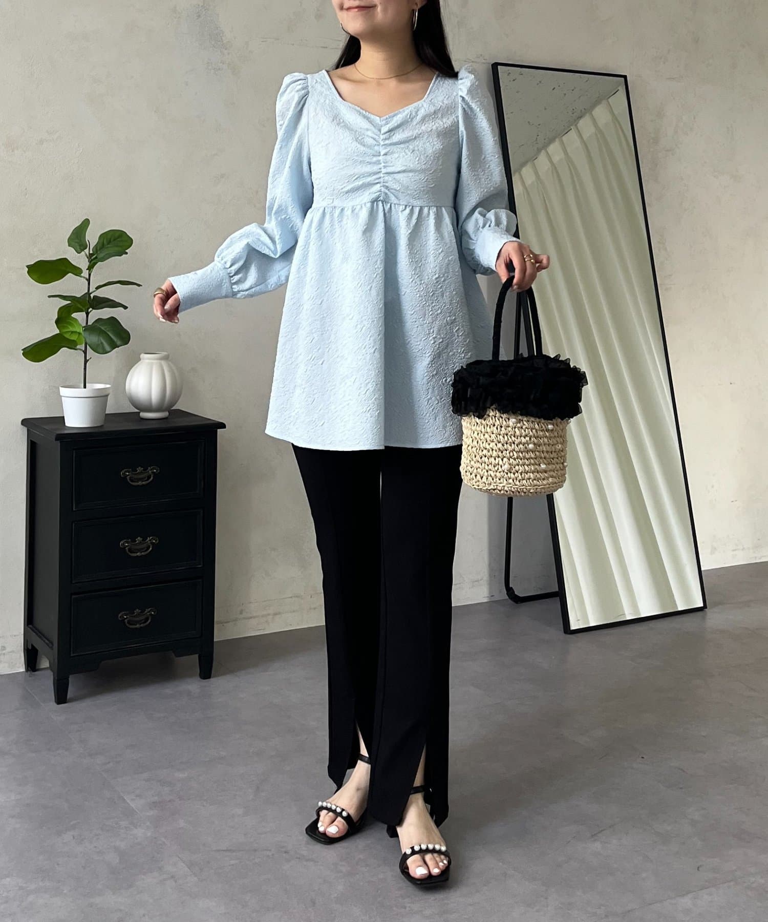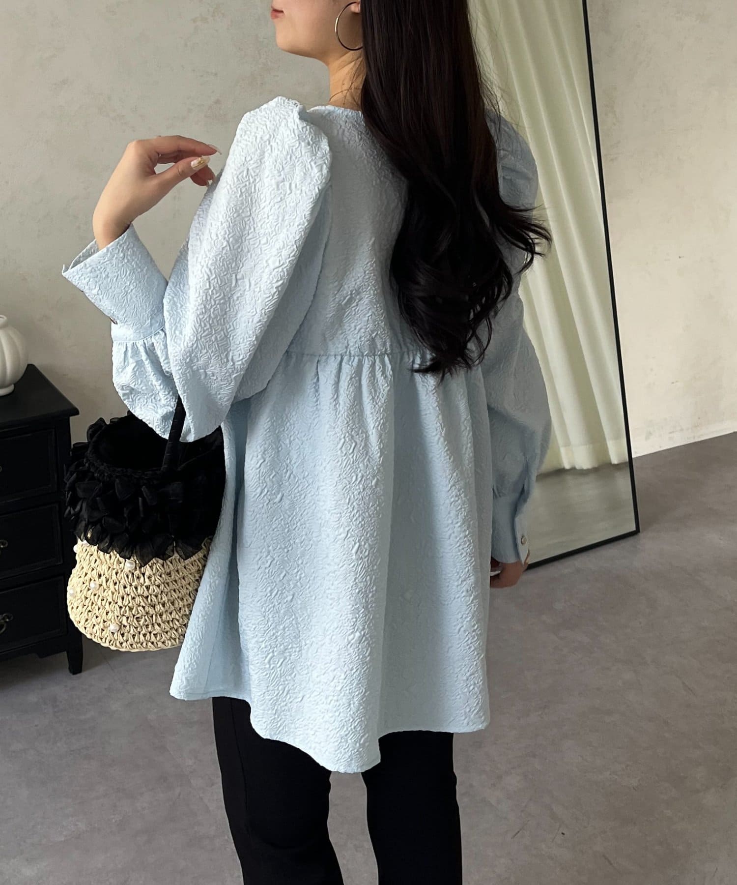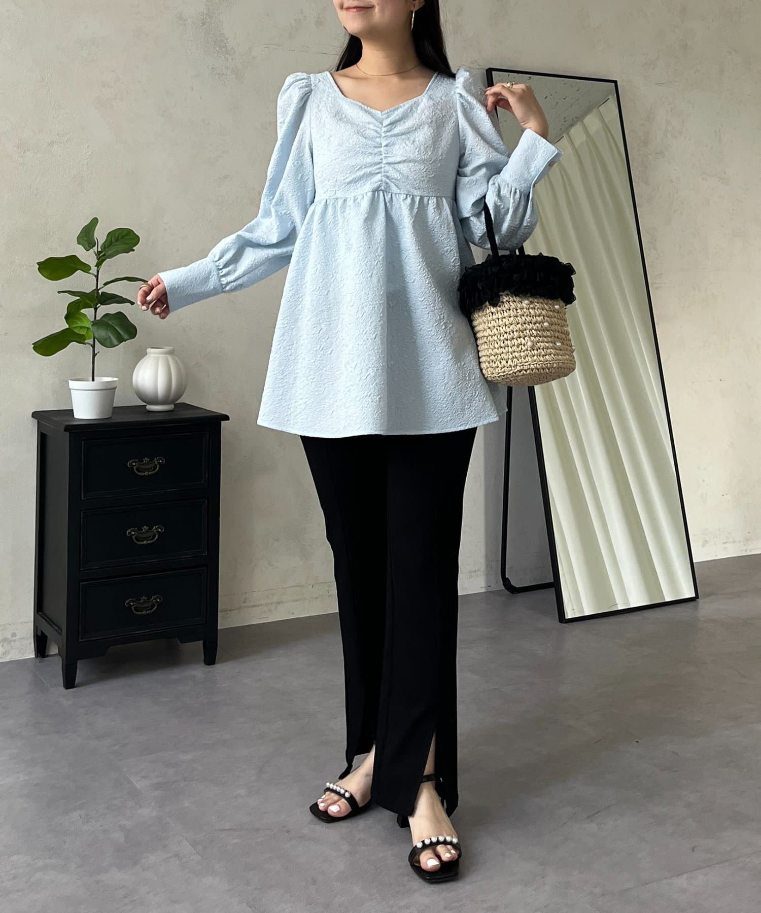 フロントシャーリングパフスリーブジャガードペプラムブラウス