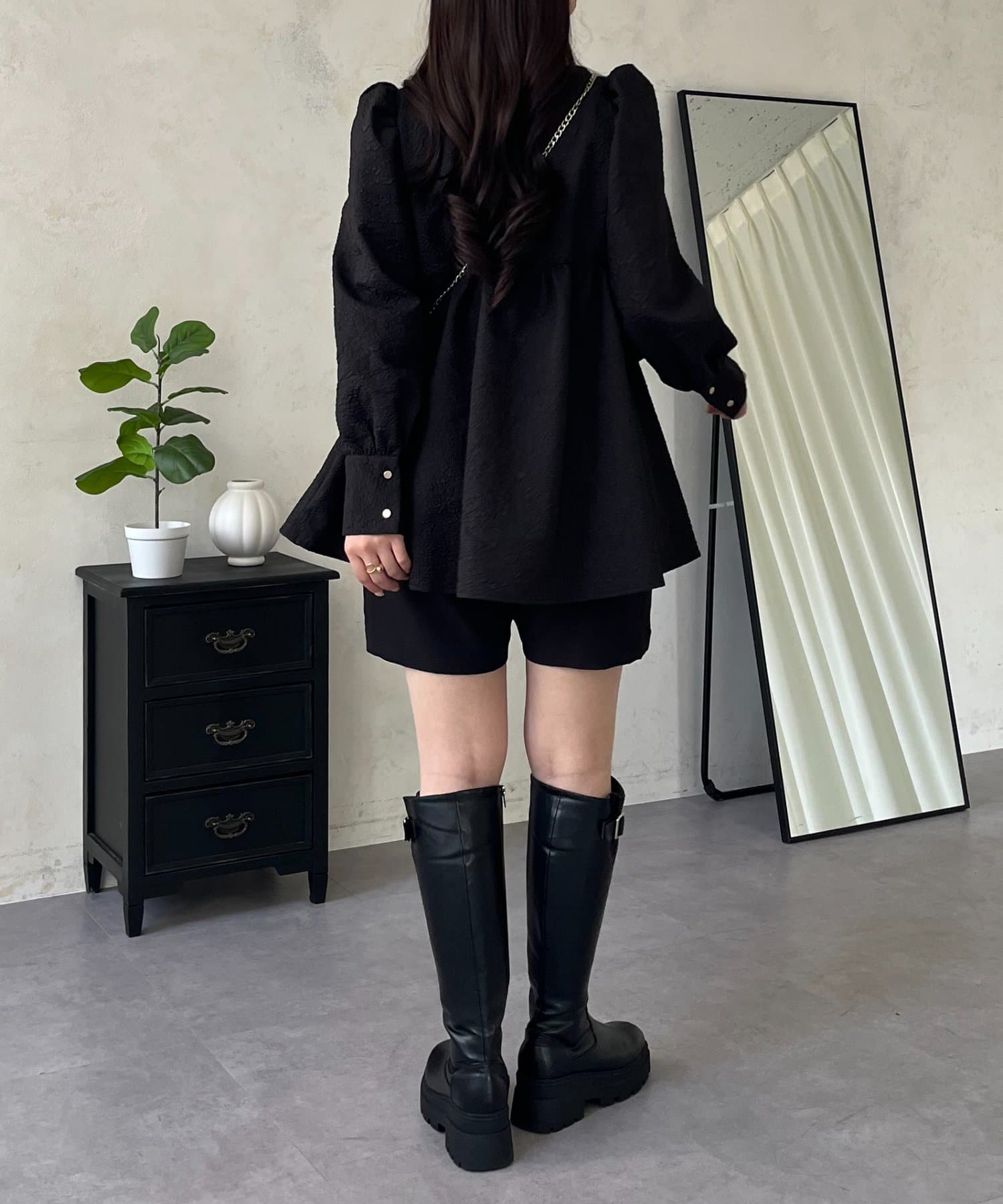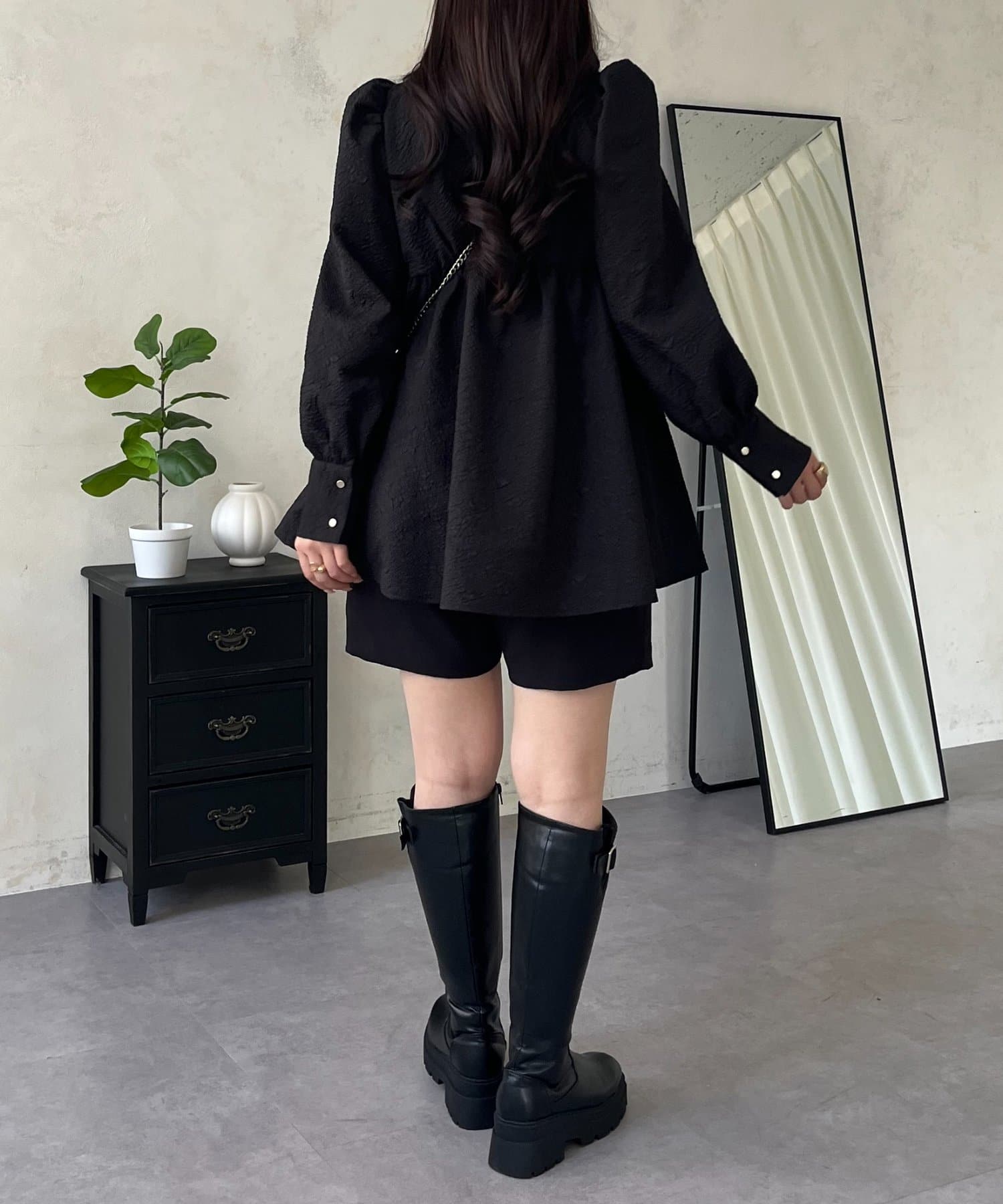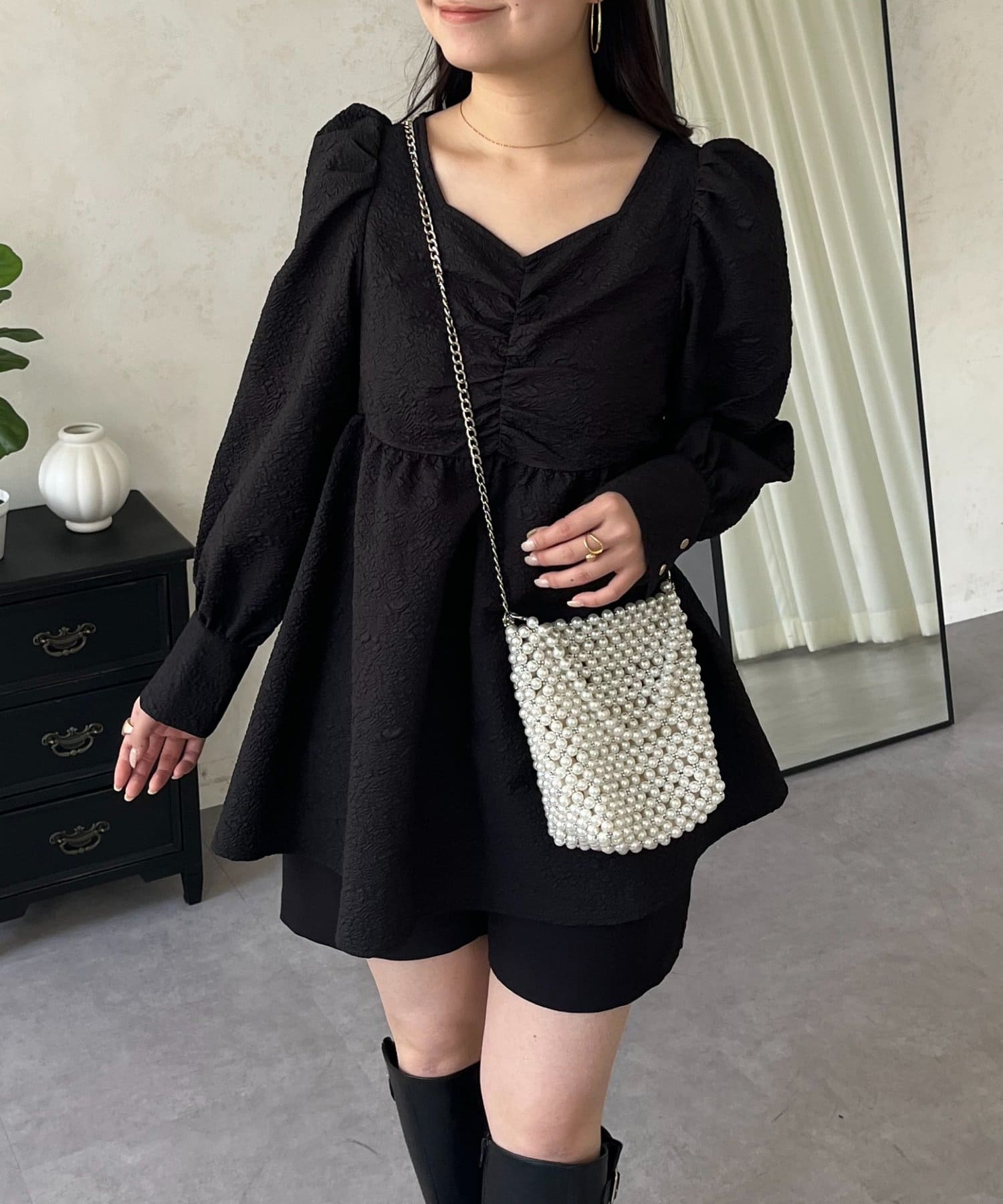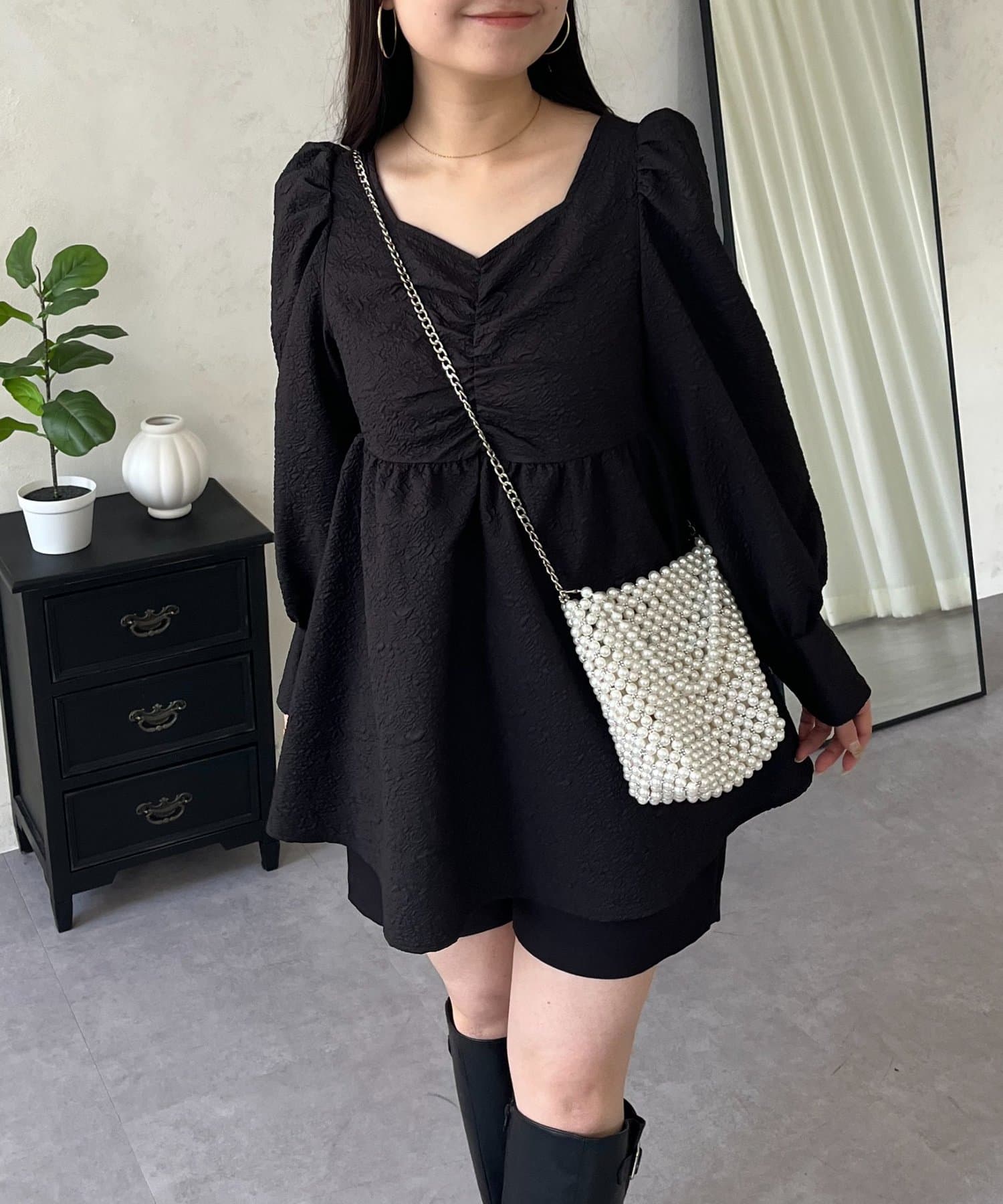 フロントシャーリングパフスリーブジャガードペプラムブラウス