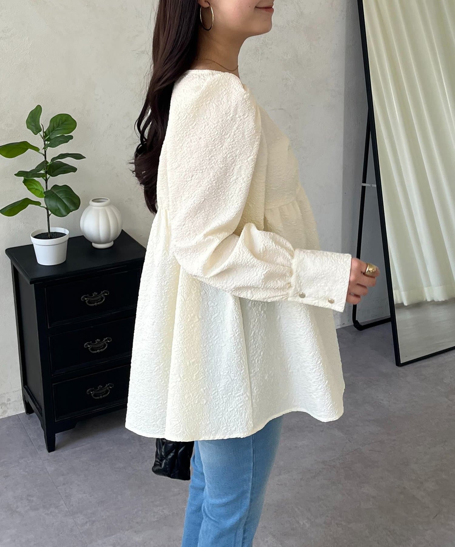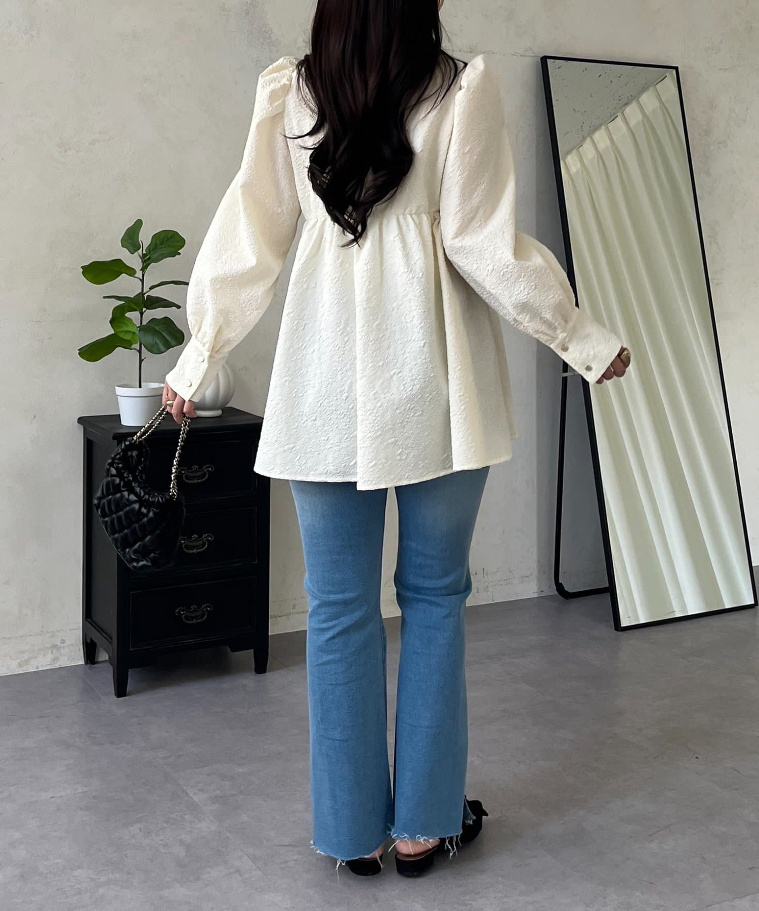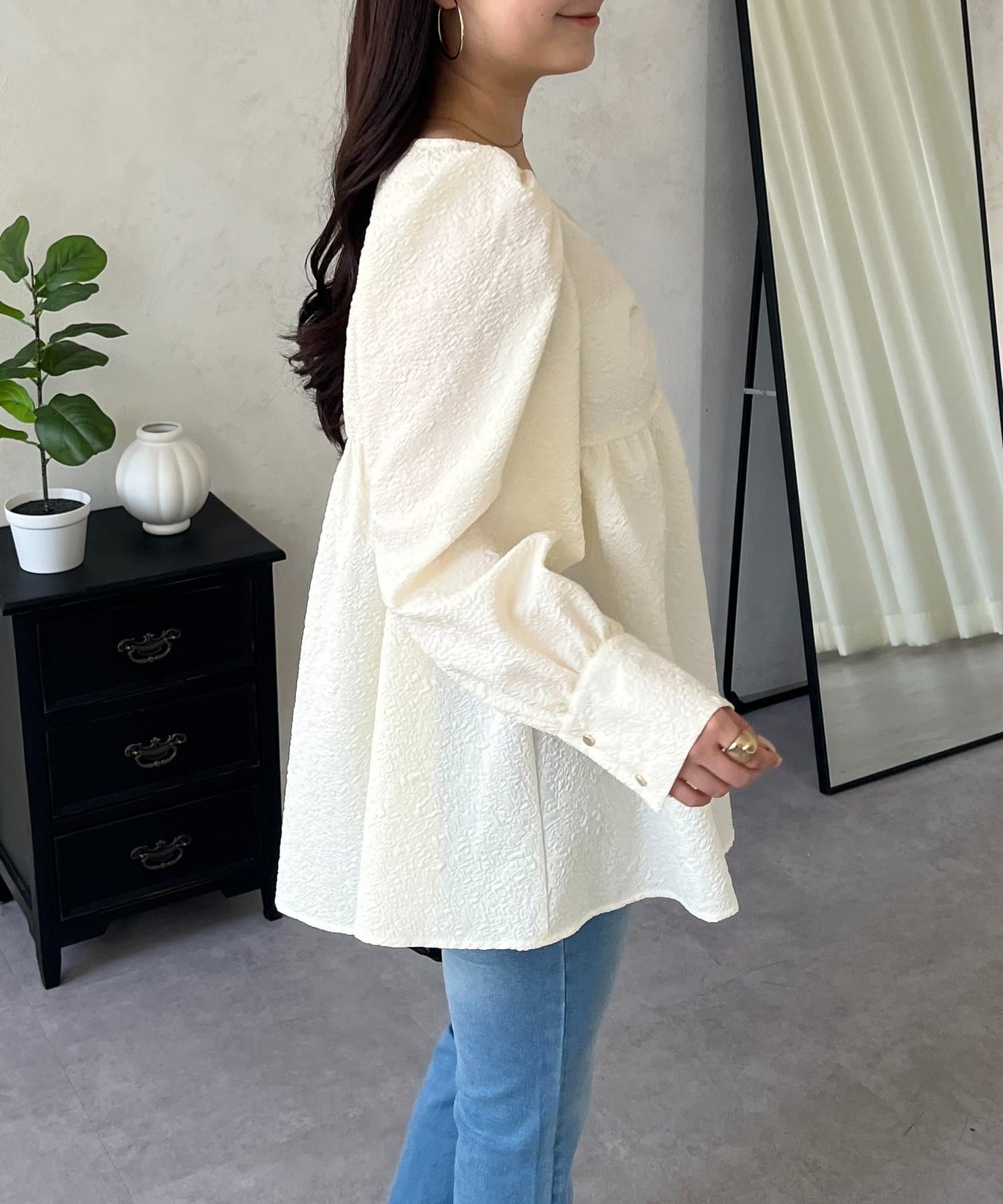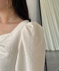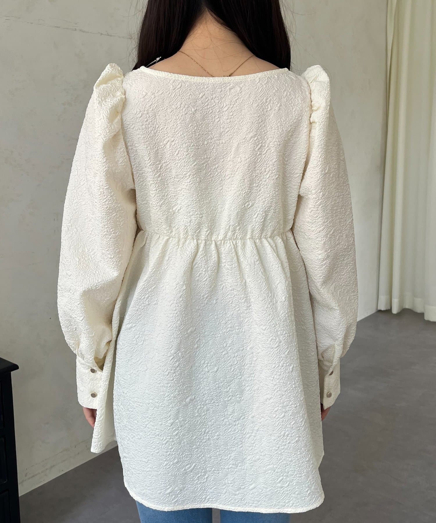• prose verse(プロズヴェール) フロントシャーリングパフスリーブジャガードペプラムブラウス