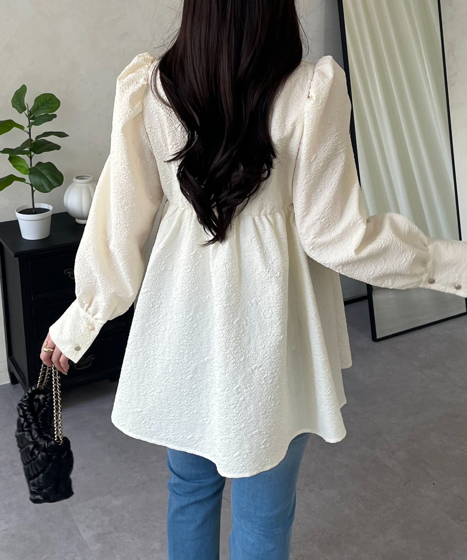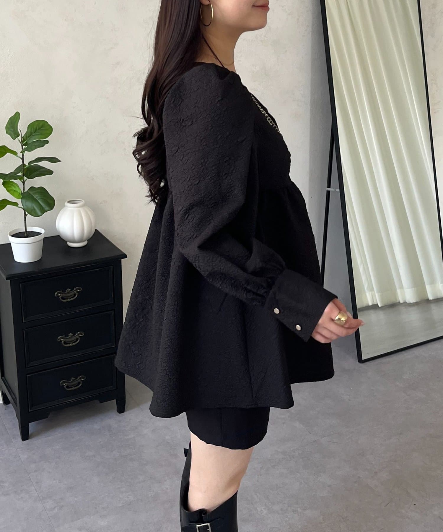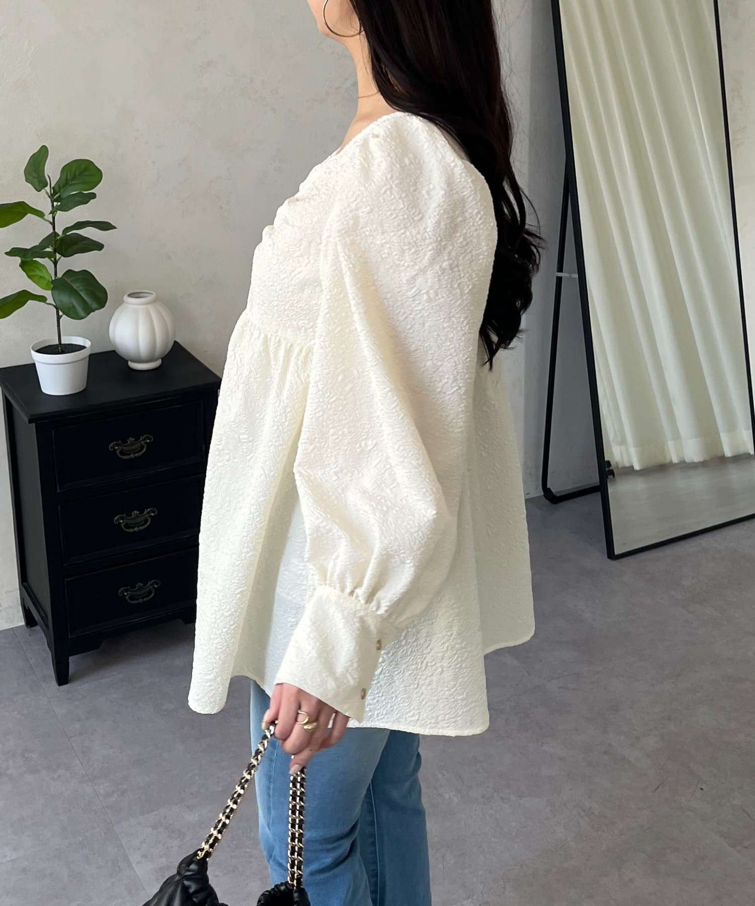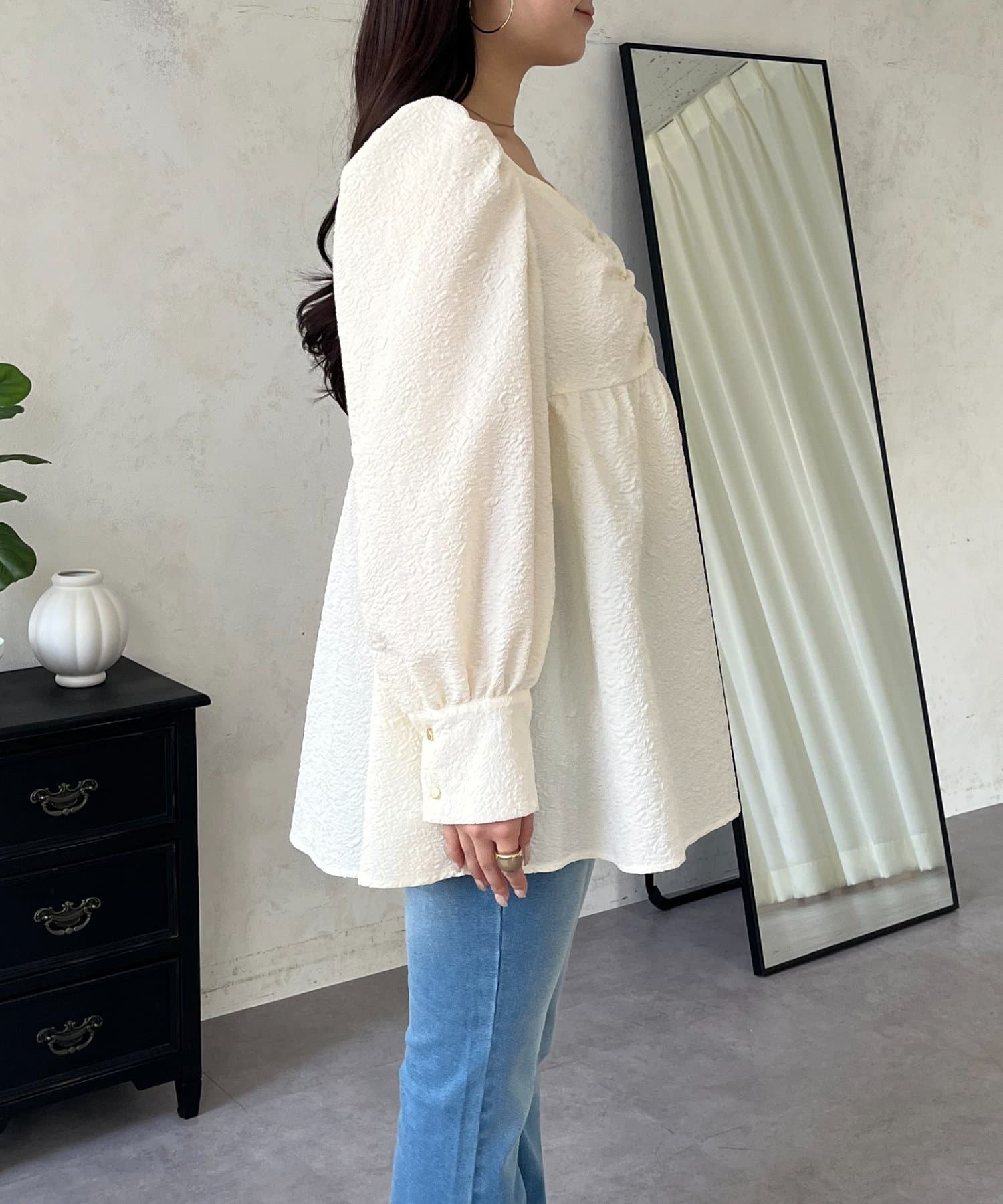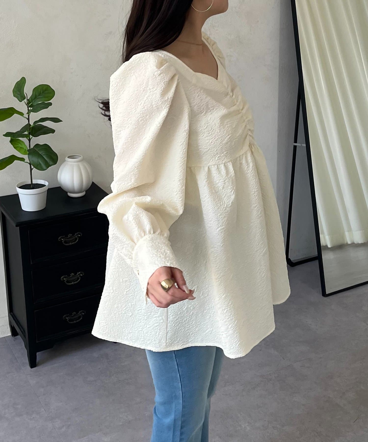 • prose verse(プロズヴェール) フロントシャーリングパフスリーブジャガードペプラムブラウス