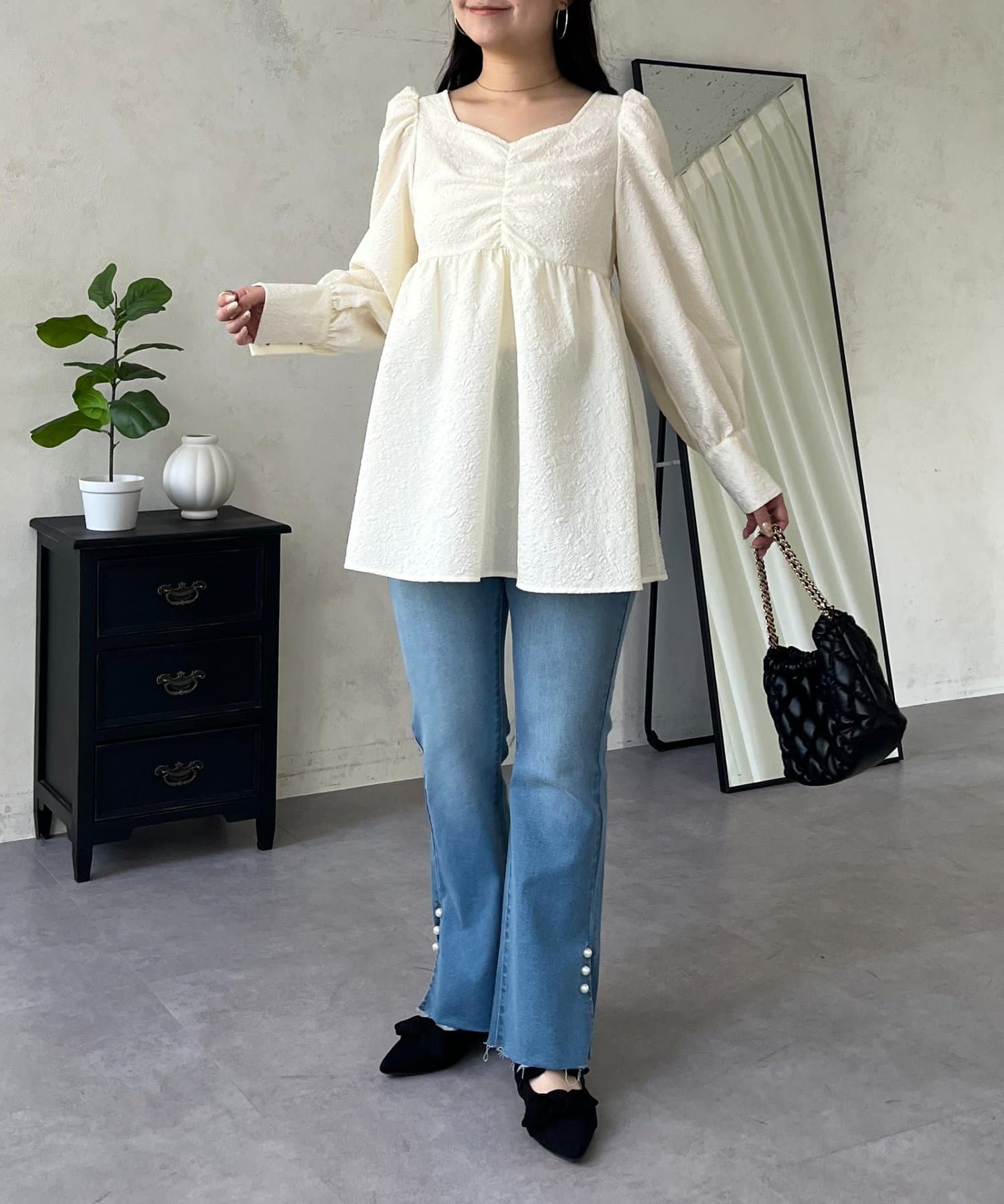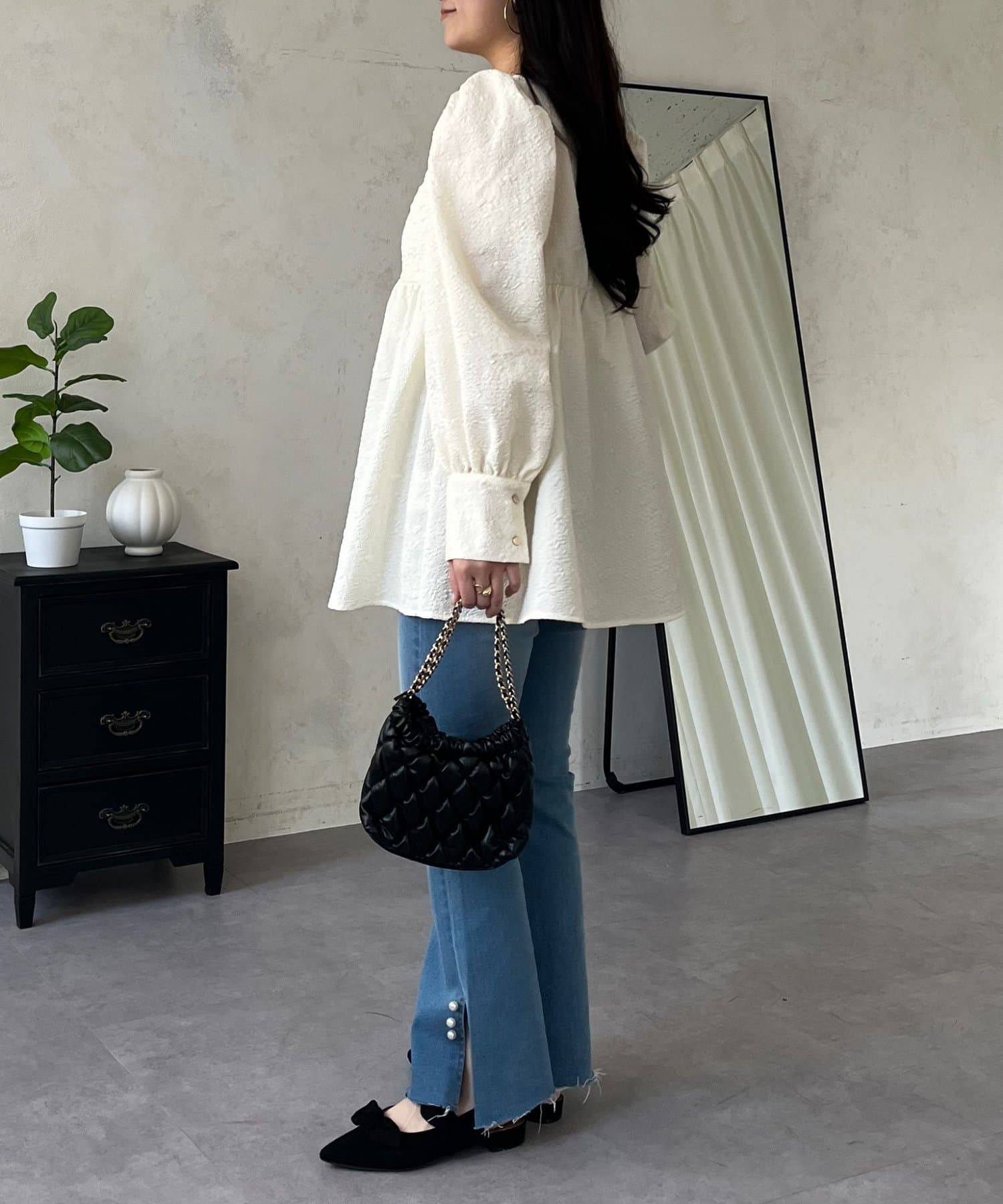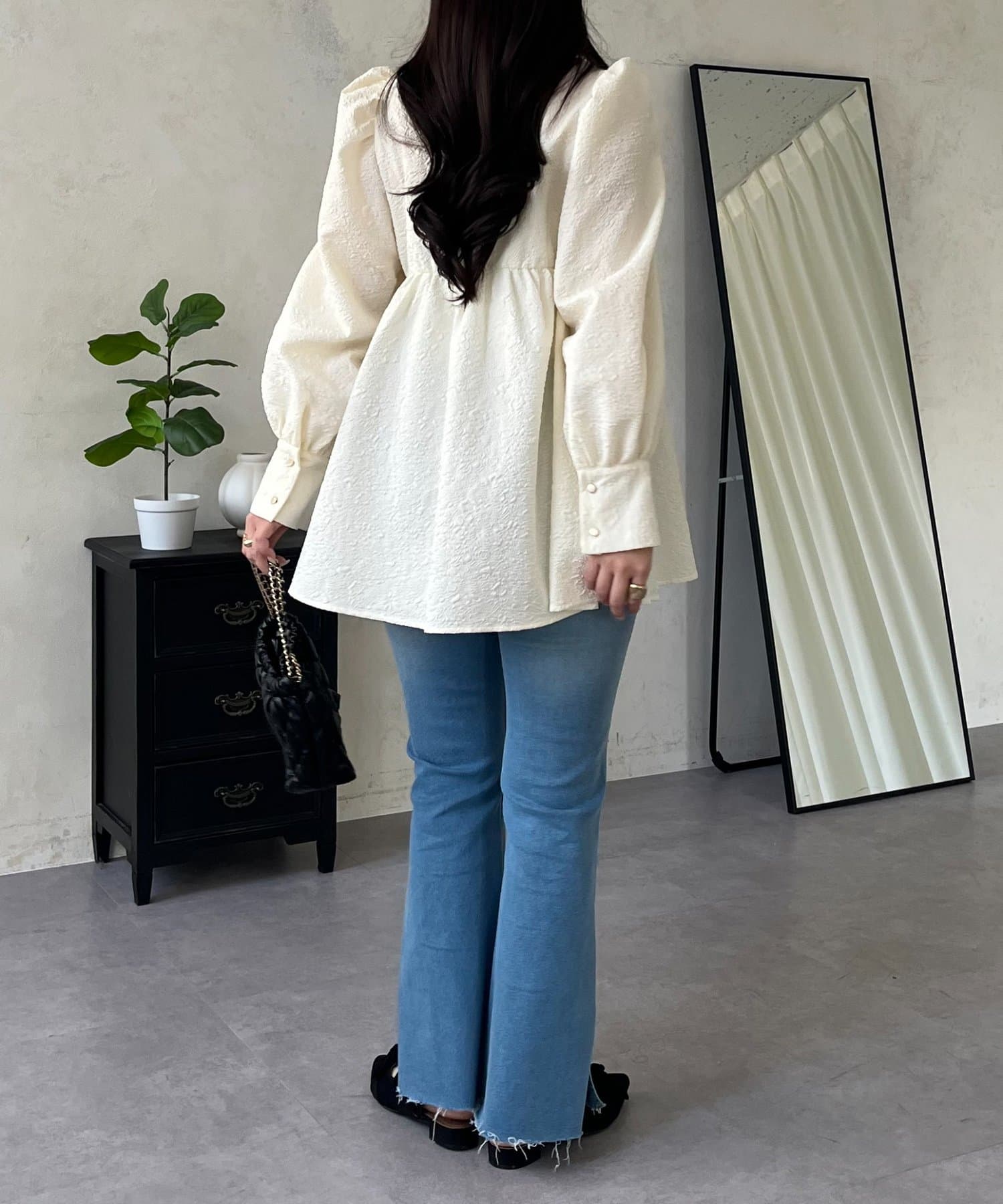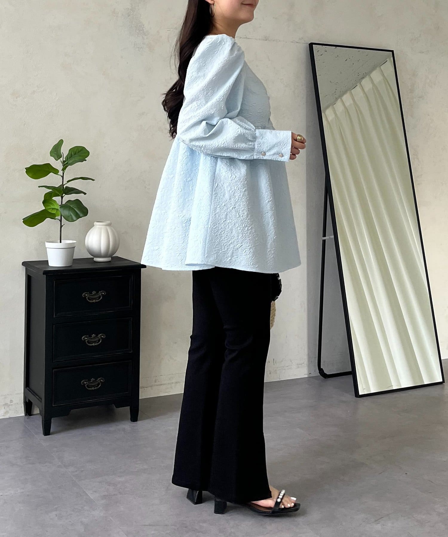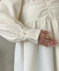 • prose verse(プロズヴェール) フロントシャーリングパフスリーブジャガードペプラムブラウス
