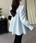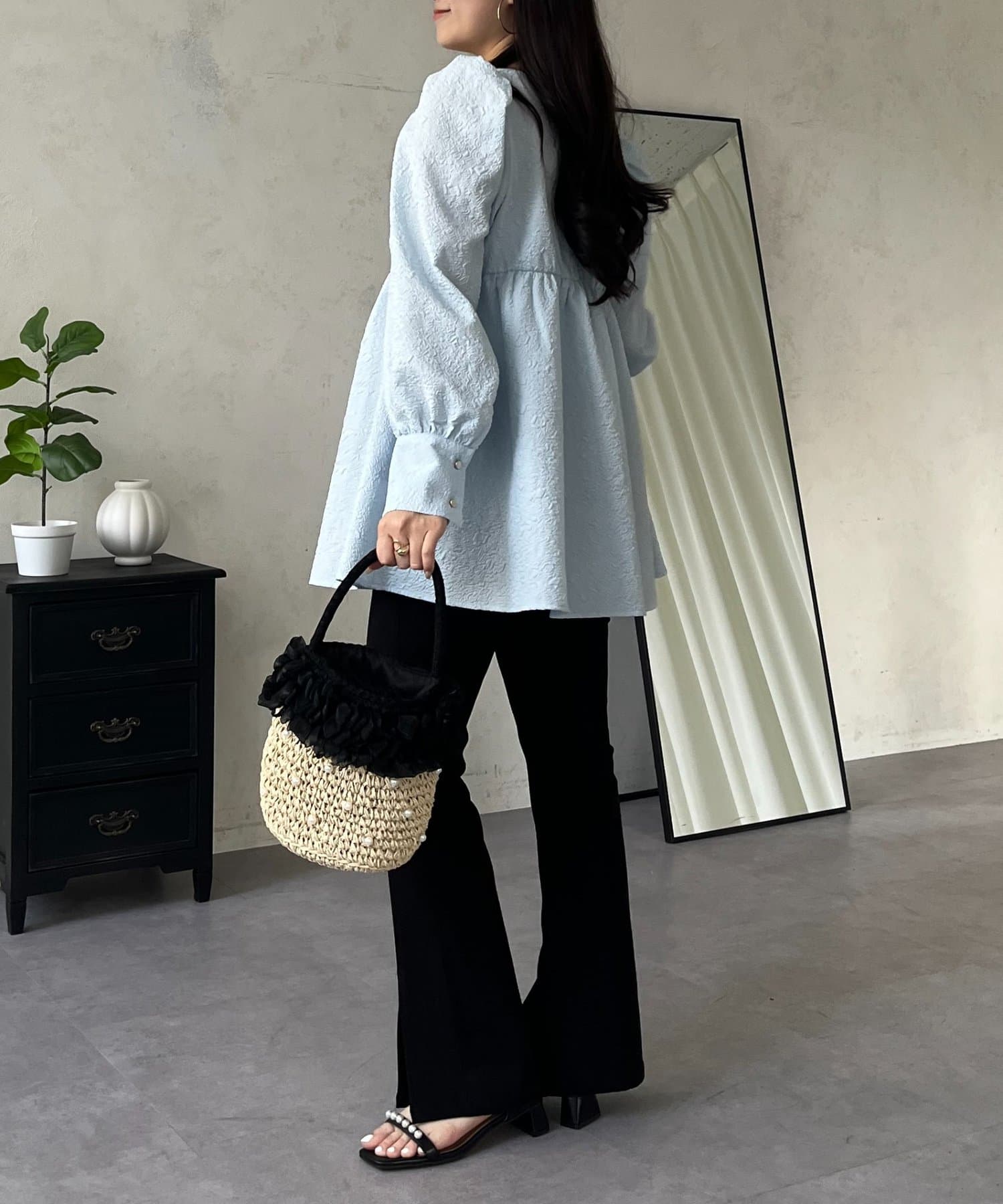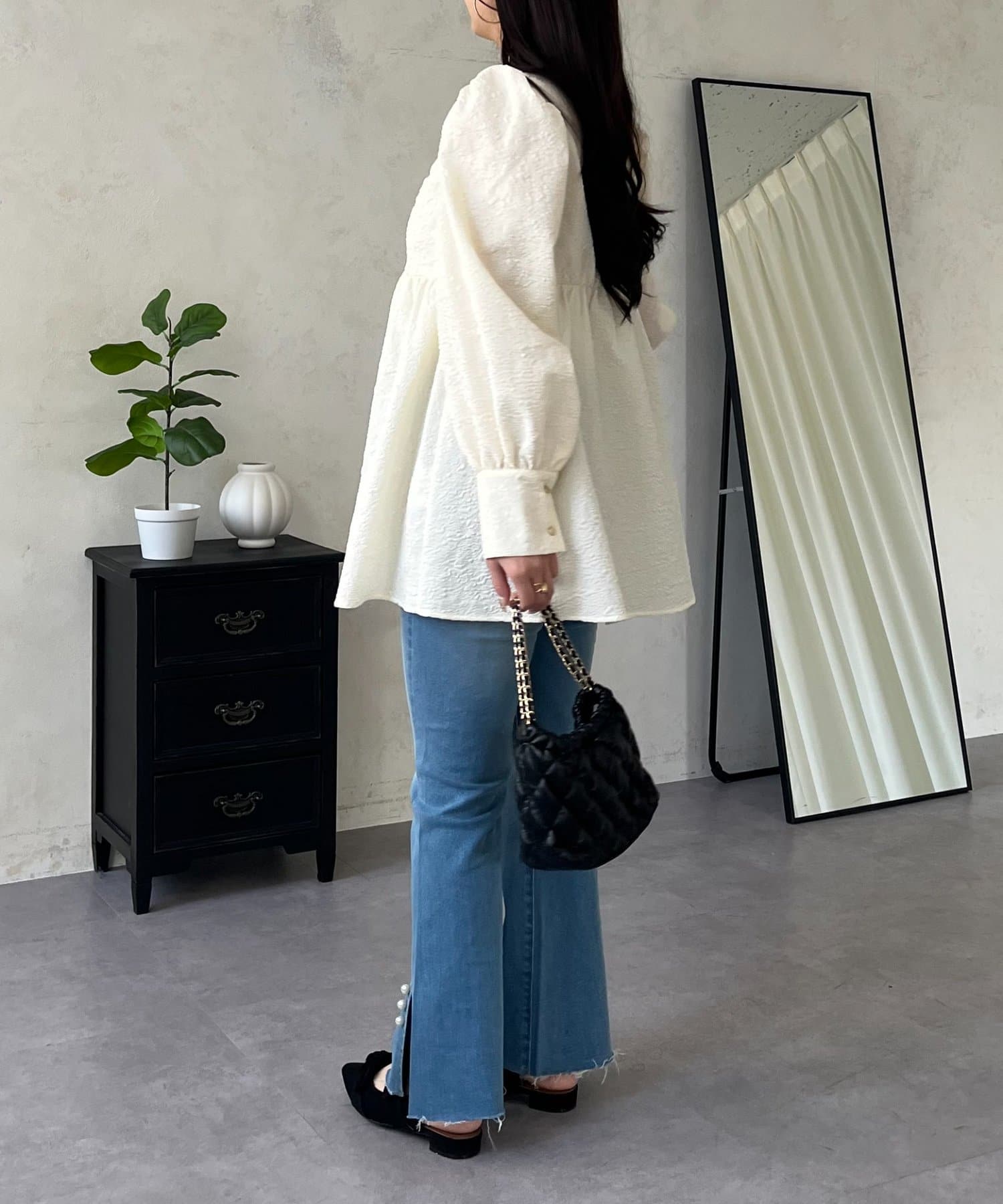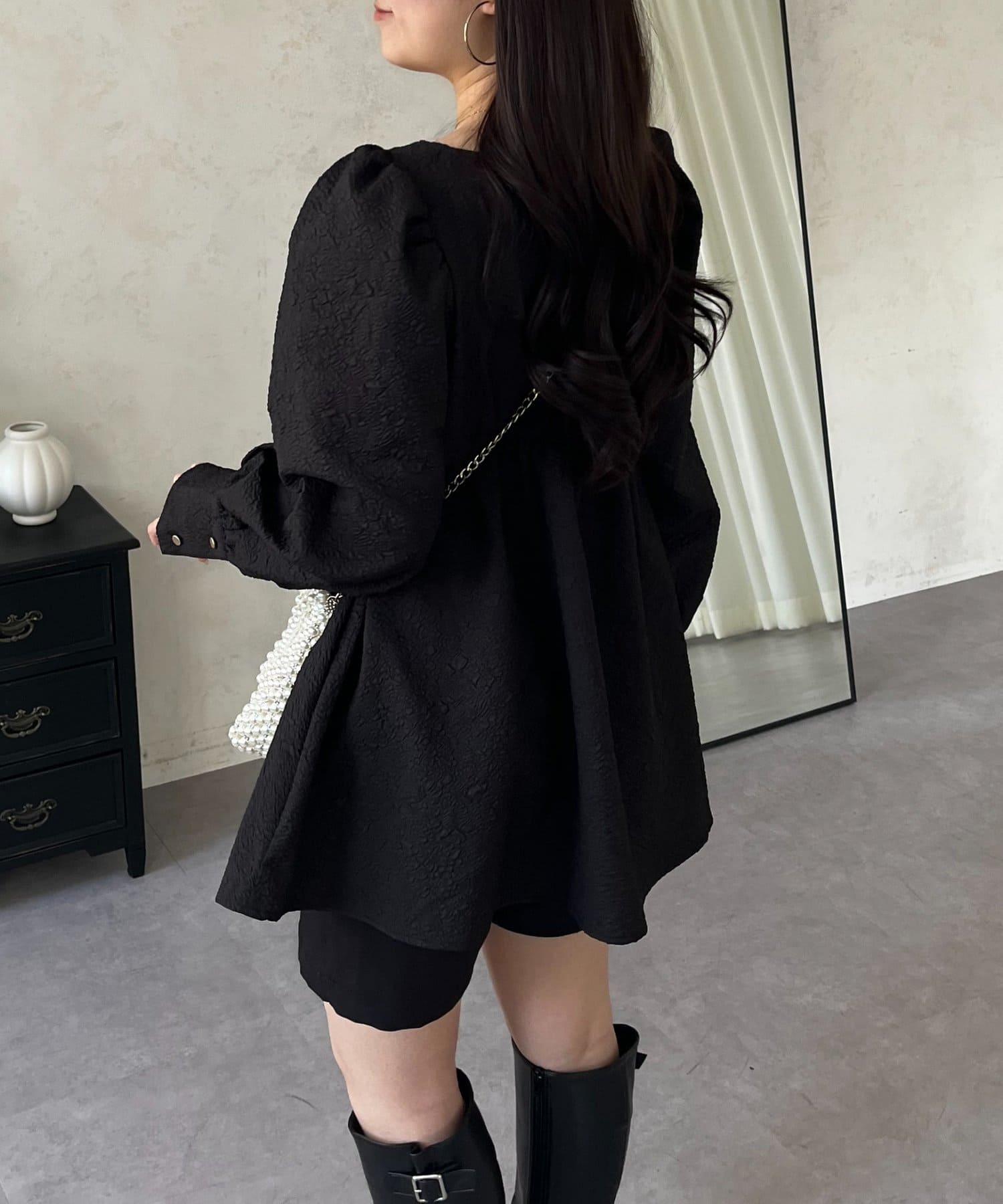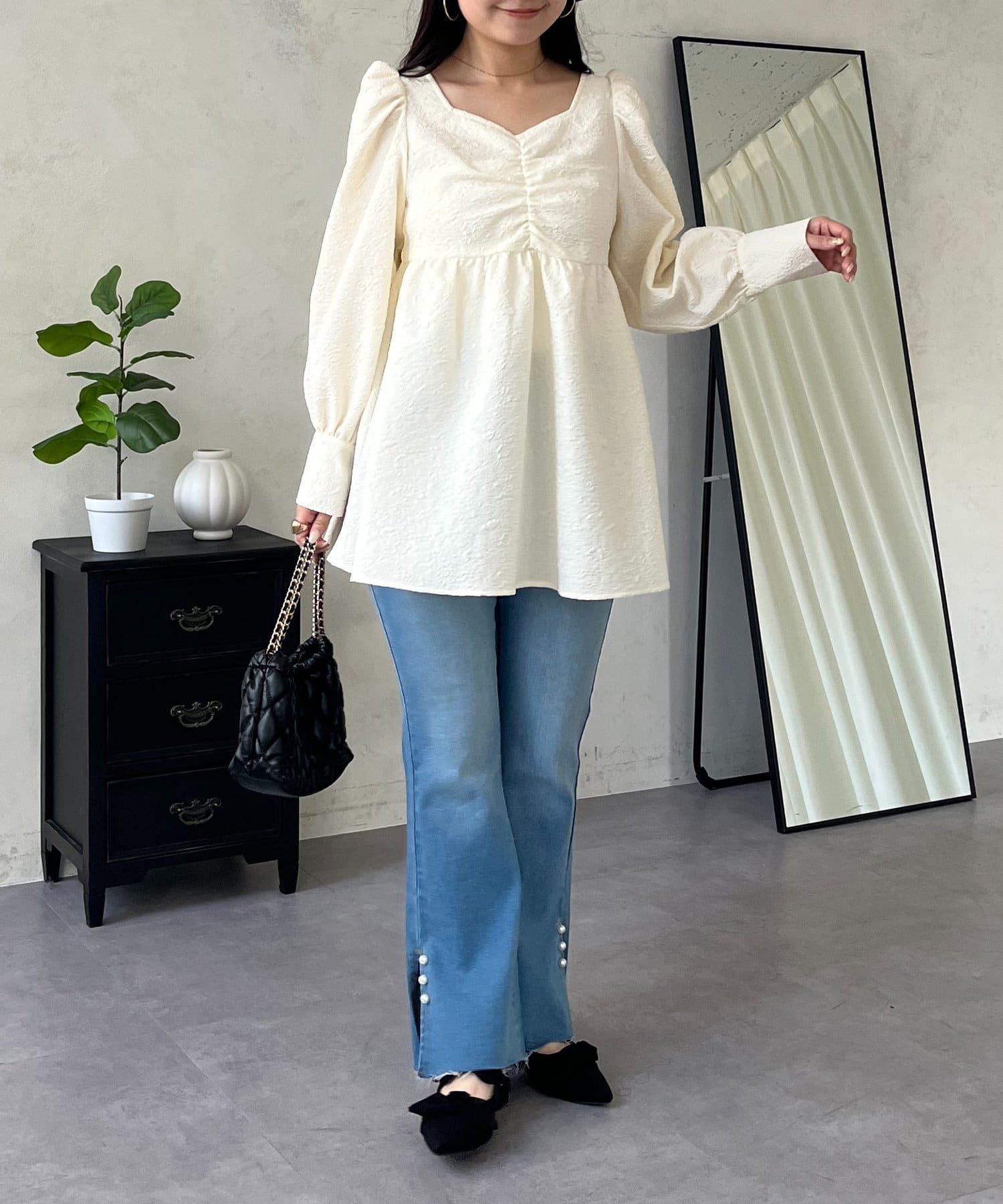• prose verse(プロズヴェール) フロントシャーリングパフスリーブジャガードペプラムブラウス