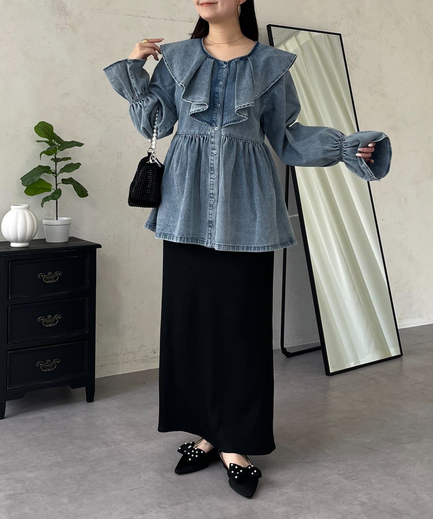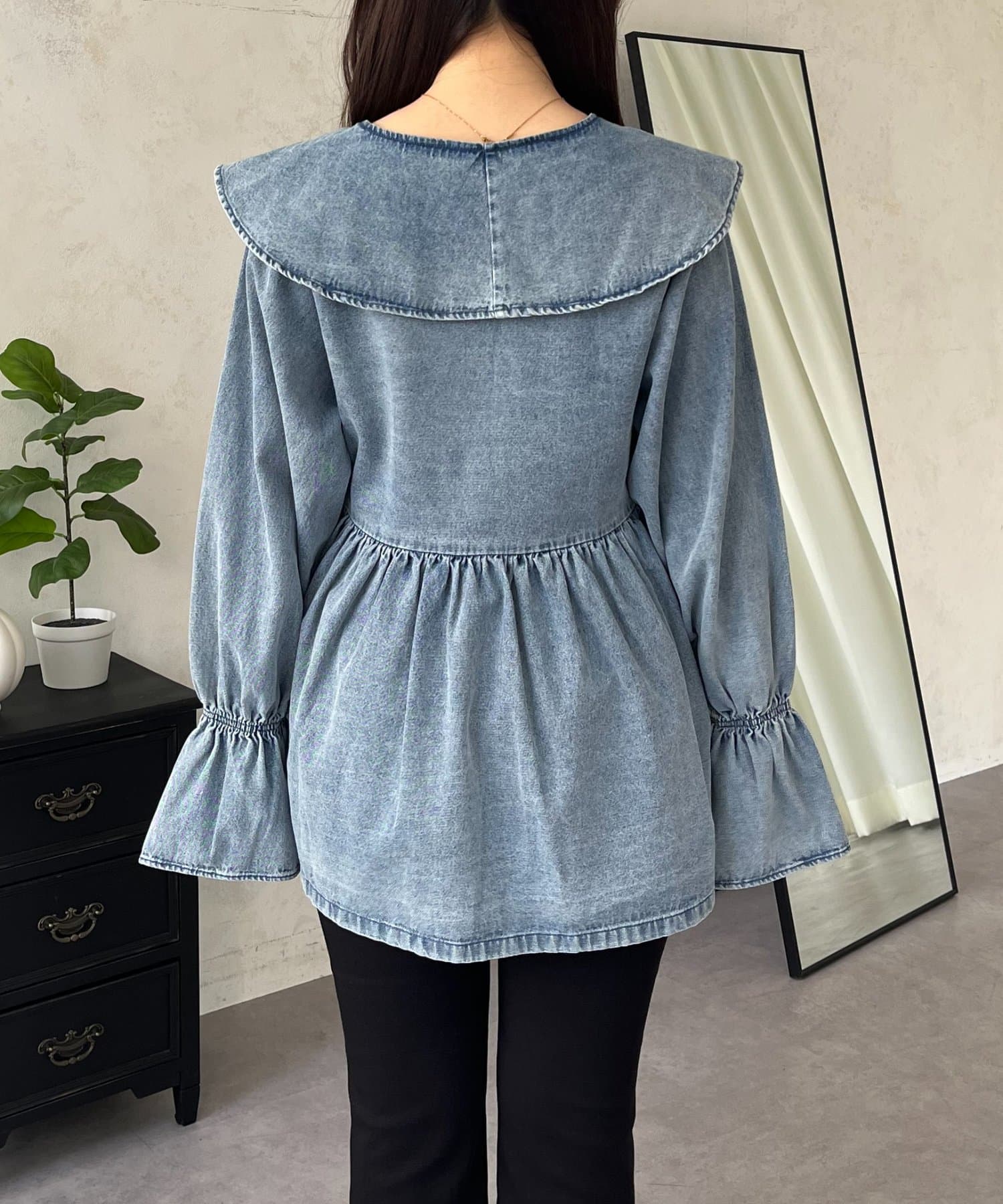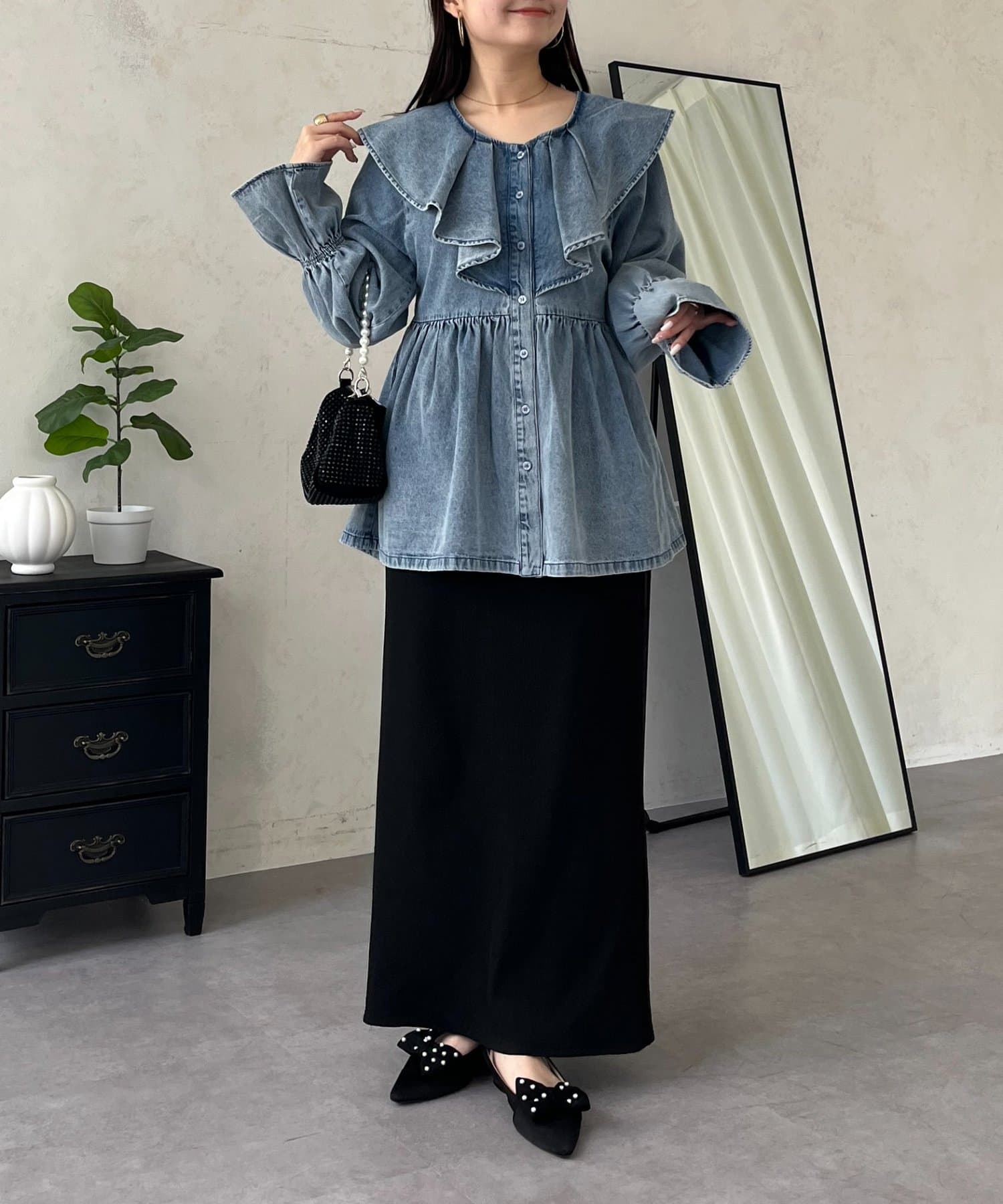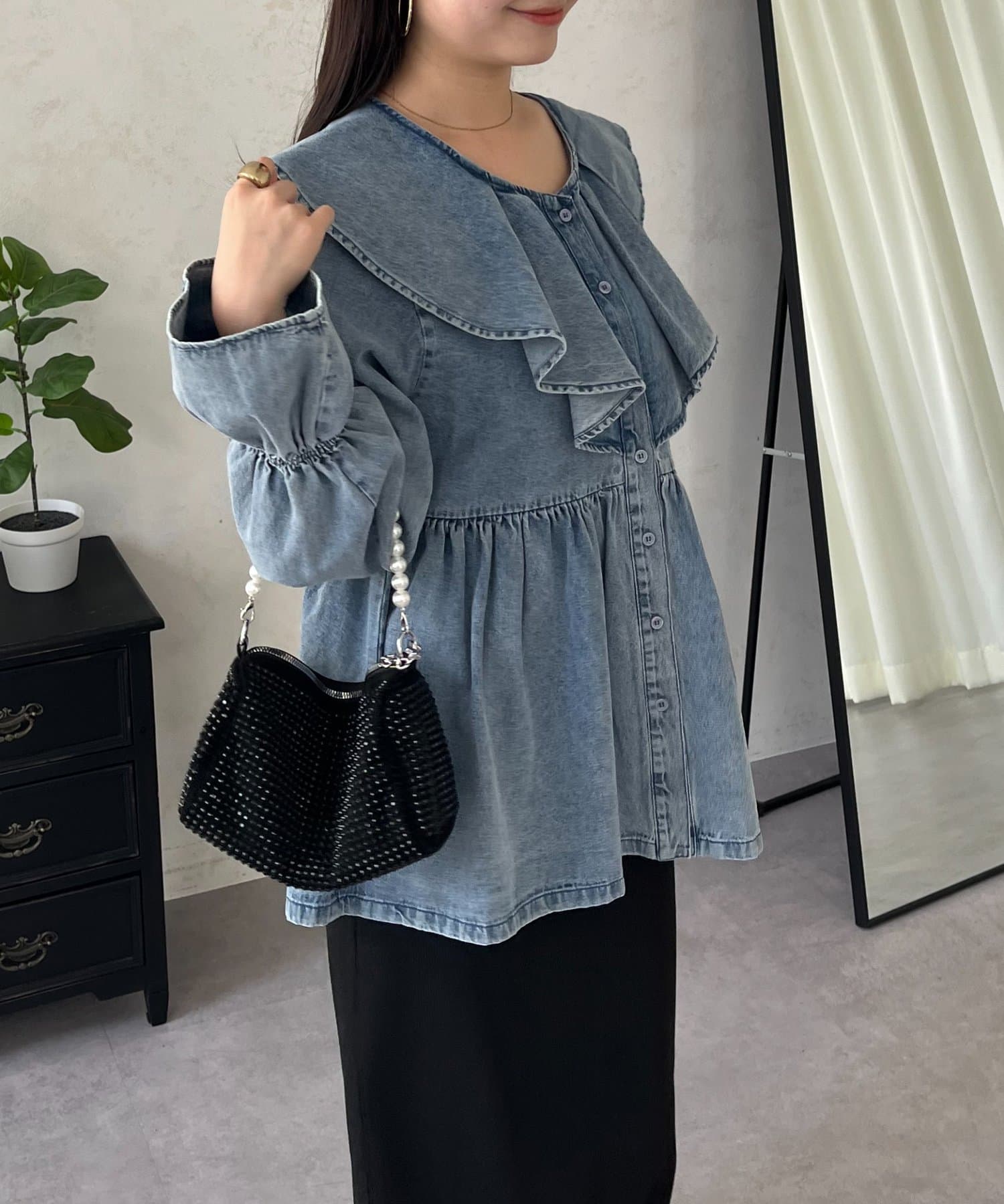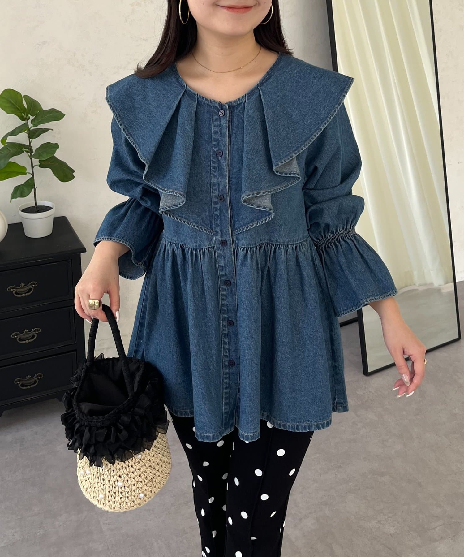 フリルペプラムデニムブラウス