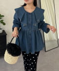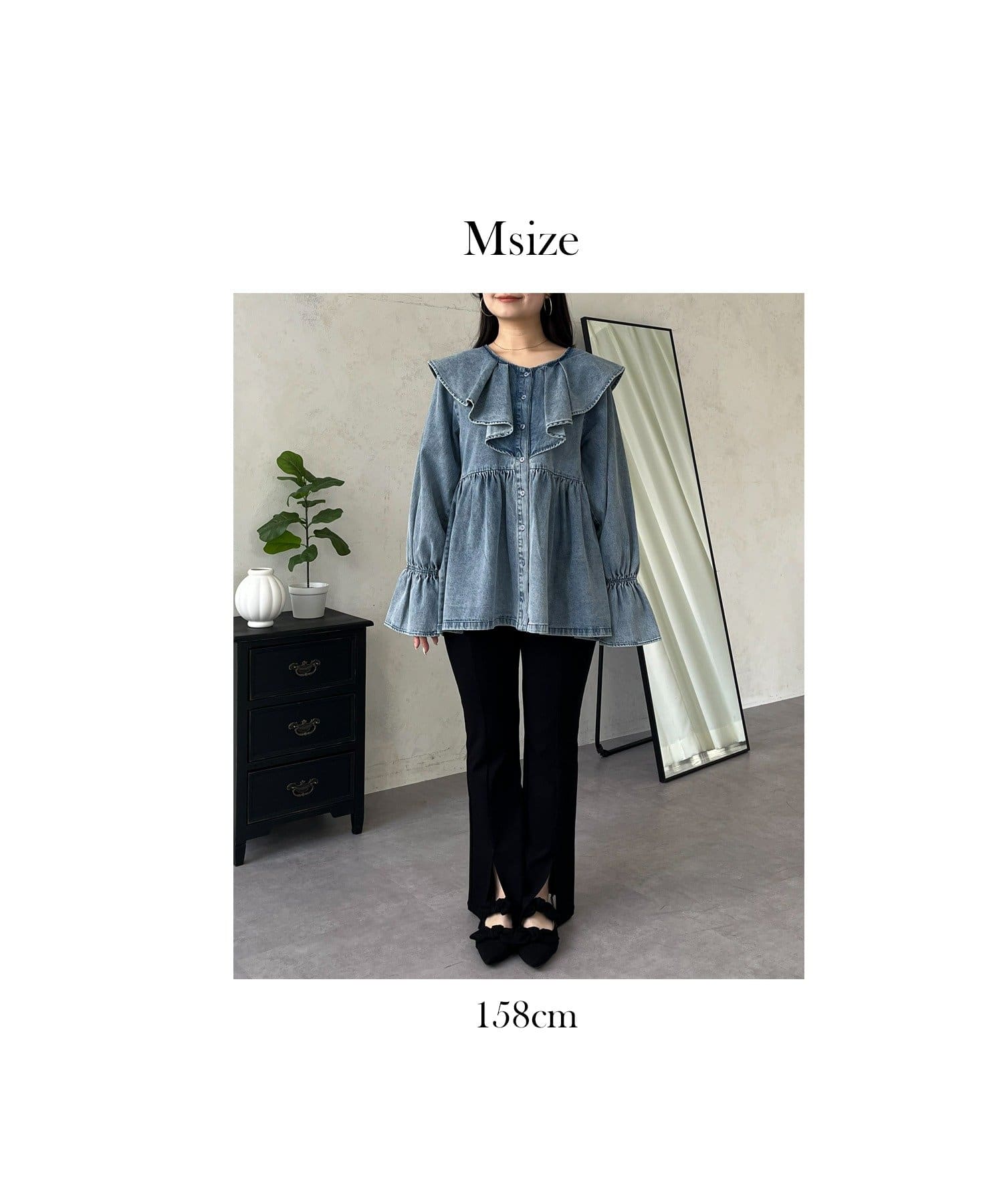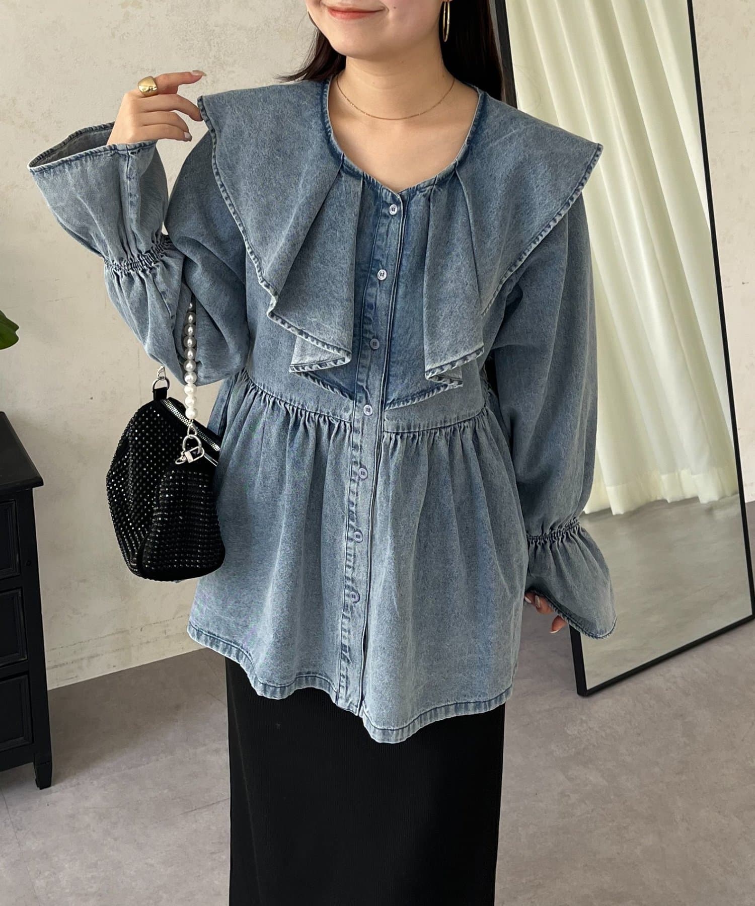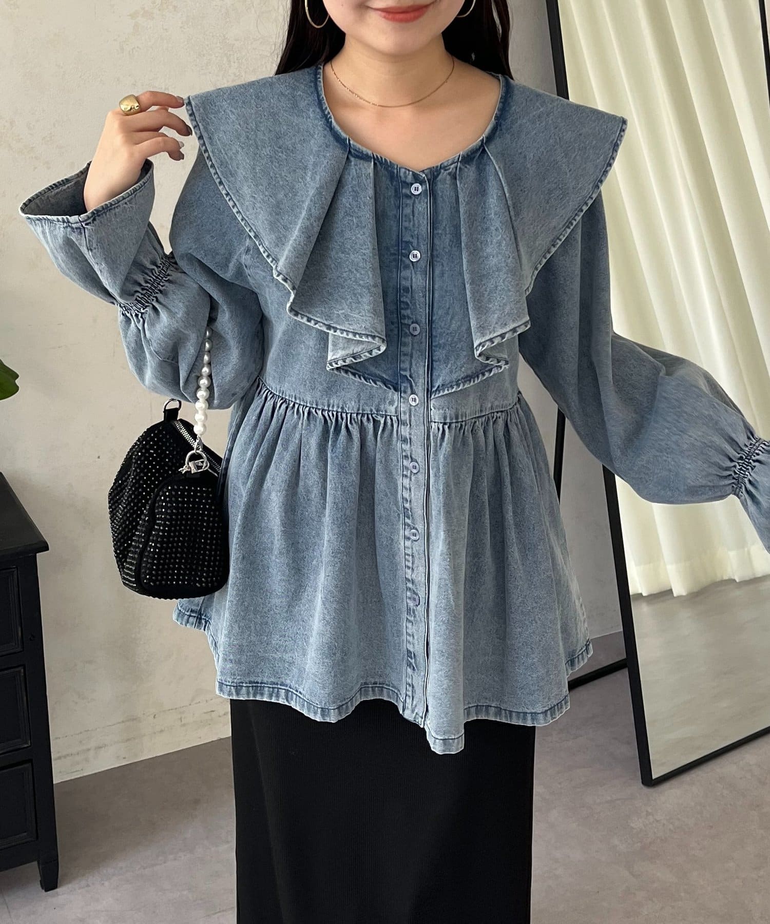 一枚で着映えするフリルペプラムデニムブラウス