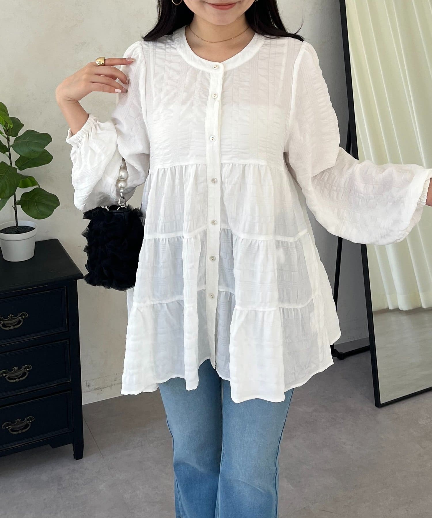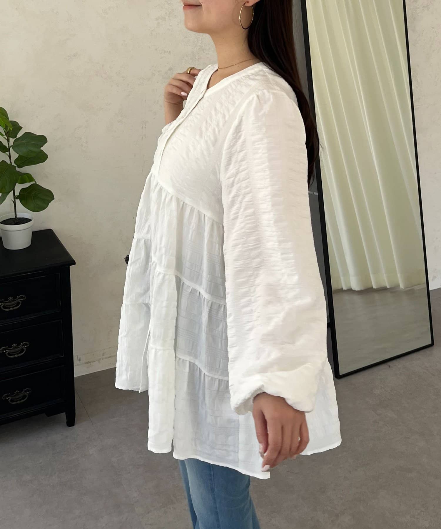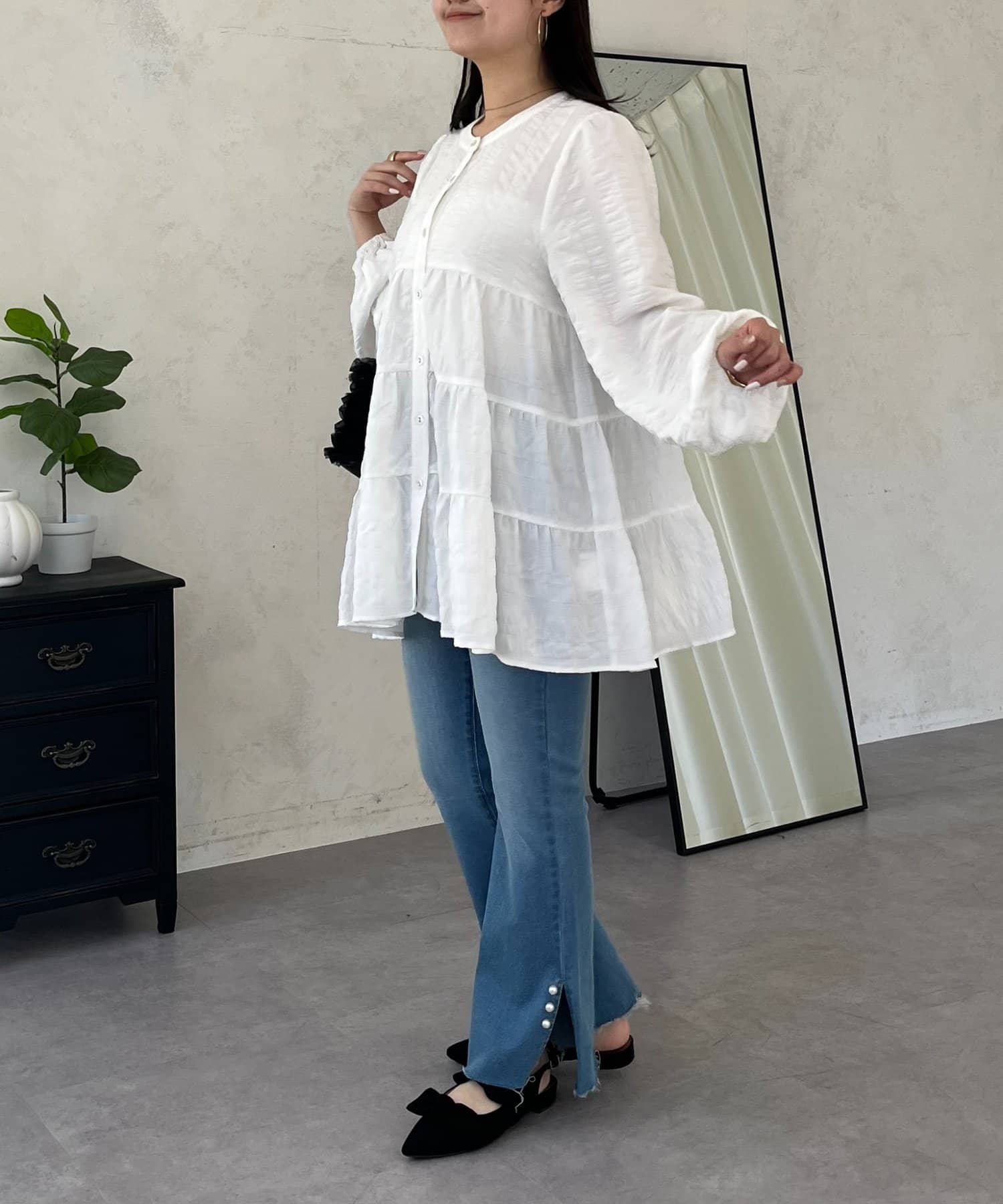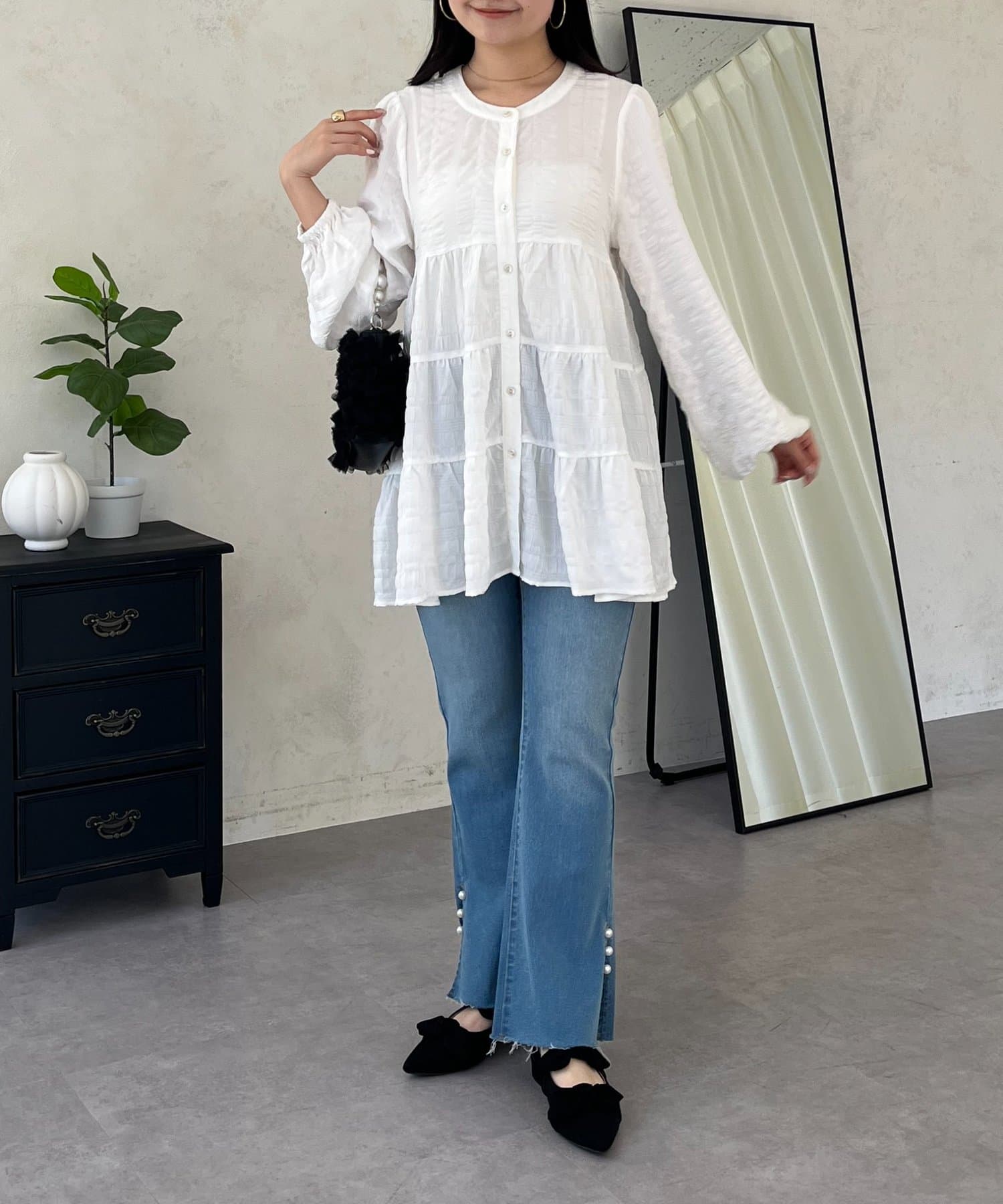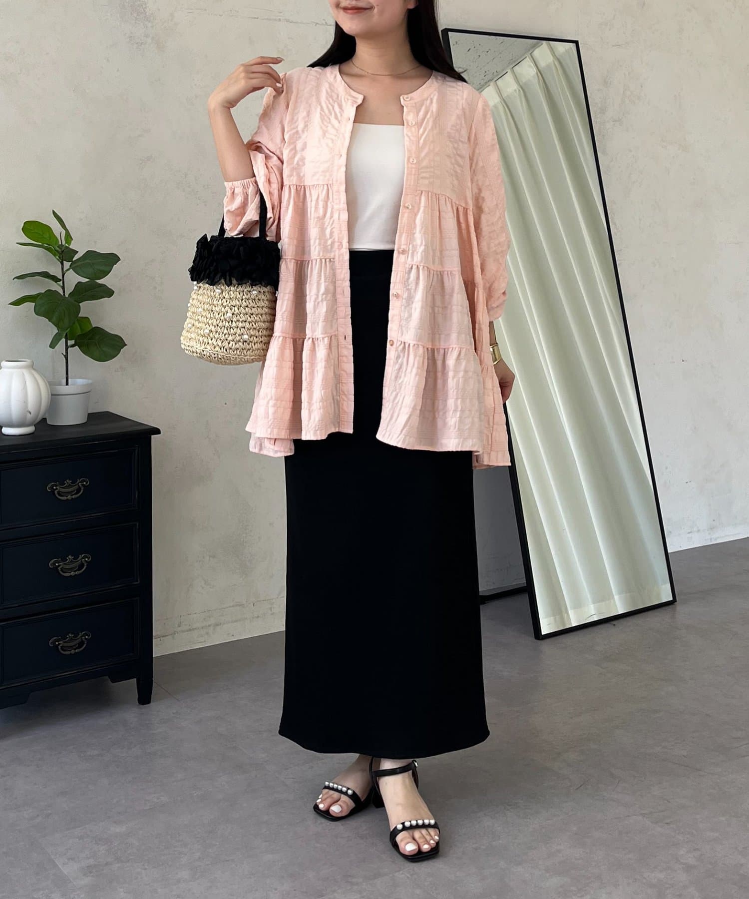 ●ブラウスとしても、羽織リとしても着こなせる、着回し力に優れた1着。