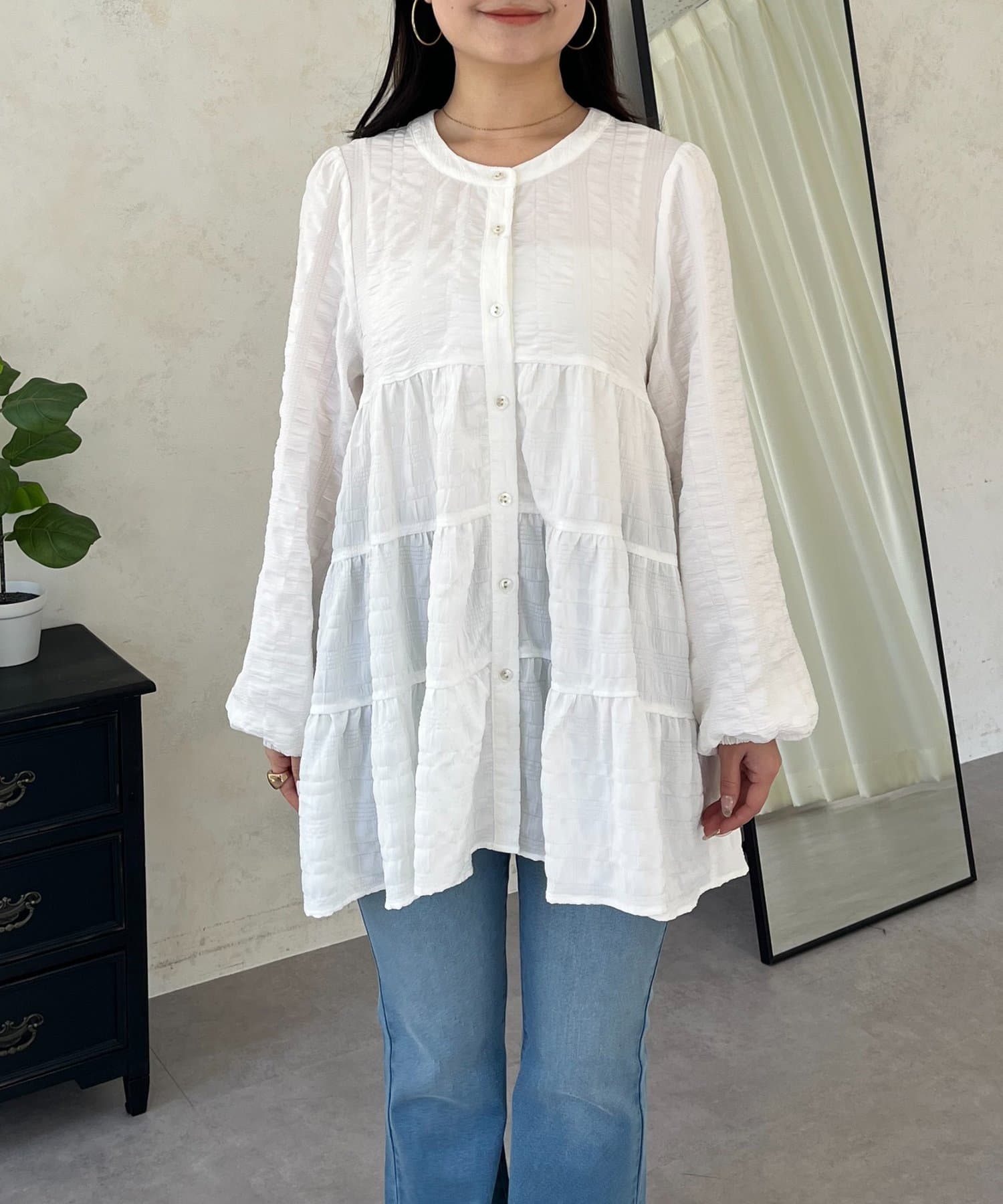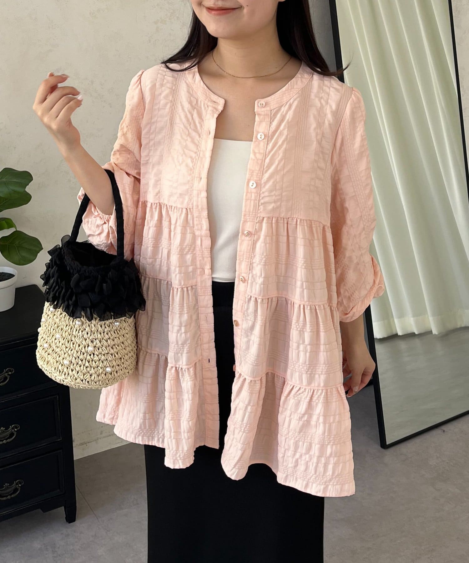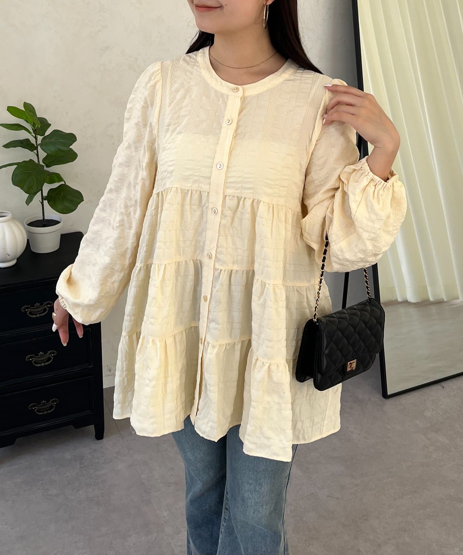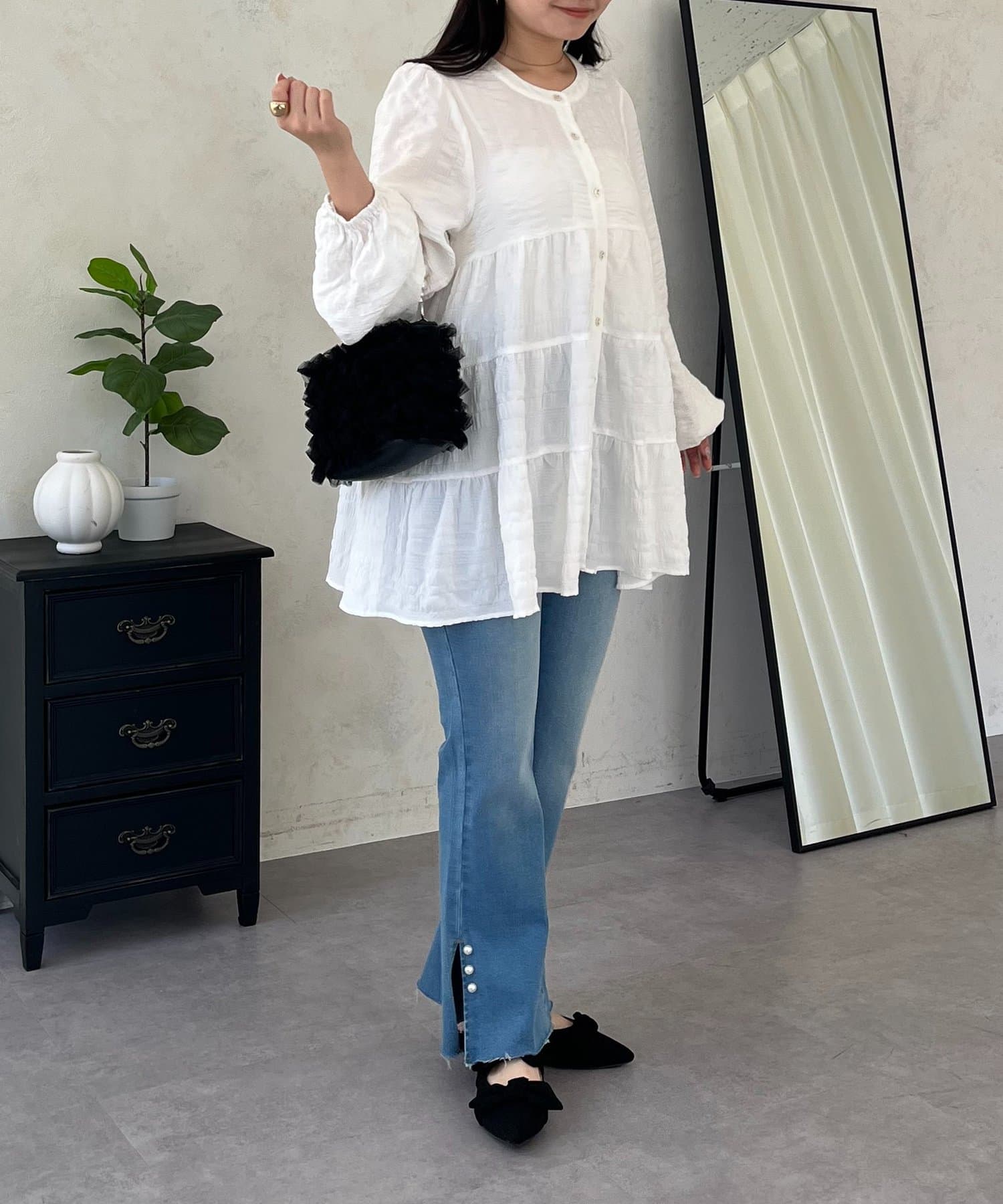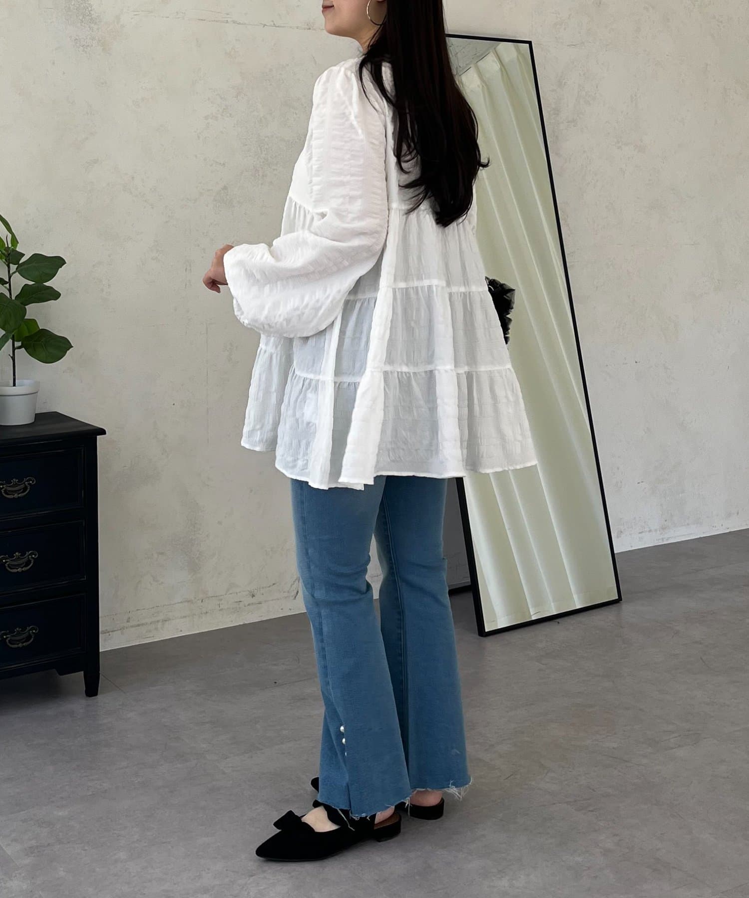 ●ブラウスとしても、羽織リとしても着こなせる、着回し力に優れた1着。