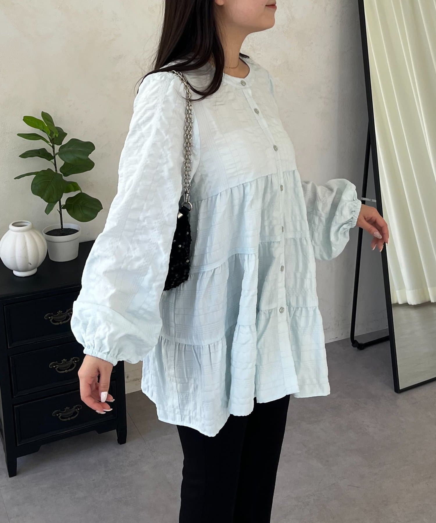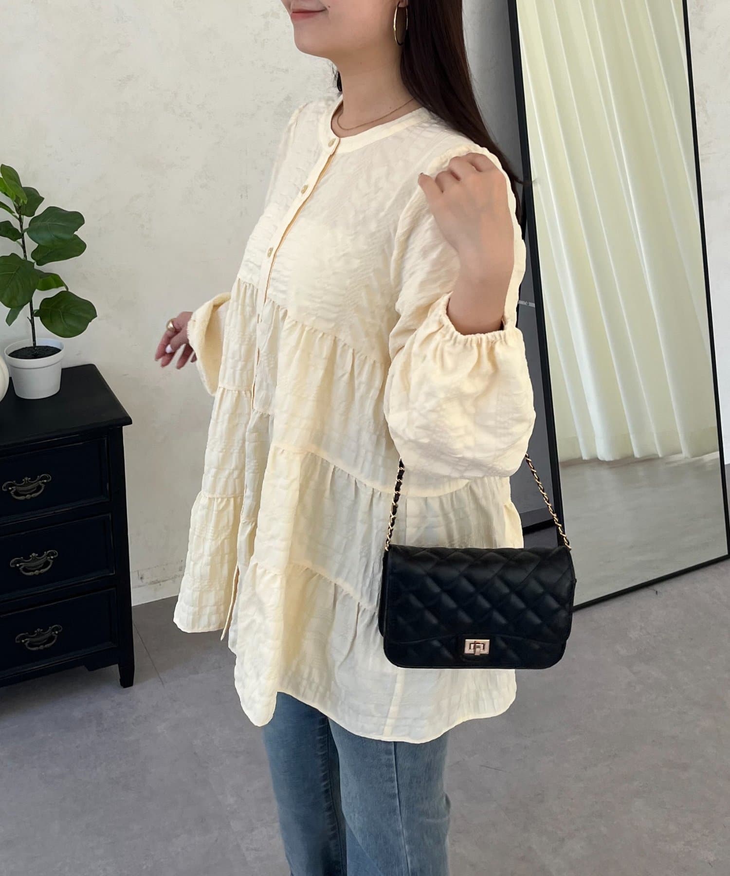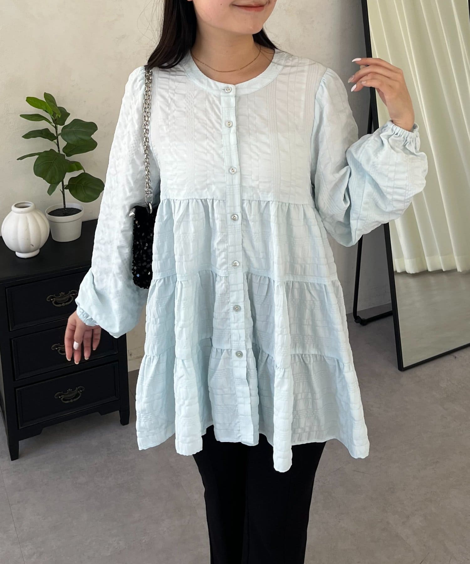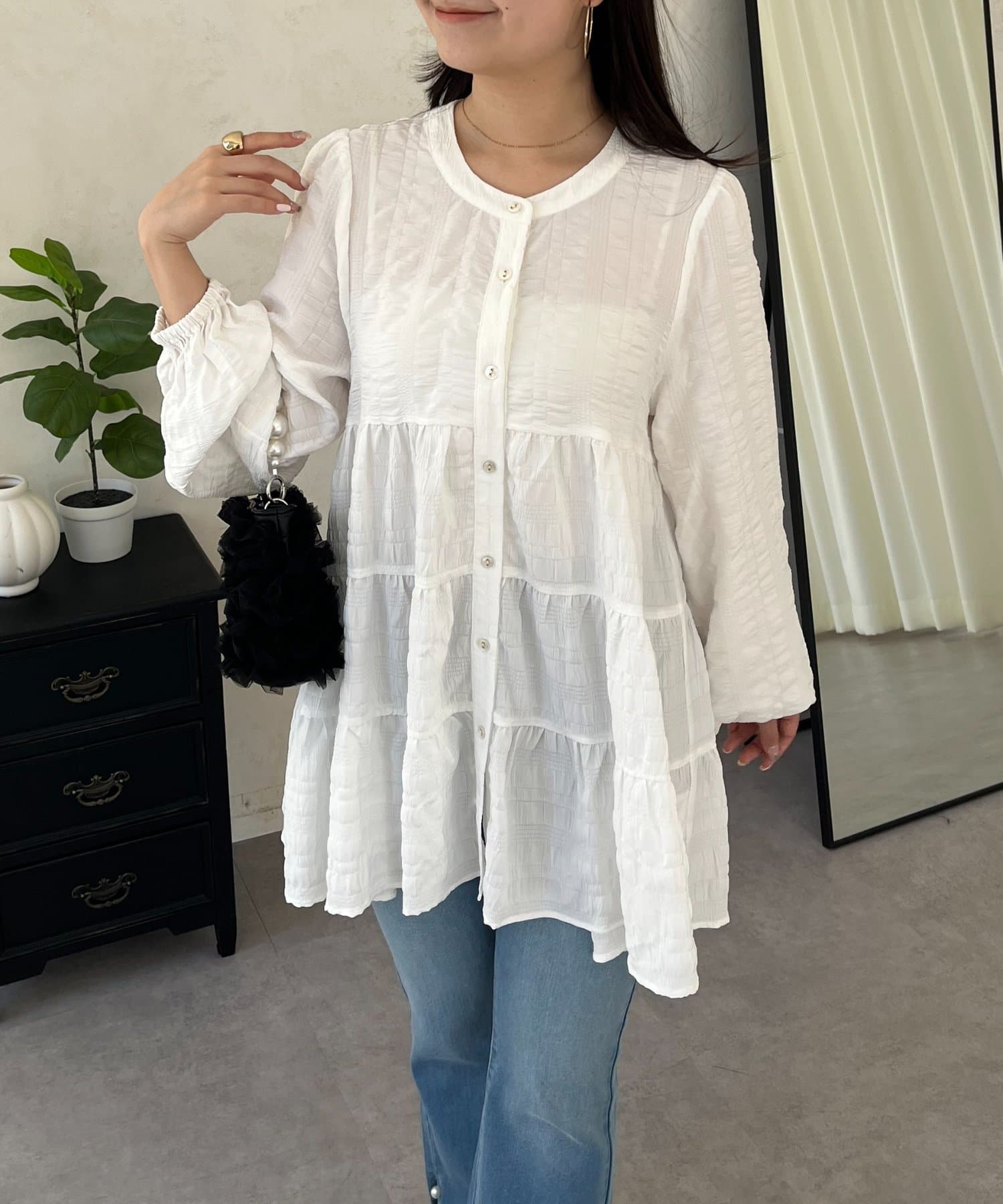 ●ブラウスとしても、羽織リとしても着こなせる、着回し力に優れた1着。