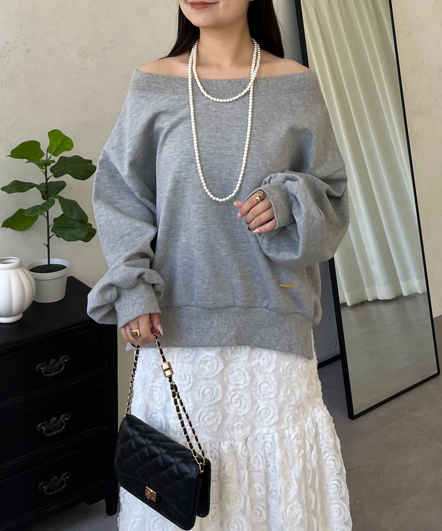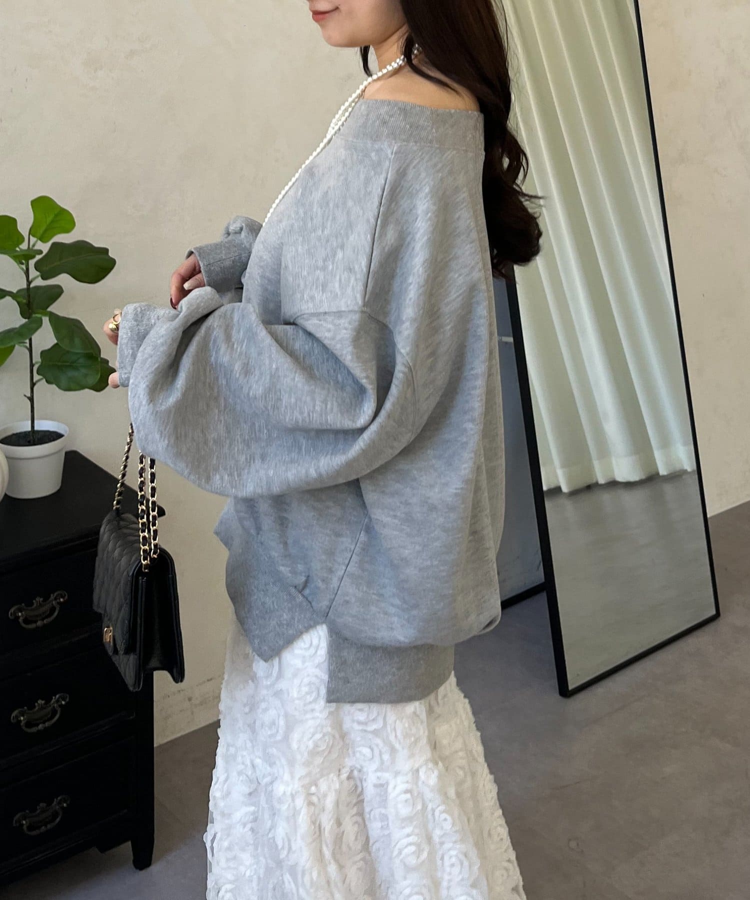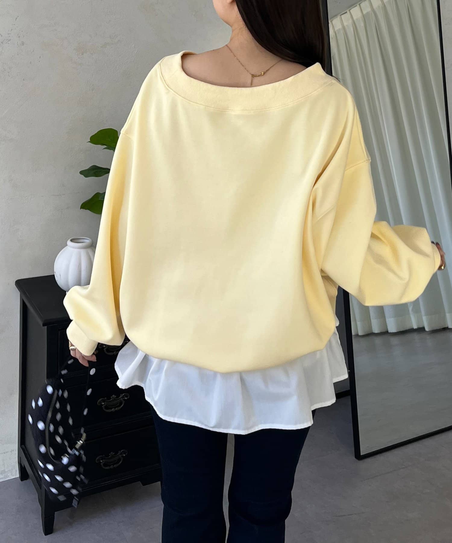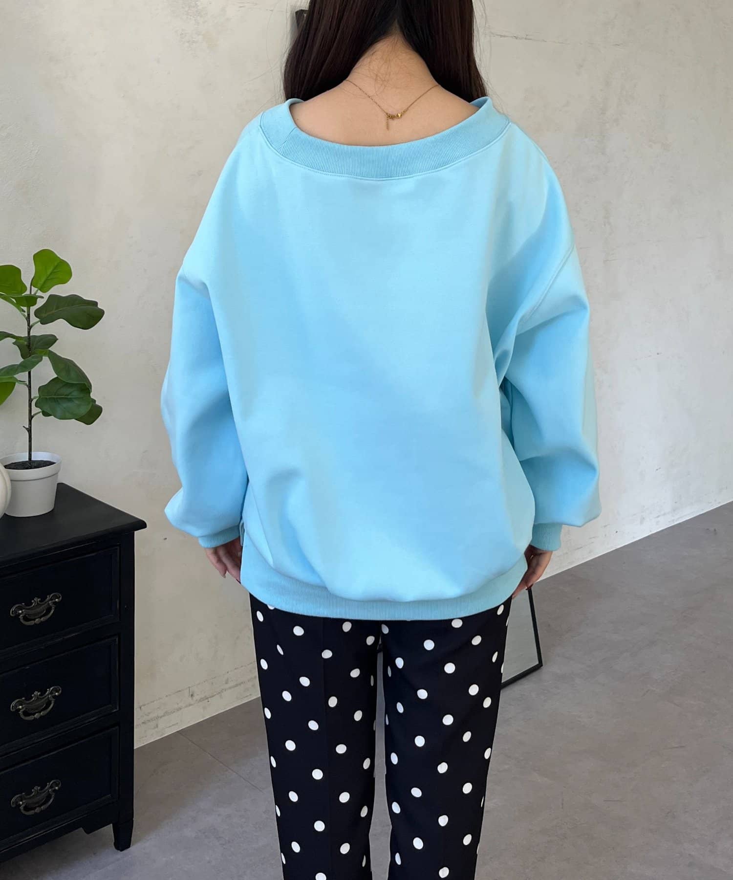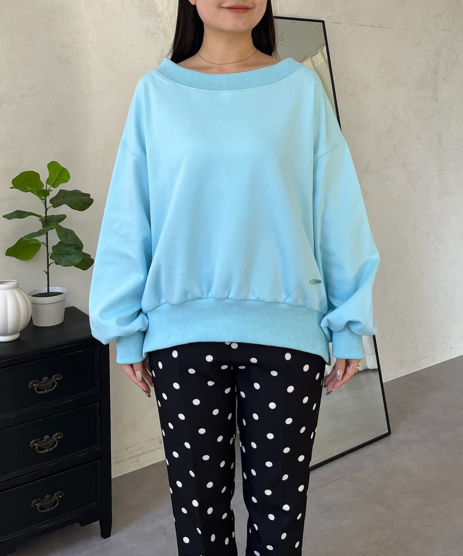●横に広く浅く開いたボートネックが、カジュアルなスウェットに女性らしい上品な印象をプラス