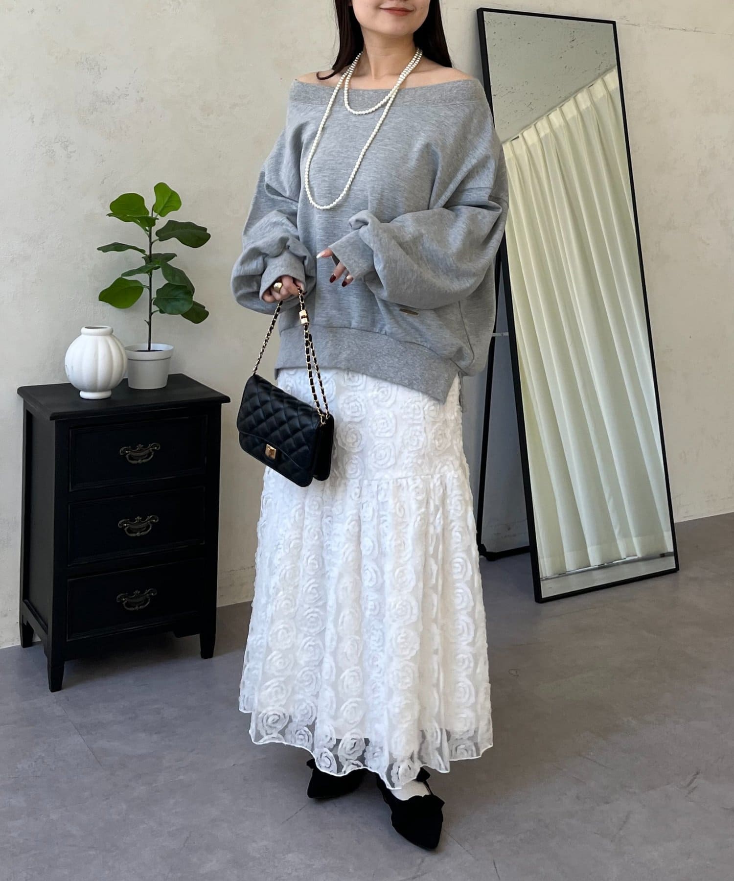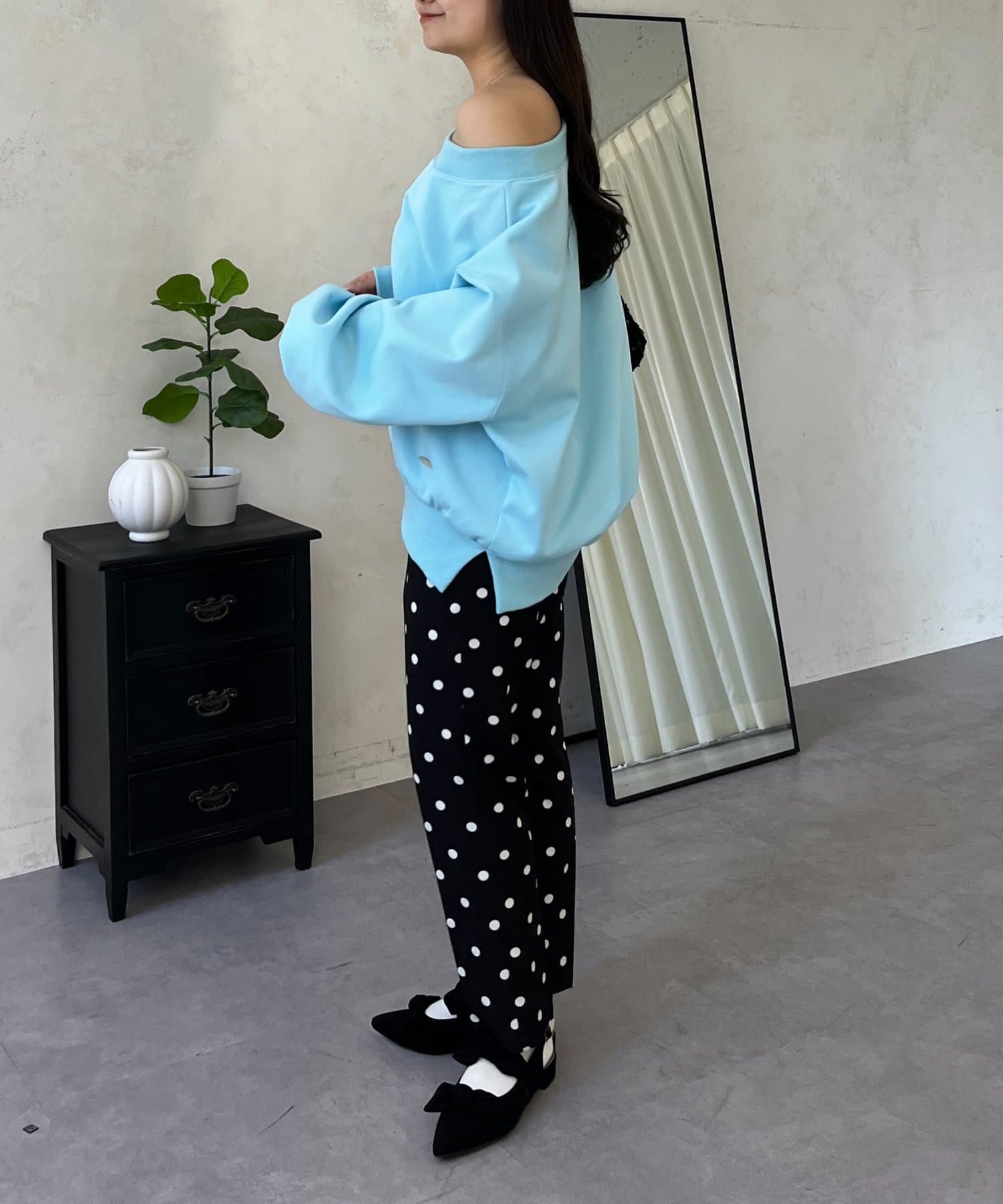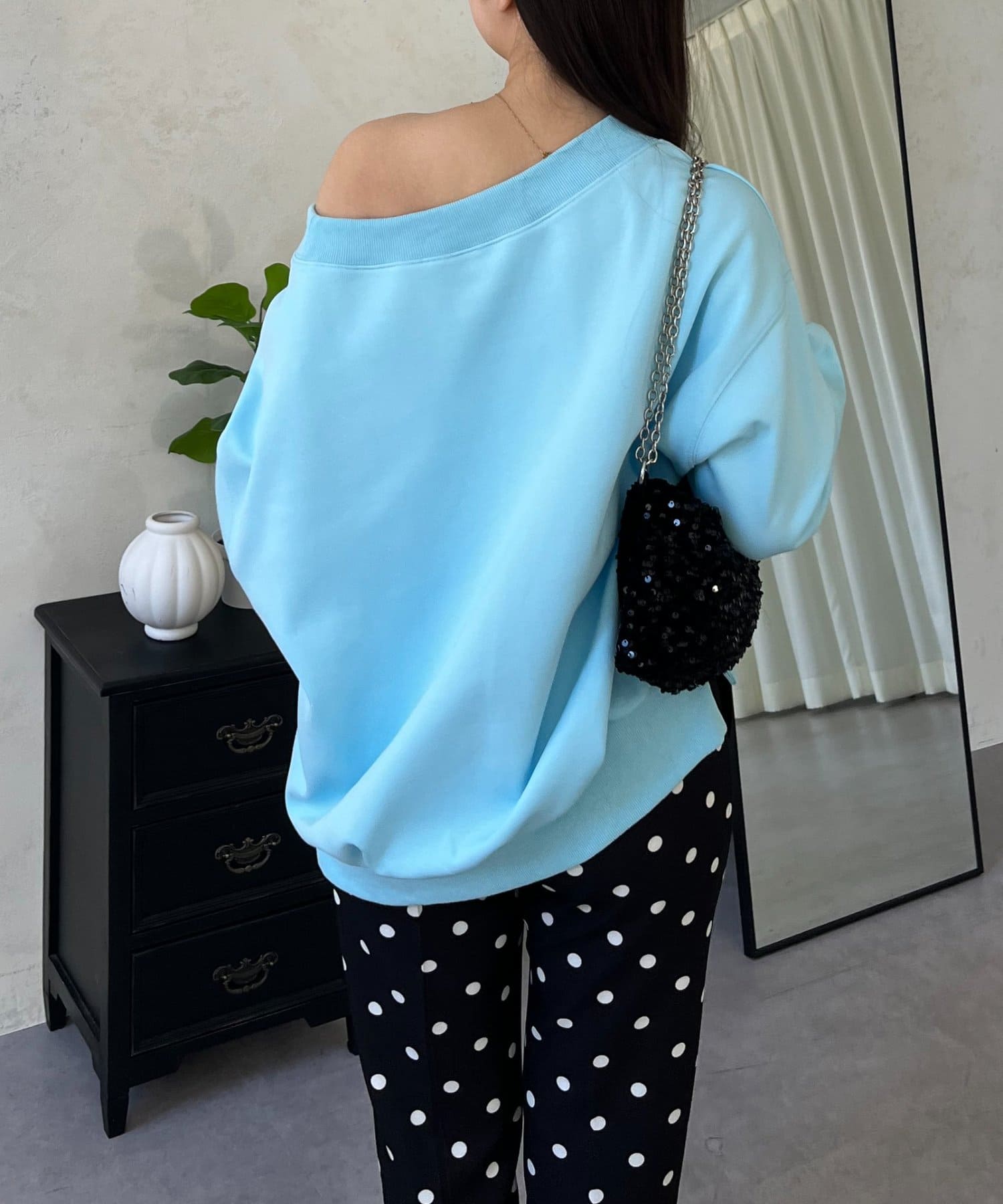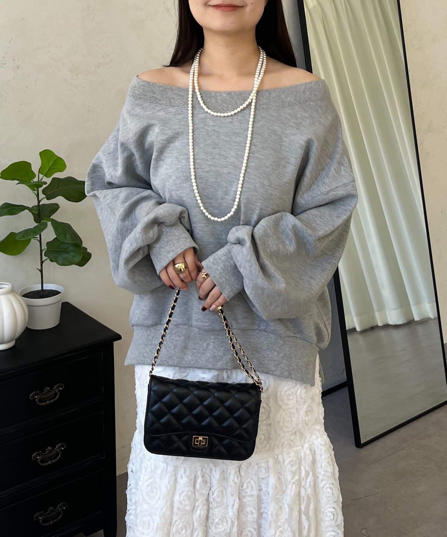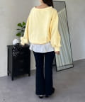 ●横に広く浅く開いたボートネックが、カジュアルなスウェットに女性らしい上品な印象をプラス