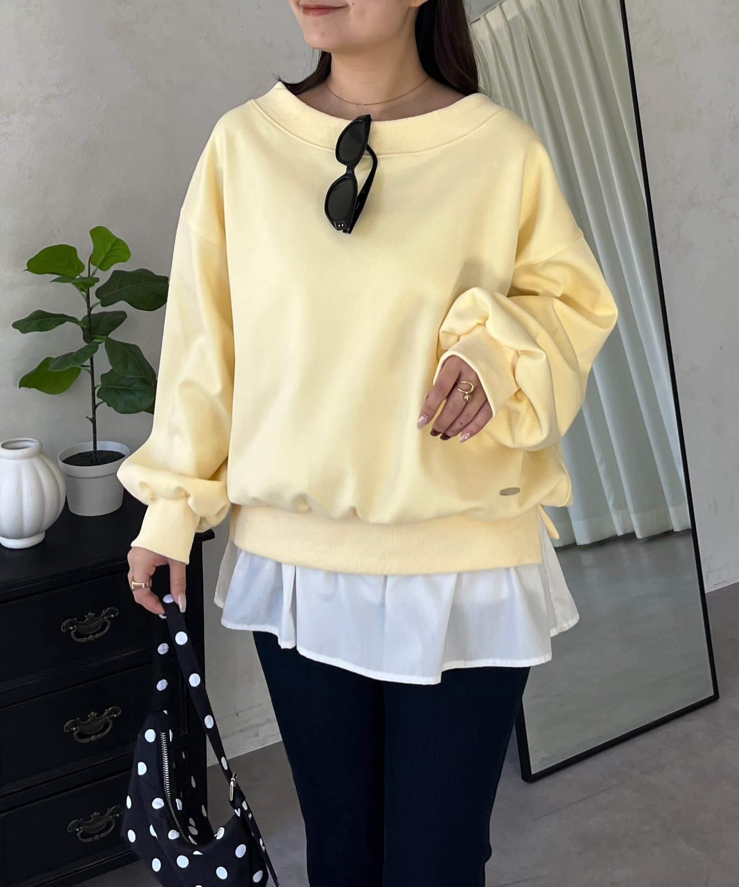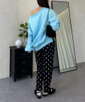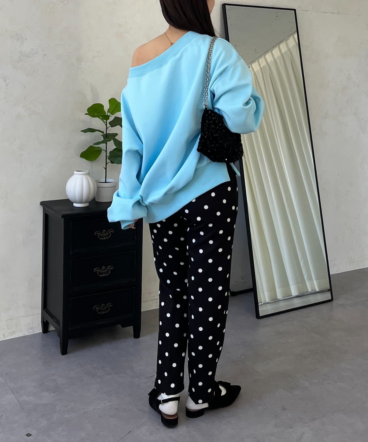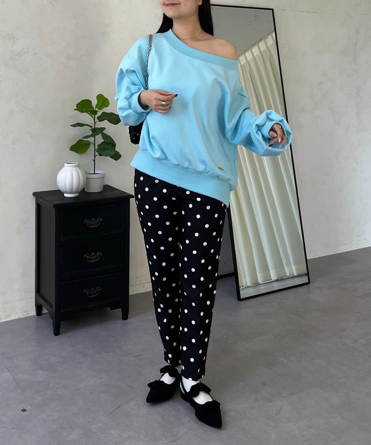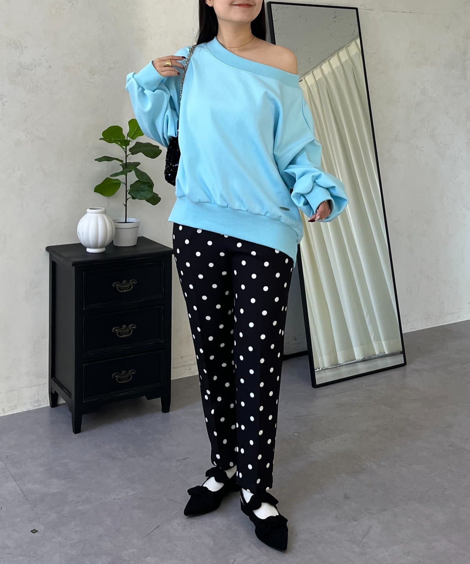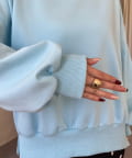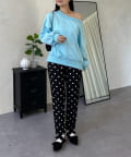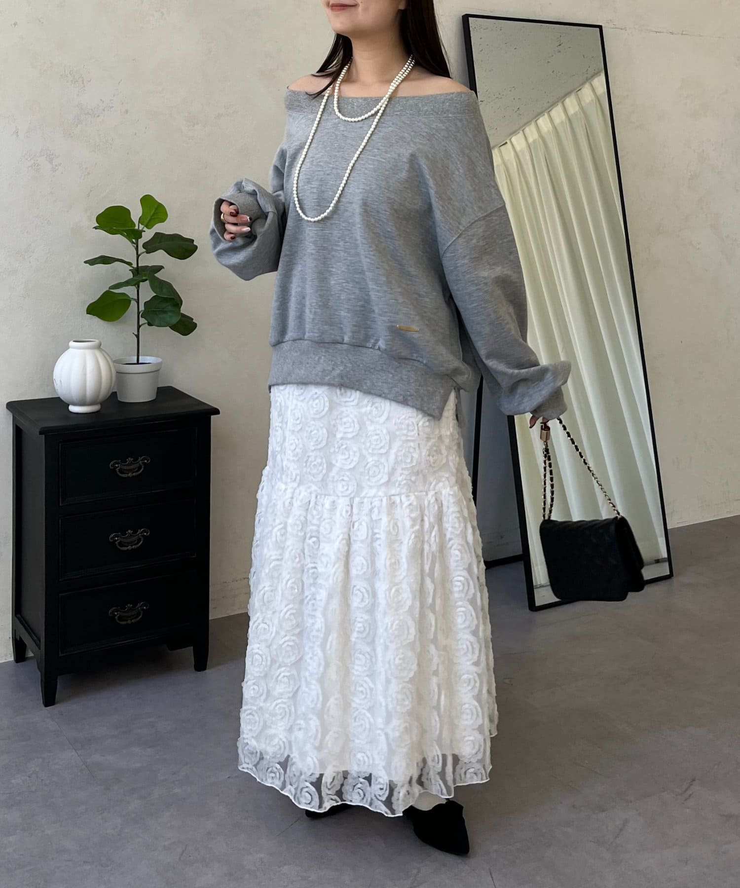 ●横に広く浅く開いたボートネックが、カジュアルなスウェットに女性らしい上品な印象をプラス