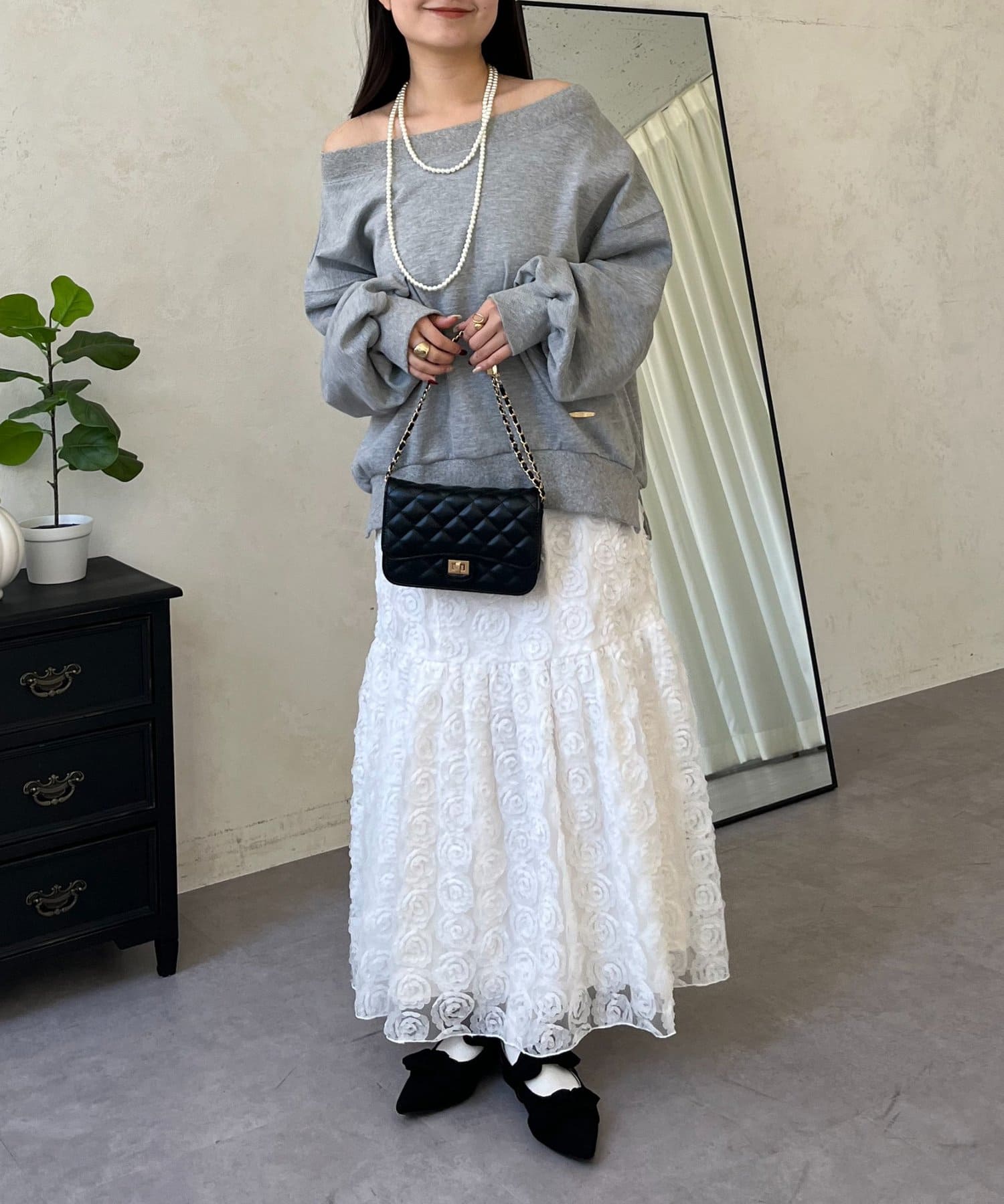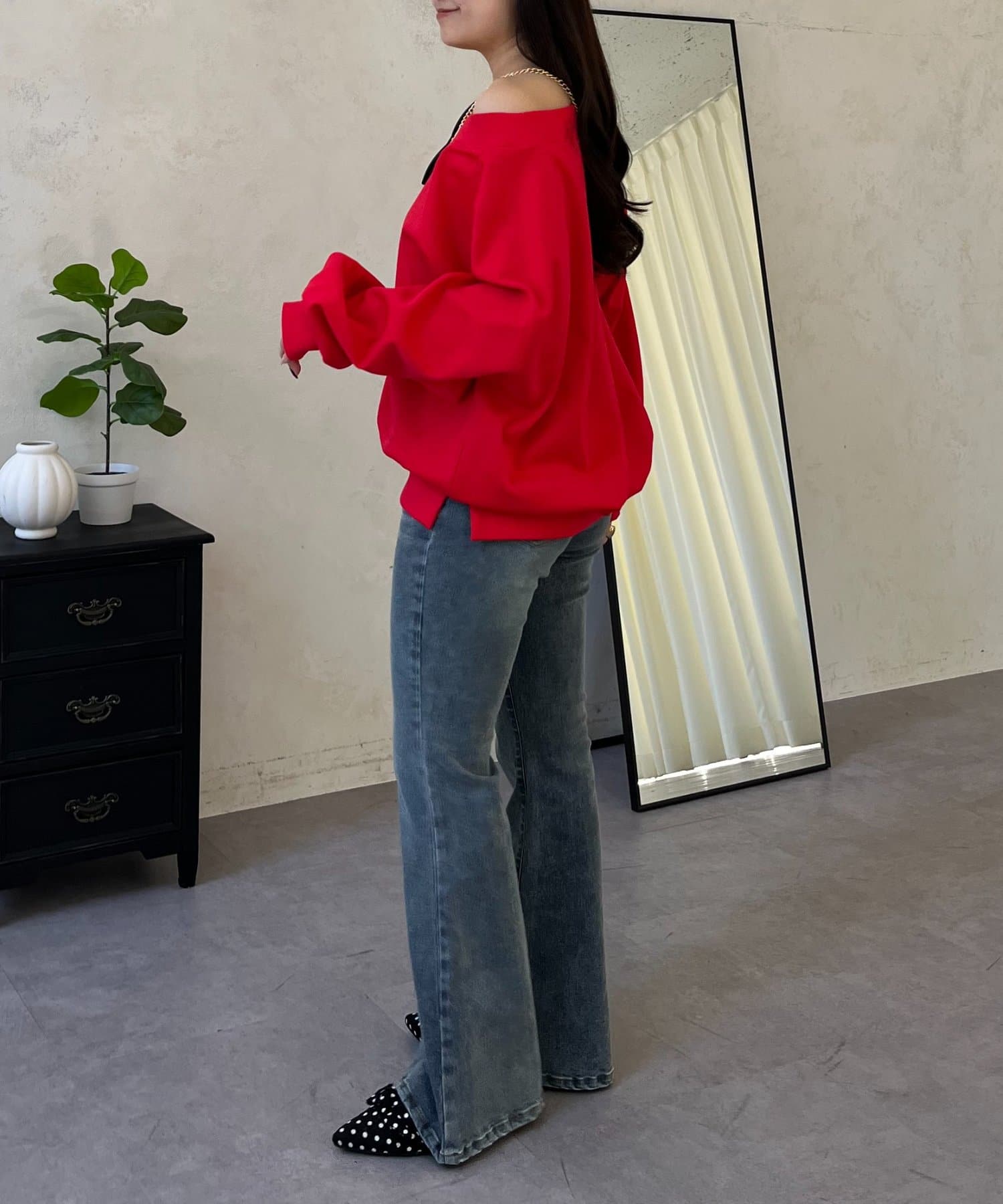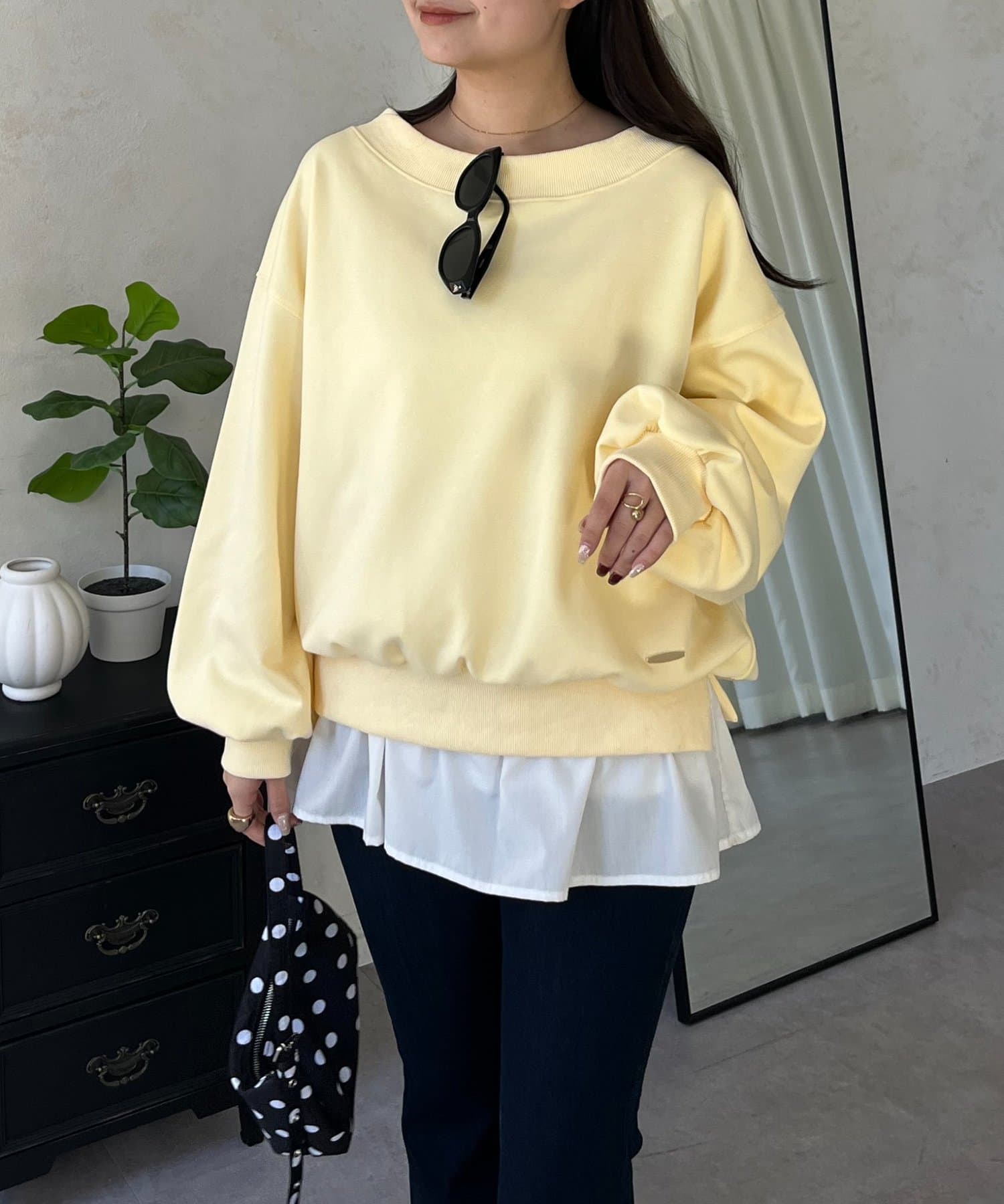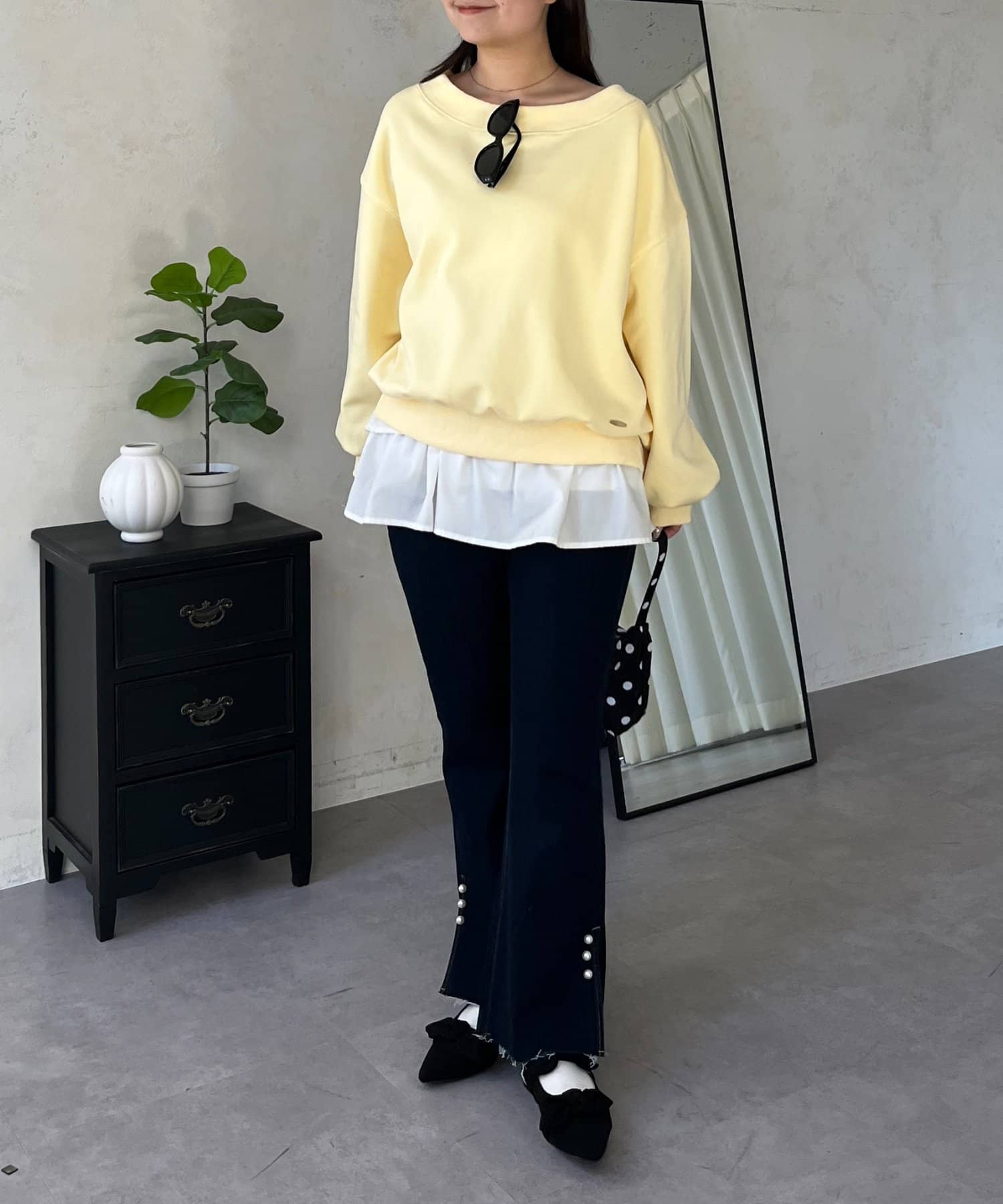 ●横に広く浅く開いたボートネックが、カジュアルなスウェットに女性らしい上品な印象をプラス