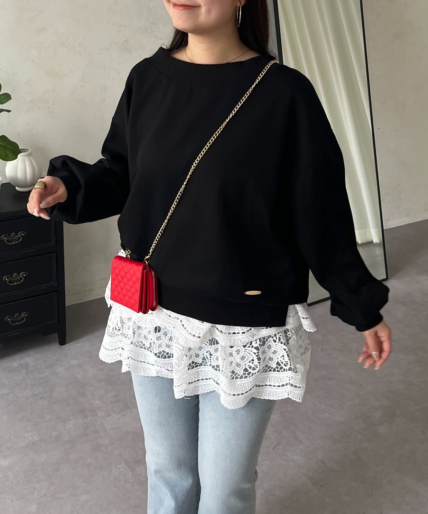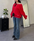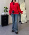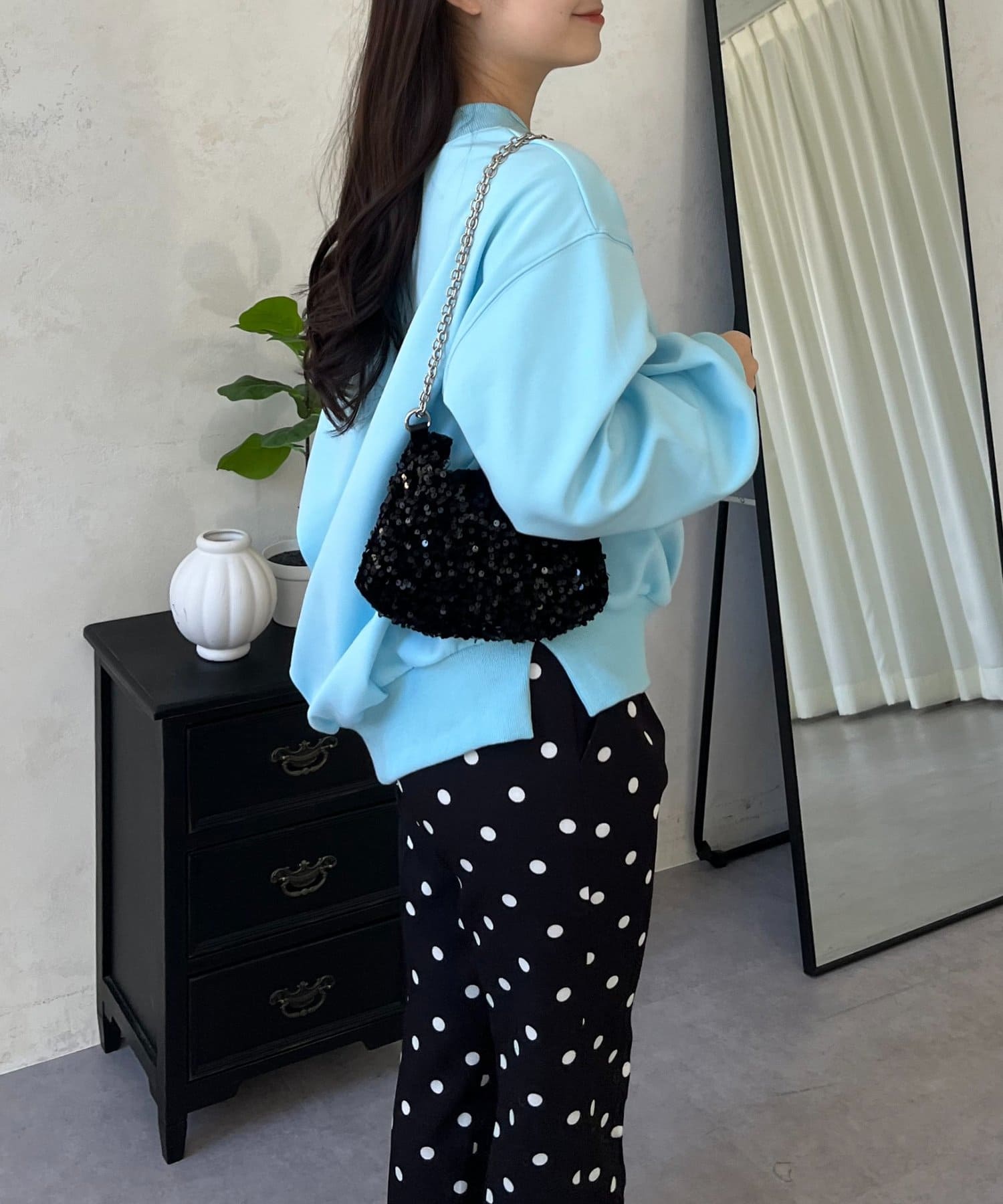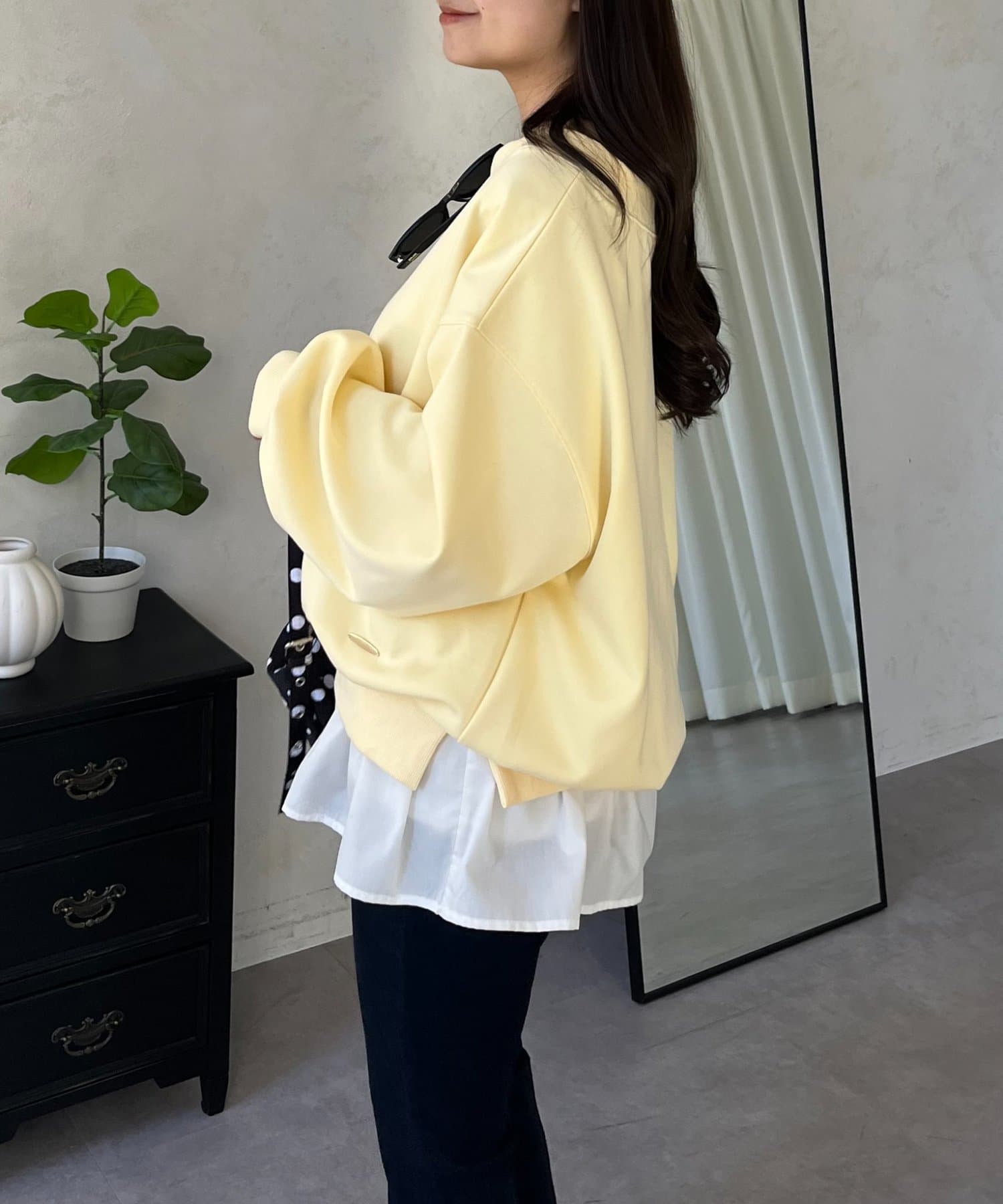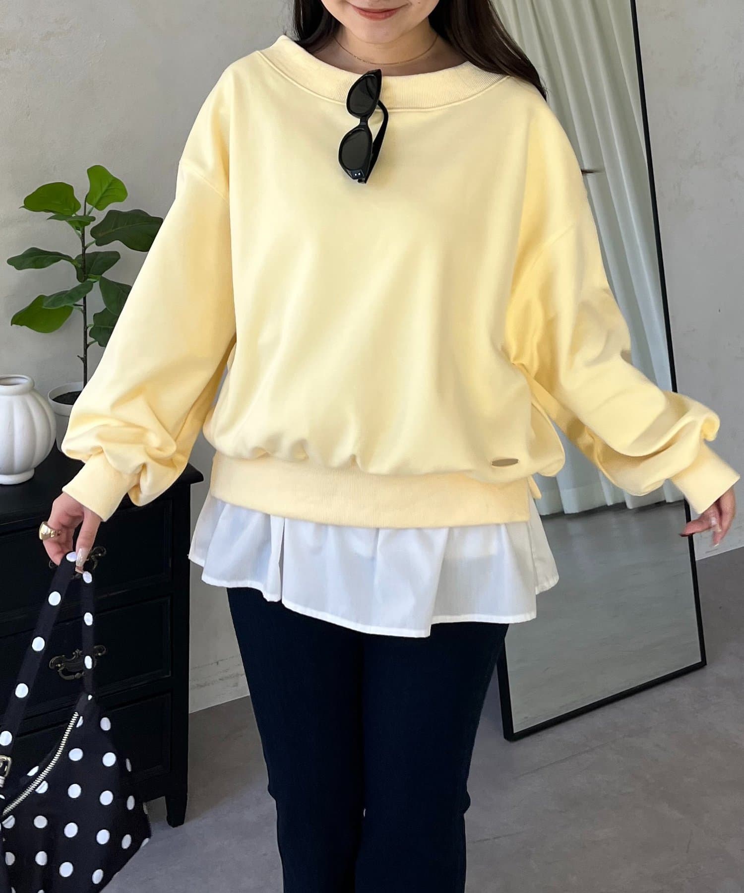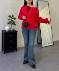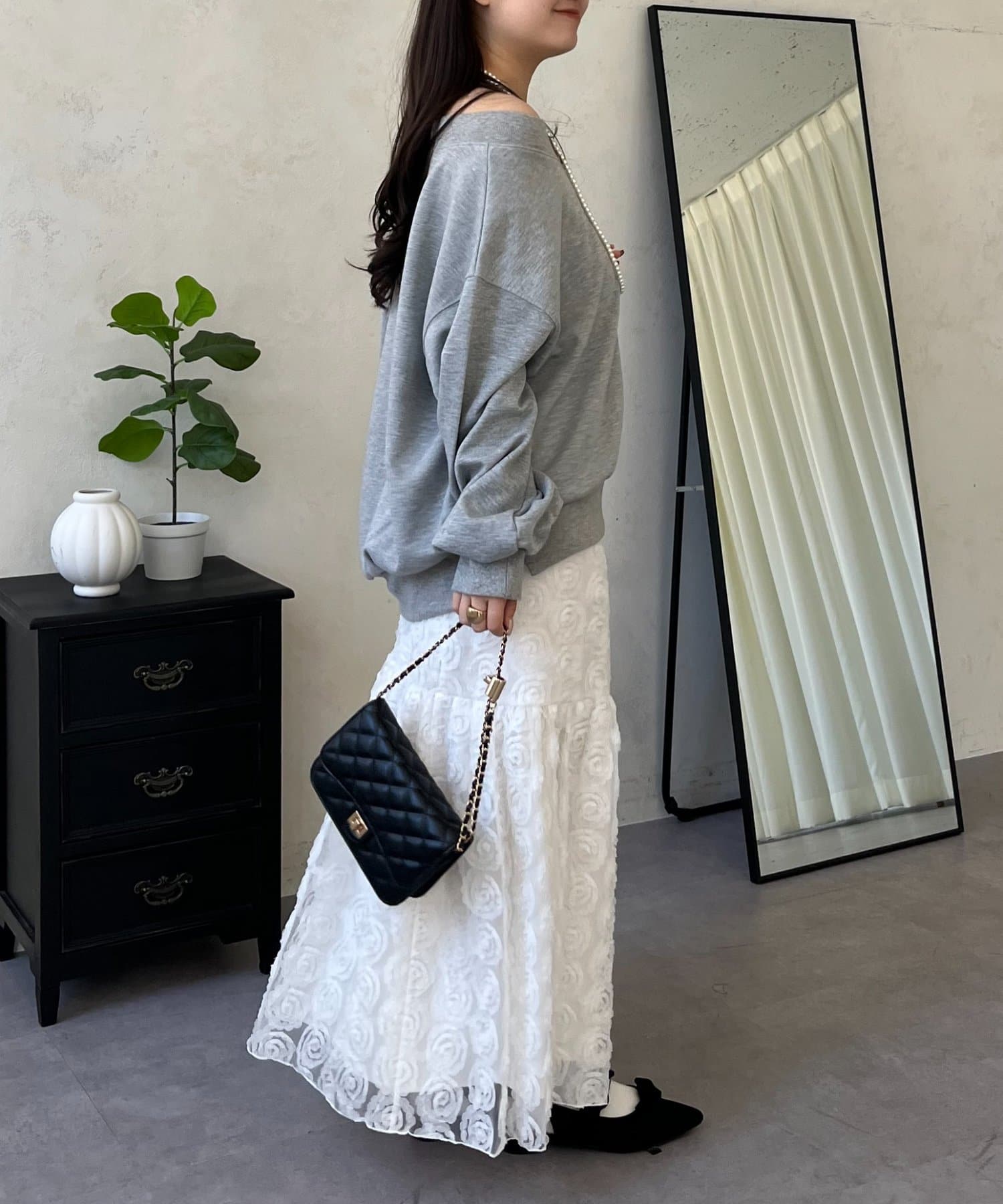 ●横に広く浅く開いたボートネックが、カジュアルなスウェットに女性らしい上品な印象をプラス