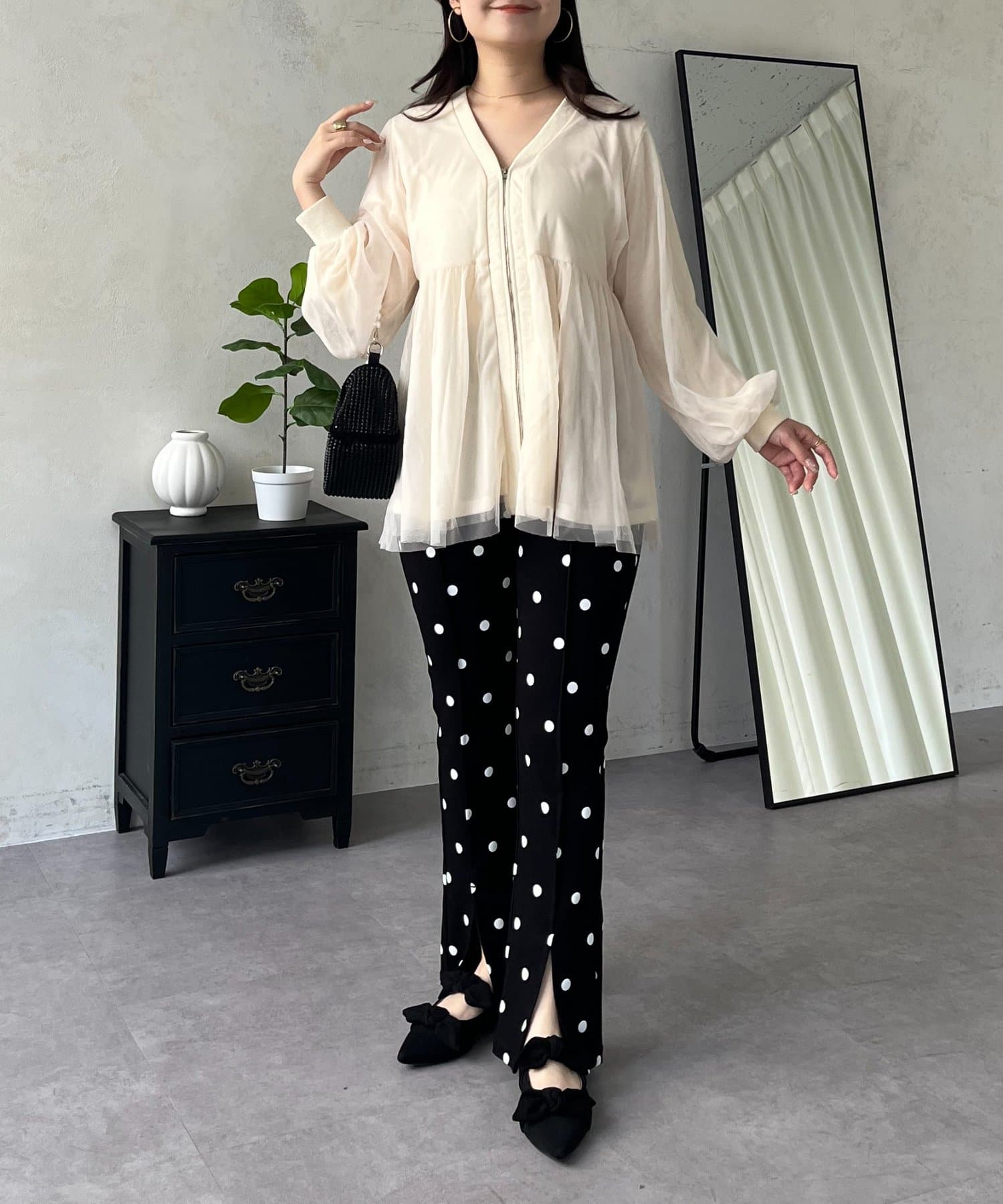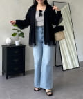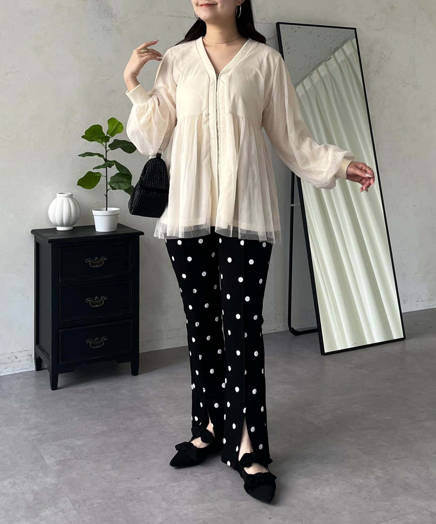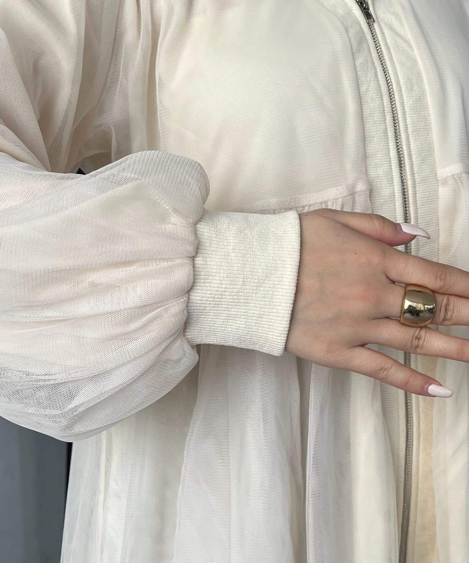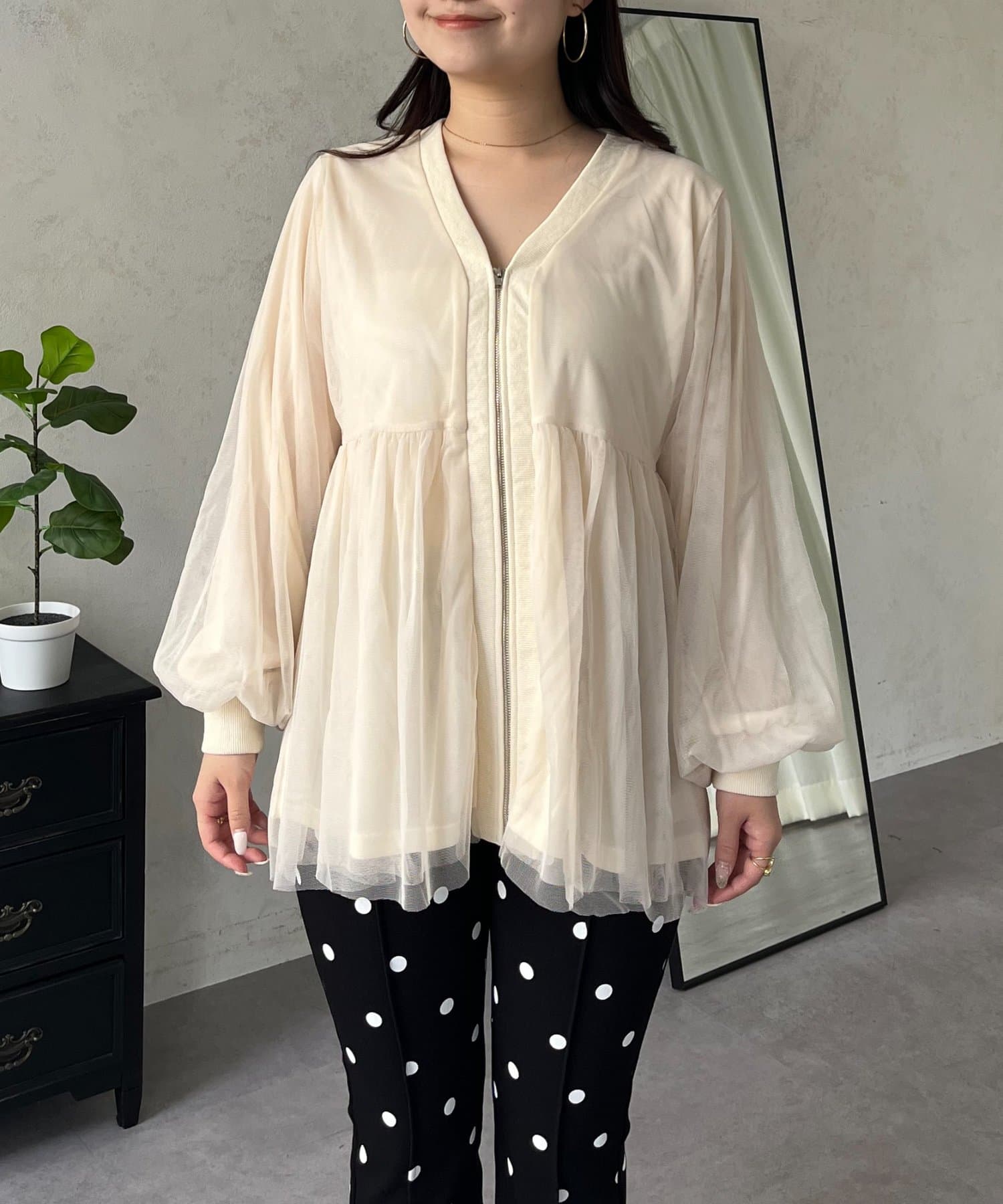 ●フロントはジップ仕様になっており、甘さの中に程よいカジュアル感をプラスした甘辛MIXデザイン