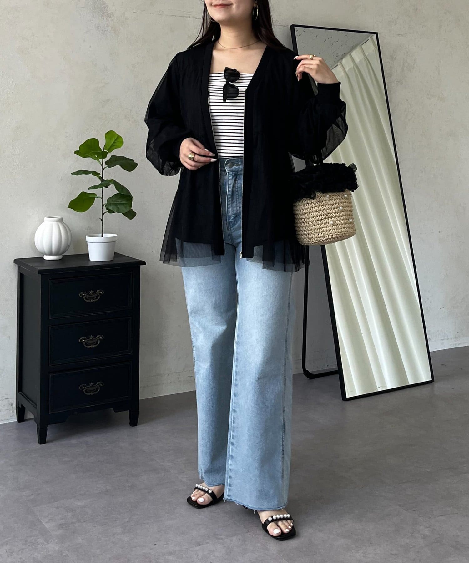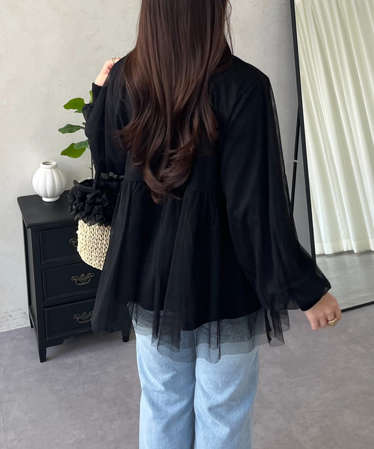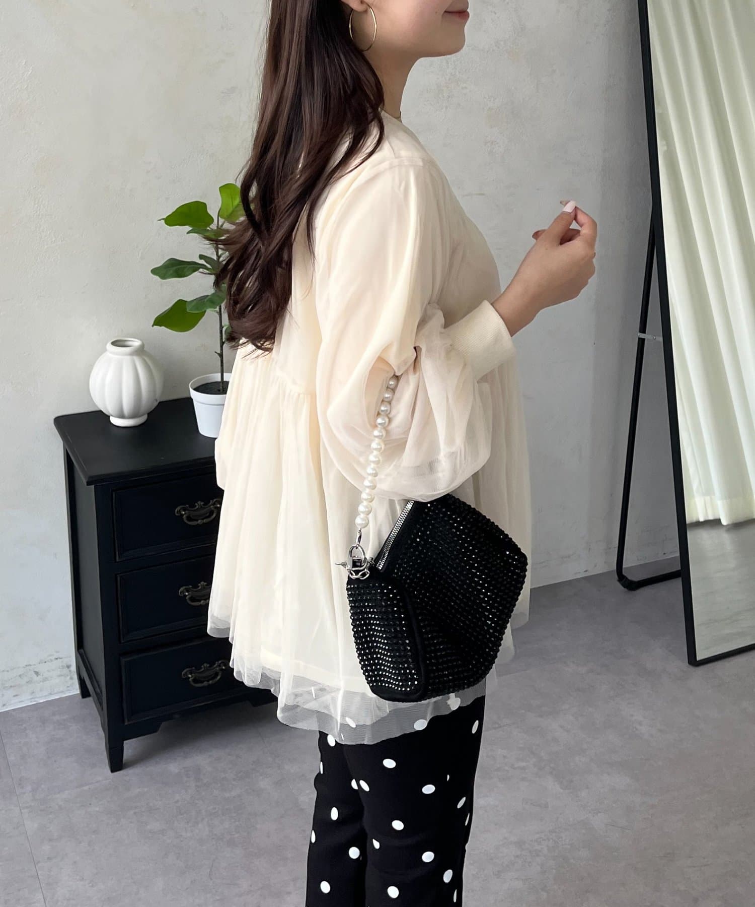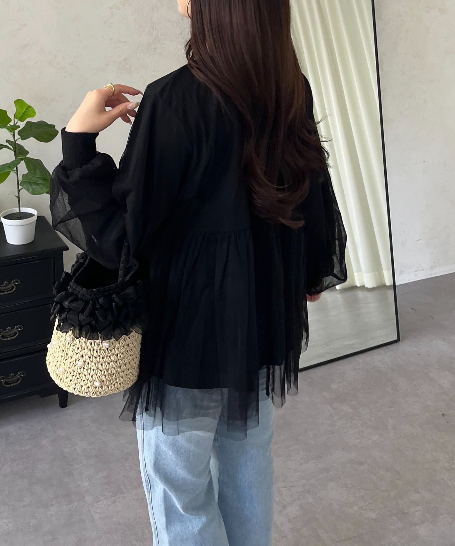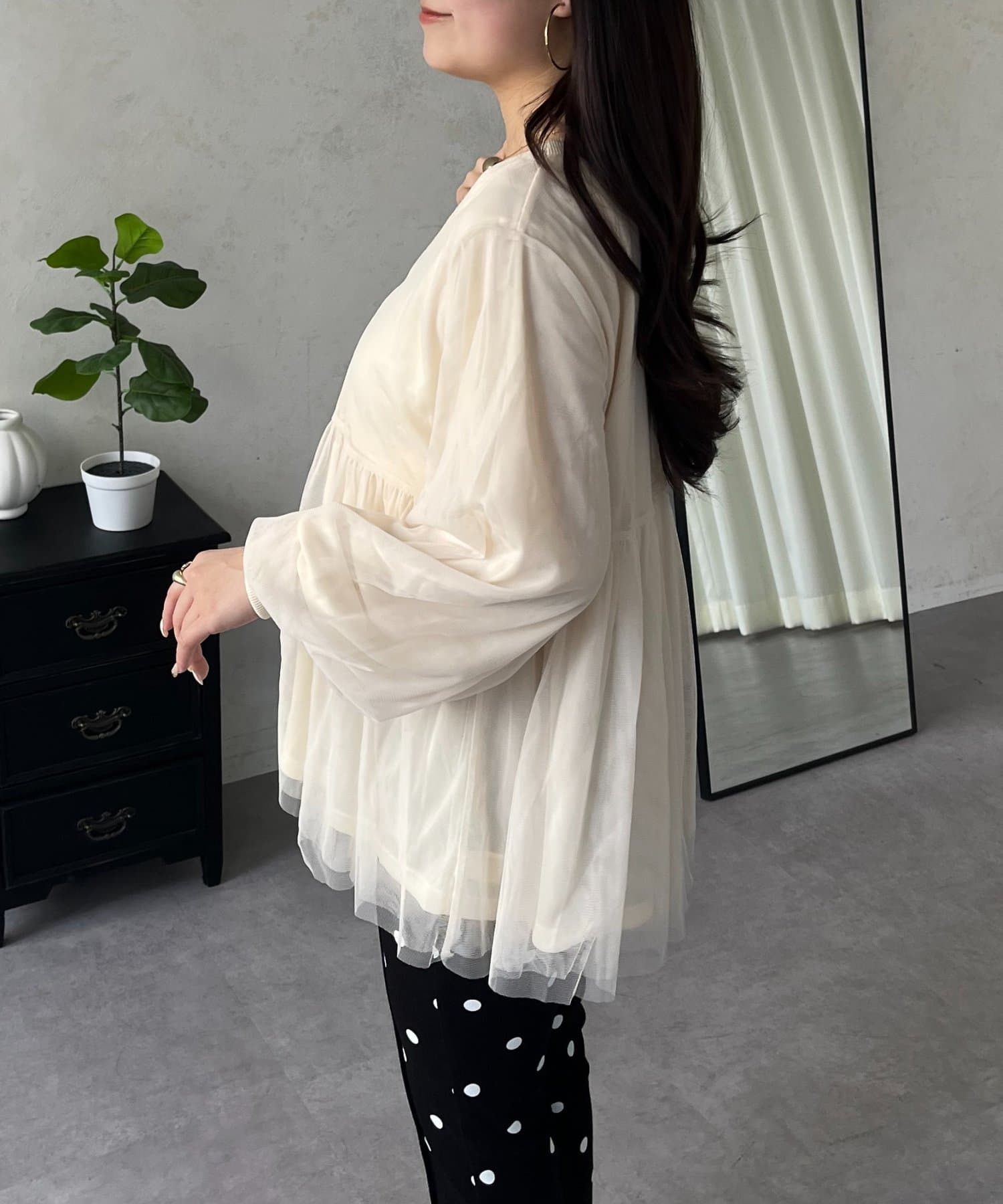 ●ふんわりと揺れるチュールを重ね、フェミニンなムードを高める主役級カーディガン