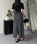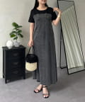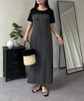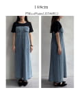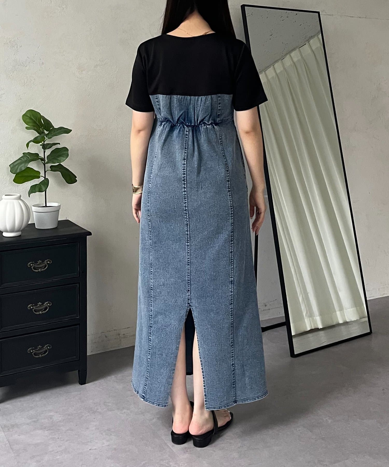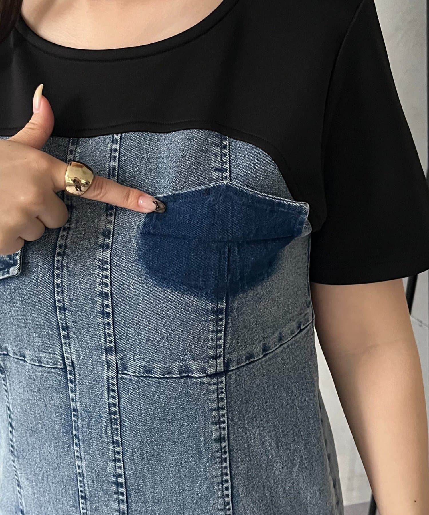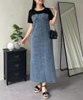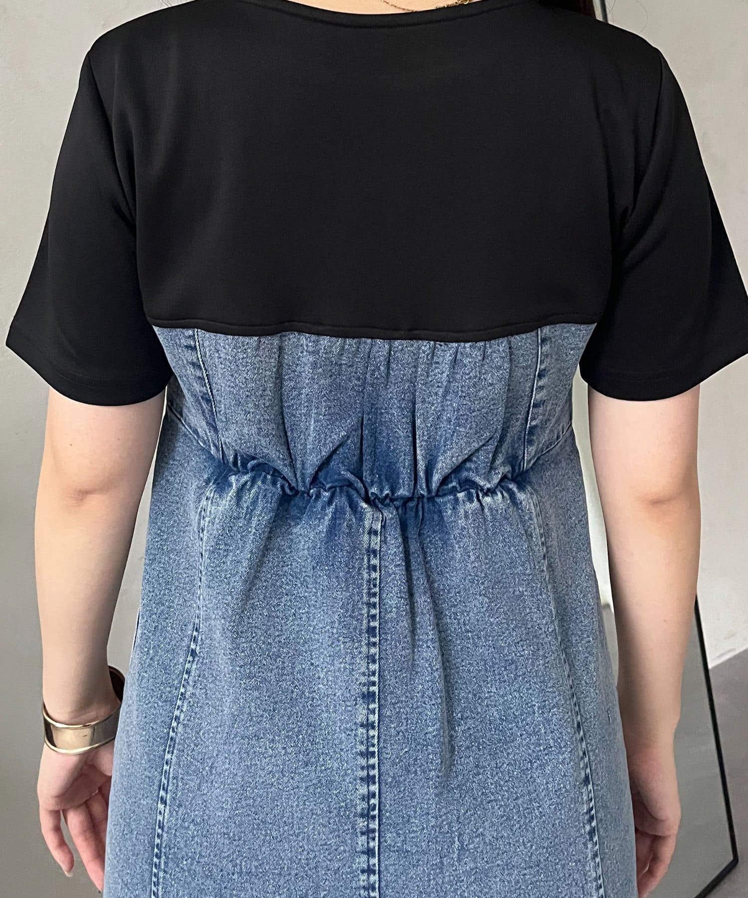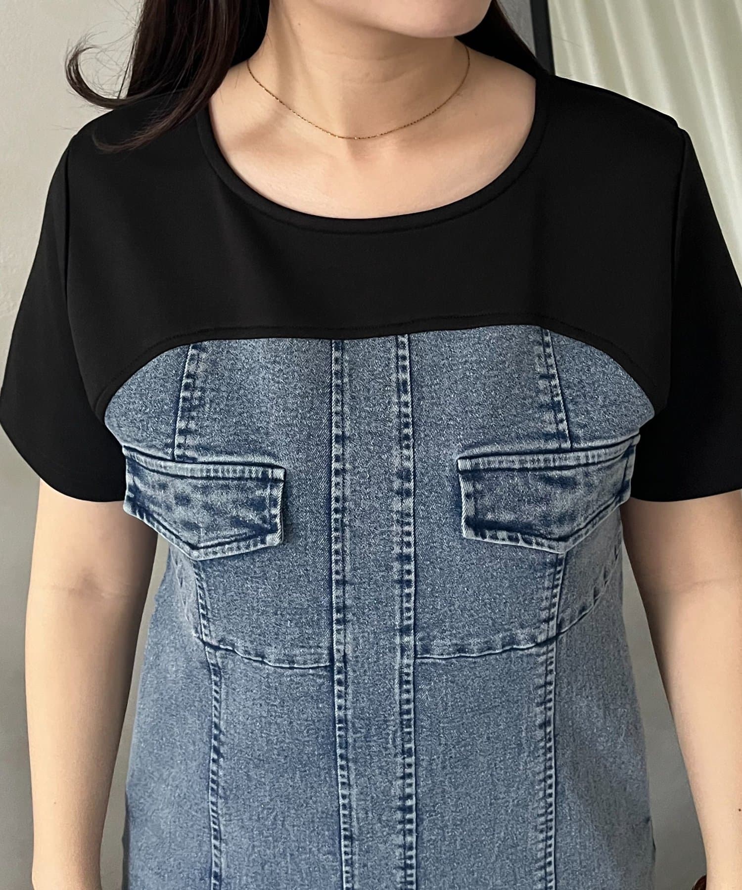 ●Tシャツとデニムスカートを重ね着したようなドッキングデザインで、コーディネートに悩まず一枚でスタイルが完成