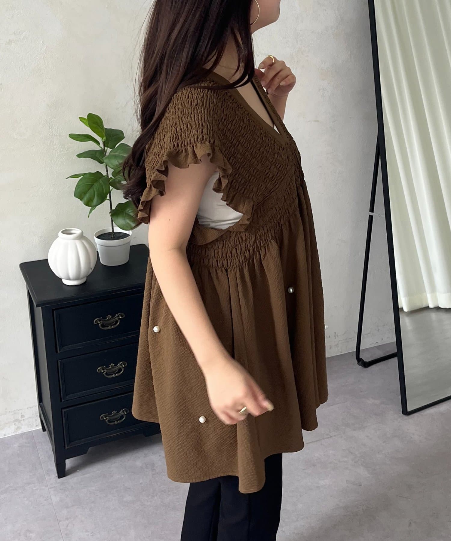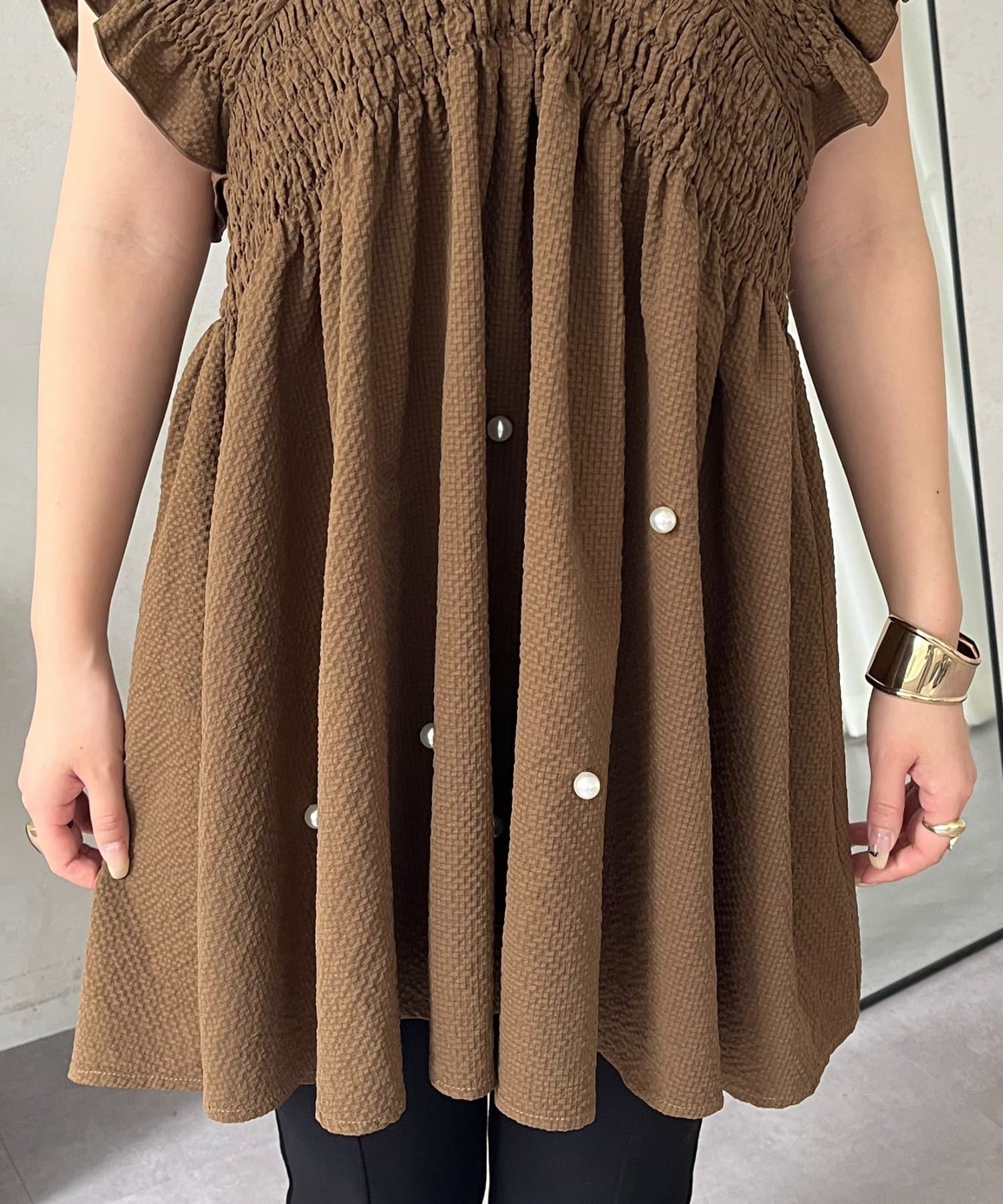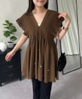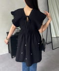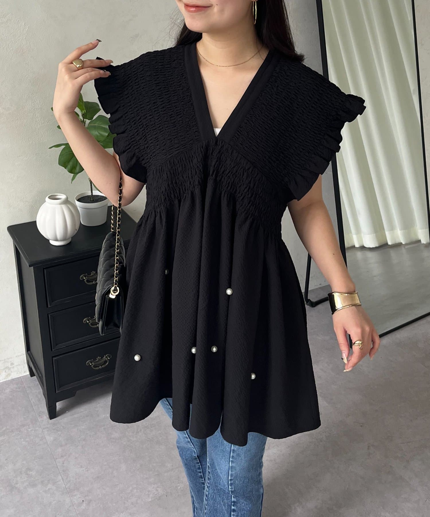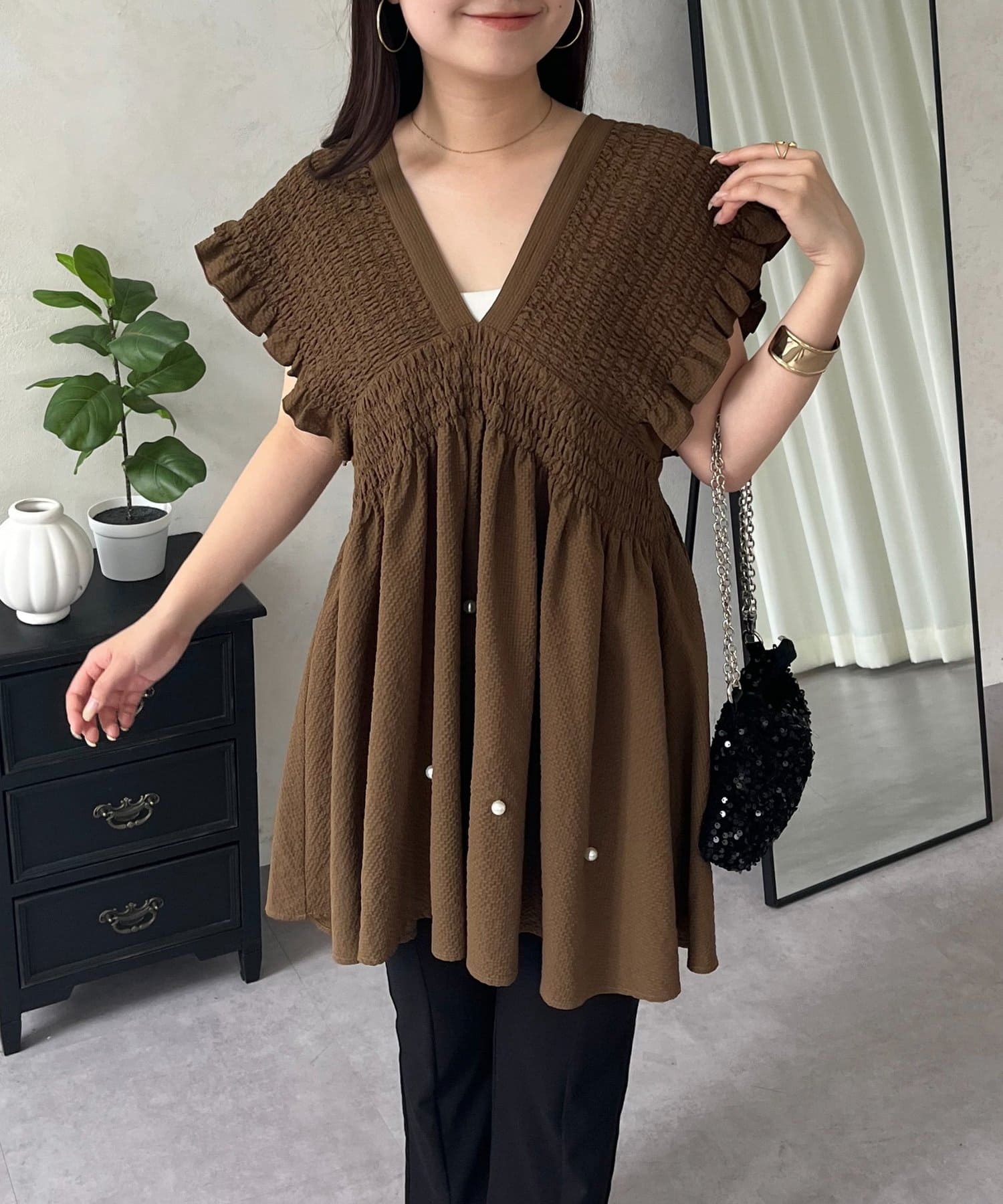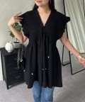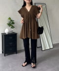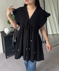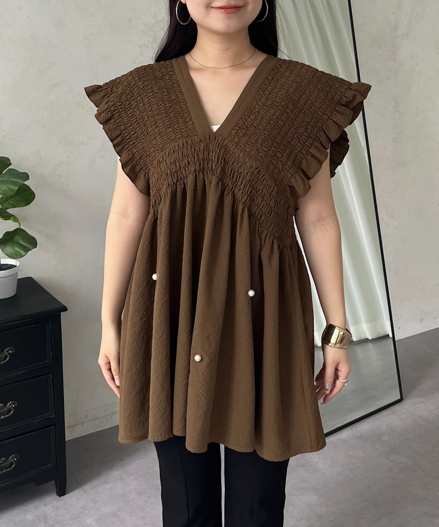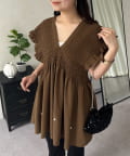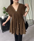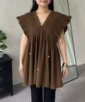 シャーリングフリルVネックパールペプラムブラウス