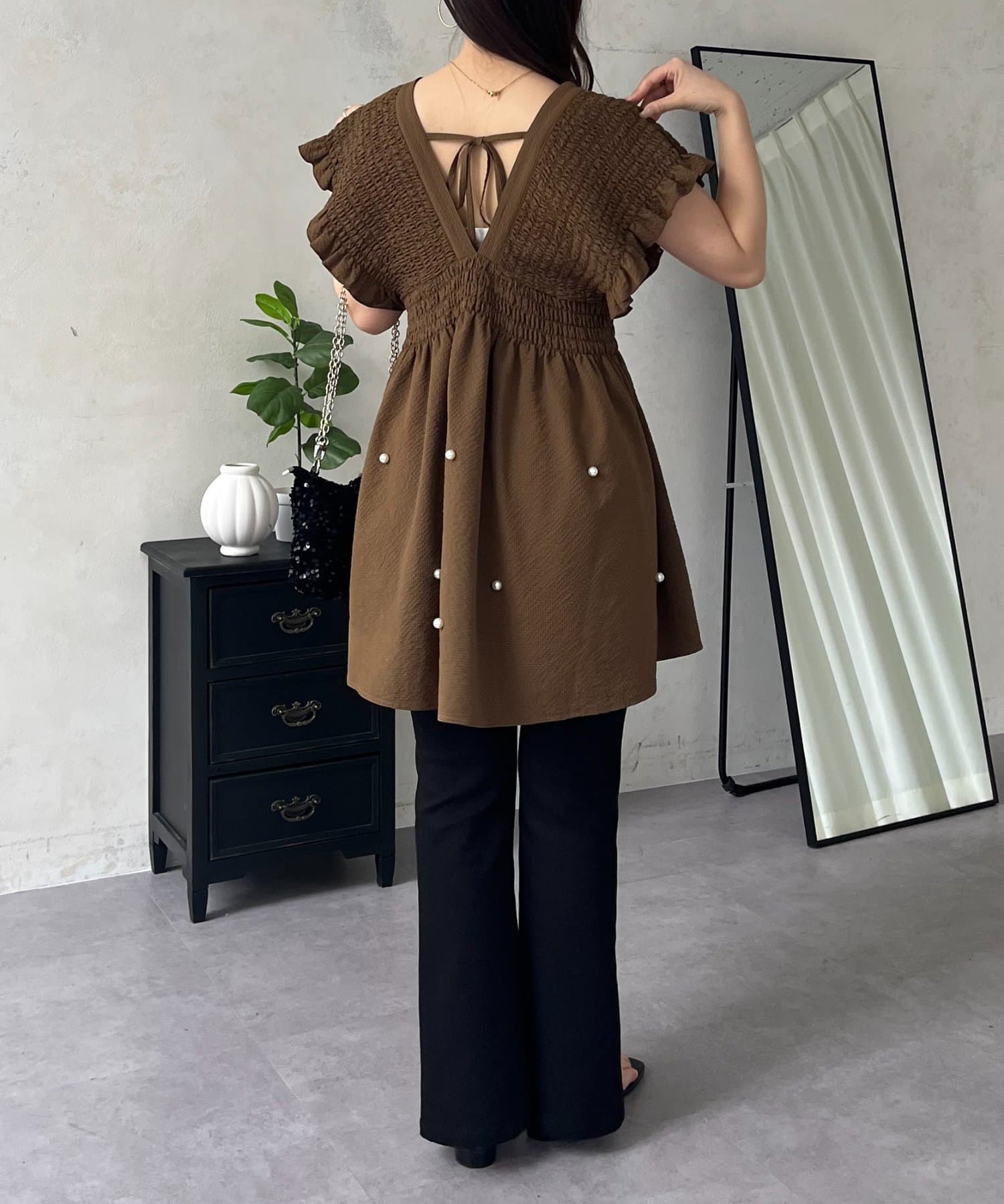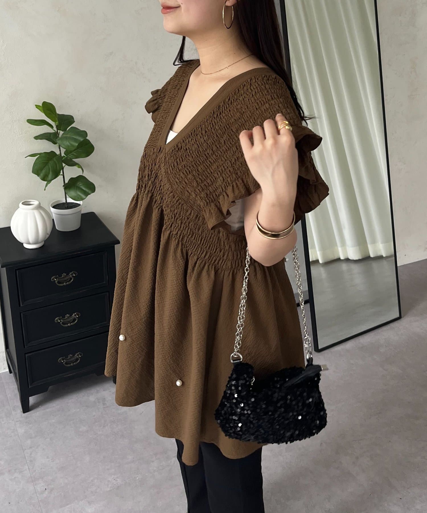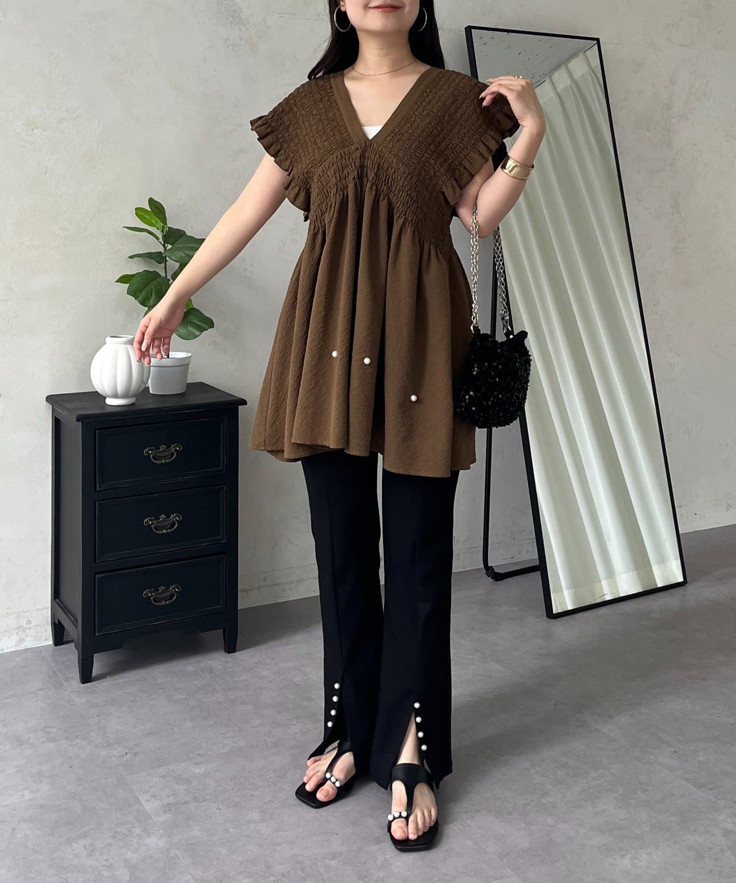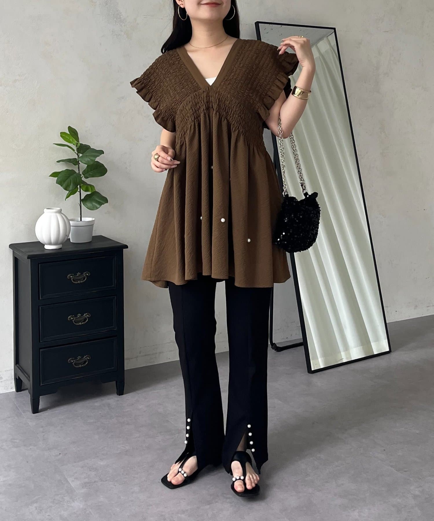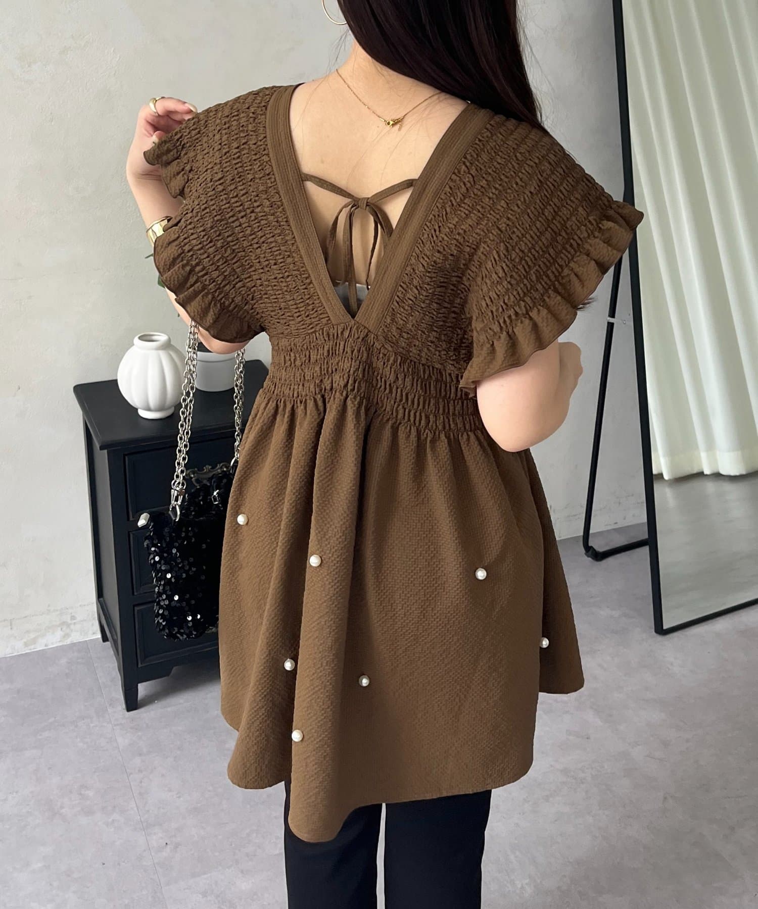 シャーリングフリルVネックパールペプラムブラウス
