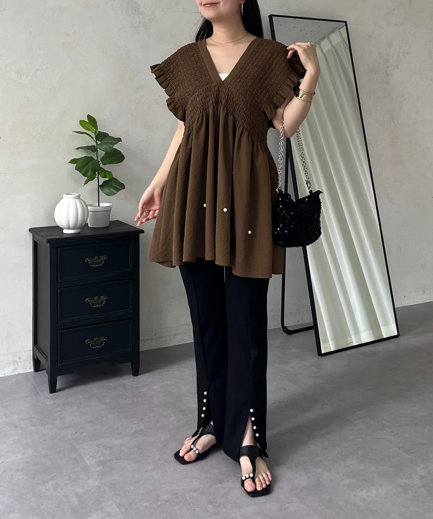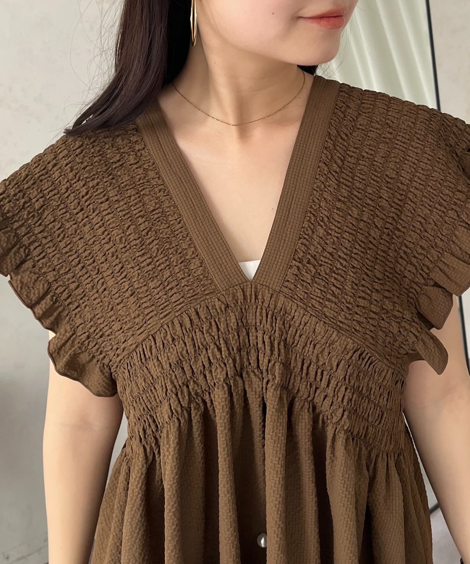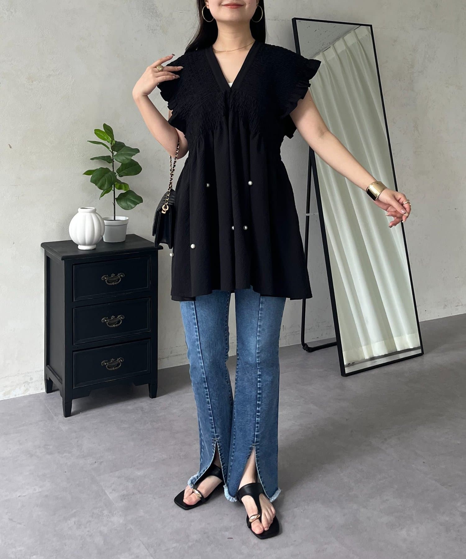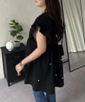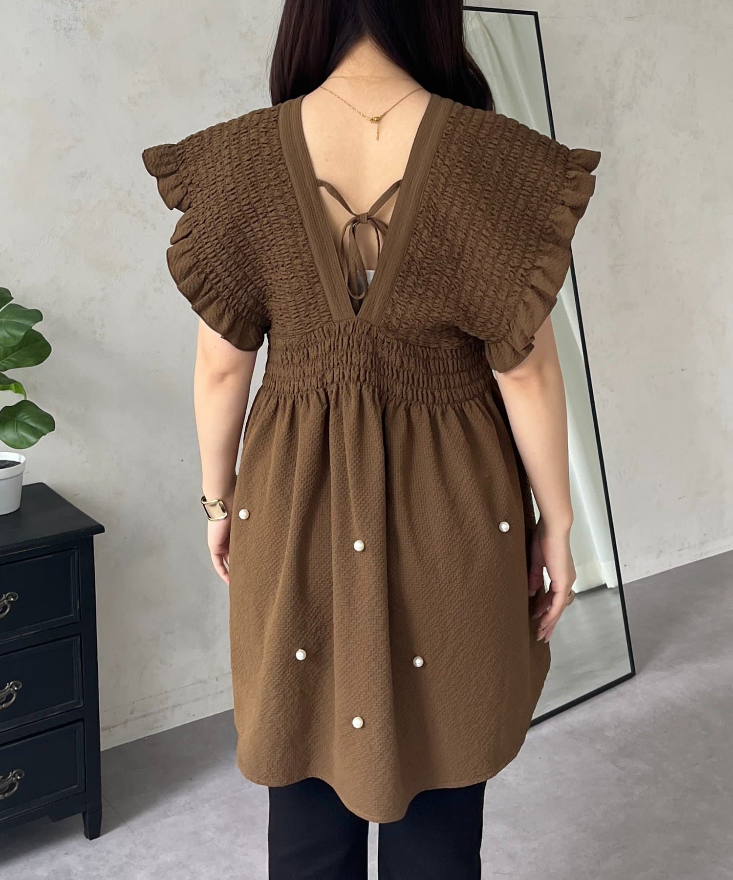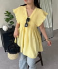 シャーリングフリルVネックパールペプラムブラウス